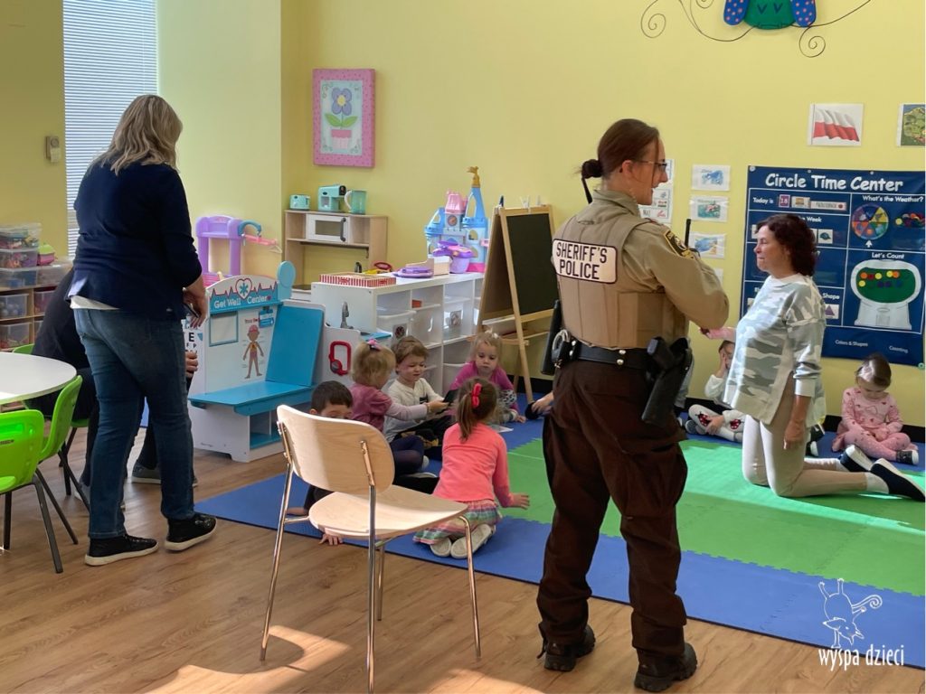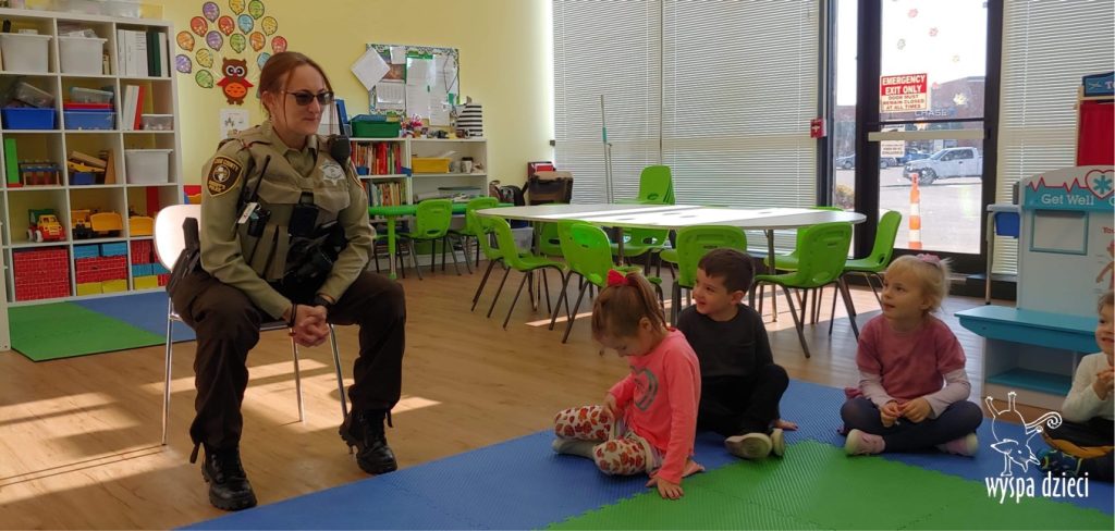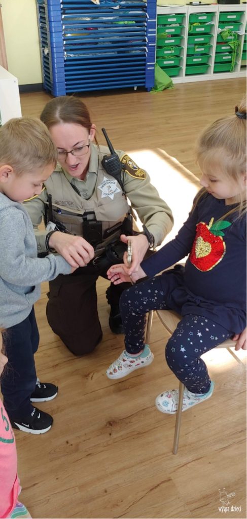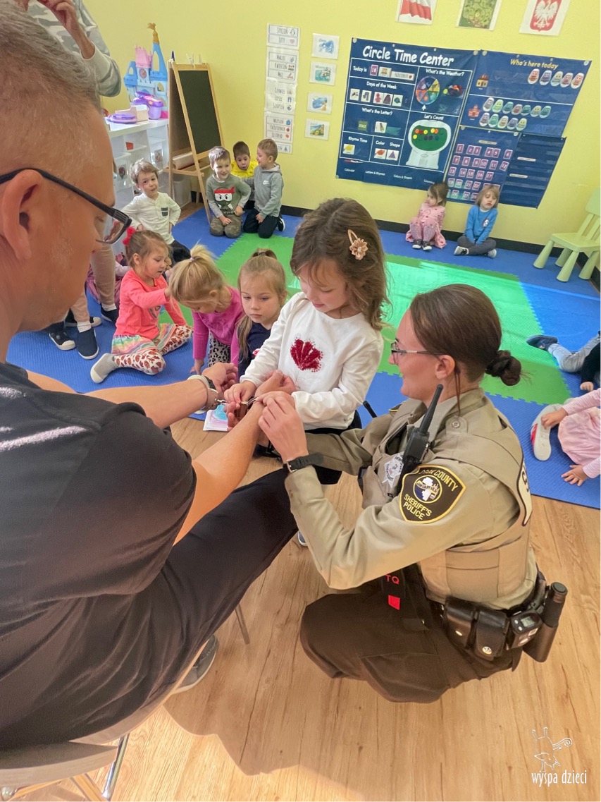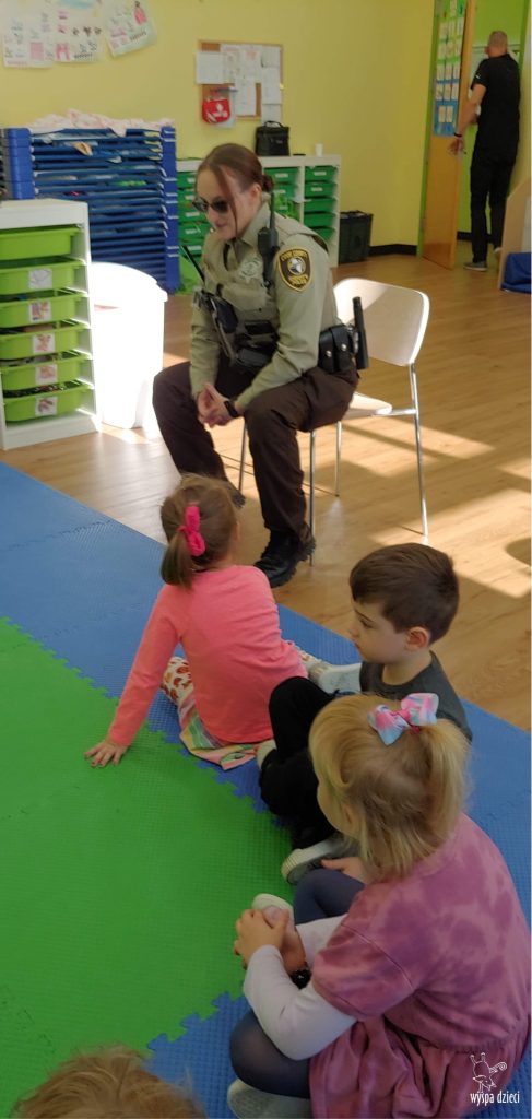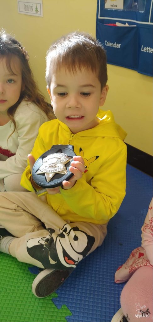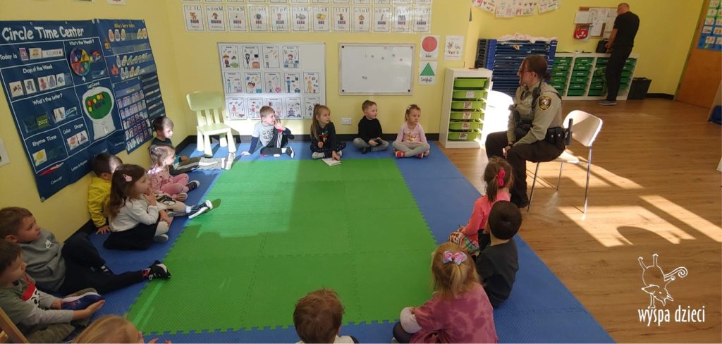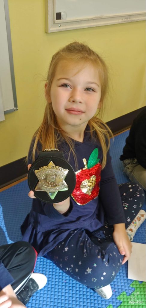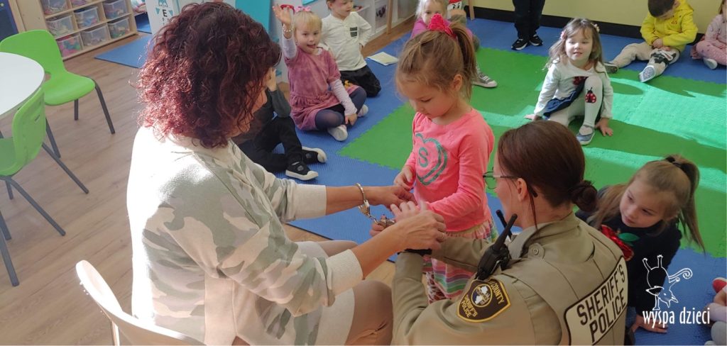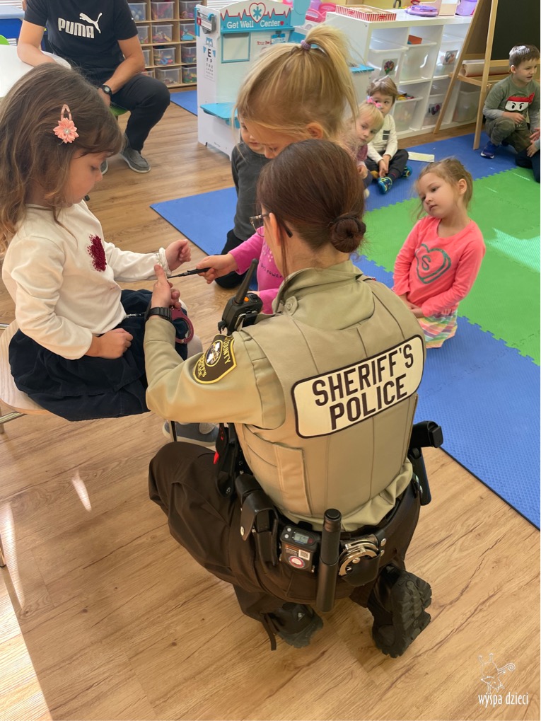 Temat tego tygodnia w Wyspie Dzieci w River Grove to – ZAWODY NASZYCH RODZICOW. Nasza placówkę odwiedzają rodzice oraz zaproszeni goście ktorzy opowiadają ciekawostki o swojej pracy. W środę 19 października, grupa Bystrzaków i Podroznikow gościła w swojej klasie Panią Oficer Gondek, która pełni funkcje Szeryfa. Pani Gondek opowiedziała małym słuchaczom o swojej pracy, o tym co robią policjanci, kiedy i jak wezwać ich na pomoc. Dla maluchów rozmowa z Panią Szeryf i zadawanie pytań bylo dużą atrakcją. A jeszcze większa było trzymanie w raczkach prawdziwych kajdanek ???. Spotkanie przebiegało w bardzo miłej atmosferze. Takie spotkania są zawsze doskonałą okazją by dzieci poznały zawód i pracę policjanta i dowiedziały się o tym jak ważna jest policyjna służba i bezpieczeństwo.