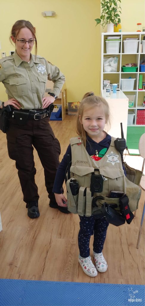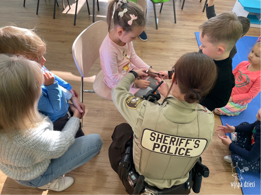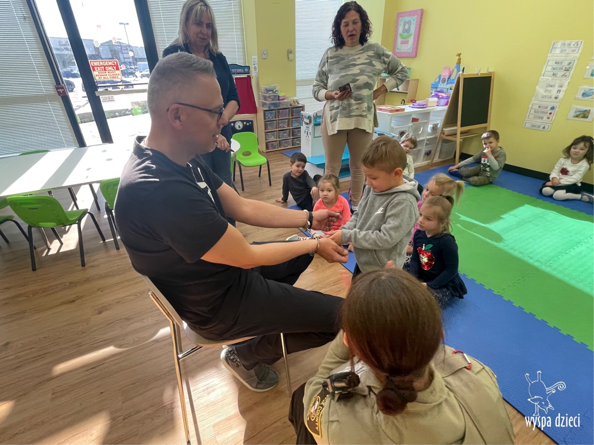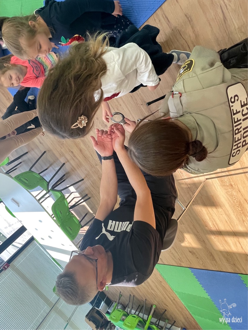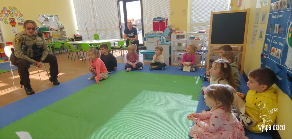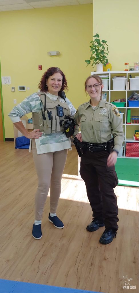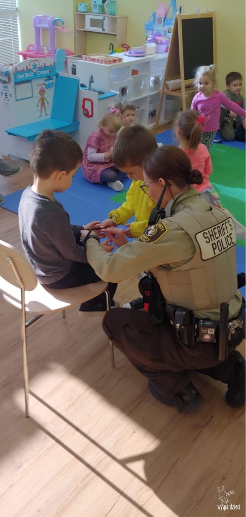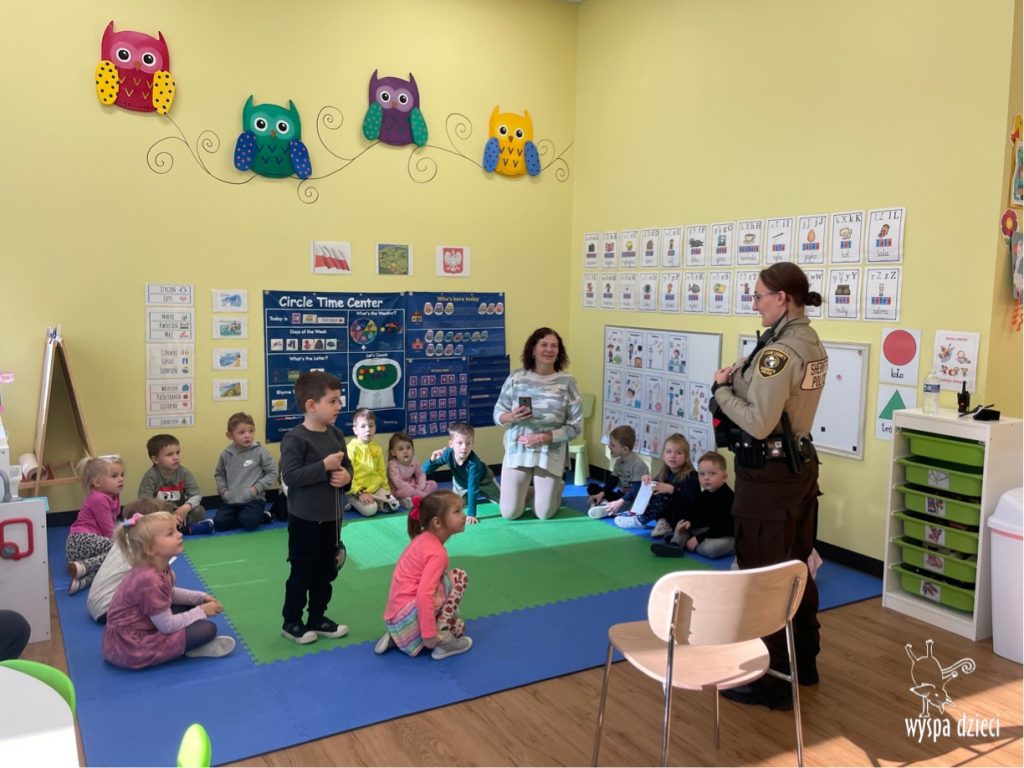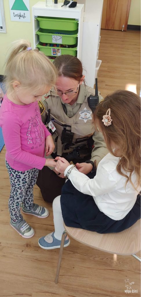 Temat tego tygodnia w Wyspie Dzieci w River Grove to – ZAWODY NASZYCH RODZICOW. Nasza placówkę odwiedzają rodzice oraz zaproszeni goście ktorzy opowiadają ciekawostki o swojej pracy. W środę 19 października, grupa Bystrzaków i Podroznikow gościła w swojej klasie Panią Oficer Gondek, która pełni funkcje Szeryfa. Pani Gondek opowiedziała małym słuchaczom o swojej pracy, o tym co robią policjanci, kiedy i jak wezwać ich na pomoc. Dla maluchów rozmowa z Panią Szeryf i zadawanie pytań bylo dużą atrakcją. A jeszcze większa było trzymanie w raczkach prawdziwych kajdanek ???. Spotkanie przebiegało w bardzo miłej atmosferze. Takie spotkania są zawsze doskonałą okazją by dzieci poznały zawód i pracę policjanta i dowiedziały się o tym jak ważna jest policyjna służba i bezpieczeństwo.