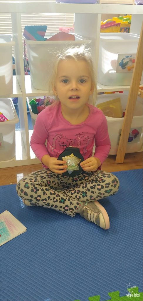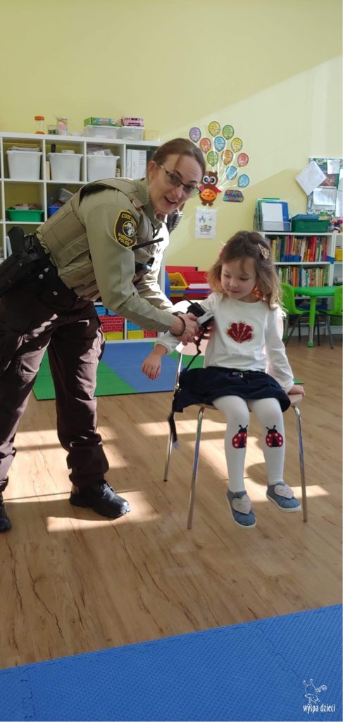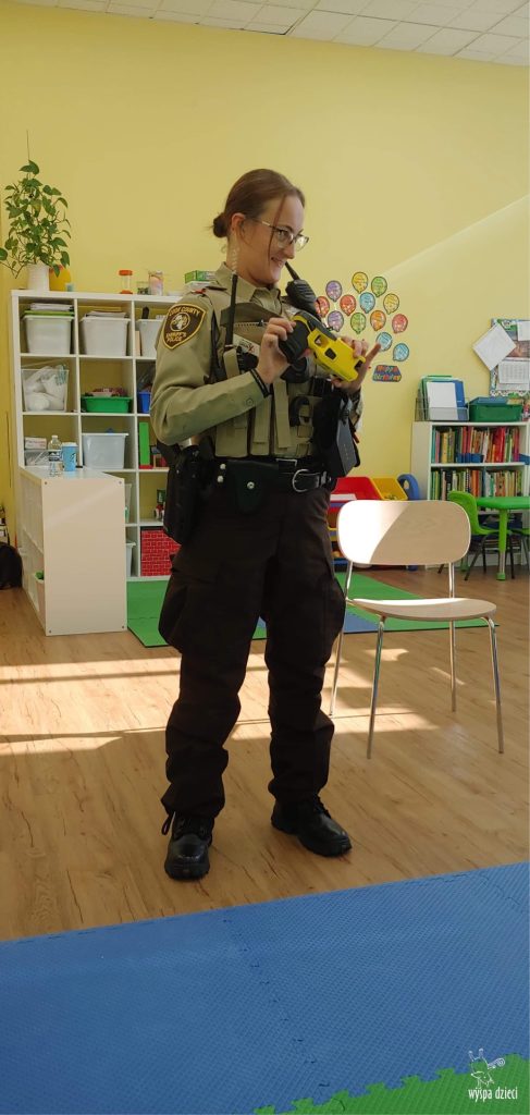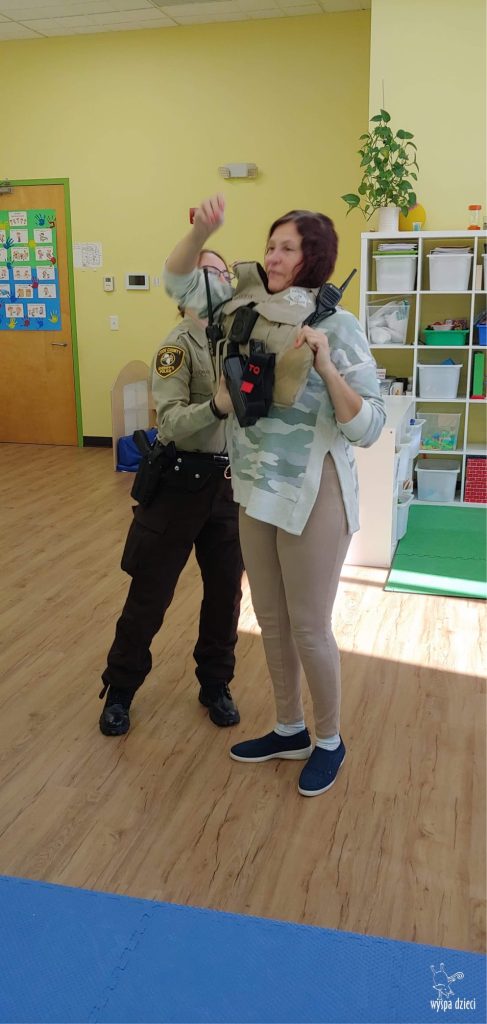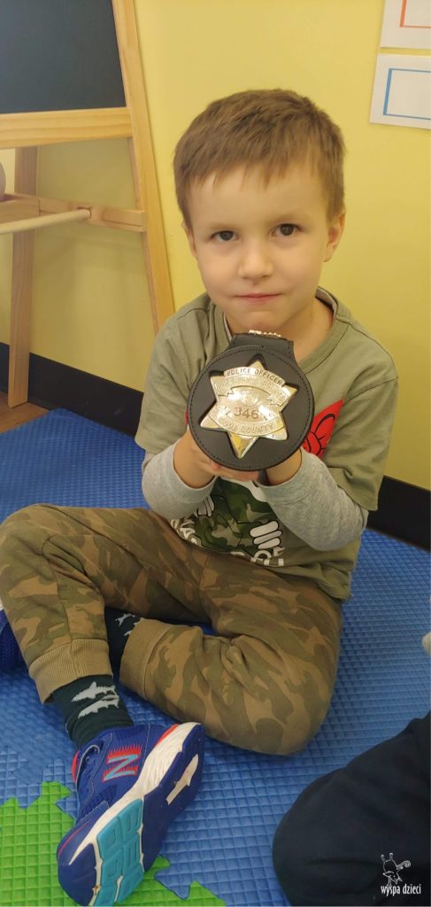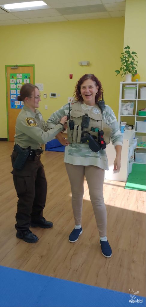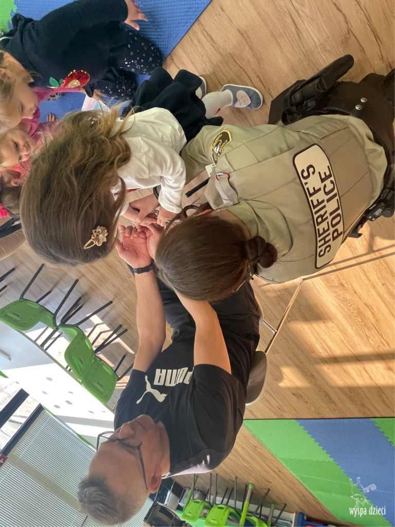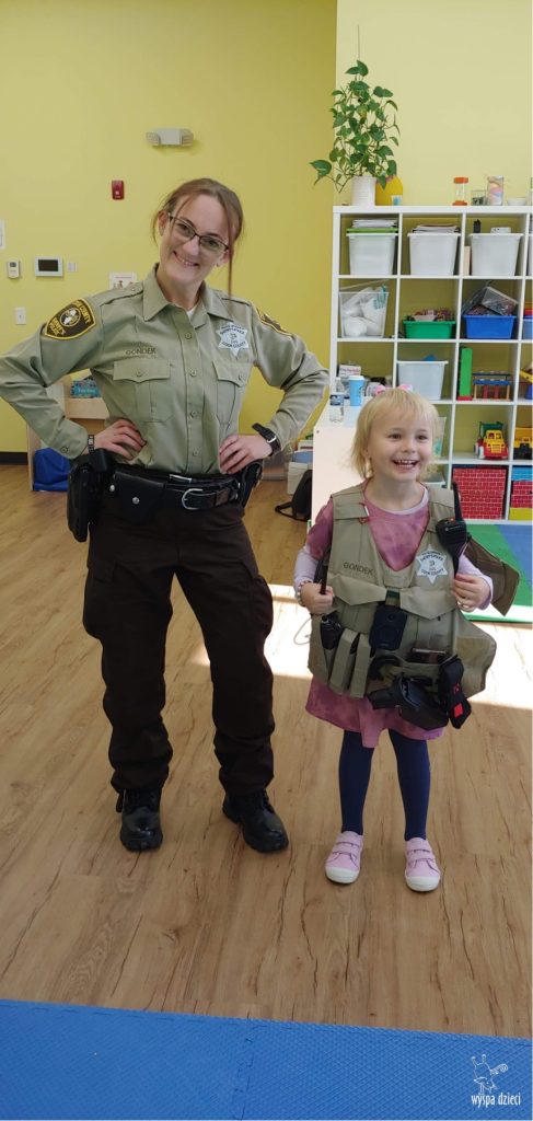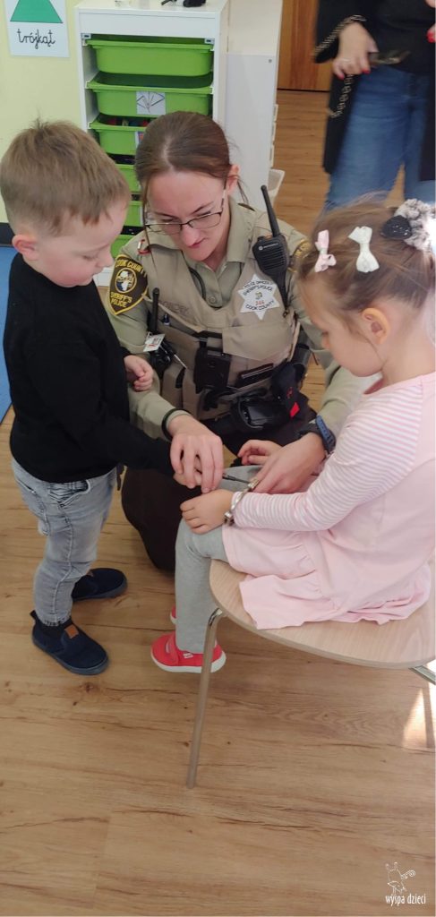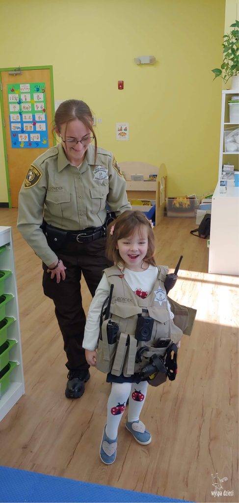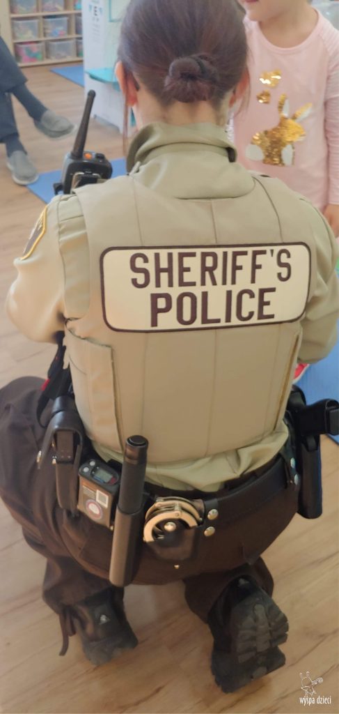 Temat tego tygodnia w Wyspie Dzieci w River Grove to – ZAWODY NASZYCH RODZICOW. Nasza placówkę odwiedzają rodzice oraz zaproszeni goście ktorzy opowiadają ciekawostki o swojej pracy. W środę 19 października, grupa Bystrzaków i Podroznikow gościła w swojej klasie Panią Oficer Gondek, która pełni funkcje Szeryfa. Pani Gondek opowiedziała małym słuchaczom o swojej pracy, o tym co robią policjanci, kiedy i jak wezwać ich na pomoc. Dla maluchów rozmowa z Panią Szeryf i zadawanie pytań bylo dużą atrakcją. A jeszcze większa było trzymanie w raczkach prawdziwych kajdanek ???. Spotkanie przebiegało w bardzo miłej atmosferze. Takie spotkania są zawsze doskonałą okazją by dzieci poznały zawód i pracę policjanta i dowiedziały się o tym jak ważna jest policyjna służba i bezpieczeństwo.