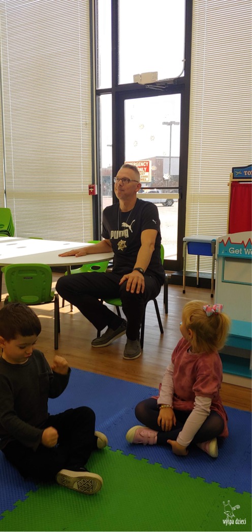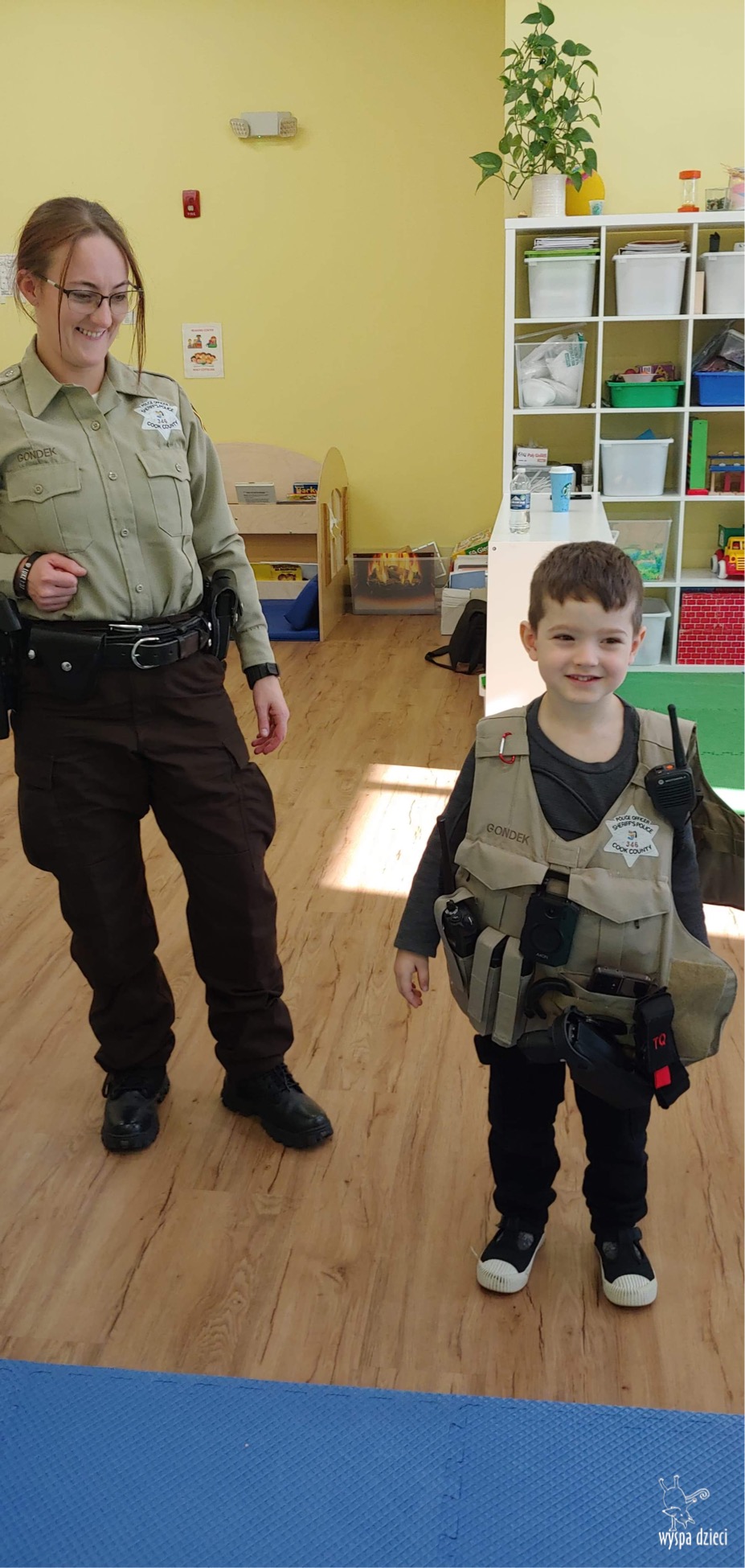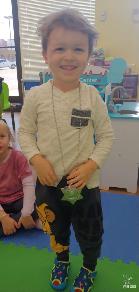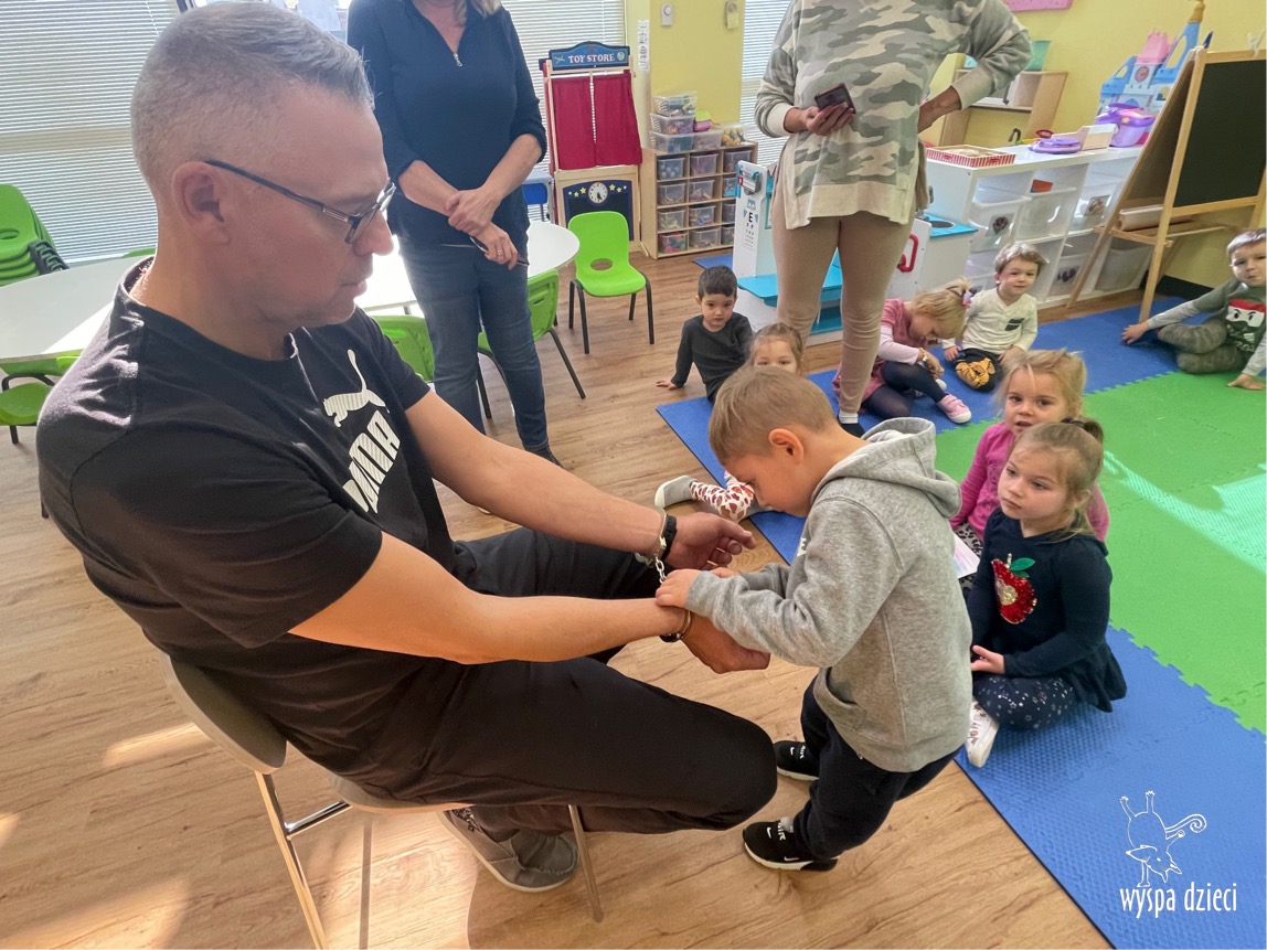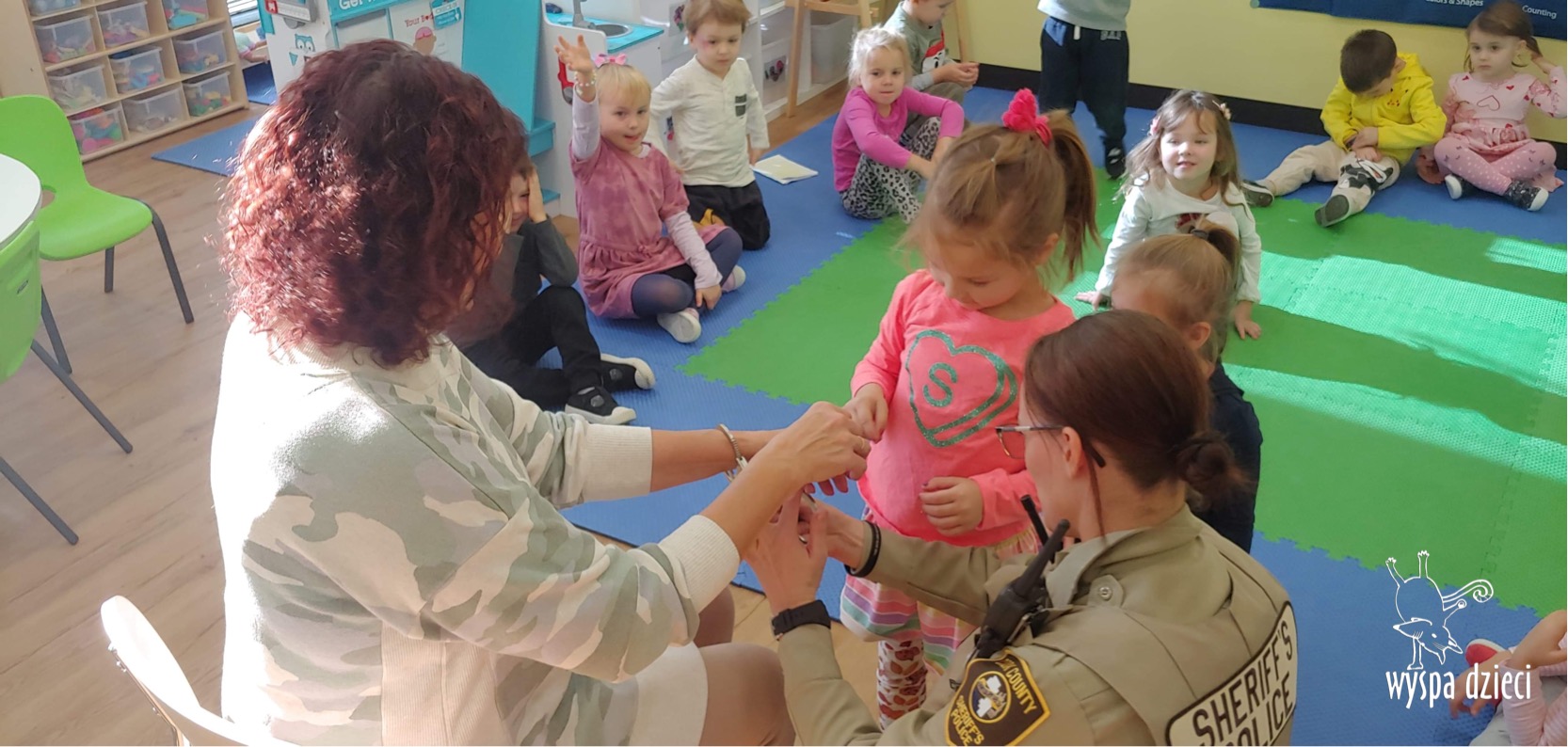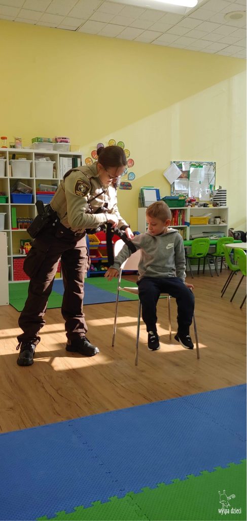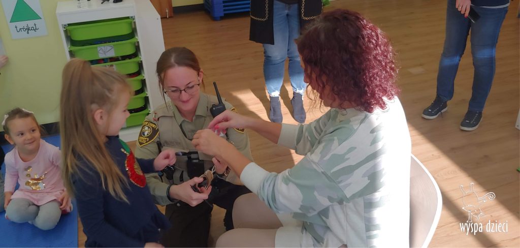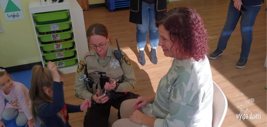 Temat tego tygodnia w Wyspie Dzieci w River Grove to – ZAWODY NASZYCH RODZICOW. Nasza placówkę odwiedzają rodzice oraz zaproszeni goście ktorzy opowiadają ciekawostki o swojej pracy. W środę 19 października, grupa Bystrzaków i Podroznikow gościła w swojej klasie Panią Oficer Gondek, która pełni funkcje Szeryfa. Pani Gondek opowiedziała małym słuchaczom o swojej pracy, o tym co robią policjanci, kiedy i jak wezwać ich na pomoc. Dla maluchów rozmowa z Panią Szeryf i zadawanie pytań bylo dużą atrakcją. A jeszcze większa było trzymanie w raczkach prawdziwych kajdanek ???. Spotkanie przebiegało w bardzo miłej atmosferze. Takie spotkania są zawsze doskonałą okazją by dzieci poznały zawód i pracę policjanta i dowiedziały się o tym jak ważna jest policyjna służba i bezpieczeństwo.