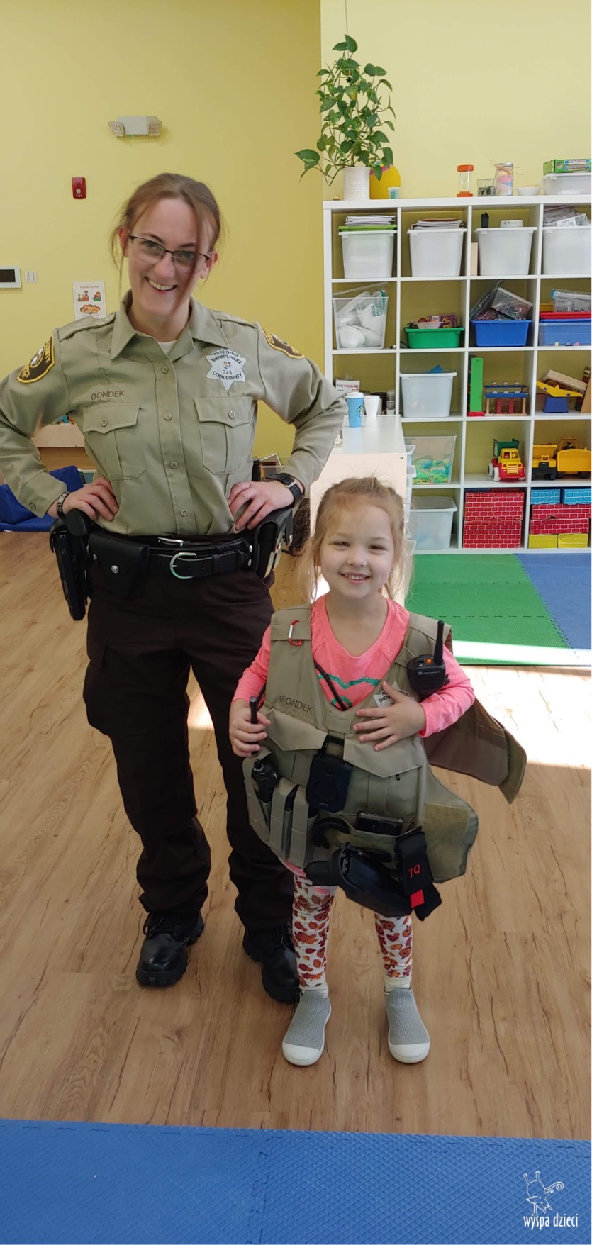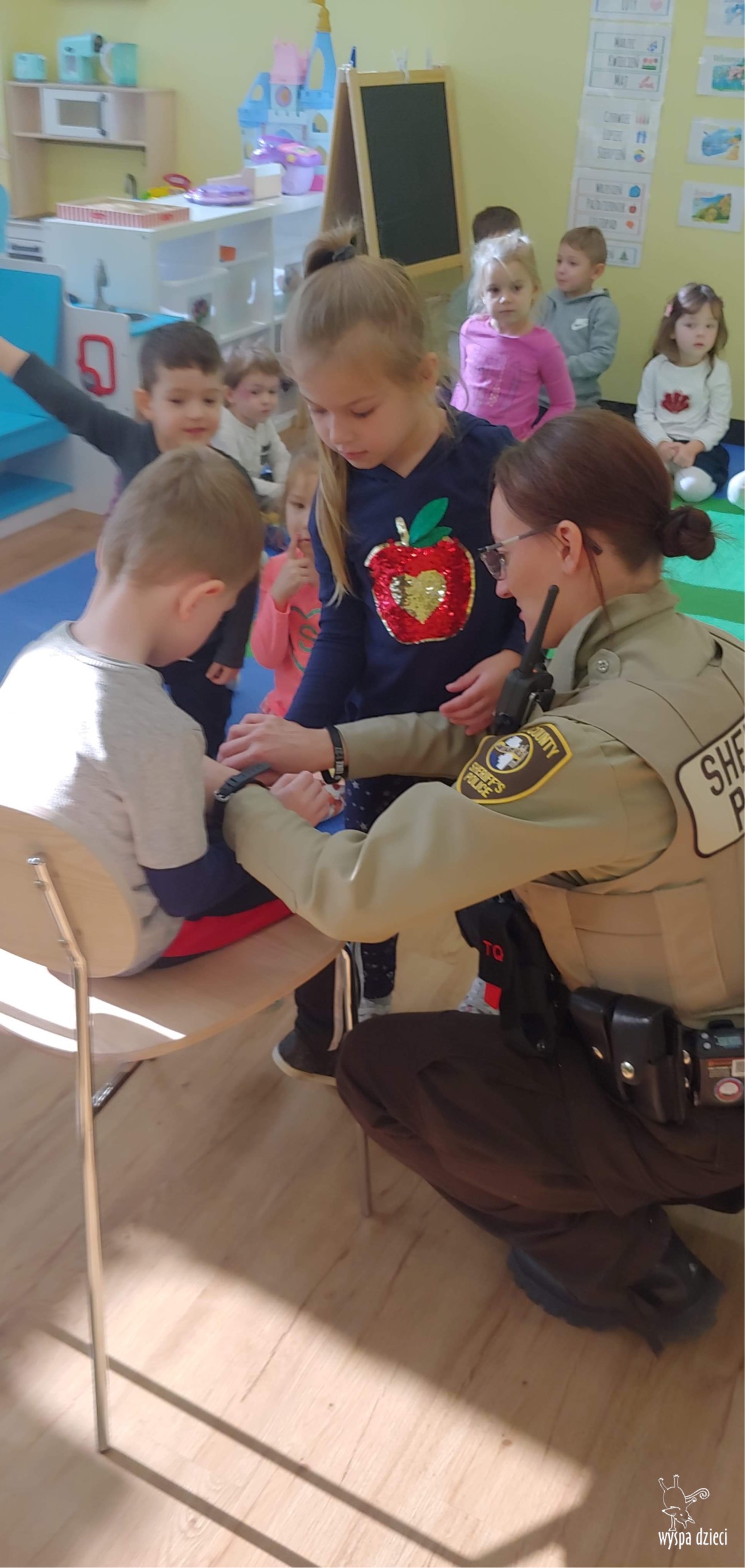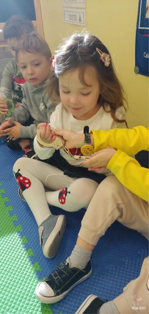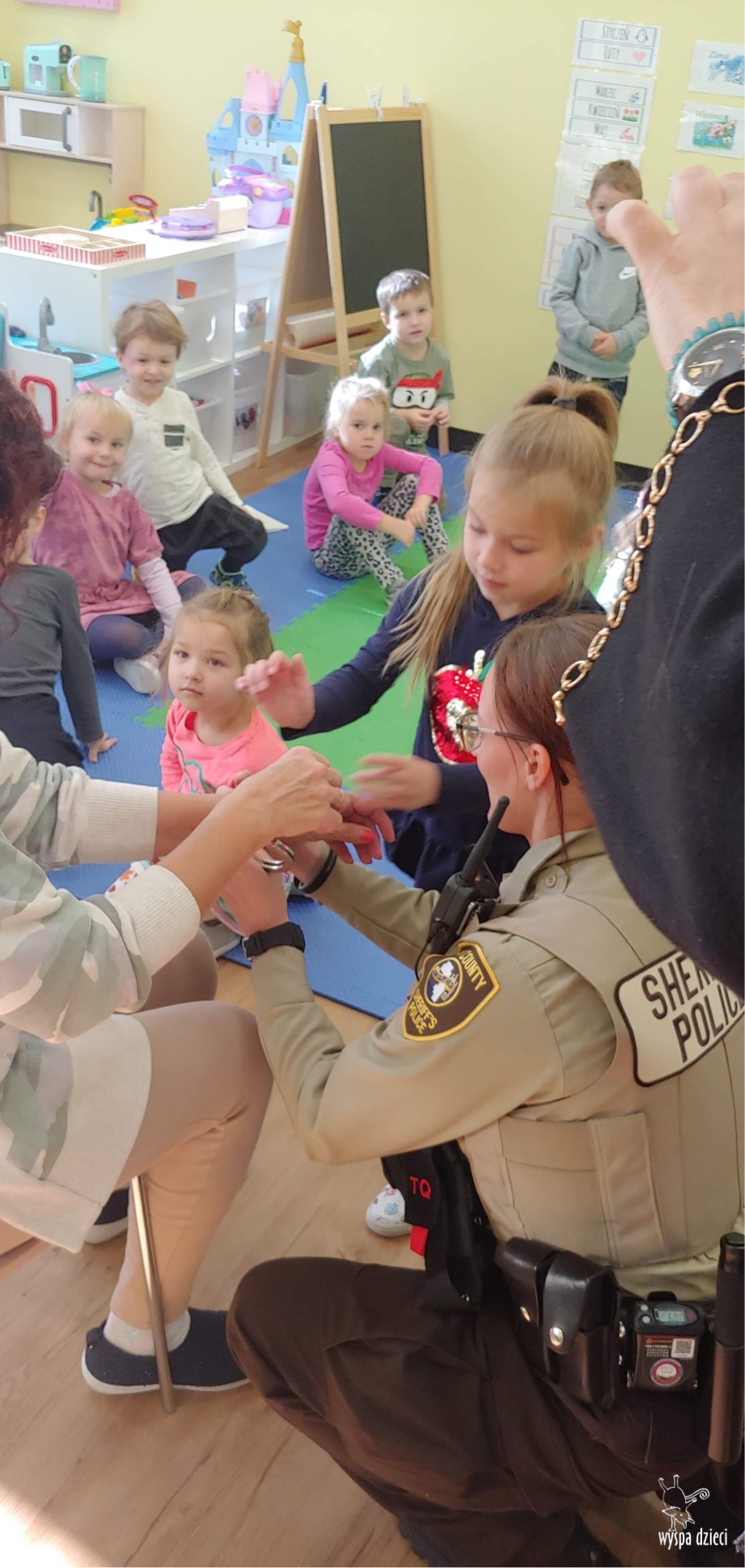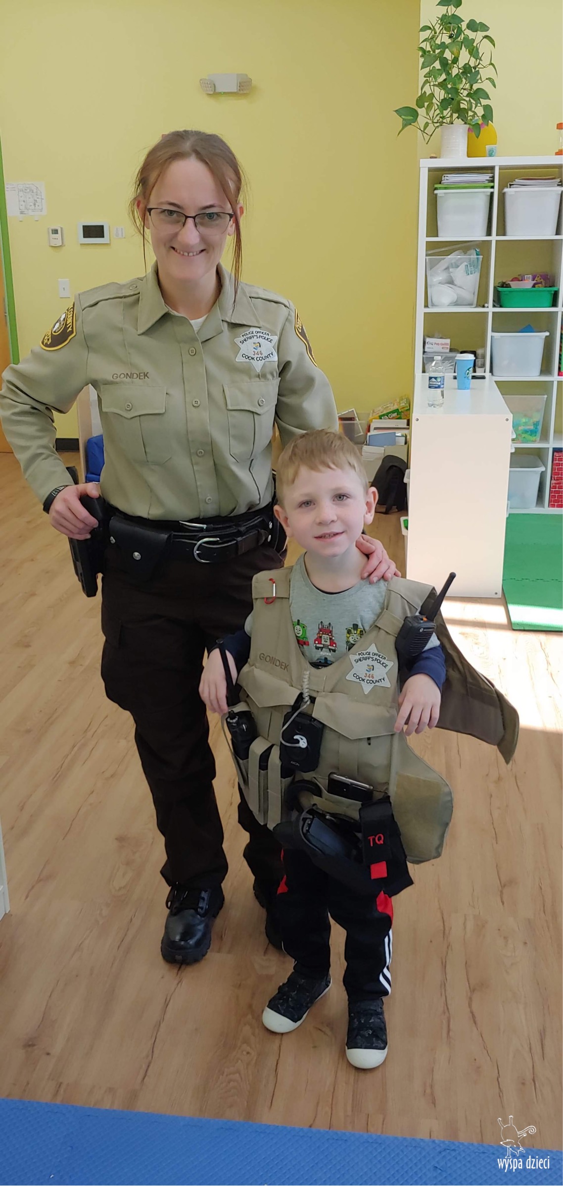 Temat tego tygodnia w Wyspie Dzieci w River Grove to – ZAWODY NASZYCH RODZICOW. Nasza placówkę odwiedzają rodzice oraz zaproszeni goście ktorzy opowiadają ciekawostki o swojej pracy. W środę 19 października, grupa Bystrzaków i Podroznikow gościła w swojej klasie Panią Oficer Gondek, która pełni funkcje Szeryfa. Pani Gondek opowiedziała małym słuchaczom o swojej pracy, o tym co robią policjanci, kiedy i jak wezwać ich na pomoc. Dla maluchów rozmowa z Panią Szeryf i zadawanie pytań bylo dużą atrakcją. A jeszcze większa było trzymanie w raczkach prawdziwych kajdanek ???. Spotkanie przebiegało w bardzo miłej atmosferze. Takie spotkania są zawsze doskonałą okazją by dzieci poznały zawód i pracę policjanta i dowiedziały się o tym jak ważna jest policyjna służba i bezpieczeństwo.