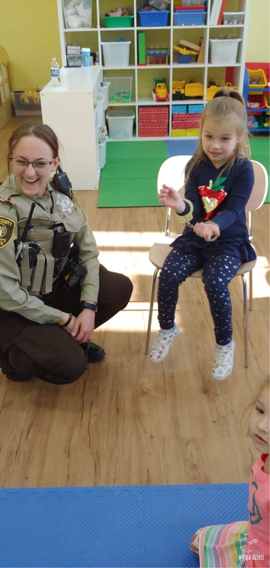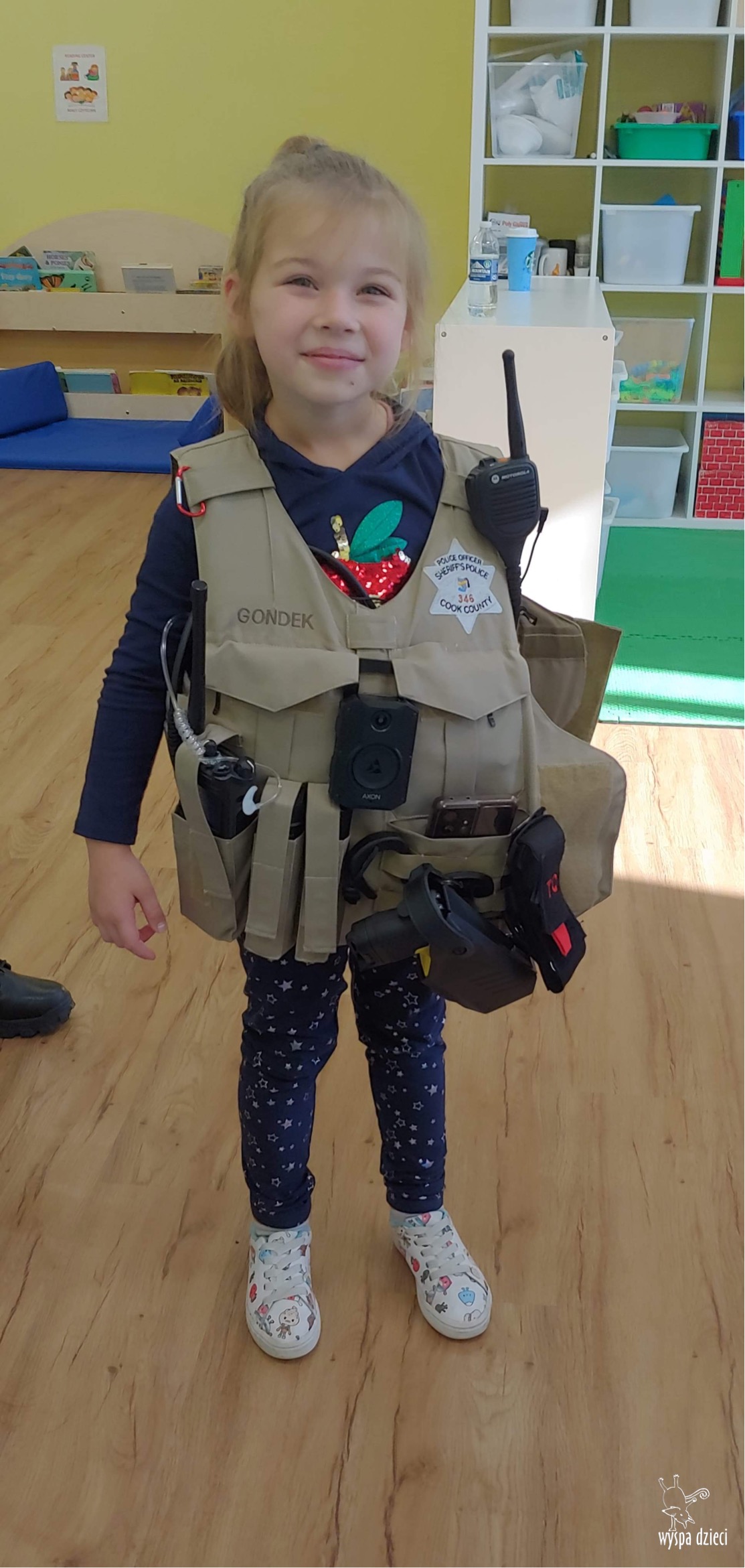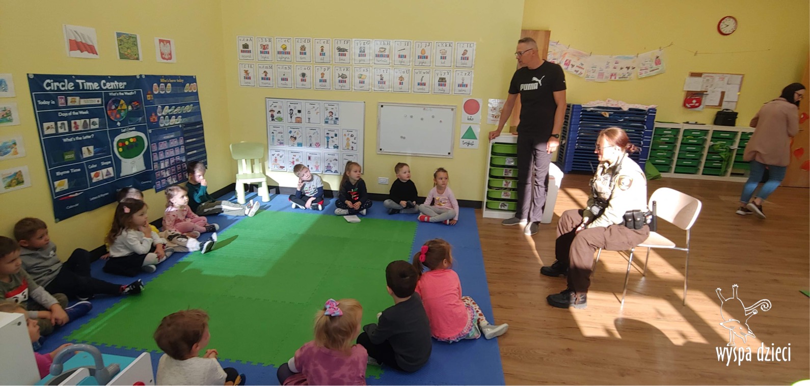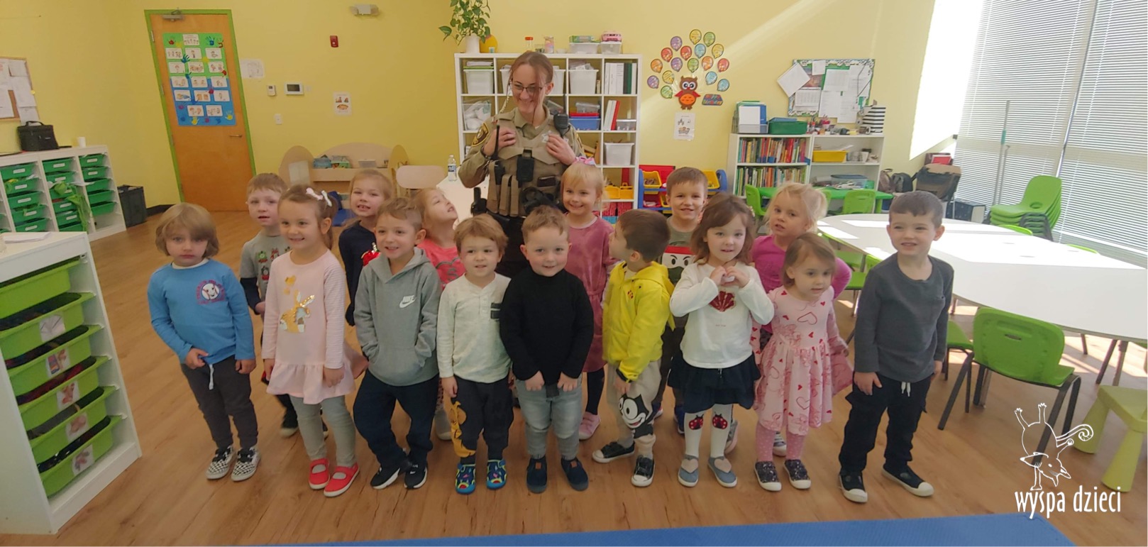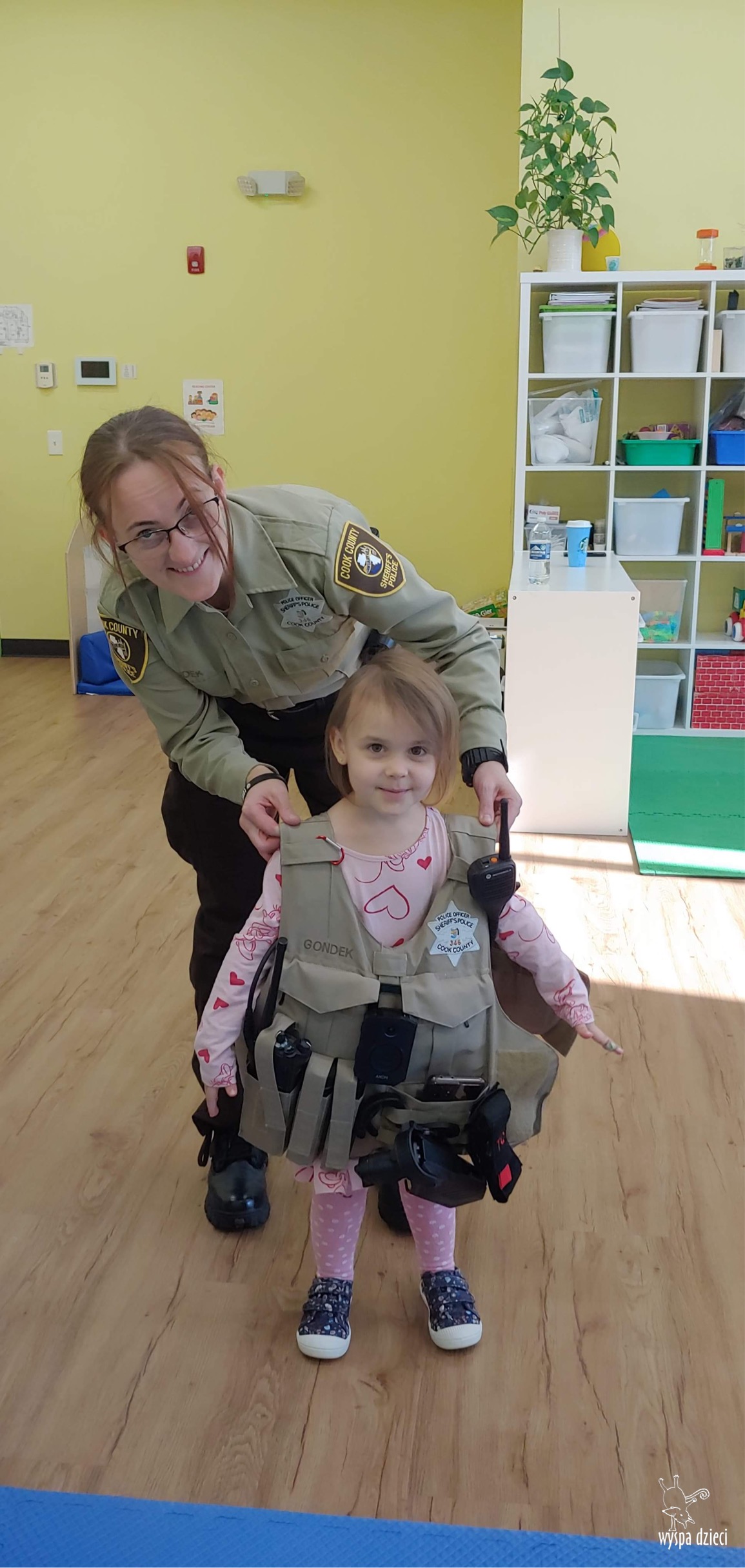 Temat tego tygodnia w Wyspie Dzieci w River Grove to – ZAWODY NASZYCH RODZICOW. Nasza placówkę odwiedzają rodzice oraz zaproszeni goście ktorzy opowiadają ciekawostki o swojej pracy. W środę 19 października, grupa Bystrzaków i Podroznikow gościła w swojej klasie Panią Oficer Gondek, która pełni funkcje Szeryfa. Pani Gondek opowiedziała małym słuchaczom o swojej pracy, o tym co robią policjanci, kiedy i jak wezwać ich na pomoc. Dla maluchów rozmowa z Panią Szeryf i zadawanie pytań bylo dużą atrakcją. A jeszcze większa było trzymanie w raczkach prawdziwych kajdanek ???. Spotkanie przebiegało w bardzo miłej atmosferze. Takie spotkania są zawsze doskonałą okazją by dzieci poznały zawód i pracę policjanta i dowiedziały się o tym jak ważna jest policyjna służba i bezpieczeństwo.