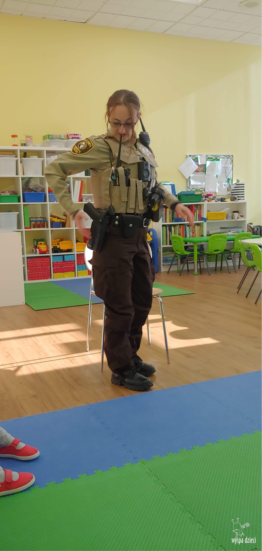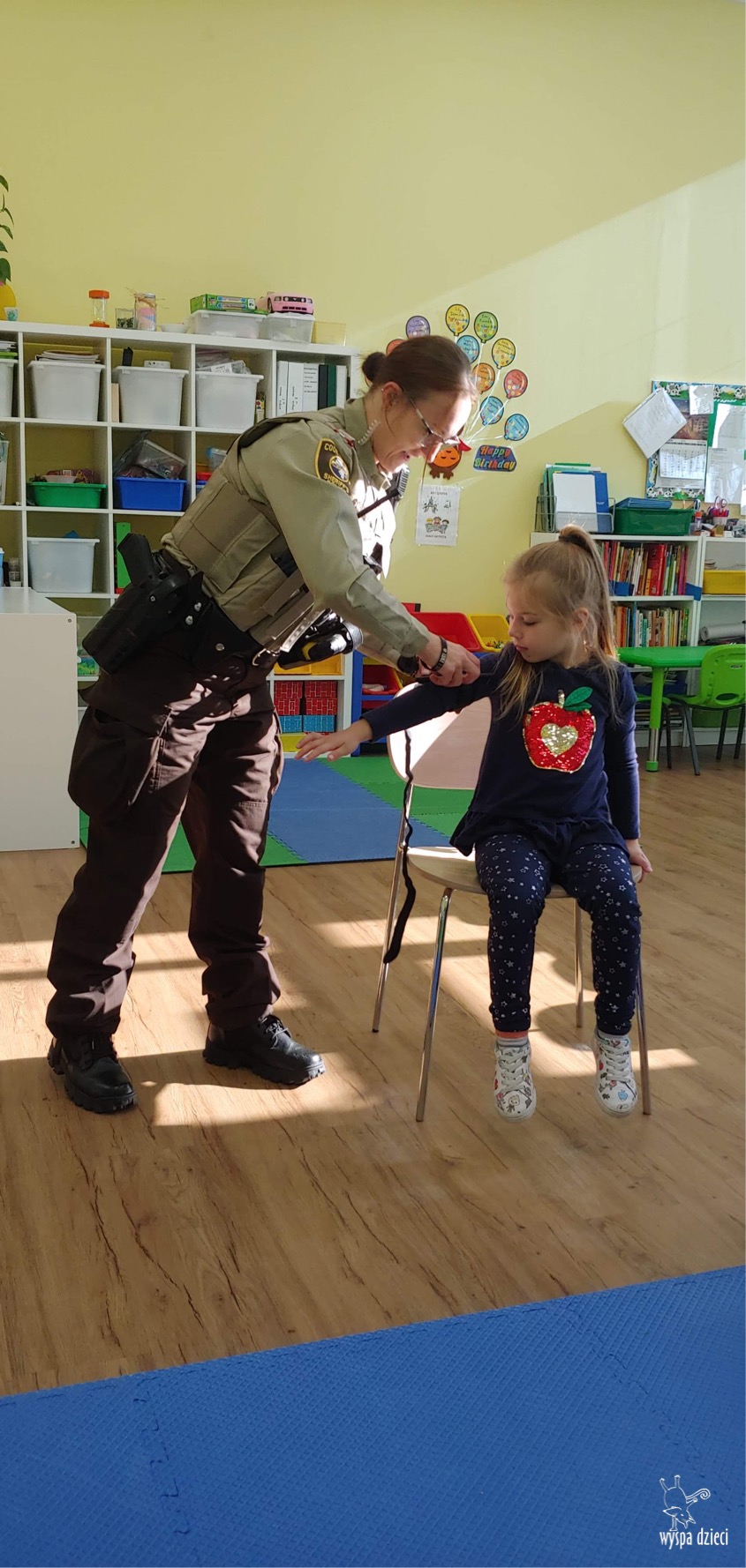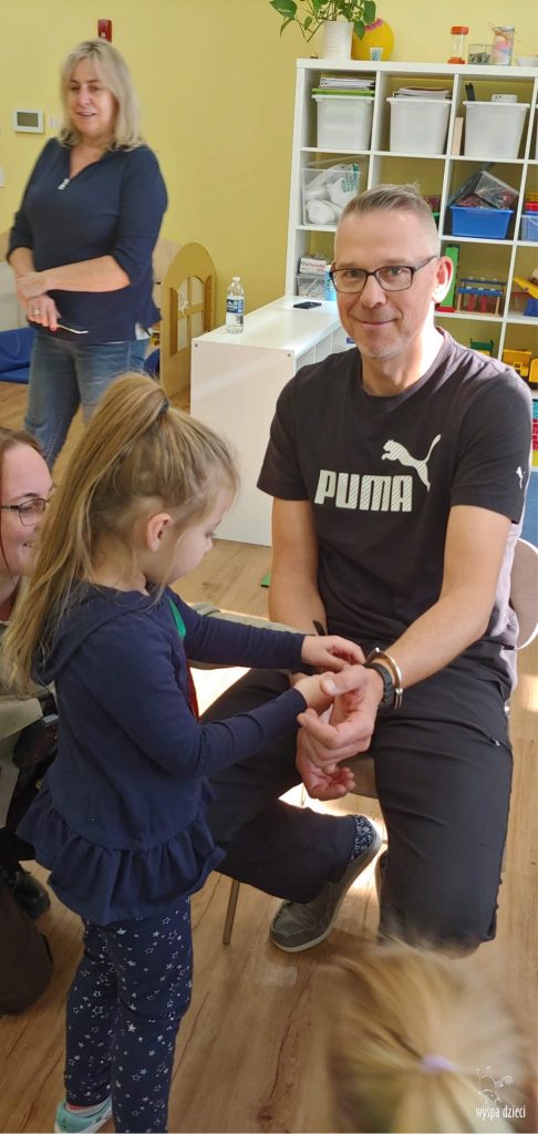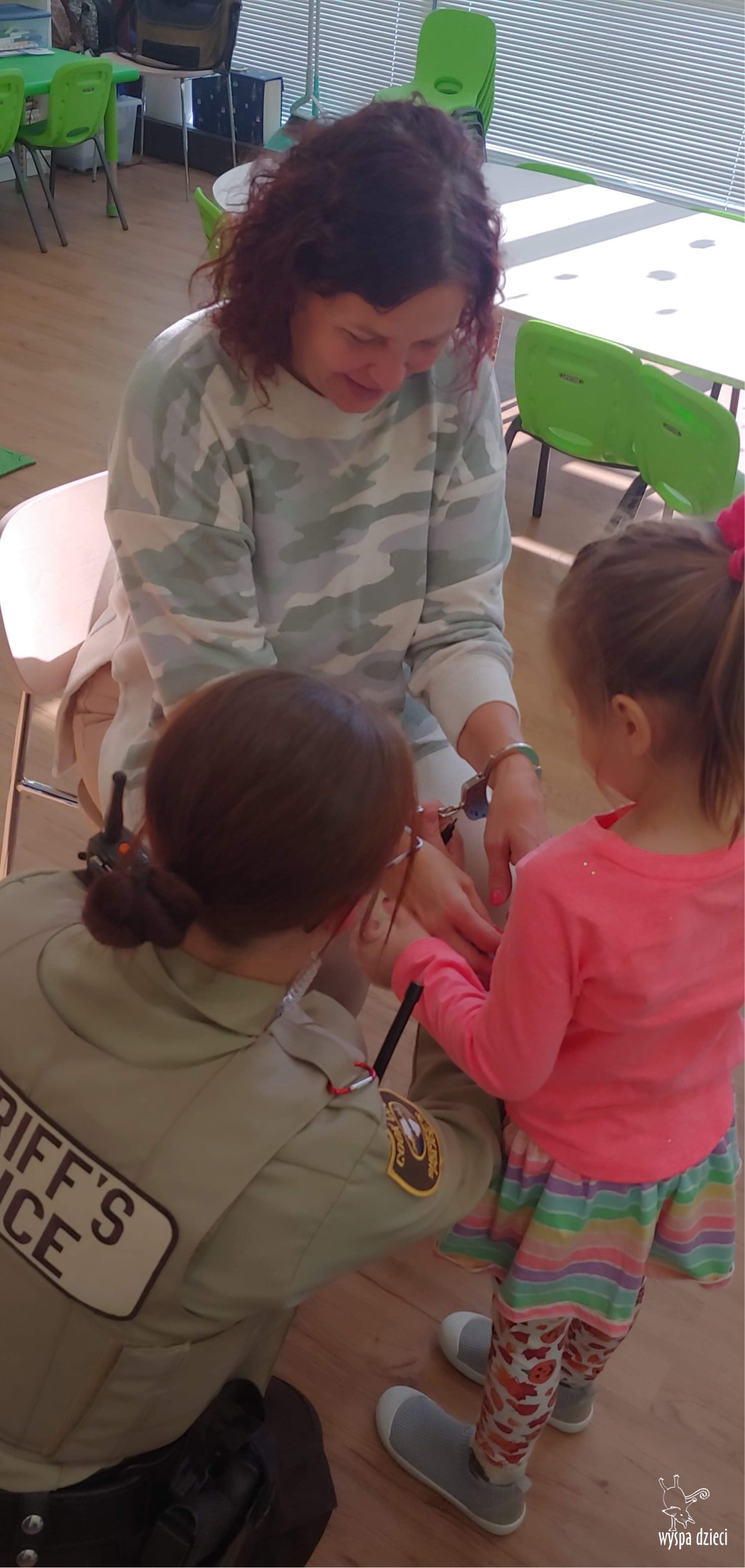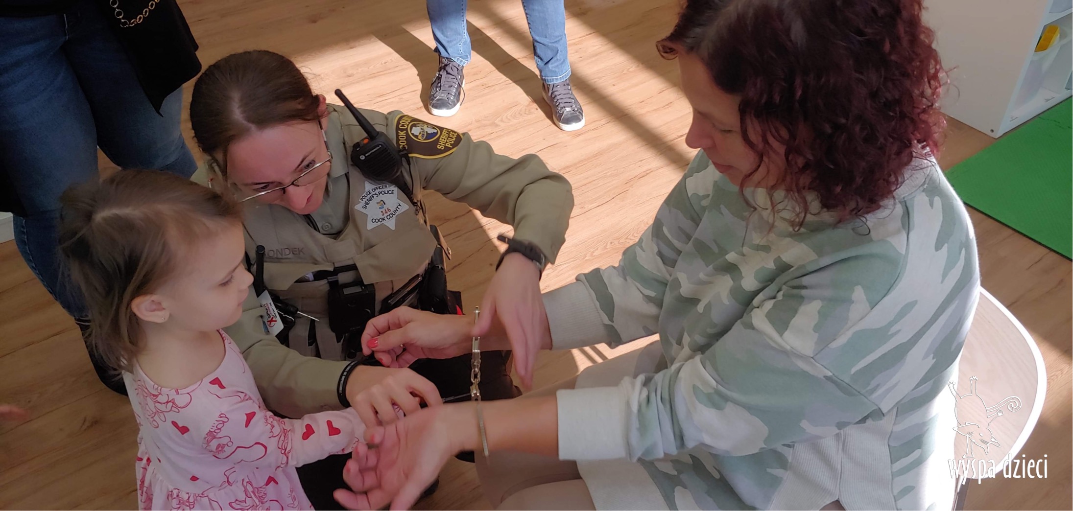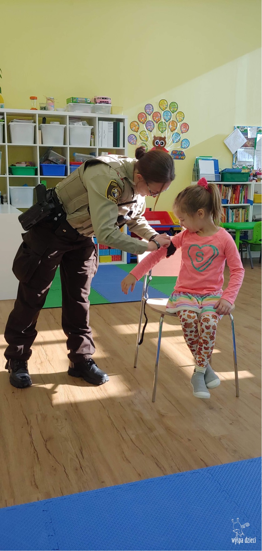 Temat tego tygodnia w Wyspie Dzieci w River Grove to – ZAWODY NASZYCH RODZICOW. Nasza placówkę odwiedzają rodzice oraz zaproszeni goście ktorzy opowiadają ciekawostki o swojej pracy. W środę 19 października, grupa Bystrzaków i Podroznikow gościła w swojej klasie Panią Oficer Gondek, która pełni funkcje Szeryfa. Pani Gondek opowiedziała małym słuchaczom o swojej pracy, o tym co robią policjanci, kiedy i jak wezwać ich na pomoc. Dla maluchów rozmowa z Panią Szeryf i zadawanie pytań bylo dużą atrakcją. A jeszcze większa było trzymanie w raczkach prawdziwych kajdanek ???. Spotkanie przebiegało w bardzo miłej atmosferze. Takie spotkania są zawsze doskonałą okazją by dzieci poznały zawód i pracę policjanta i dowiedziały się o tym jak ważna jest policyjna służba i bezpieczeństwo.