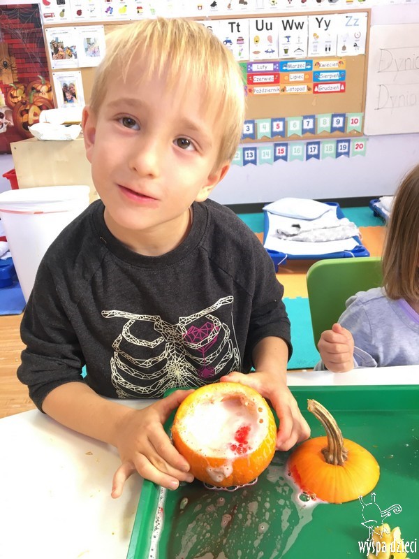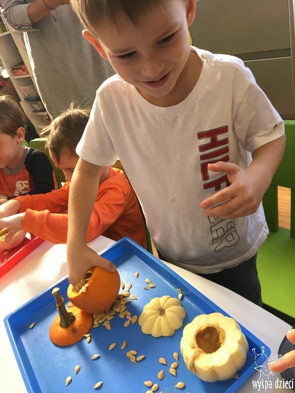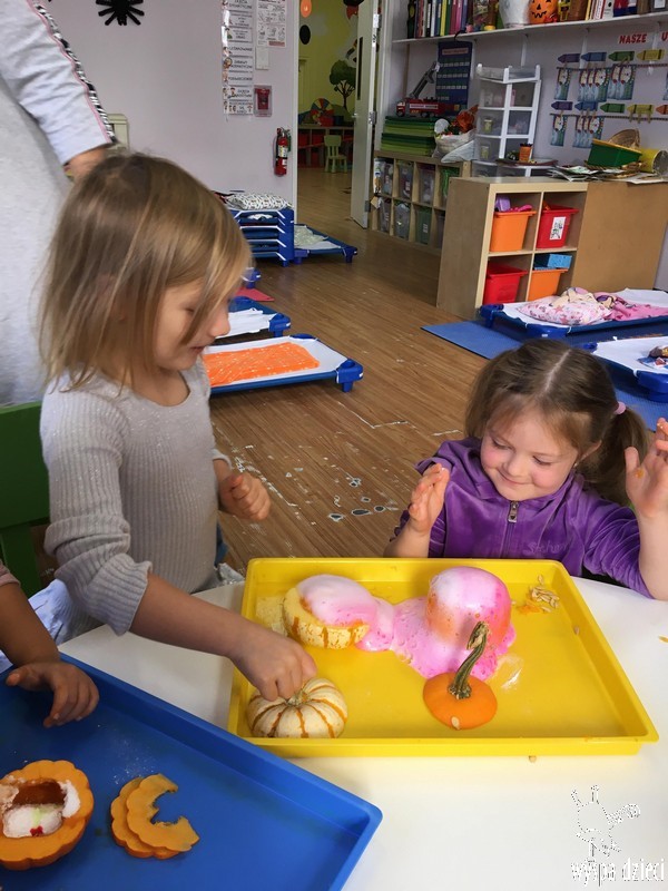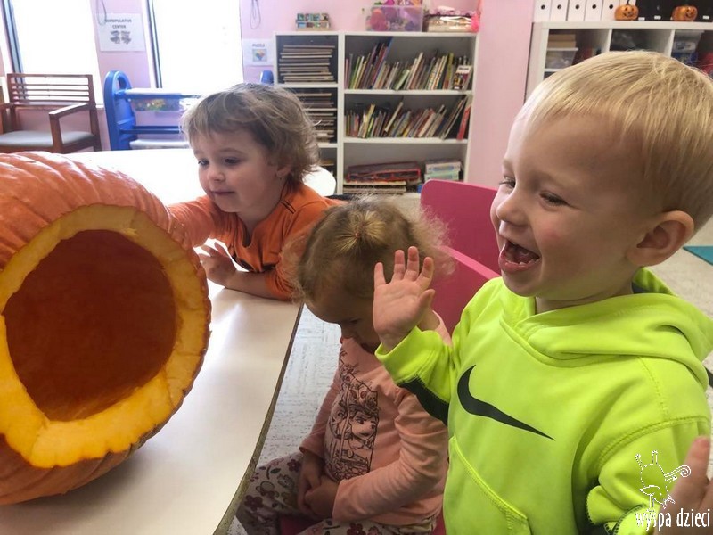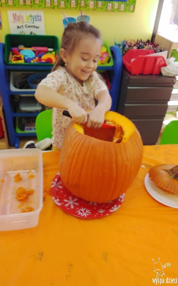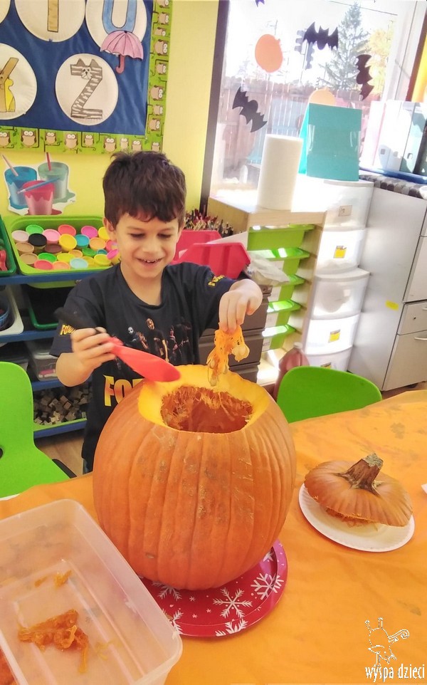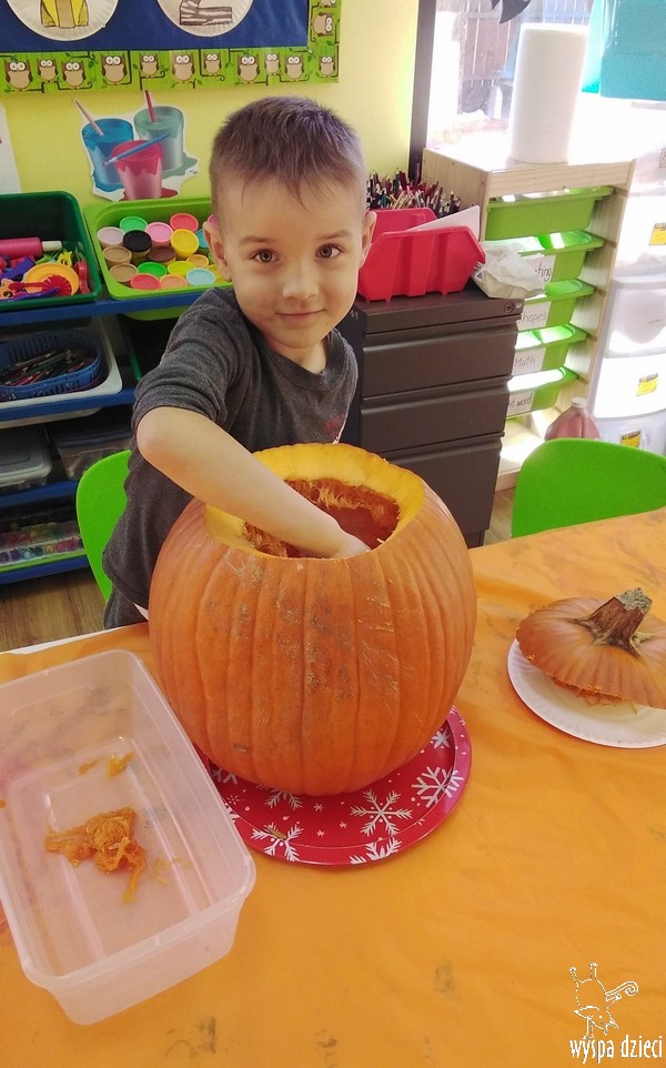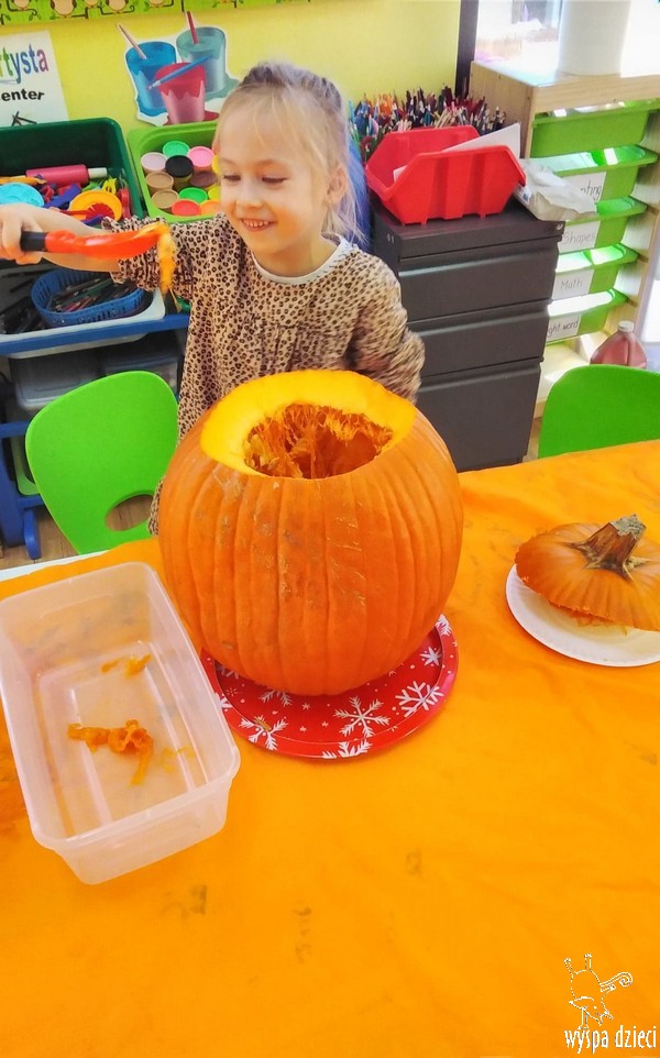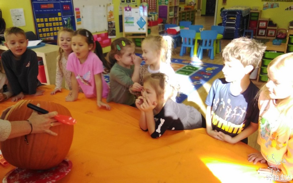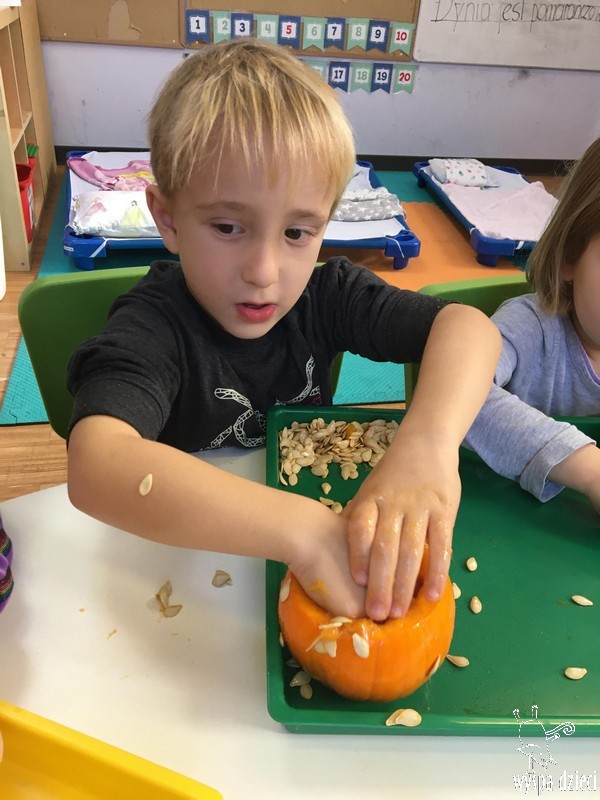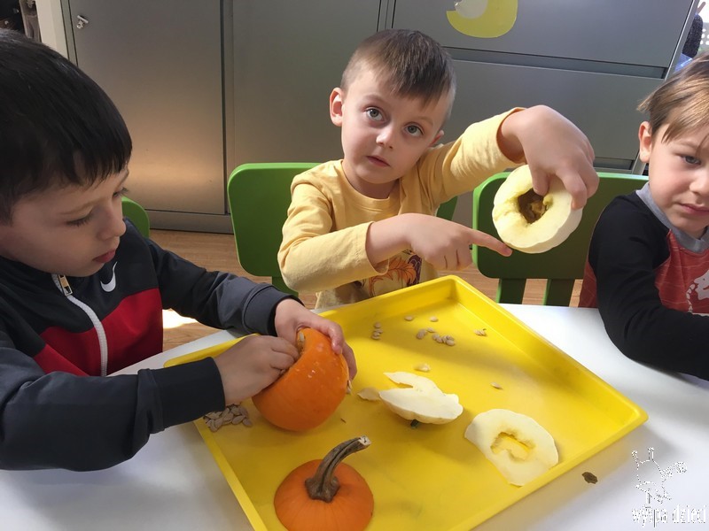 W zeszłym tygodniu nasze przedszkolaki polisensorycznie zapoznały się z dynią. Mówiliśmy o jej wielkościach, kształtach i kolorach. Dzieci ćwiczyły sprawność manualną przy wydrążaniu i liczeniu pestek dyni. Robiliśmy również eksperymety dyniowe oraz różne projekty plastyczne.