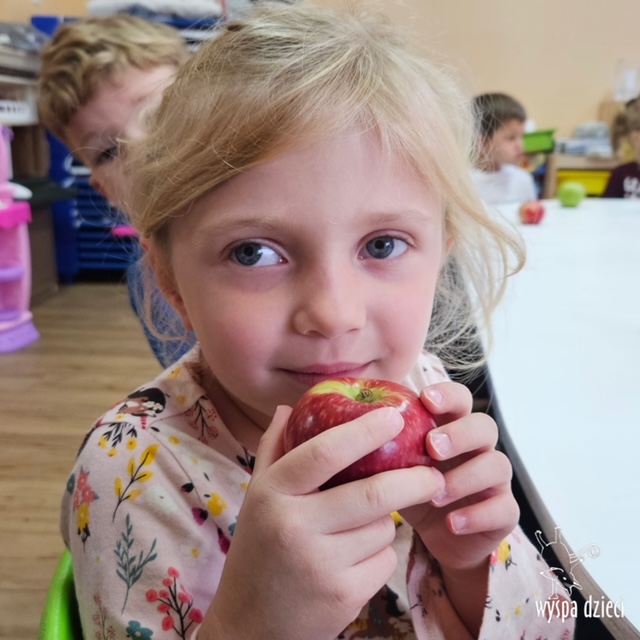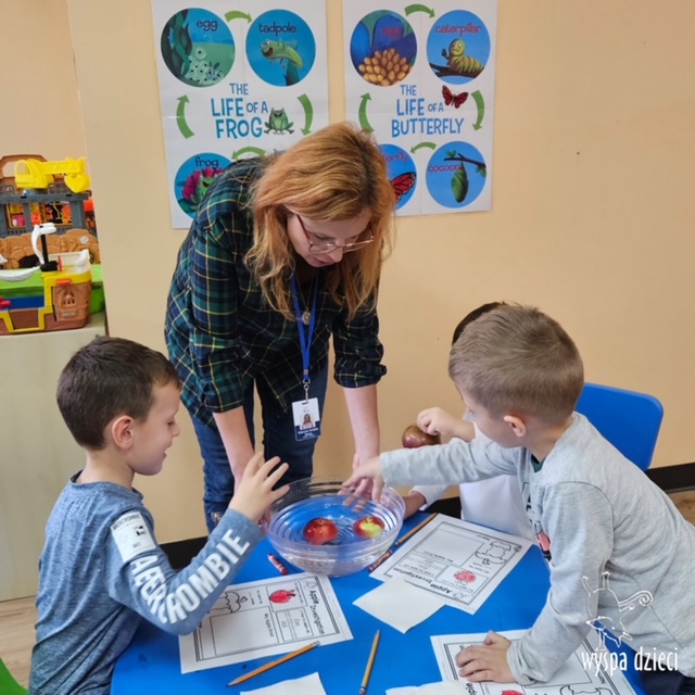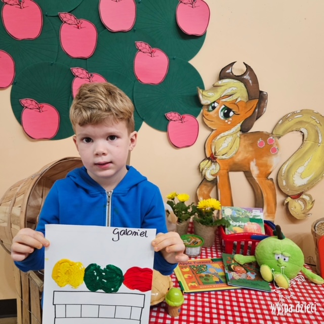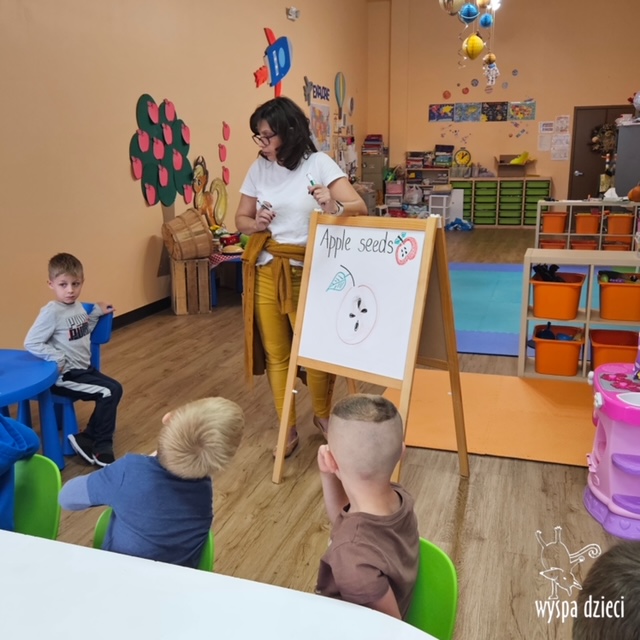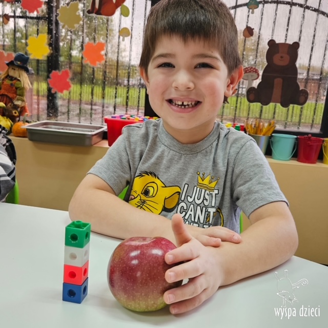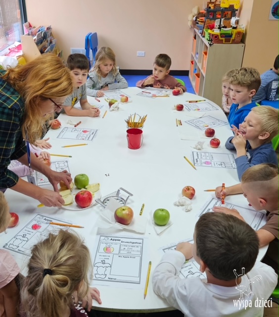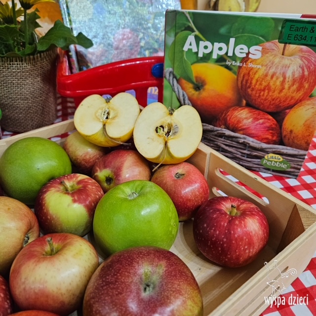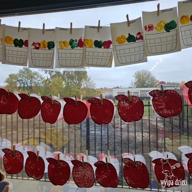Odkrywcy uroczystoście celebrowali święto swojego ulubionego owocu. Były gry, piosenki, rymowanki i wspólne czytanie historii prosto z sadu. Uczniów głosowali na ulubiony gatunek jablka, przeprowadzali naukowe eksperymenty i poszukiwali zaginionych jabłuszek (scavenger hunt). Dużo satysfakcji sprawiły Odkrywcom plastyczne i sensoryczne projekty ( marble art, apple stamping) Bardzo podobała im się owocowa joga, ale największą frajdę sprawiła oczywiście degustacja jabłkowych pyszności – świeżego soku, sosu z cynamonem i pysznej szarlotki. Zresztą, zobaczcie sami.