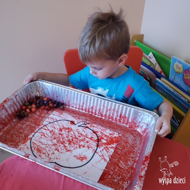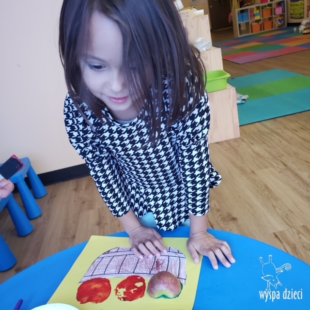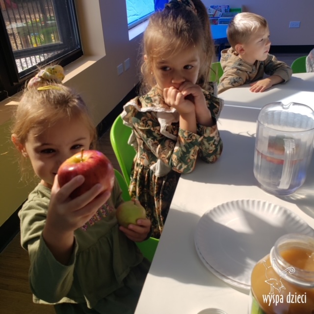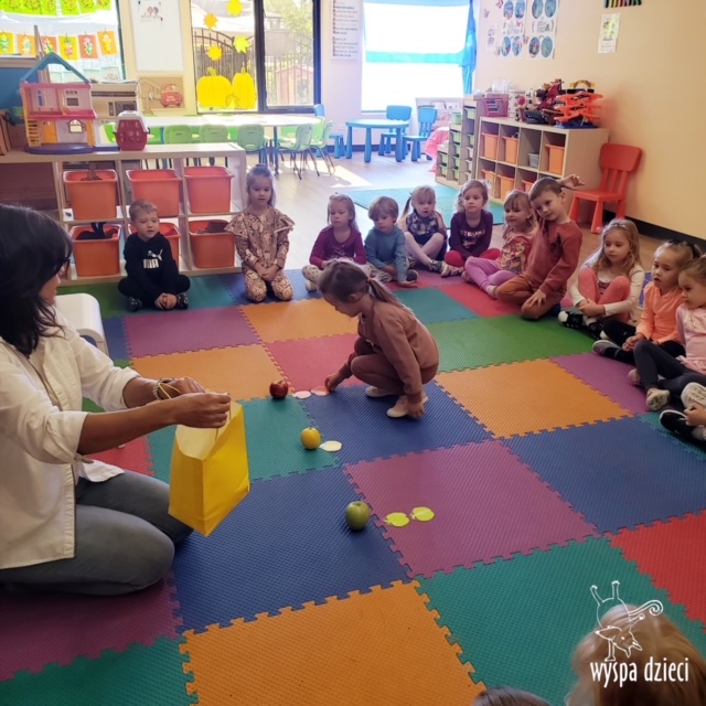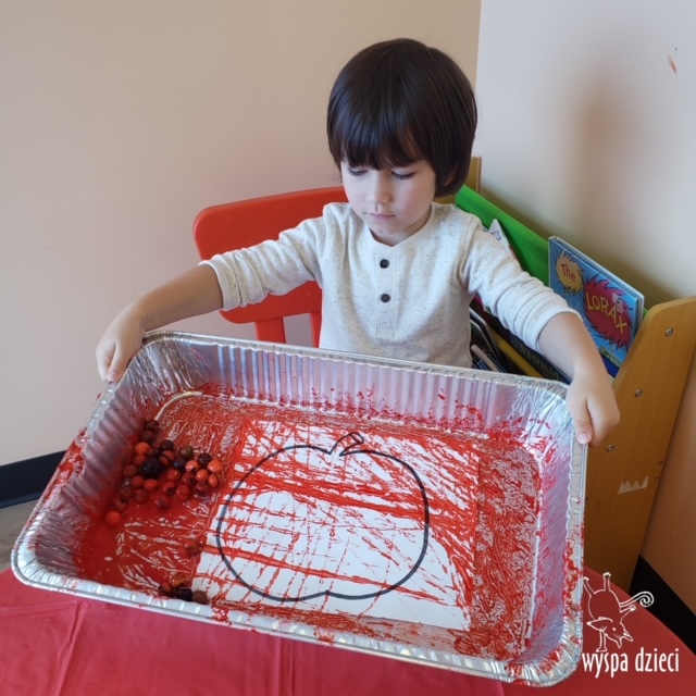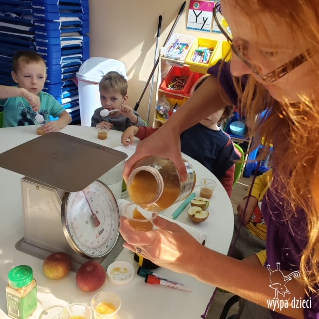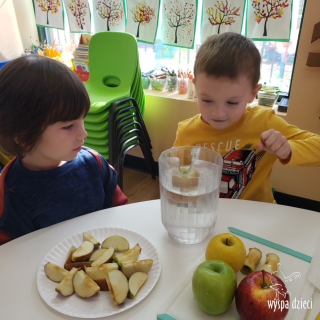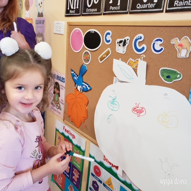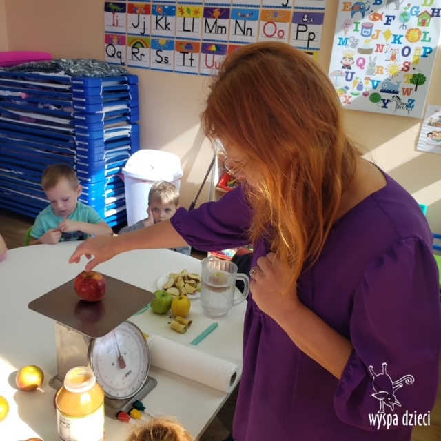 W ramach tzw. Apple investigation odbyło się liczenie jabłek i pestek, ważenie, mierzenie, turlanie, wąchanie i degustowanie jabłek. Nie zabrakło też musu z dodatkiem cynamonu, jogi w sadzie, a wybór książek o ulubionych owocach okazał się imponujący. Do ulubionych zajęć należały: projekty artystyczne, min. sensoryczne malowanie za pomocą kulek (marble art), odciskanie jablkowych połówek, karmienie Bardzo Głodnej Gąsienicy z popularnej książki Erica Carle’a, malowanie jabłoni, rymowanki oraz rozmaite gry edukacyjne.