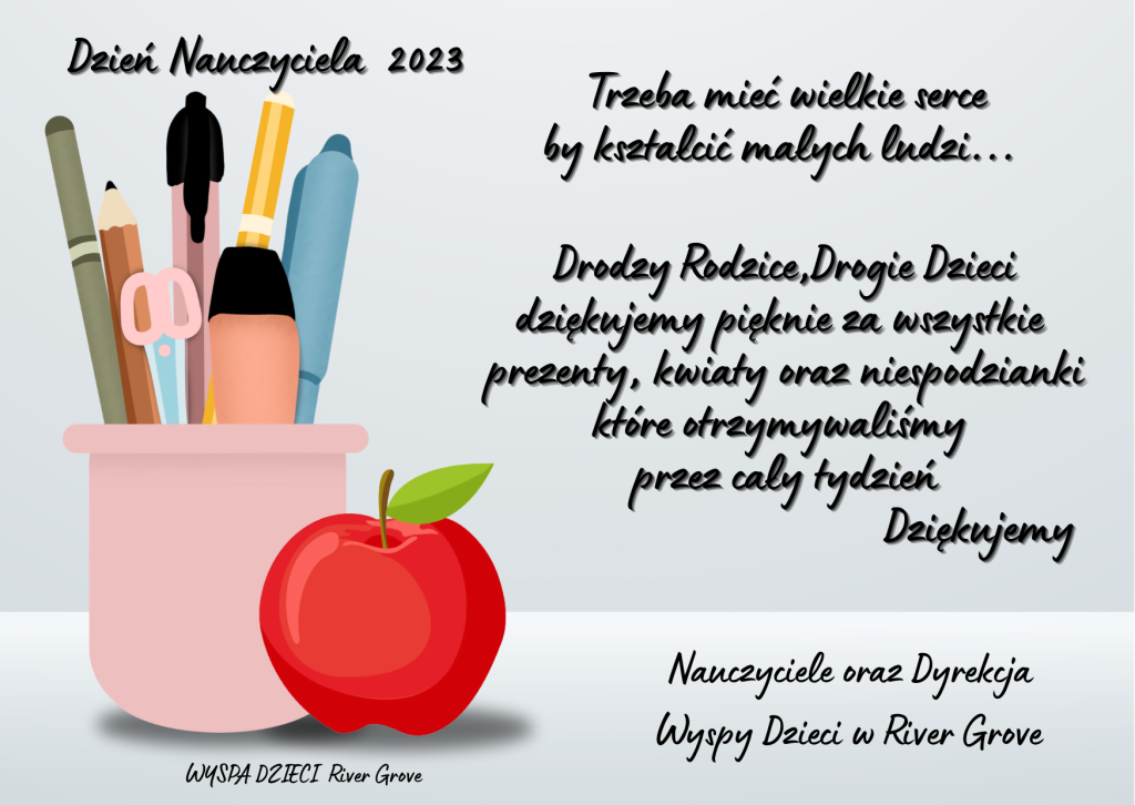 NAUCZYCIELE, PRACOWNICY ORAZ DYREKCJA WYSPY DZIECI River Grove SKŁADAJĄ SERDECZNE PODZIĘKOWANIA WSZYSTKIM DZIECIOM I RODZICOM ZA ŻYCZENIA, PAMIĘĆ, MIŁE SŁOWA, NIESPODZIANKI KTÓRE NAPŁYWAŁY DO NAS PRZEZ CAŁY TYDZIEŃ.