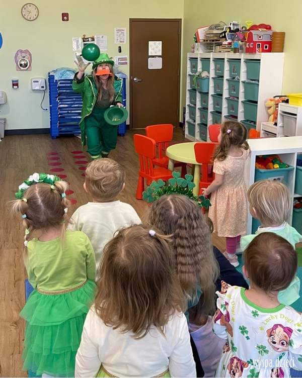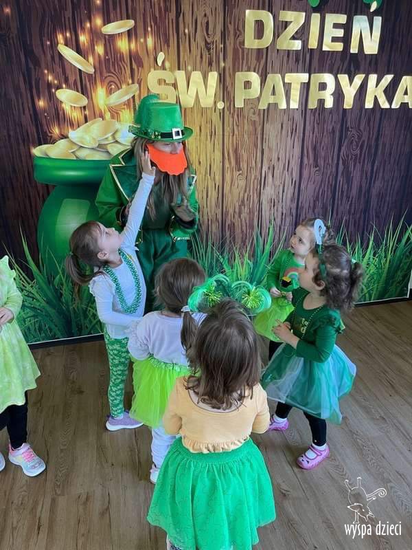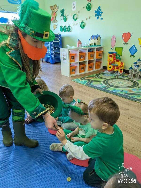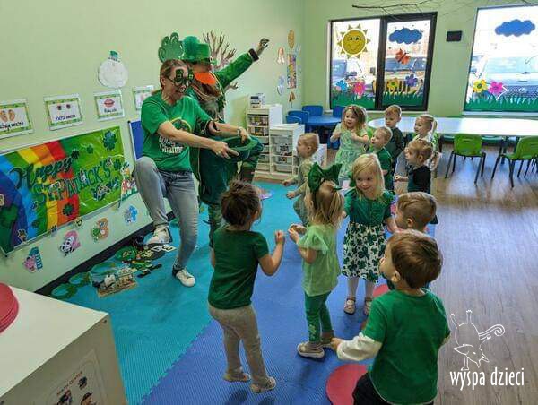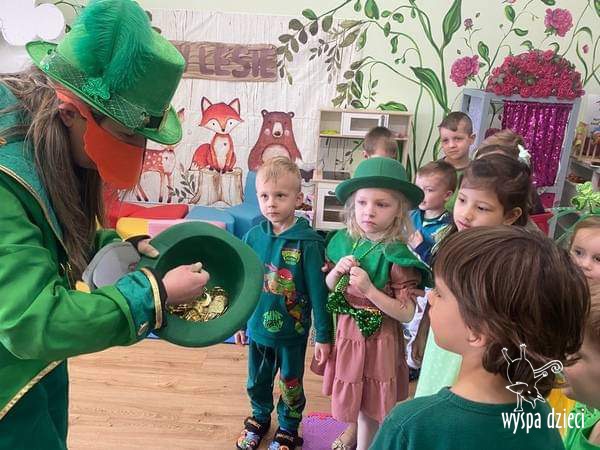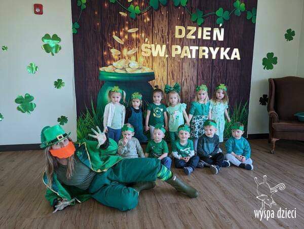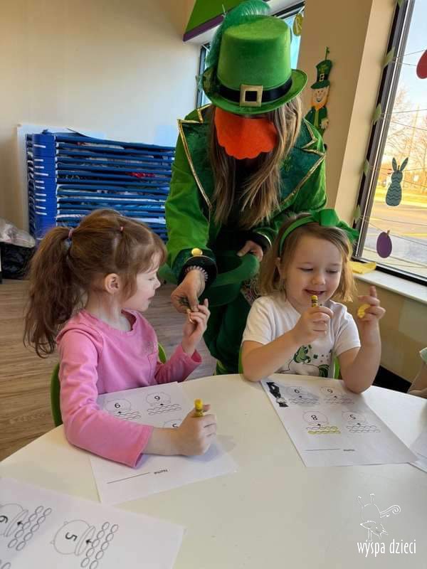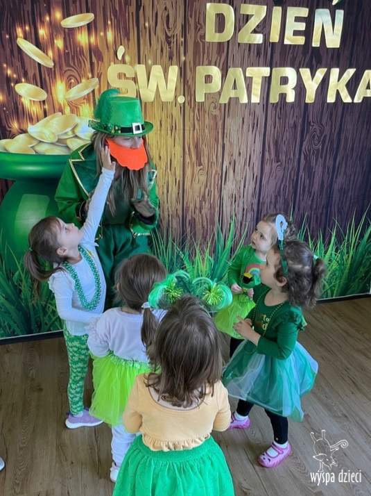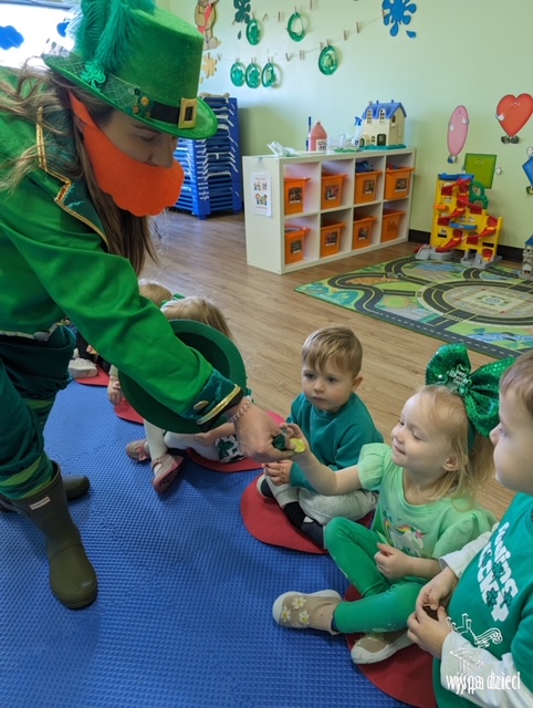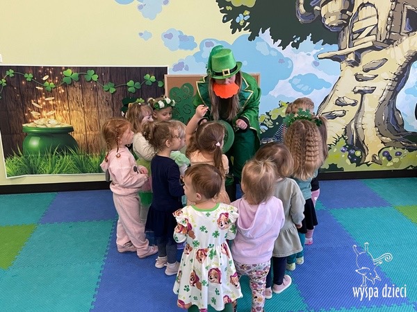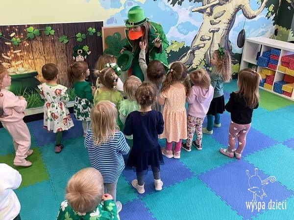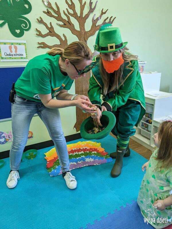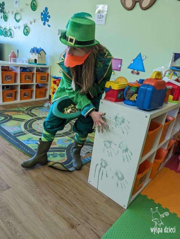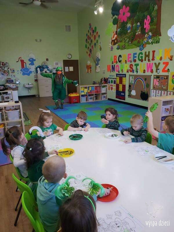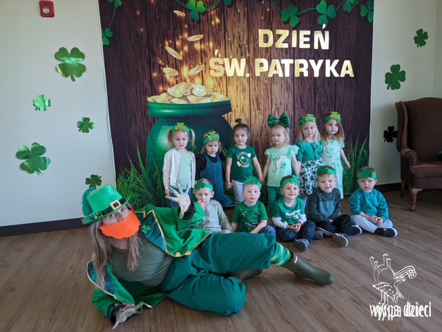 Na Wyspie Dzieci w Algonquin pojawił się niespodziewany gość- Leprechaun. Na początku oczywiście złośliwie narobił balaganu i wszędzie zostawił ślady swoich małych zielonych stópek. Było szukanie złotych monet, łapanie tęczy, śpiewanie piosenek i mnóstwo dobrej zabawy. Niestety, nie udało nam się złapać zielonego ludzika i skarb wciąż pozostaje ukryty na końcu tęczy…