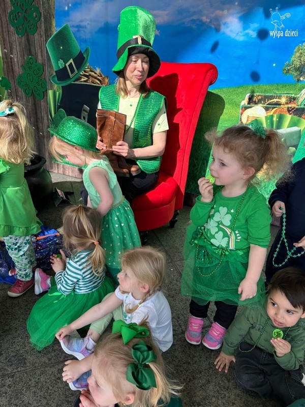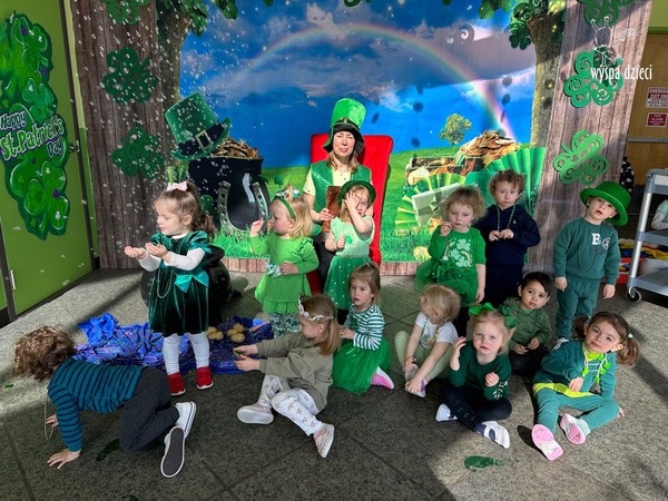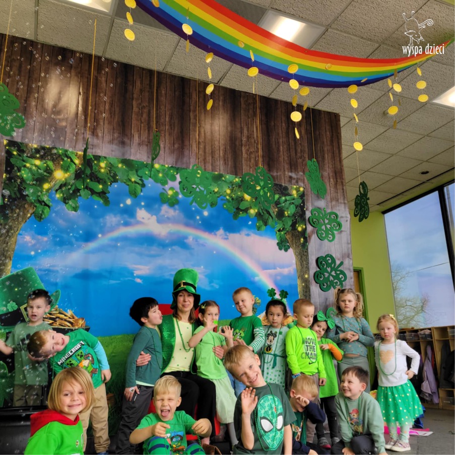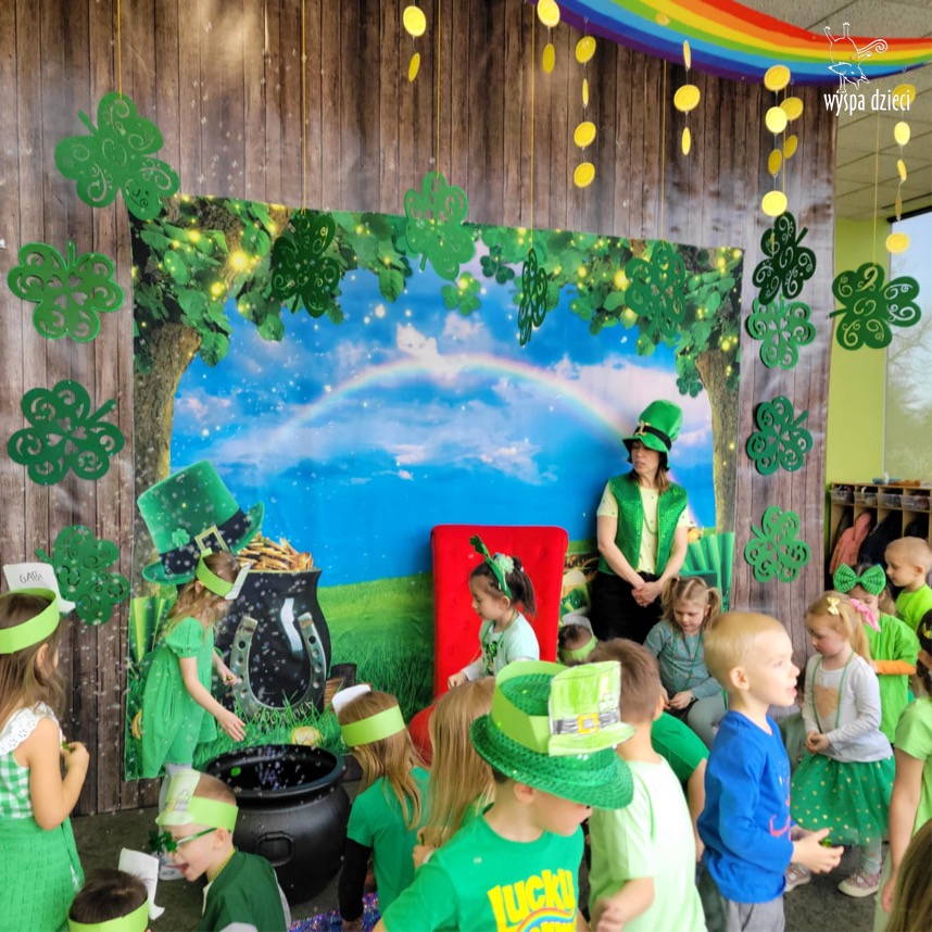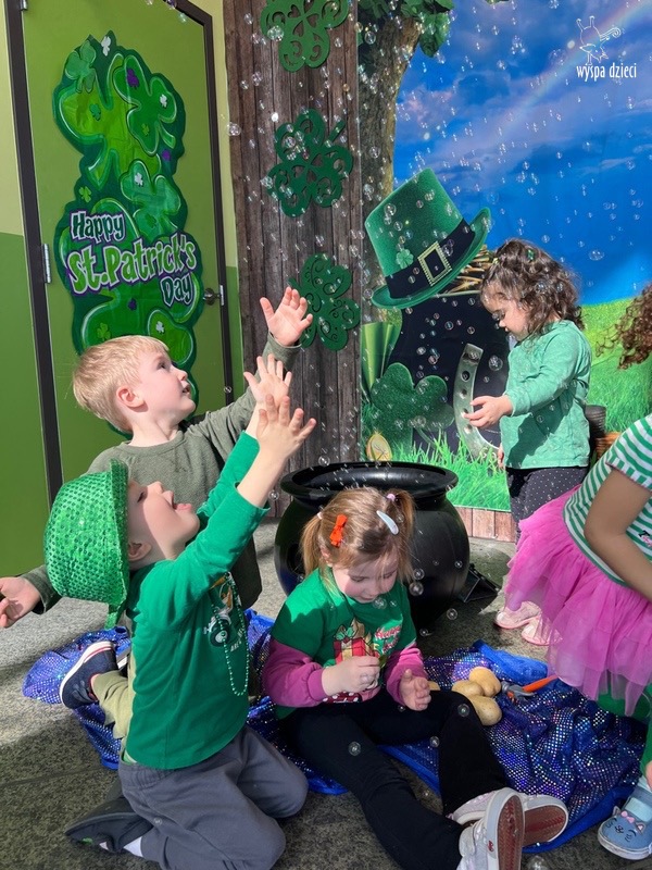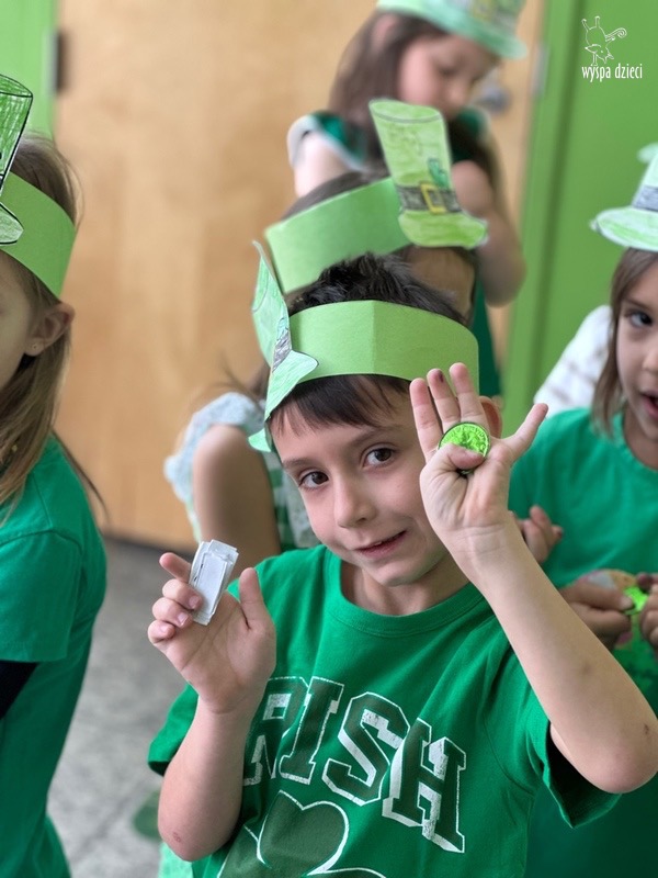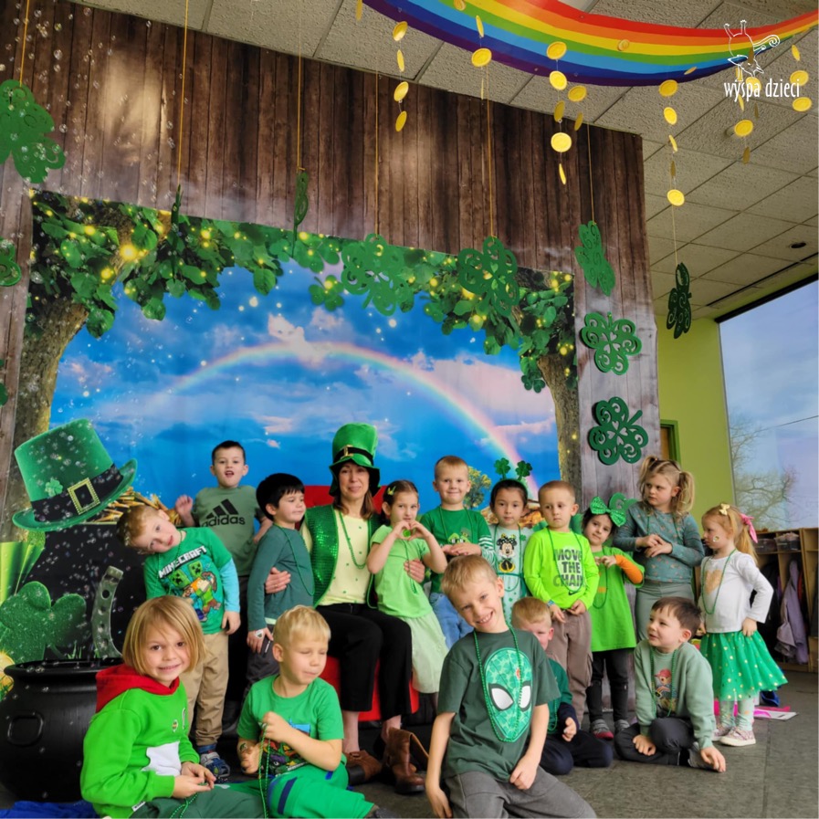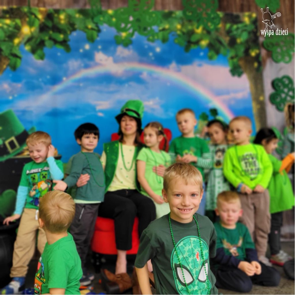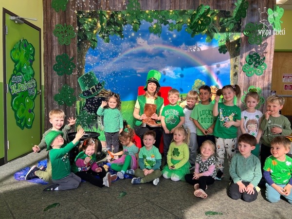 W poniedziałek 17 marca, obchodziliśmy w Wyspie Dzieci River Grove Dzień Świętego Patryka – irlandzkie święto narodowe. Obowiązującym kolorem tego dnia była zieleń, nawiązująca do trawiastego krajobrazu Irlandii i symbolizująca koniczynę. Podczas wspólnej zabawy dowiedzieliśmy się od grupy Poszukiwaczy wiele ciekawych informacji na temat tego święta, wzbogaciliśmy nasze słownictwo o nowe wyrazy w języku angielskim – rainbow, gold, shamrock, Leprechaun oraz świetne się bawiliśmy przy dźwiękach irlandzkiej muzyki. Szukaliśmy skarbu…i znaleźliśmy go – a były nimi zielone monety !!! Na zakończenie zajadalismy się wszyscy pysznymi zielonymi galaretkami o smaku agrestowym:)))