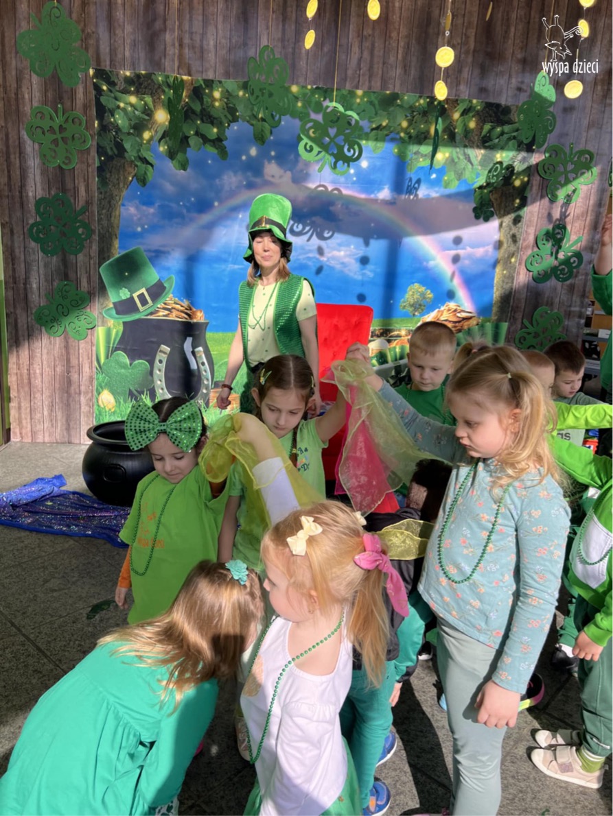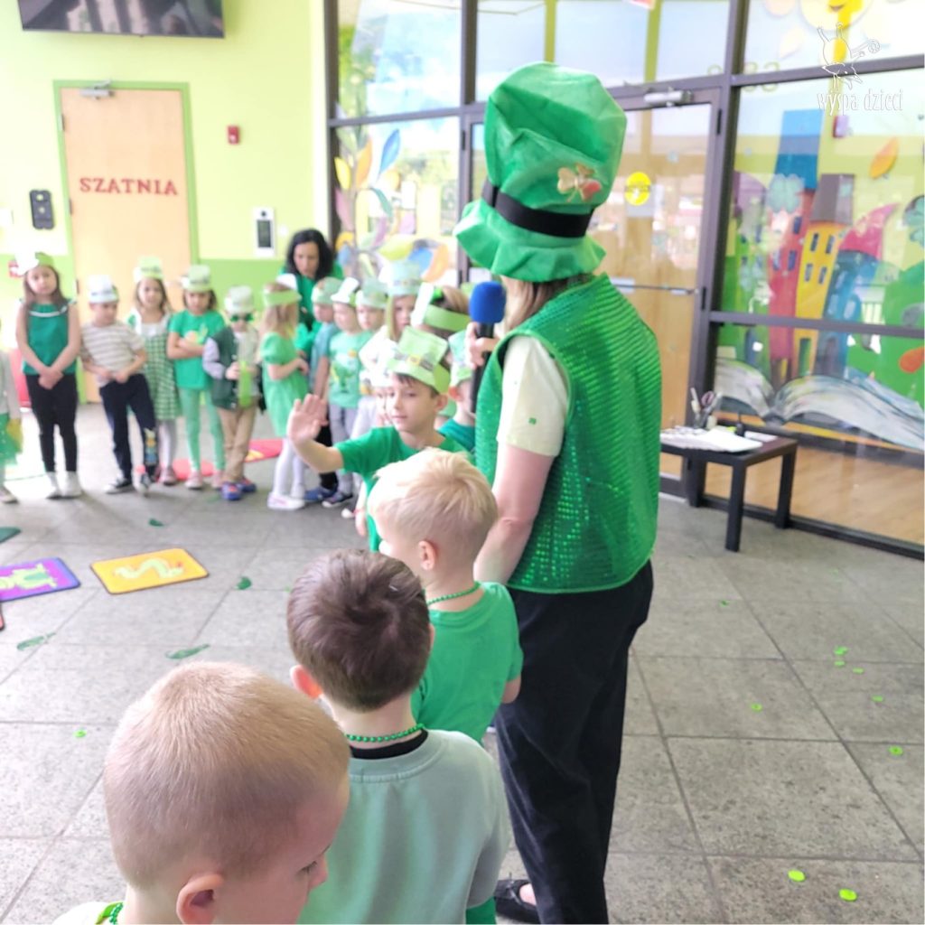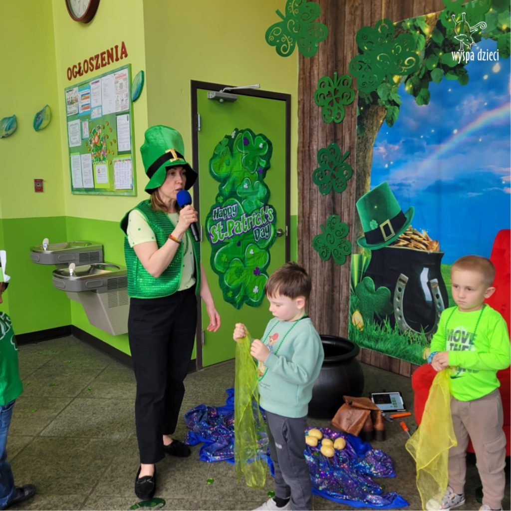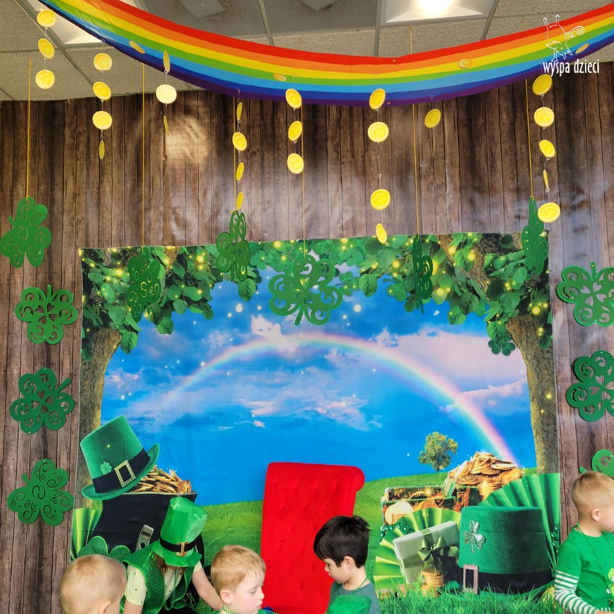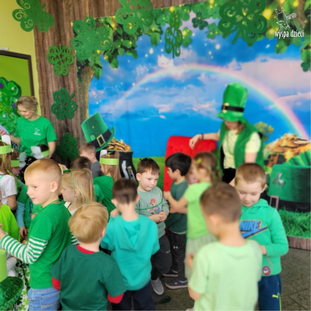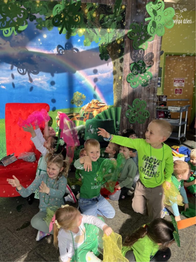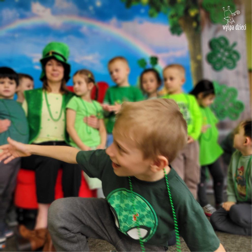 W poniedziałek 17 marca, obchodziliśmy w Wyspie Dzieci River Grove Dzień Świętego Patryka – irlandzkie święto narodowe. Obowiązującym kolorem tego dnia była zieleń, nawiązująca do trawiastego krajobrazu Irlandii i symbolizująca koniczynę. Podczas wspólnej zabawy dowiedzieliśmy się od grupy Poszukiwaczy wiele ciekawych informacji na temat tego święta, wzbogaciliśmy nasze słownictwo o nowe wyrazy w języku angielskim – rainbow, gold, shamrock, Leprechaun oraz świetne się bawiliśmy przy dźwiękach irlandzkiej muzyki. Szukaliśmy skarbu…i znaleźliśmy go – a były nimi zielone monety !!! Na zakończenie zajadalismy się wszyscy pysznymi zielonymi galaretkami o smaku agrestowym:)))