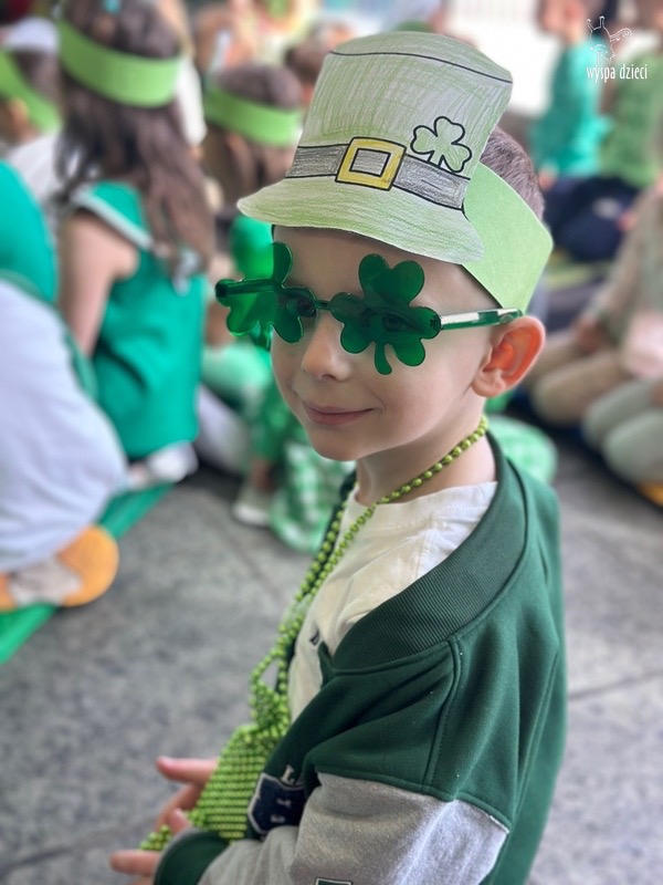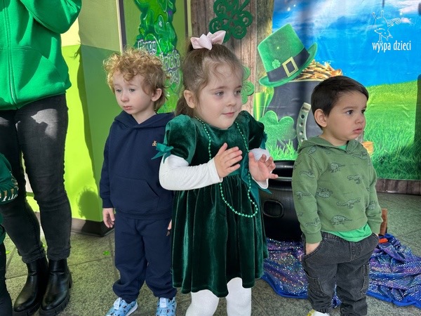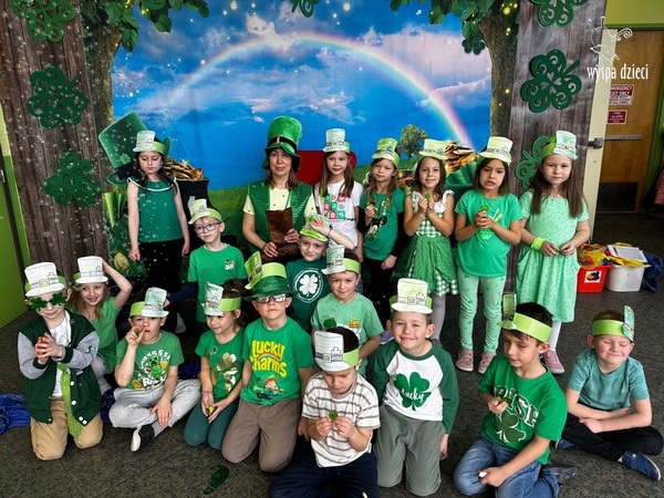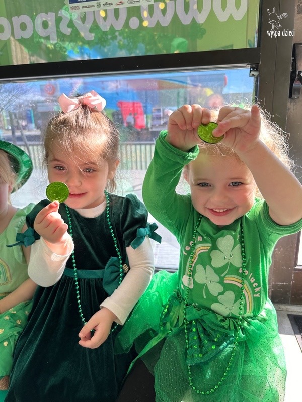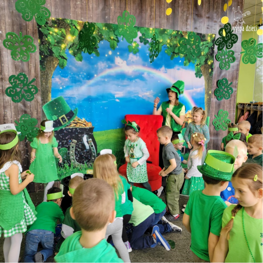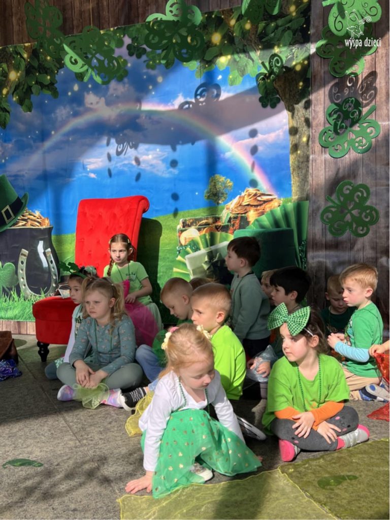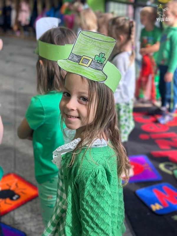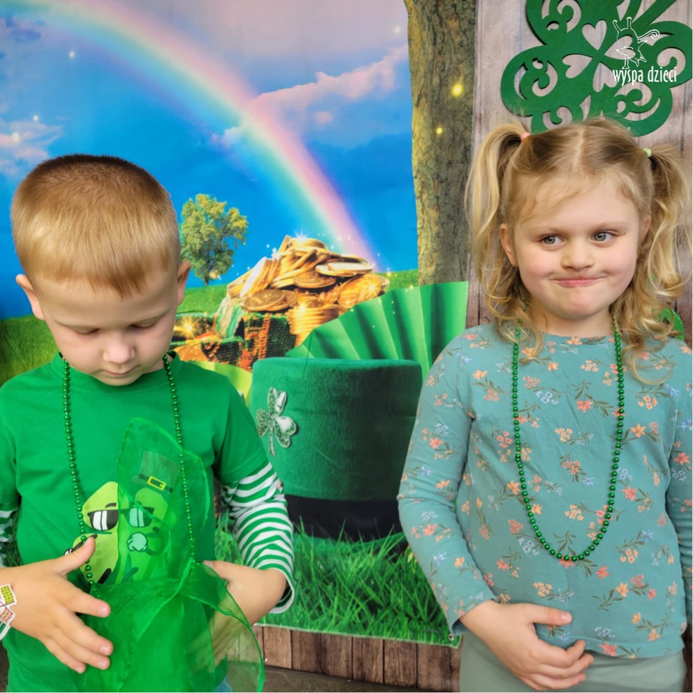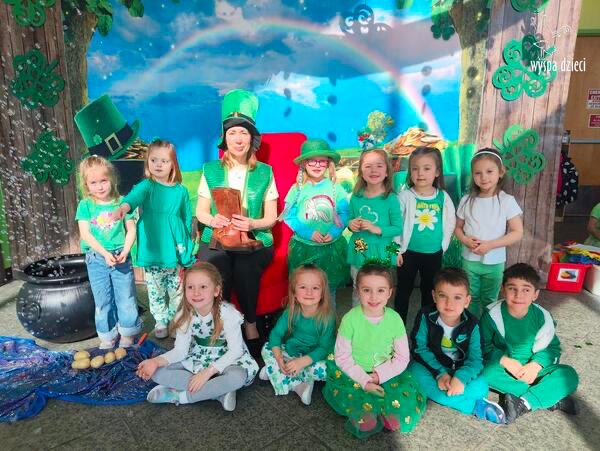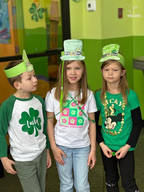 W poniedziałek 17 marca, obchodziliśmy w Wyspie Dzieci River Grove Dzień Świętego Patryka – irlandzkie święto narodowe. Obowiązującym kolorem tego dnia była zieleń, nawiązująca do trawiastego krajobrazu Irlandii i symbolizująca koniczynę. Podczas wspólnej zabawy dowiedzieliśmy się od grupy Poszukiwaczy wiele ciekawych informacji na temat tego święta, wzbogaciliśmy nasze słownictwo o nowe wyrazy w języku angielskim – rainbow, gold, shamrock, Leprechaun oraz świetne się bawiliśmy przy dźwiękach irlandzkiej muzyki. Szukaliśmy skarbu…i znaleźliśmy go – a były nimi zielone monety !!! Na zakończenie zajadalismy się wszyscy pysznymi zielonymi galaretkami o smaku agrestowym:)))