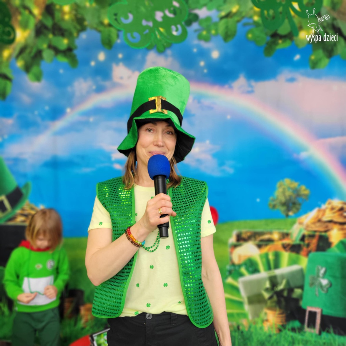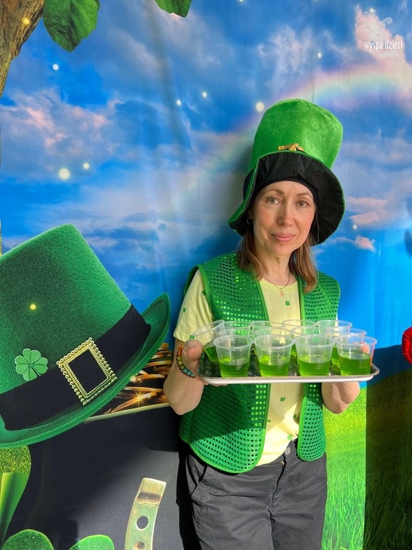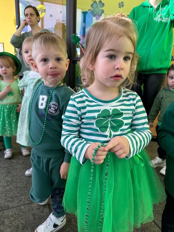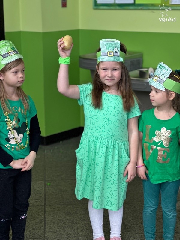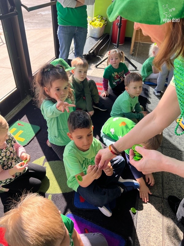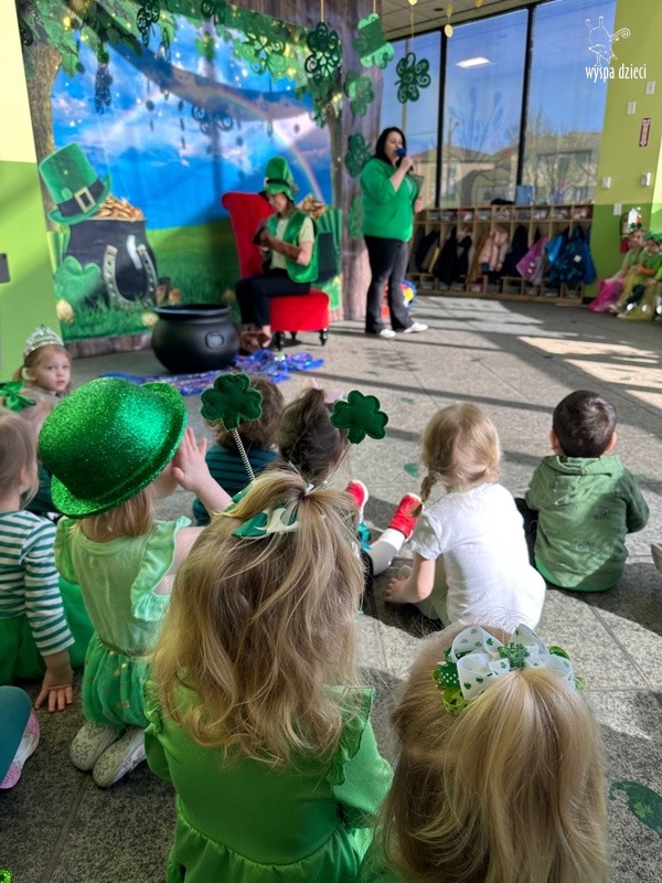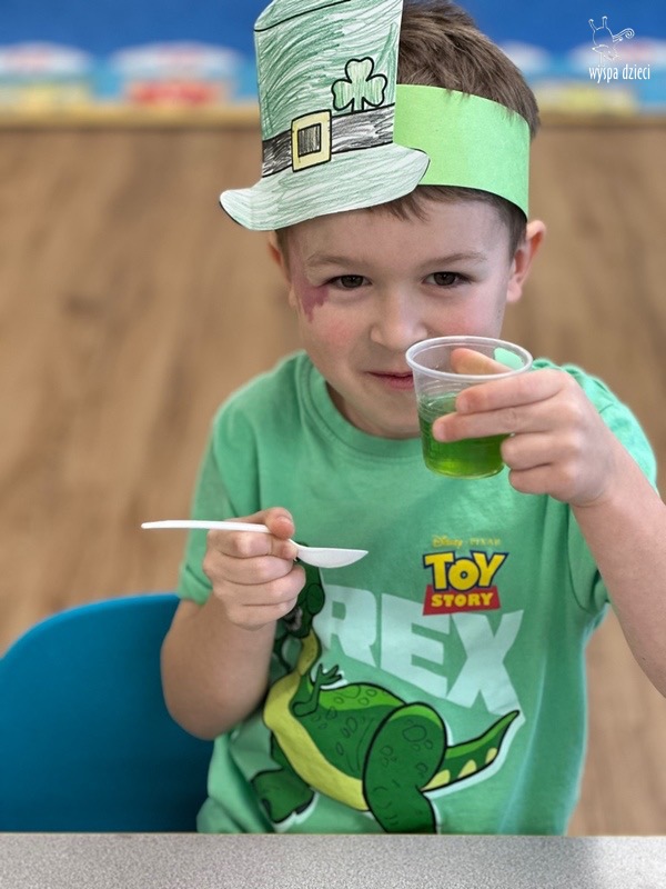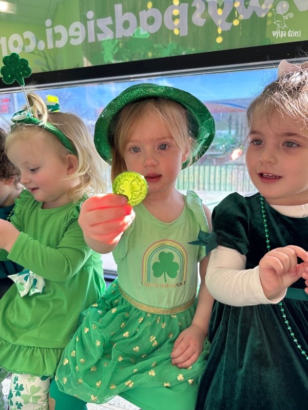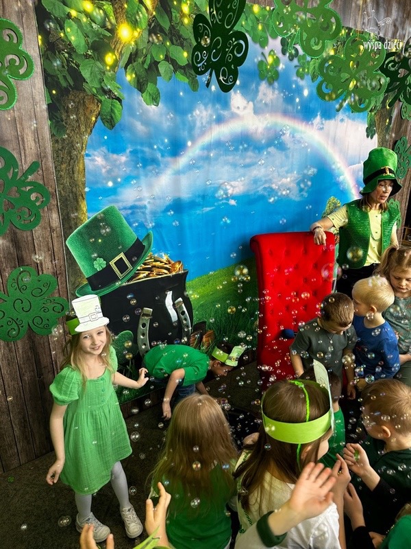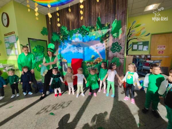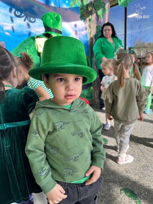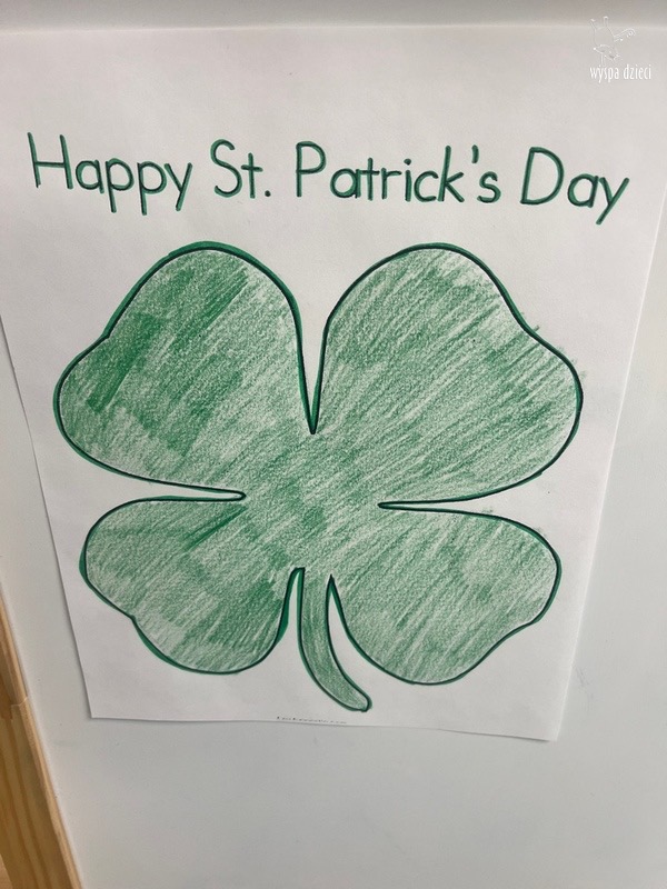 W poniedziałek 17 marca, obchodziliśmy w Wyspie Dzieci River Grove Dzień Świętego Patryka – irlandzkie święto narodowe. Obowiązującym kolorem tego dnia była zieleń, nawiązująca do trawiastego krajobrazu Irlandii i symbolizująca koniczynę. Podczas wspólnej zabawy dowiedzieliśmy się od grupy Poszukiwaczy wiele ciekawych informacji na temat tego święta, wzbogaciliśmy nasze słownictwo o nowe wyrazy w języku angielskim – rainbow, gold, shamrock, Leprechaun oraz świetne się bawiliśmy przy dźwiękach irlandzkiej muzyki. Szukaliśmy skarbu…i znaleźliśmy go – a były nimi zielone monety !!! Na zakończenie zajadalismy się wszyscy pysznymi zielonymi galaretkami o smaku agrestowym:)))