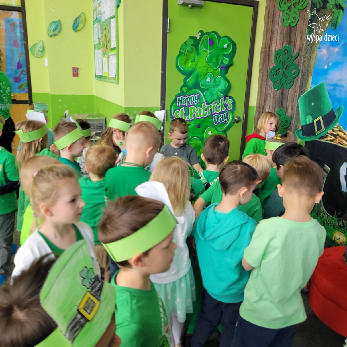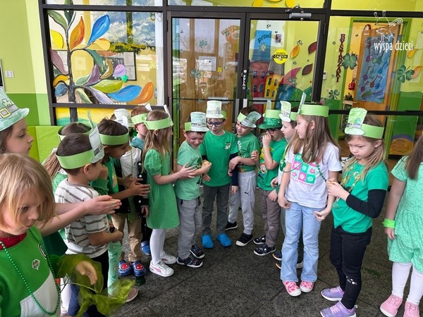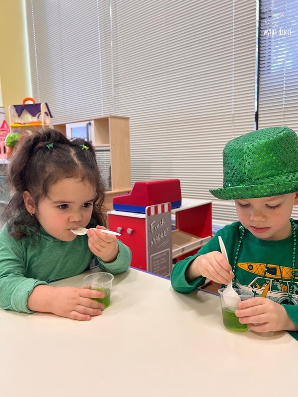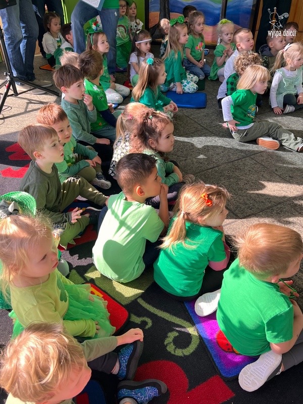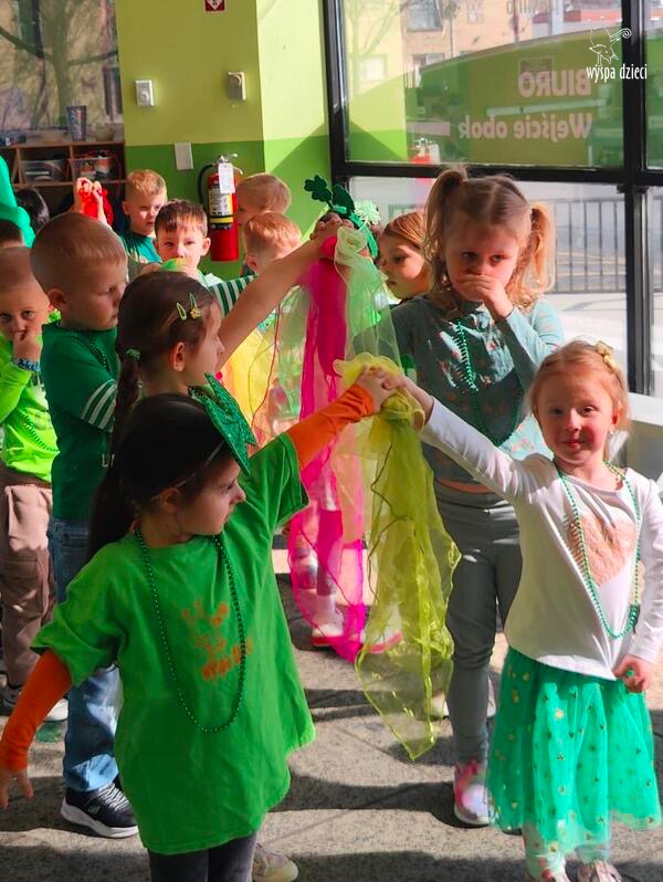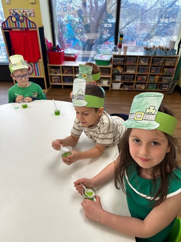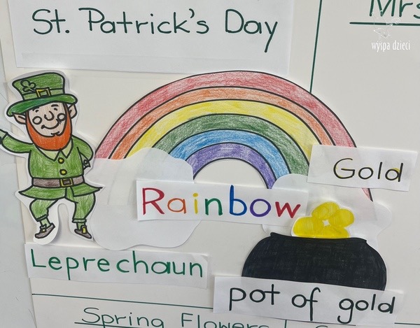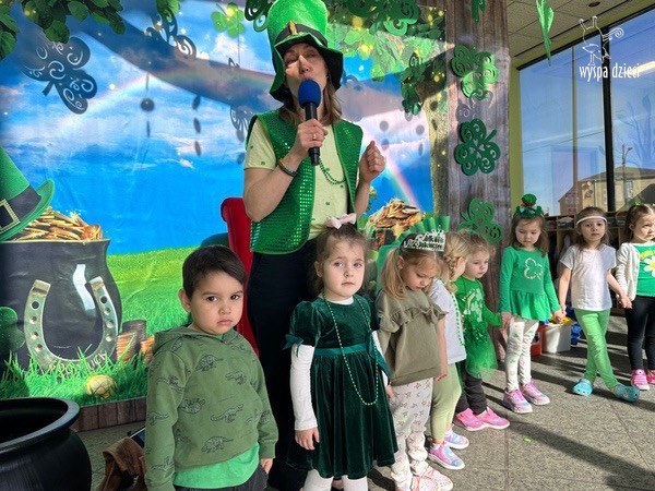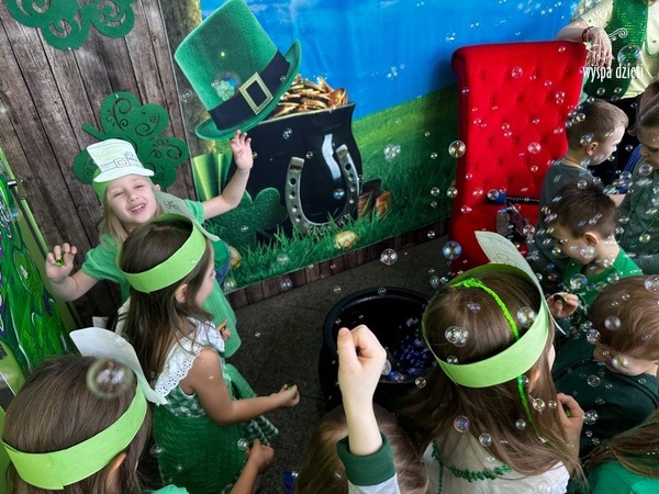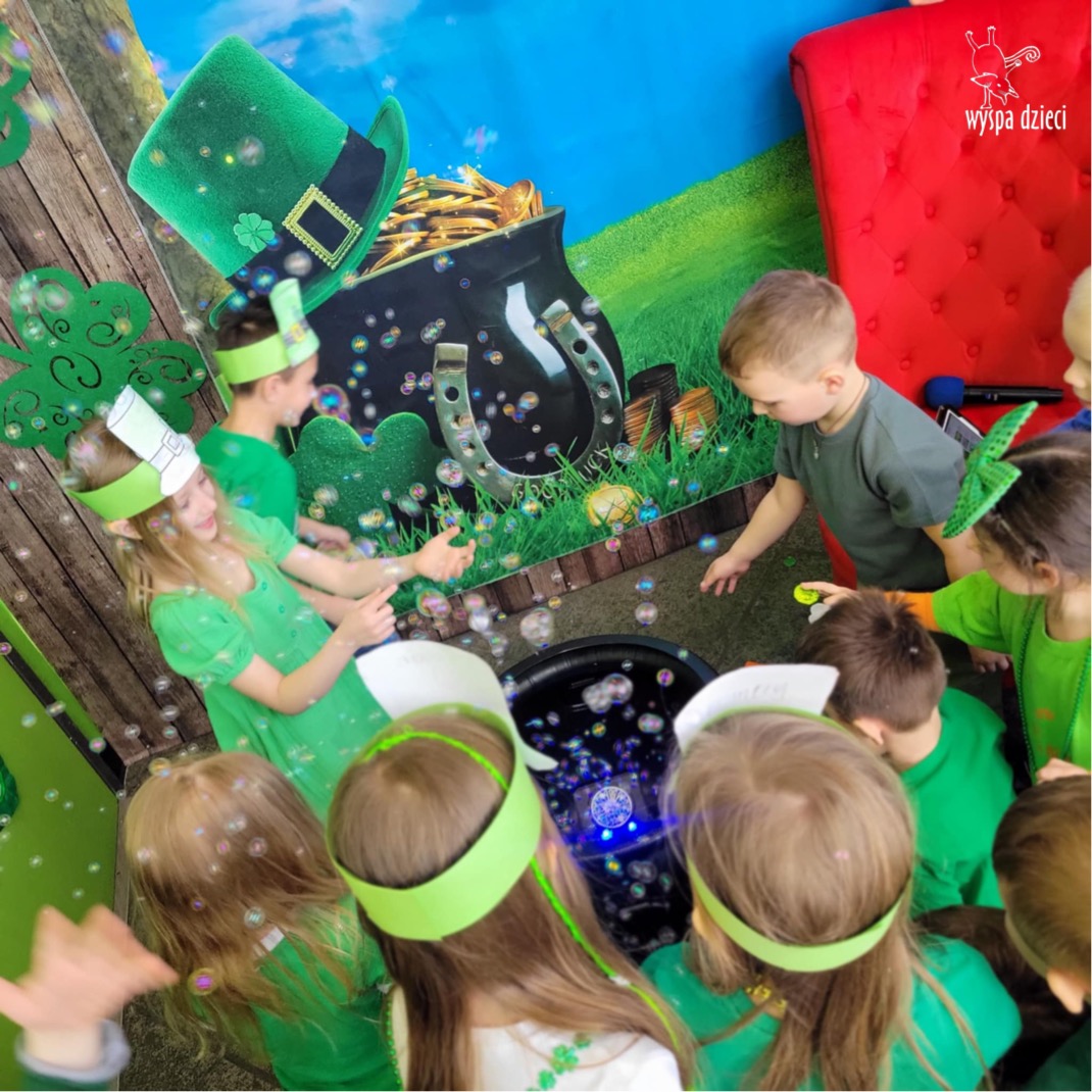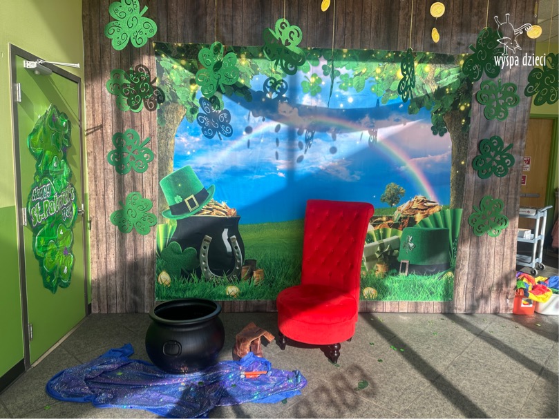 W poniedziałek 17 marca, obchodziliśmy w Wyspie Dzieci River Grove Dzień Świętego Patryka – irlandzkie święto narodowe. Obowiązującym kolorem tego dnia była zieleń, nawiązująca do trawiastego krajobrazu Irlandii i symbolizująca koniczynę. Podczas wspólnej zabawy dowiedzieliśmy się od grupy Poszukiwaczy wiele ciekawych informacji na temat tego święta, wzbogaciliśmy nasze słownictwo o nowe wyrazy w języku angielskim – rainbow, gold, shamrock, Leprechaun oraz świetne się bawiliśmy przy dźwiękach irlandzkiej muzyki. Szukaliśmy skarbu…i znaleźliśmy go – a były nimi zielone monety !!! Na zakończenie zajadalismy się wszyscy pysznymi zielonymi galaretkami o smaku agrestowym:)))
