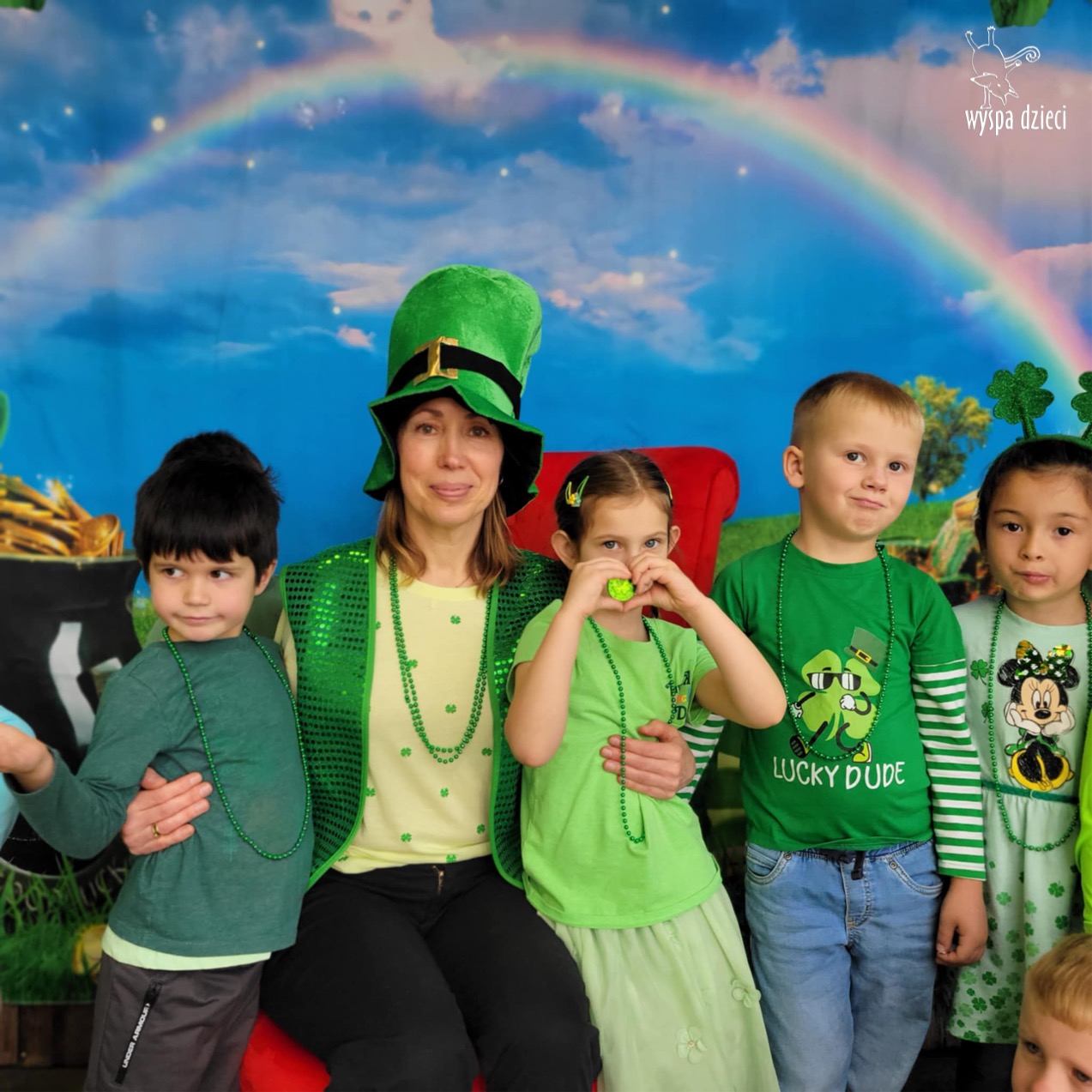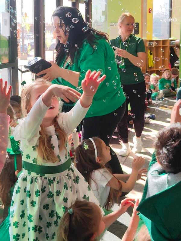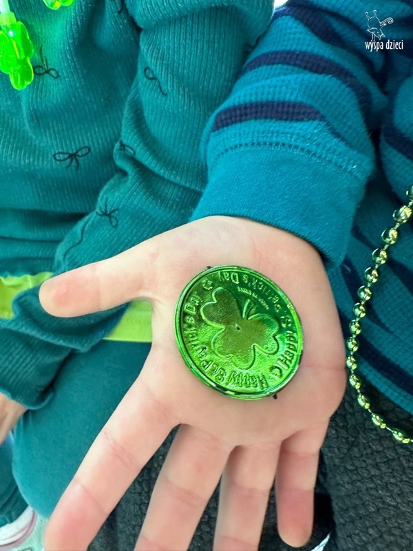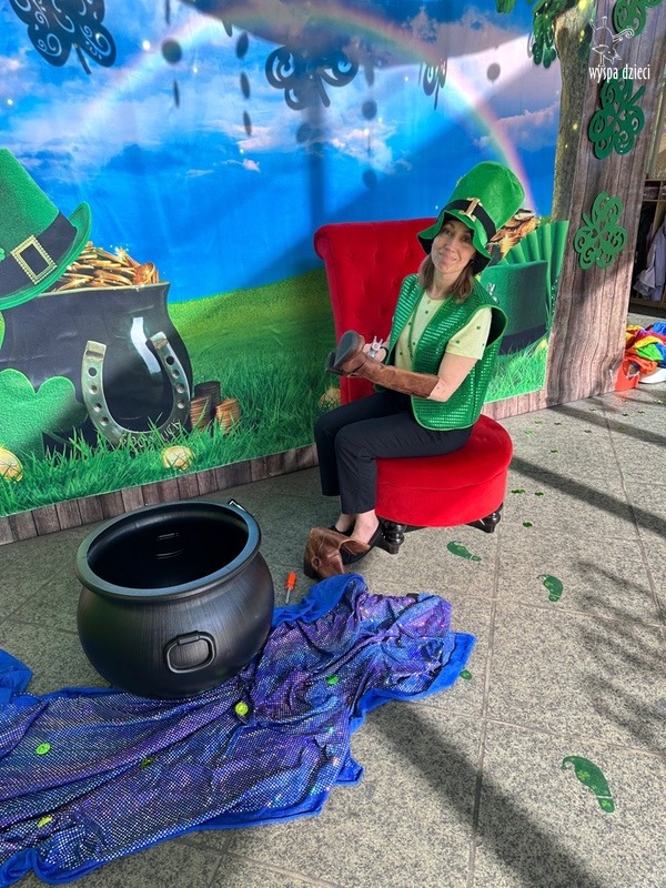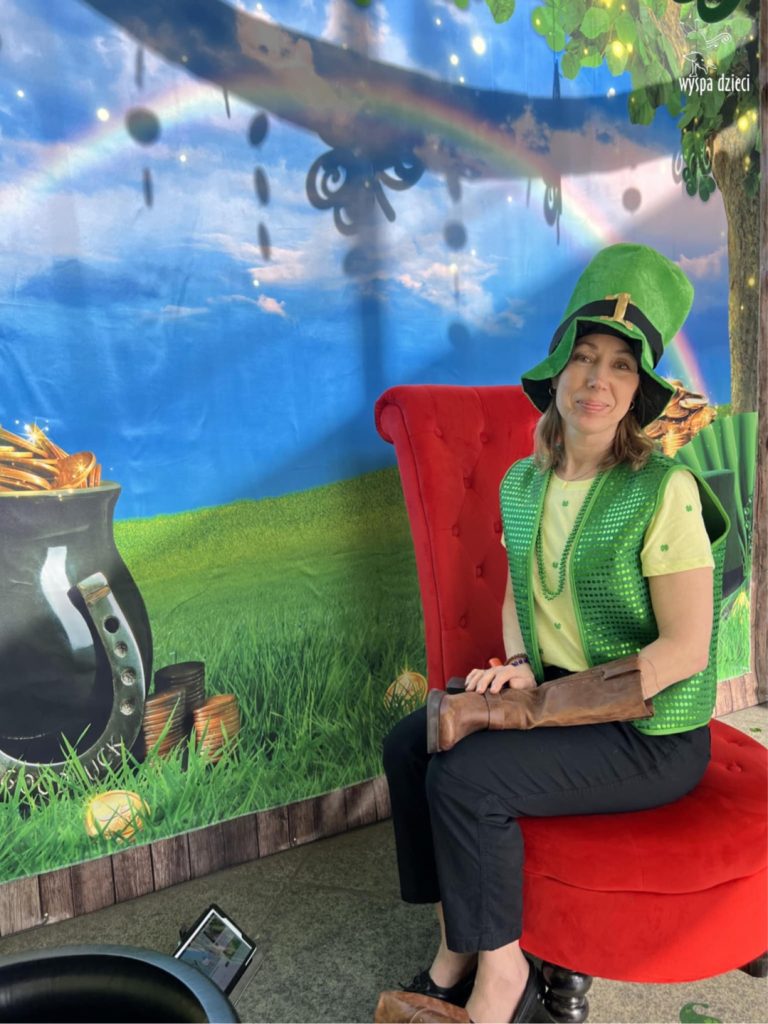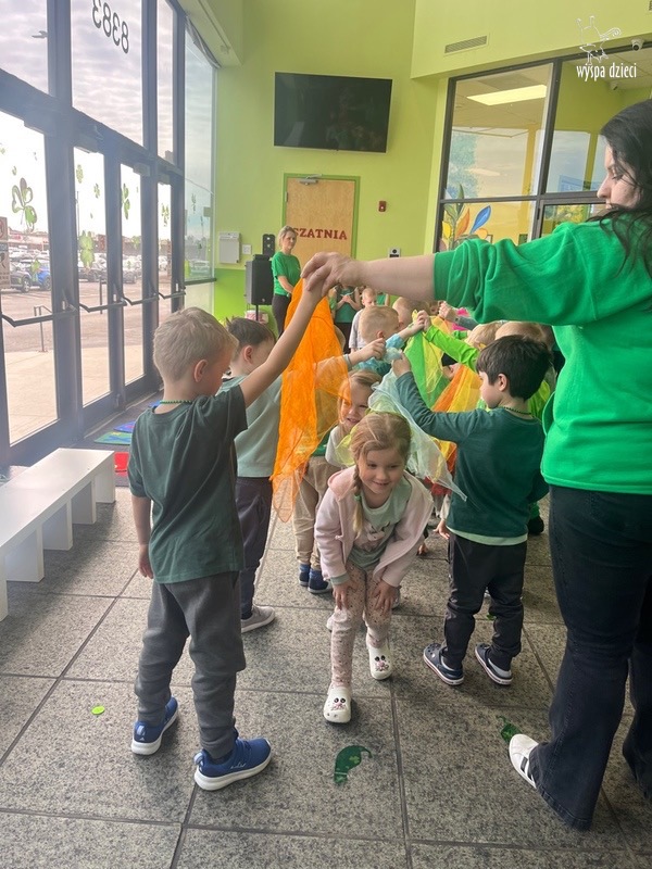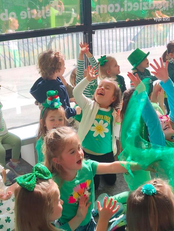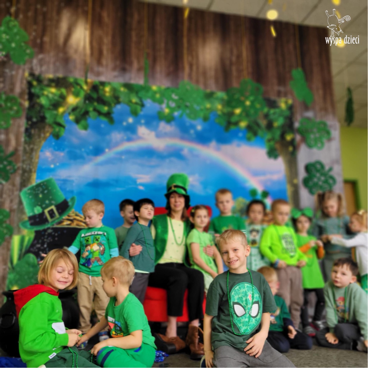 W poniedziałek 17 marca, obchodziliśmy w Wyspie Dzieci River Grove Dzień Świętego Patryka – irlandzkie święto narodowe. Obowiązującym kolorem tego dnia była zieleń, nawiązująca do trawiastego krajobrazu Irlandii i symbolizująca koniczynę. Podczas wspólnej zabawy dowiedzieliśmy się od grupy Poszukiwaczy wiele ciekawych informacji na temat tego święta, wzbogaciliśmy nasze słownictwo o nowe wyrazy w języku angielskim – rainbow, gold, shamrock, Leprechaun oraz świetne się bawiliśmy przy dźwiękach irlandzkiej muzyki. Szukaliśmy skarbu…i znaleźliśmy go – a były nimi zielone monety !!! Na zakończenie zajadalismy się wszyscy pysznymi zielonymi galaretkami o smaku agrestowym:)))
