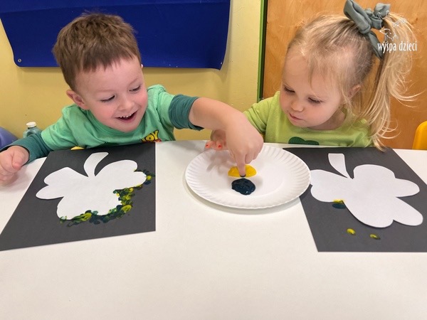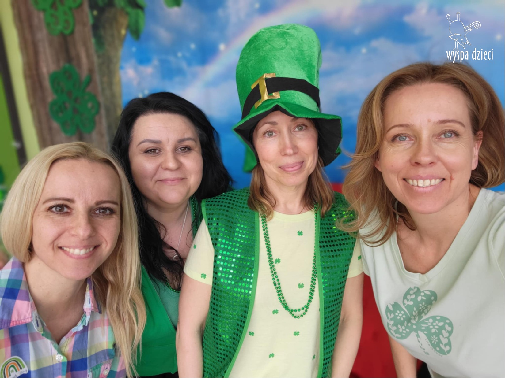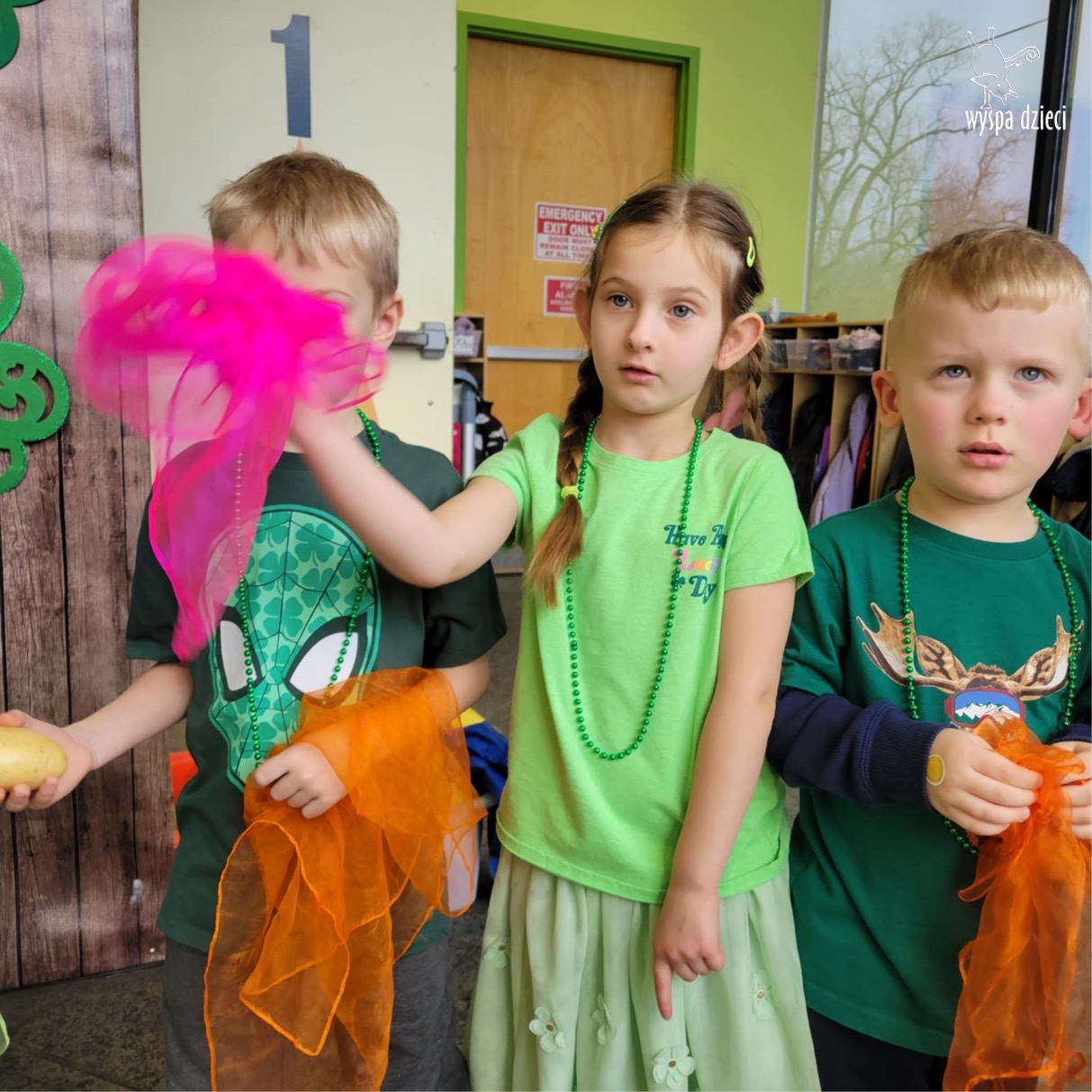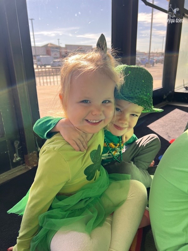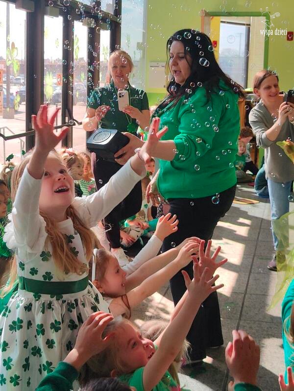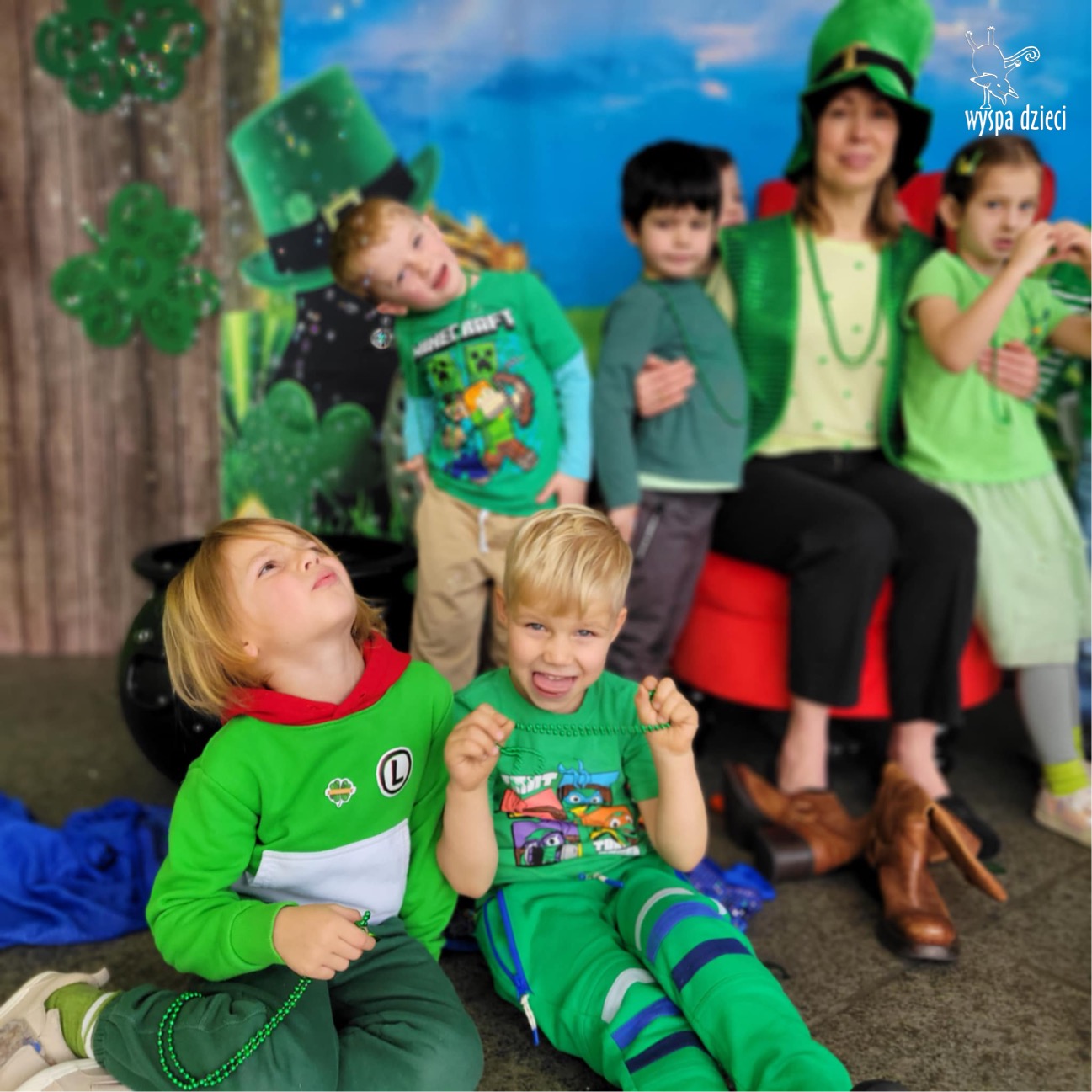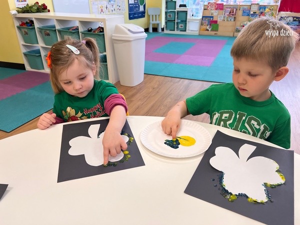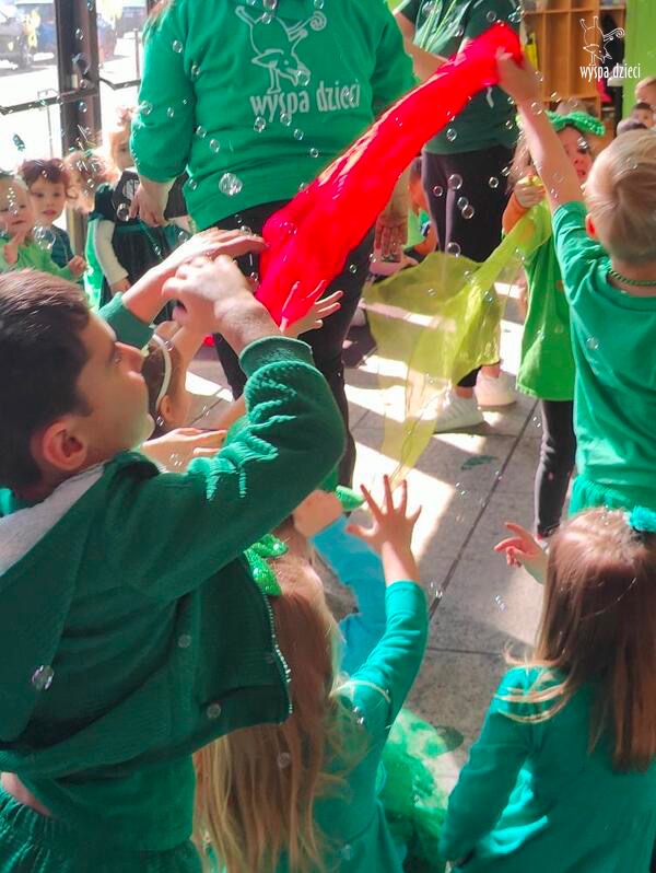 W poniedziałek 17 marca, obchodziliśmy w Wyspie Dzieci River Grove Dzień Świętego Patryka – irlandzkie święto narodowe. Obowiązującym kolorem tego dnia była zieleń, nawiązująca do trawiastego krajobrazu Irlandii i symbolizująca koniczynę. Podczas wspólnej zabawy dowiedzieliśmy się od grupy Poszukiwaczy wiele ciekawych informacji na temat tego święta, wzbogaciliśmy nasze słownictwo o nowe wyrazy w języku angielskim – rainbow, gold, shamrock, Leprechaun oraz świetne się bawiliśmy przy dźwiękach irlandzkiej muzyki. Szukaliśmy skarbu…i znaleźliśmy go – a były nimi zielone monety !!! Na zakończenie zajadalismy się wszyscy pysznymi zielonymi galaretkami o smaku agrestowym:)))