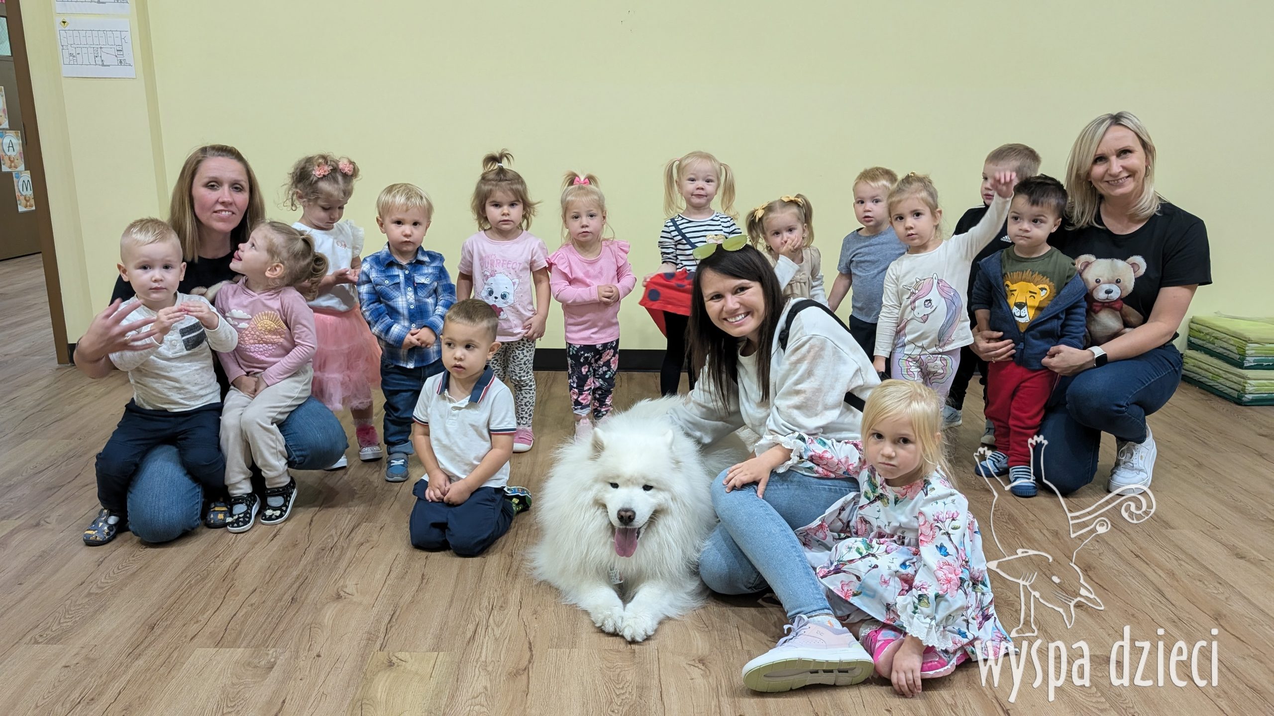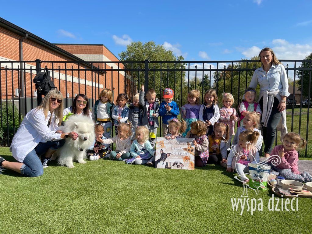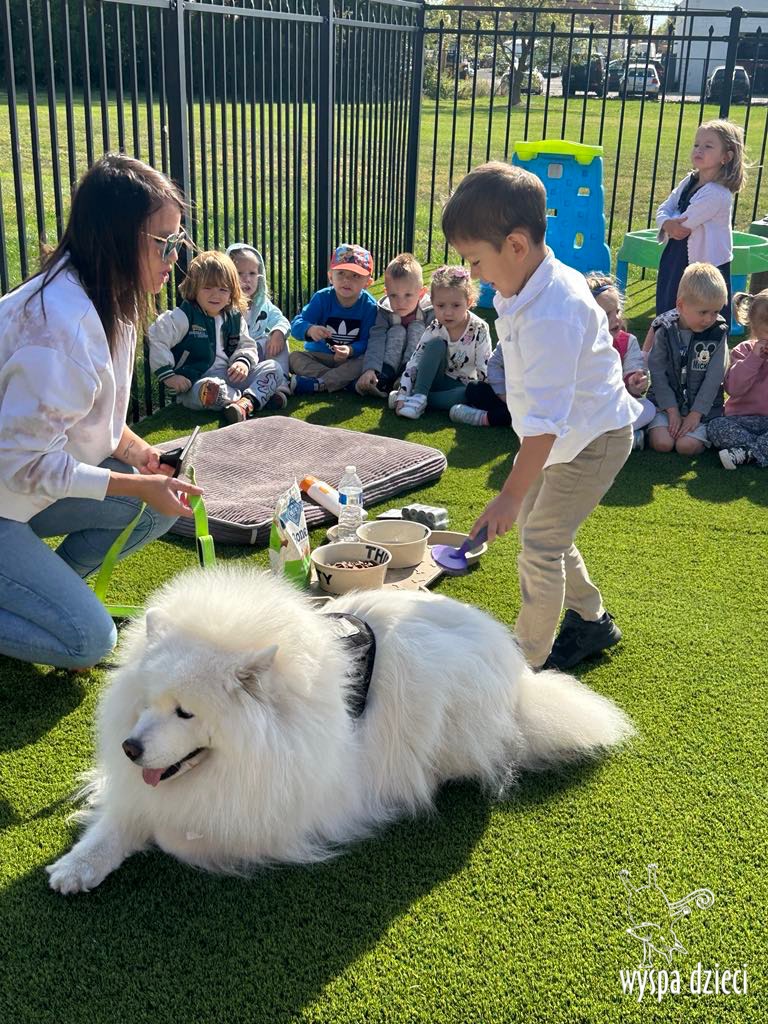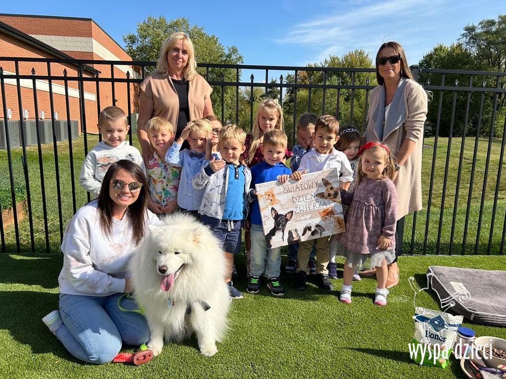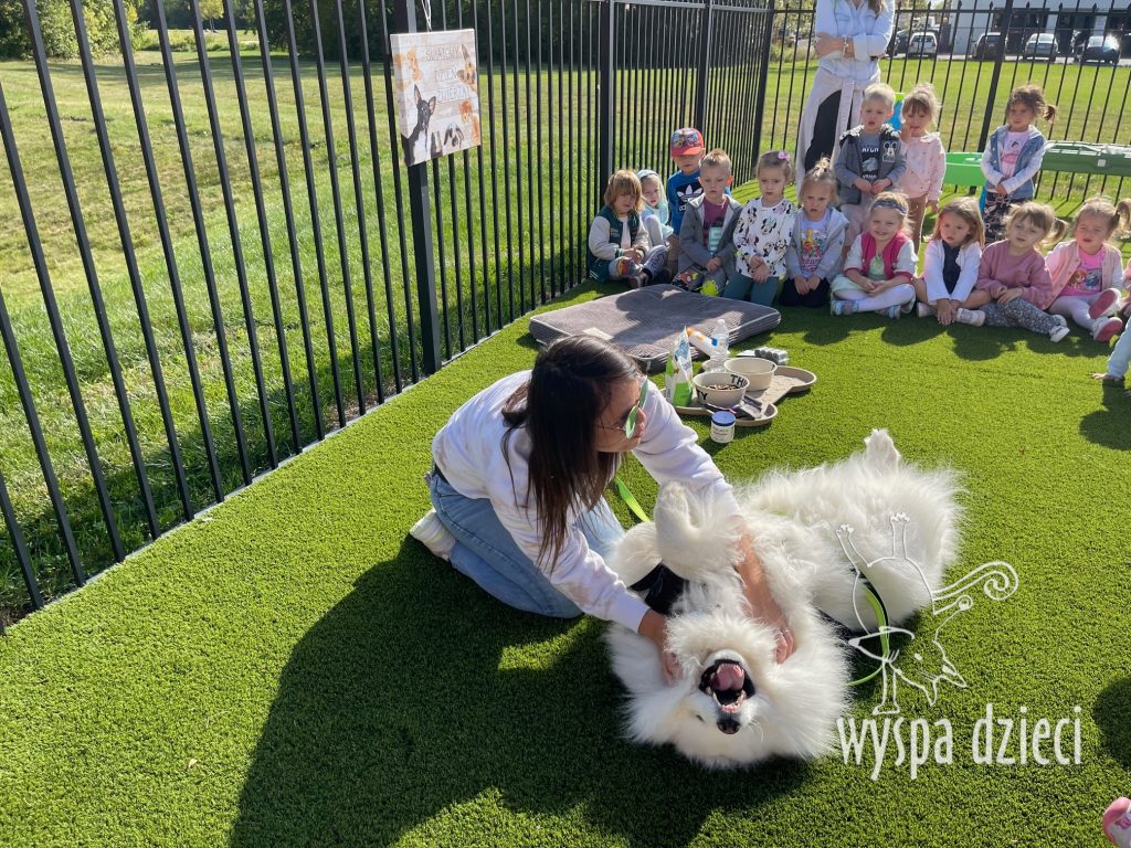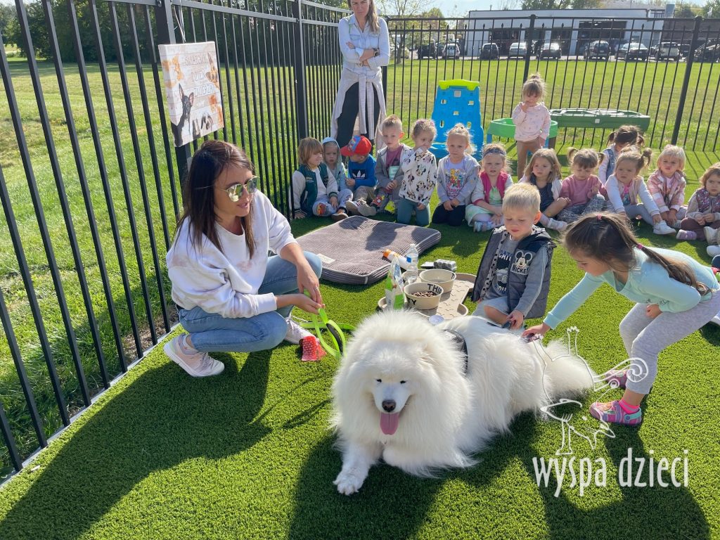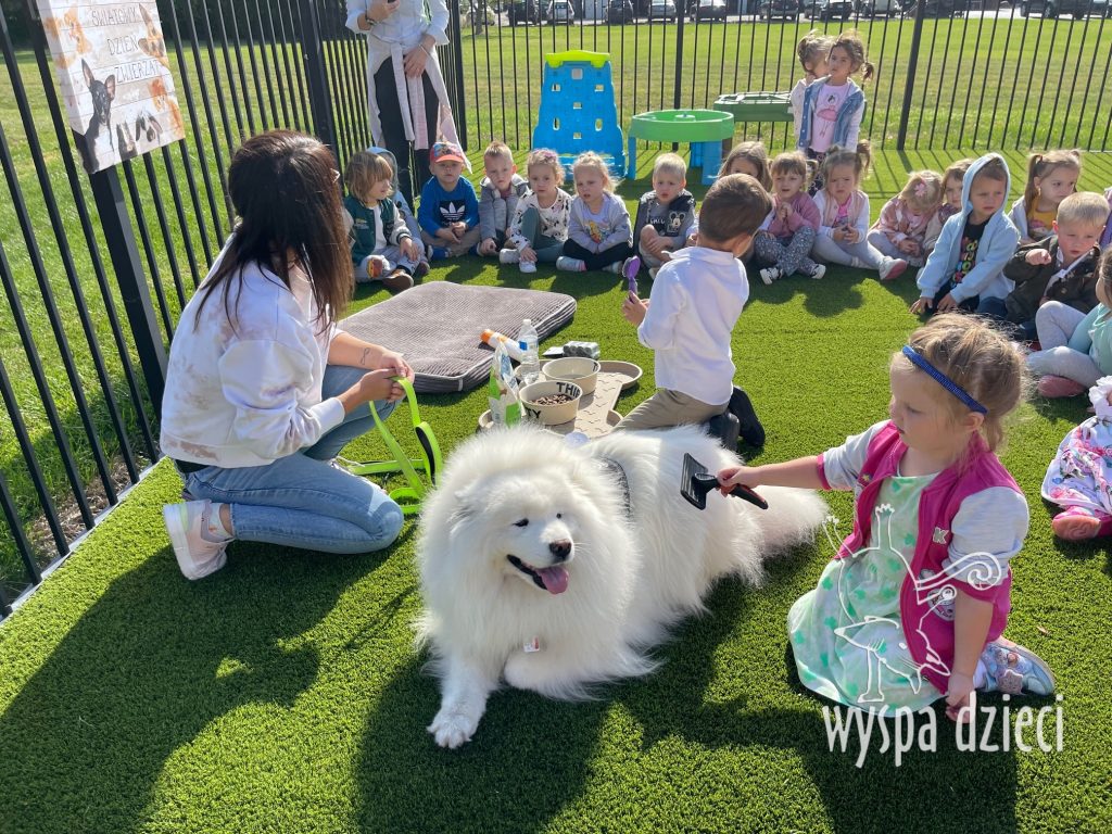 4 października na całym świecie obchodzony jest Światowy Dzień Zwierząt. Obchody tego dnia mają na celu zmienić zachowanie ludzi do zwierząt i uświadamianie im, że zwierzę to istota żywa, a nie rzecz i ma swoje prawa. W naszym przedszkolu uświadamiamy to maluchom od najmłodszych lat. Z okazji tego wyjątkowego dnia przedszkolaków odwiedził piesek jednej z nauczycielek, a był to samoyed – Kobi. Dzieci dowiedziały się jak powinno opiekować się pieskiem, jak o niego dbać. Maluchy miały okazję zobaczyć jakie akcesoria potrzebne są gdy posiadamy pieska, a także poznały jego zwyczaje żywieniowe. Dzieci dowiedziały się, że posiadanie czworonoga to nie tylko przyjemność, ale też duża odpowiedzialność. Piesek Kobi pokazał też dla maluchów kilka sztuczek: siadaj, daj łapę, daj piątkę, daj głos. Dzieci miały okazję poczesać Kobiego, a także dać mu pyszne kostki.
