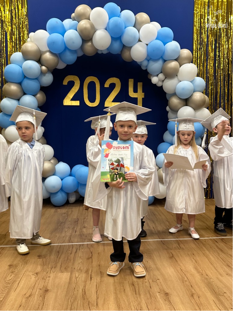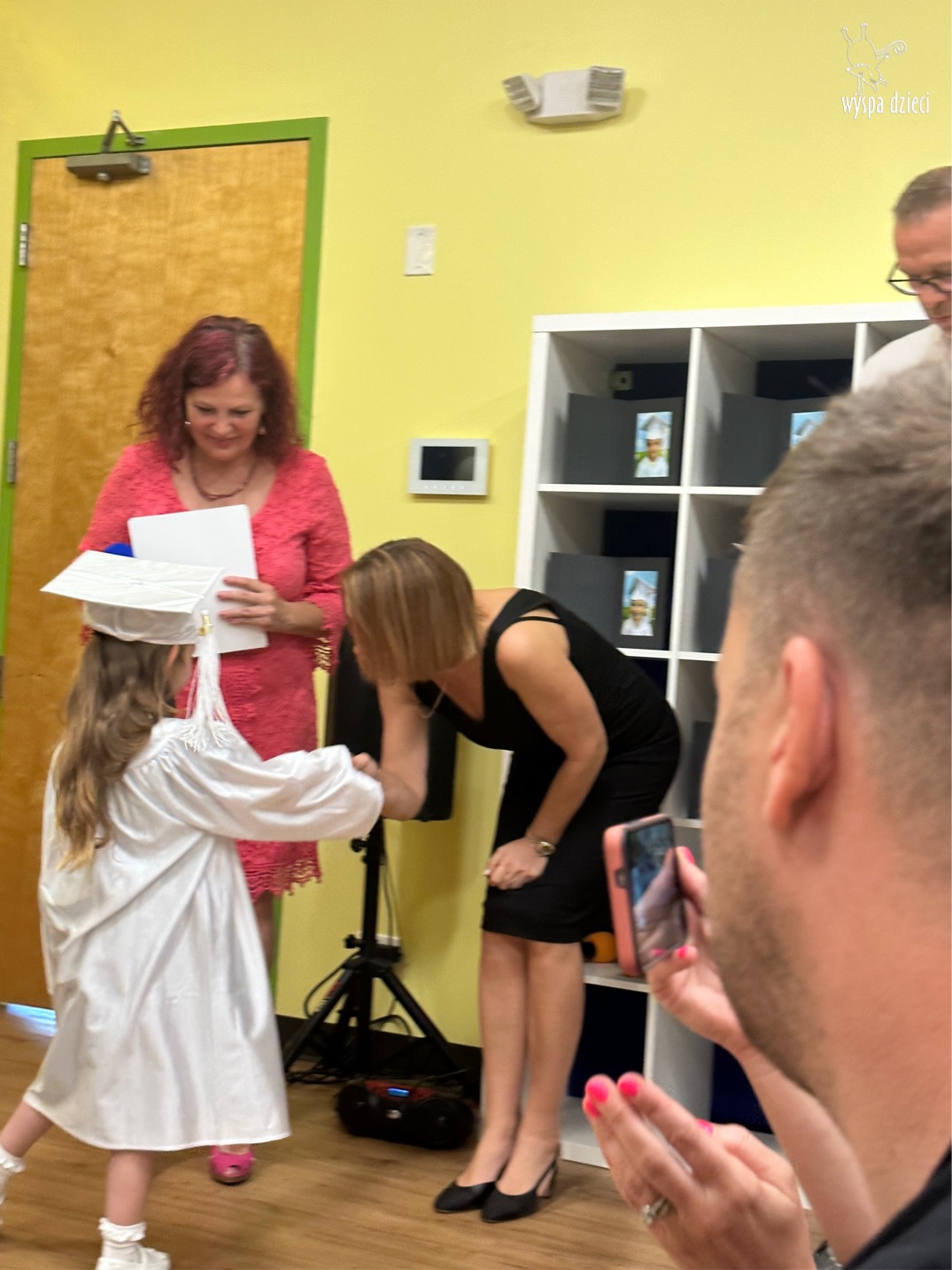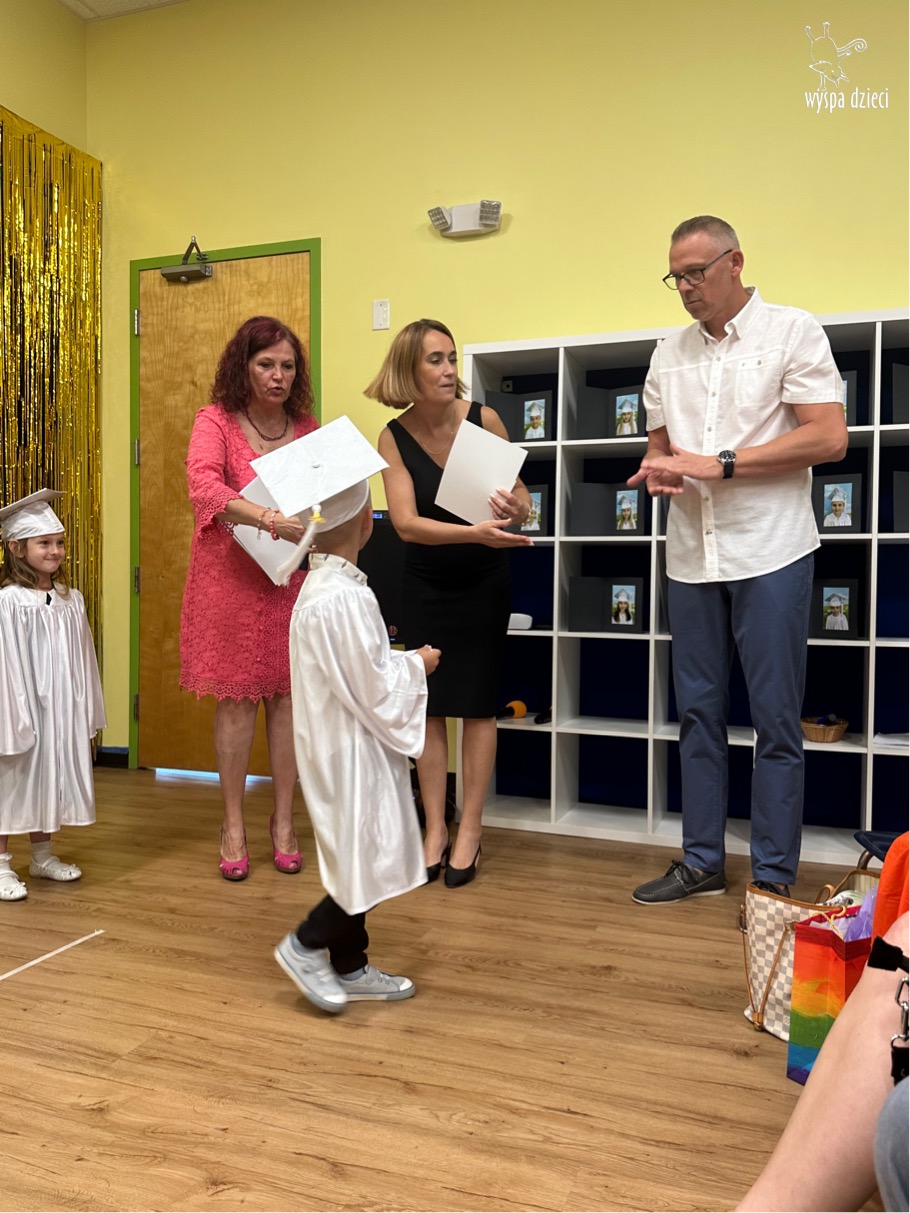 Dzieci pięknie prezentowały się w przygotowanym specjalnie na ten dzień programie. Po występach każde z nich otrzymało dyplom oraz na pamiątkę ramkę ze swoim zdjęciem. Po całej uroczystości czekały na dzieci w ich klasie, przygotowane przez rodziców smakołyki. Przed nimi teraz wakacje, a od września kolejny etap – klasa Kindergarten.