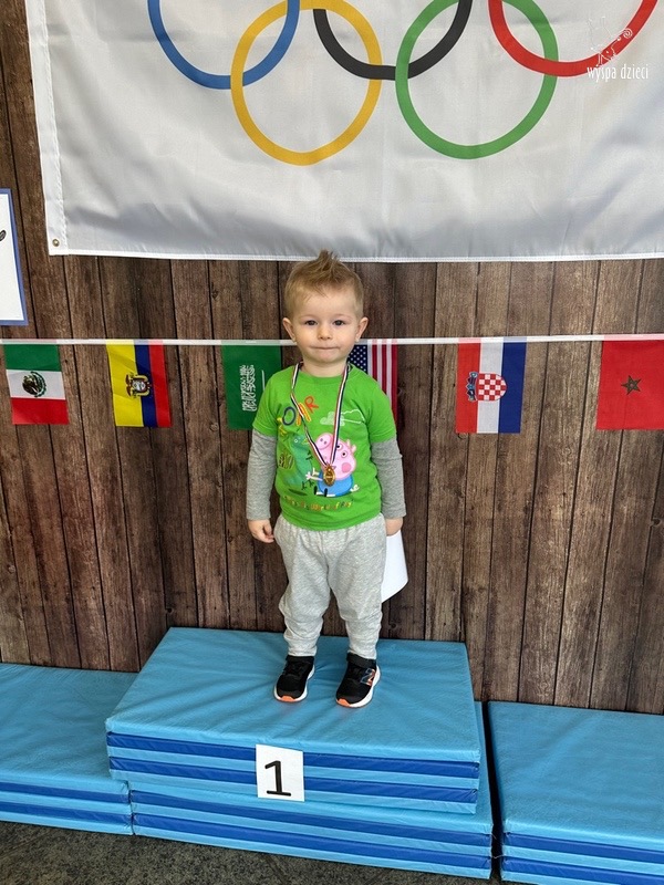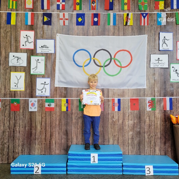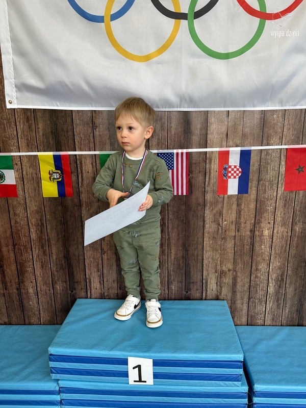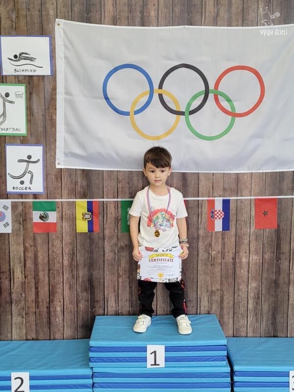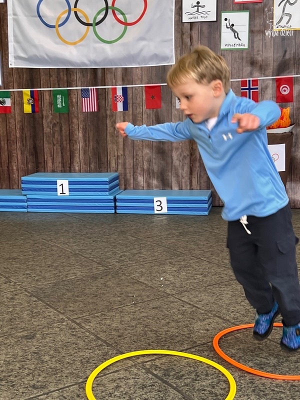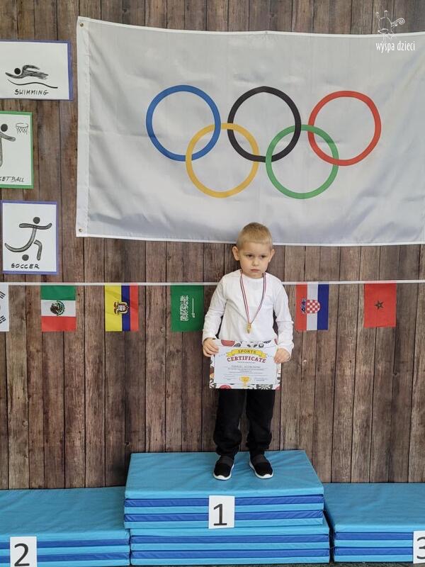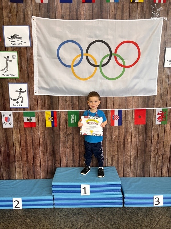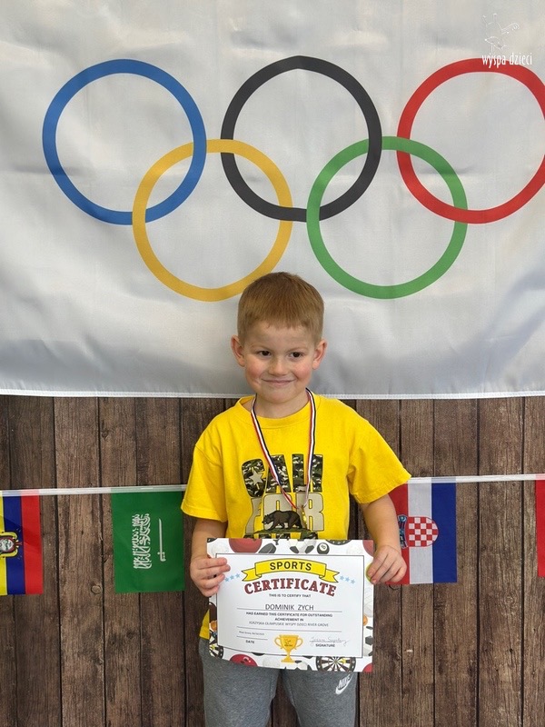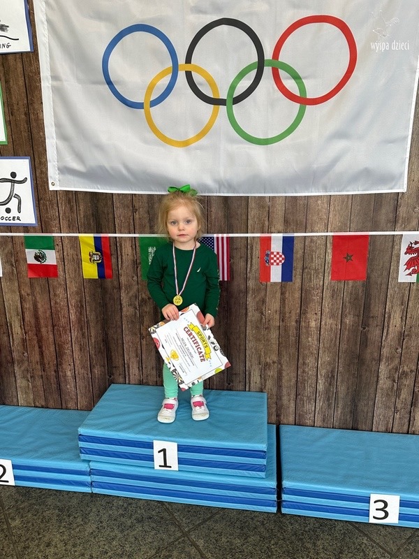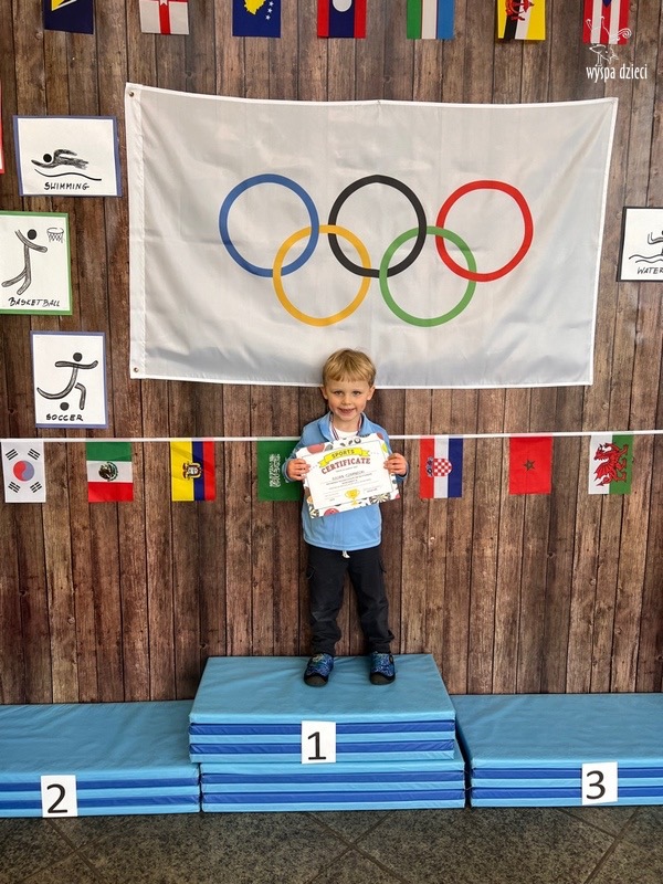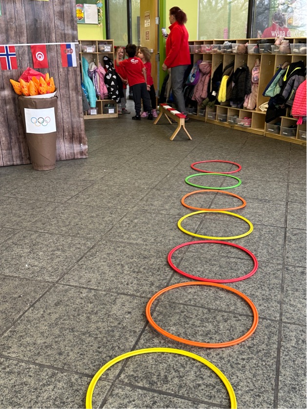 Następnie wszyscy spotkaliśmy się wspólnie na głównym korytarzu przedszkola. Pani Ewa opowiedziała wszystkim o Igrzyskach Olimpijskich, ich symbolach i o współzawodnictwie „fair play” . Znakiem do rozpoczęcia igrzysk było wysłuchanie przez przedszkolaków Hymnu Olimpijskiego. Wszyscy zostali podzieleni na dwie grupy. Pierwsza grupa to : Misie, Krasnale, Smerfy, oraz Bystrzaki, których konkurencje sportowe rozgrywane były na pierwszym piętrze . Natomiast na drugim piętrze była druga grupa – czyli Poszukiwacze, Wynalazcy oraz Odkrywcy. Wszyscy chętnie wykonywali ćwiczenia przygotowane przez nauczycieli. Był maraton, przysiady, pompki, wyskoki w gore,  piłka nożna, rzut do celu, sztafeta, tunel,  i wiele … wiele innych….  . Zabawy i radości było co niemiara, a wszystko w duchu zdrowej i miłej atmosfery rywalizacji. Każdy mógł  spróbować swoich sił w jakiejś dyscyplinie sportowej, a wszystkie dzieci dopingowały sobie nawzajem. Na zakończenie Igrzysk Olimpijskich wszystkim dzieciom zostały wręczone dyplomy oraz medale olimpijskie ! Ten dzień napewno pozostanie w naszej pamięci !  Zapraszamy do galerii zdjęć: