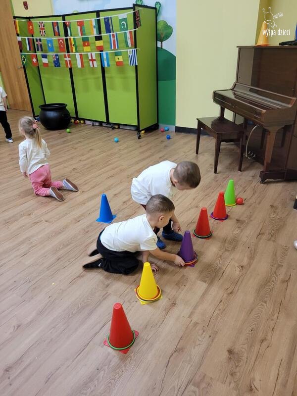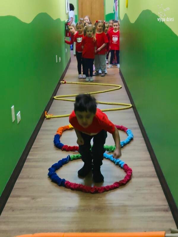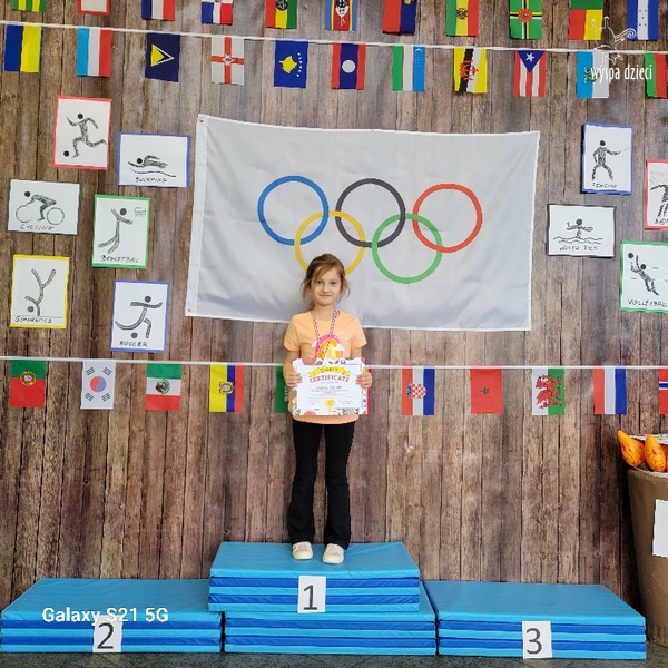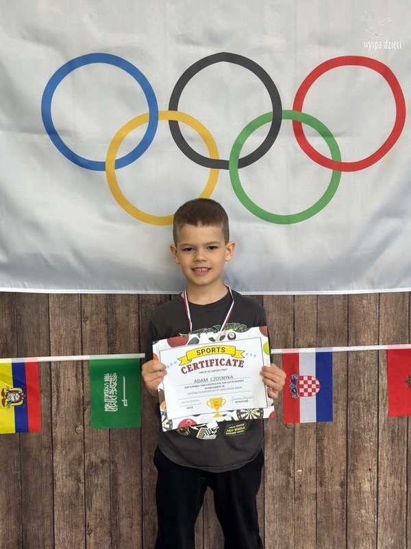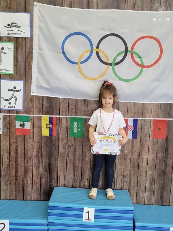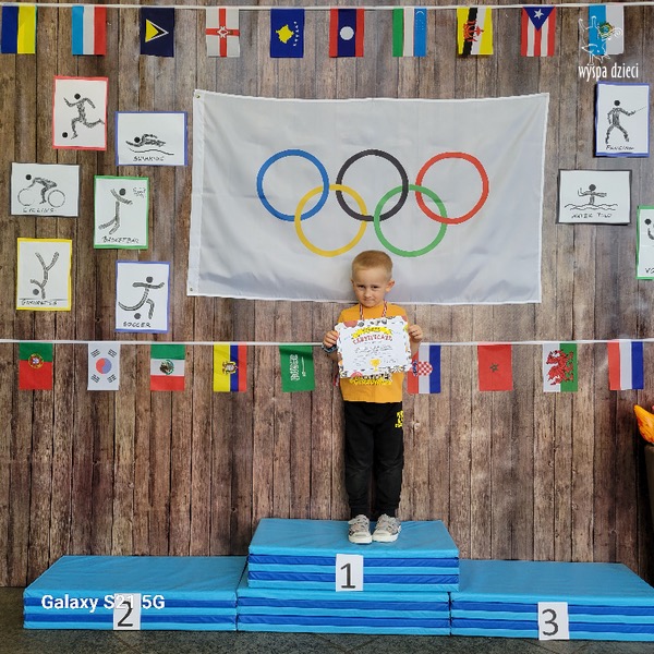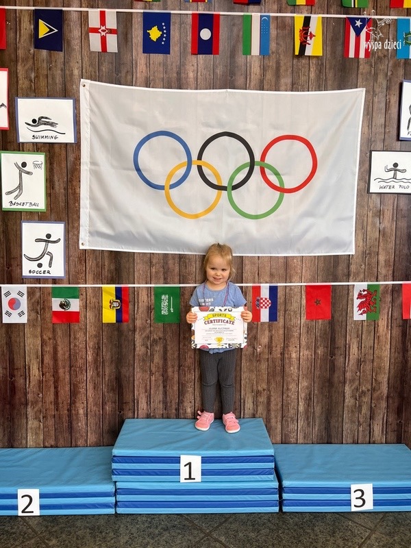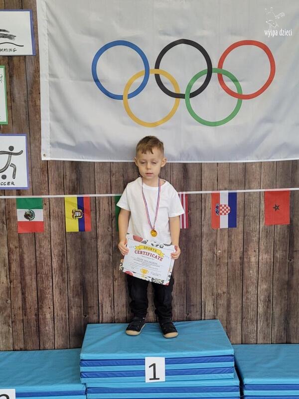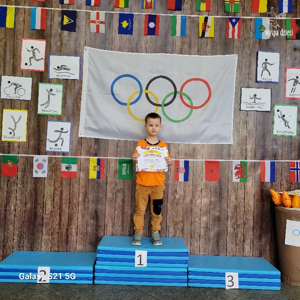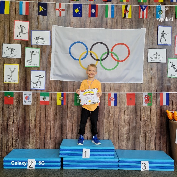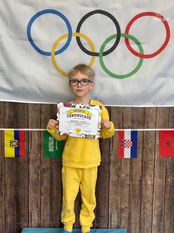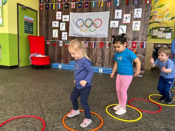 Następnie wszyscy spotkaliśmy się wspólnie na głównym korytarzu przedszkola. Pani Ewa opowiedziała wszystkim o Igrzyskach Olimpijskich, ich symbolach i o współzawodnictwie „fair play” . Znakiem do rozpoczęcia igrzysk było wysłuchanie przez przedszkolaków Hymnu Olimpijskiego. Wszyscy zostali podzieleni na dwie grupy. Pierwsza grupa to : Misie, Krasnale, Smerfy, oraz Bystrzaki, których konkurencje sportowe rozgrywane były na pierwszym piętrze . Natomiast na drugim piętrze była druga grupa – czyli Poszukiwacze, Wynalazcy oraz Odkrywcy. Wszyscy chętnie wykonywali ćwiczenia przygotowane przez nauczycieli. Był maraton, przysiady, pompki, wyskoki w gore,  piłka nożna, rzut do celu, sztafeta, tunel,  i wiele … wiele innych….  . Zabawy i radości było co niemiara, a wszystko w duchu zdrowej i miłej atmosfery rywalizacji. Każdy mógł  spróbować swoich sił w jakiejś dyscyplinie sportowej, a wszystkie dzieci dopingowały sobie nawzajem. Na zakończenie Igrzysk Olimpijskich wszystkim dzieciom zostały wręczone dyplomy oraz medale olimpijskie ! Ten dzień napewno pozostanie w naszej pamięci !  Zapraszamy do galerii zdjęć: