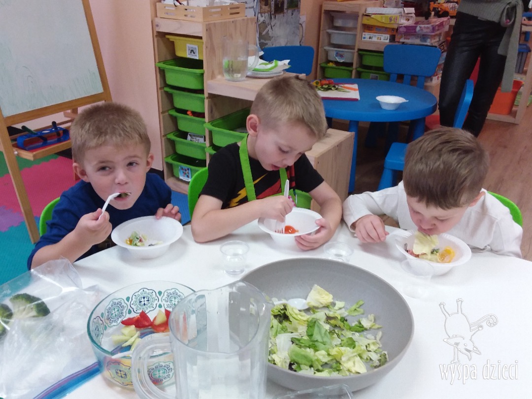 W ciagu ostatnich dwoch tygodni Odkrywcy poznawali rozmaite owoce i warzywa, od ogrodowych darow jesieni, po cytrusy i bardziej egzotyczne gatunki. Nie braklo kolorowych projektow, piosenek i ciekawych lektur. Bylo malowanie brokulami, a takze joga w wyimaginowanym sadzie. Jednak ulubionym zajeciem starszakow okazalo sie odkrywanie nowych smakow: codziennie probowali nowych owocow i warzyw, sokow, a nawet wspolnie przyrzadzili pyszna salate!