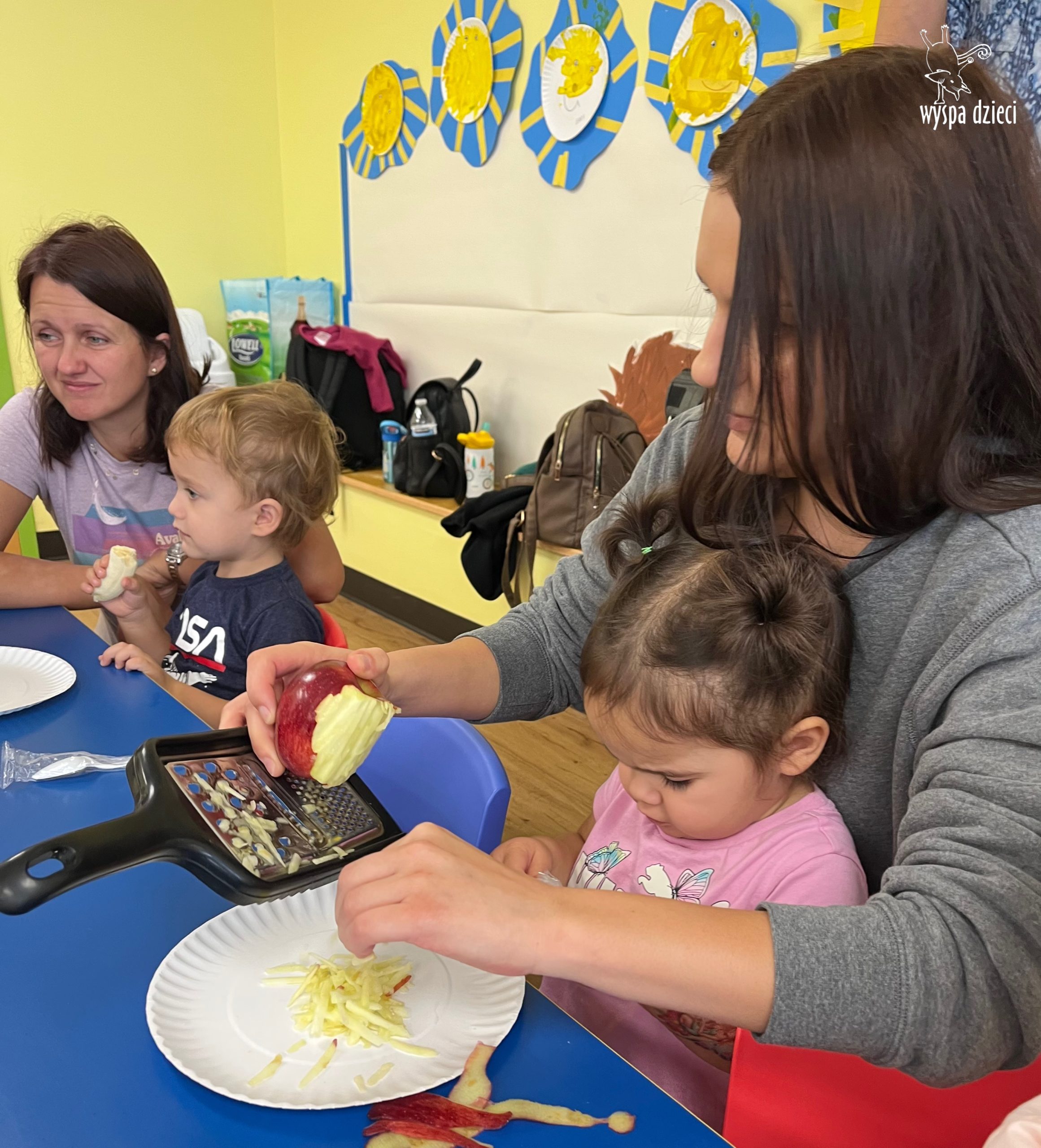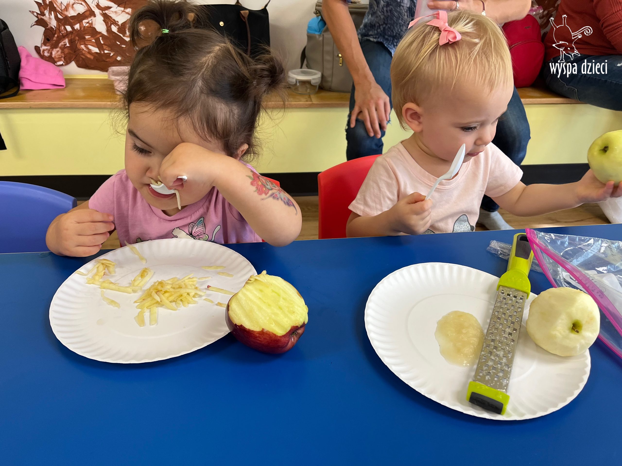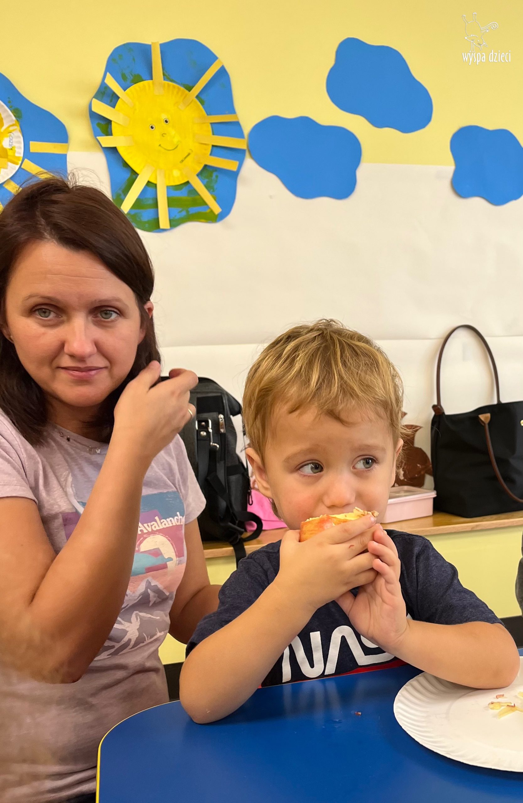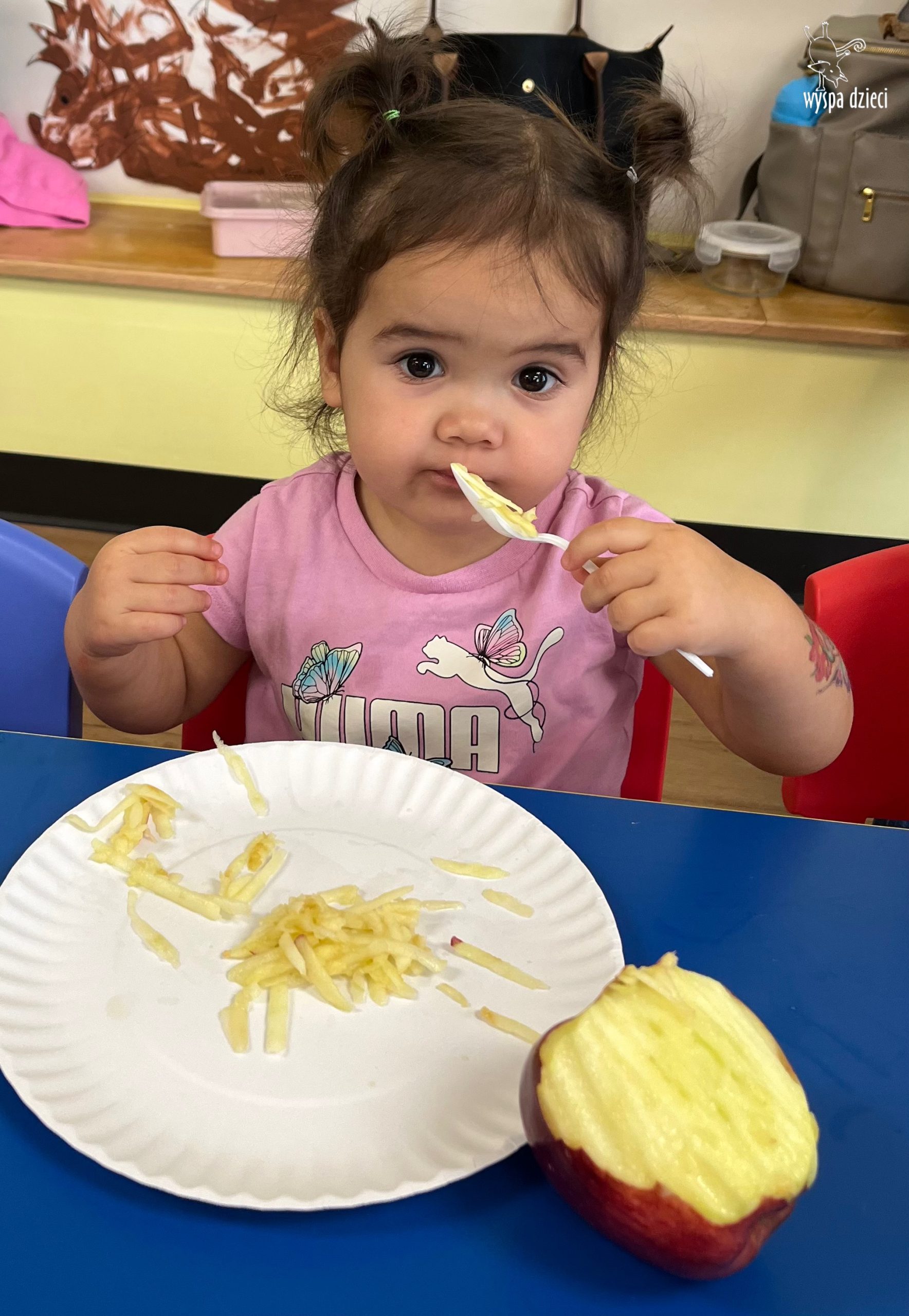 “Dynio,dynio pękata”,””Czerwone jabłuszko”. Malowanie farbami było świetna okazja do ćwiczeń z zakresu koordynacji wzrokowo-ruchowej: praca oko – ręka.Podczas zajęć dzieci miały również okazję zajadać się pysznymi jabłkami.