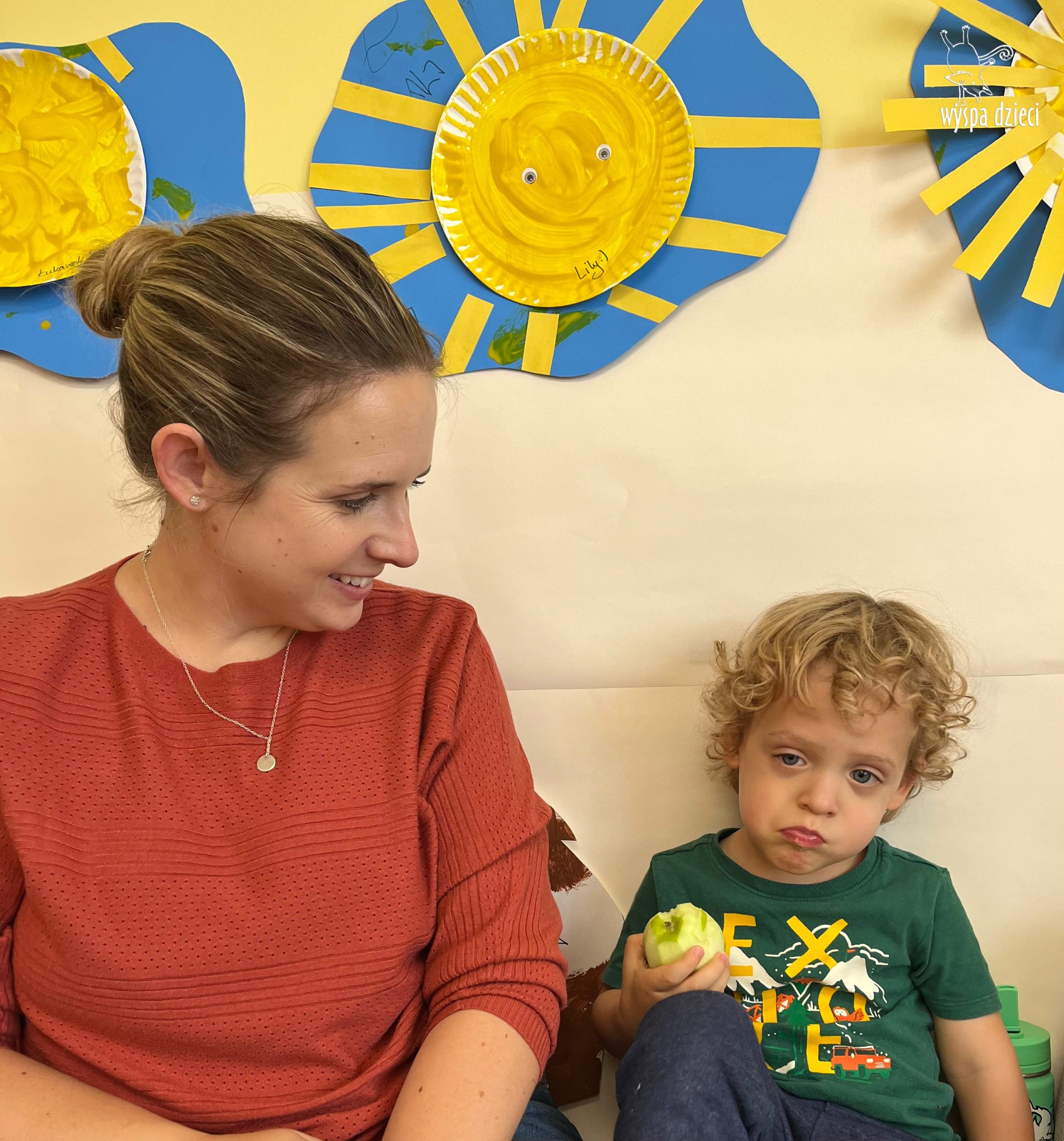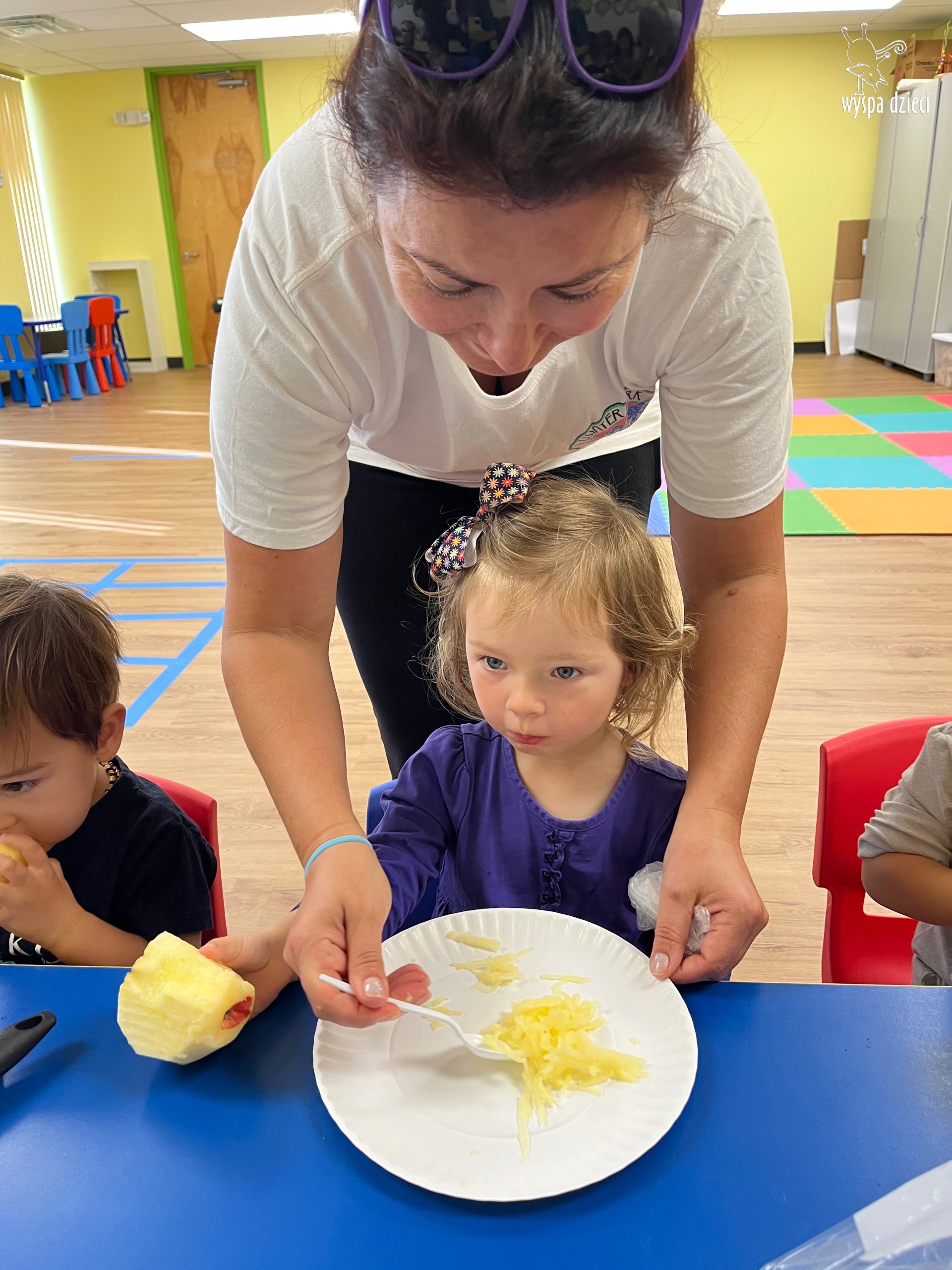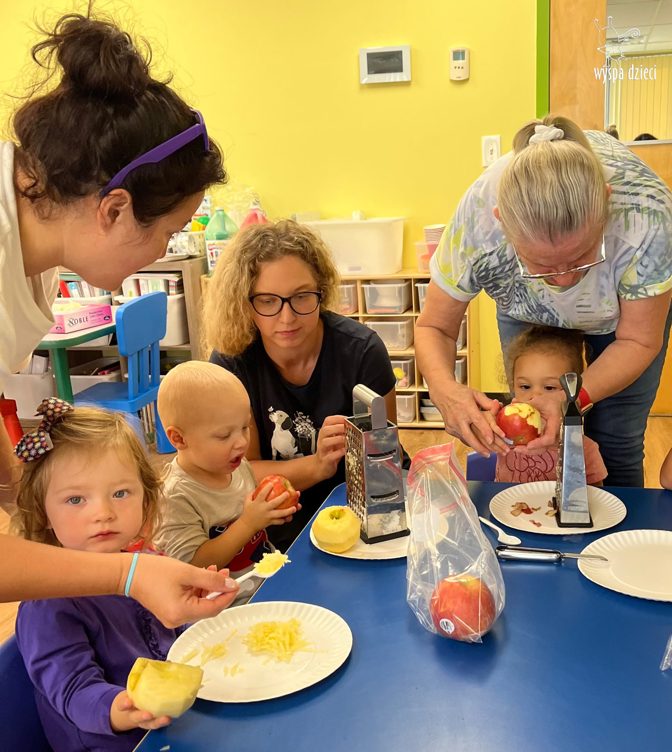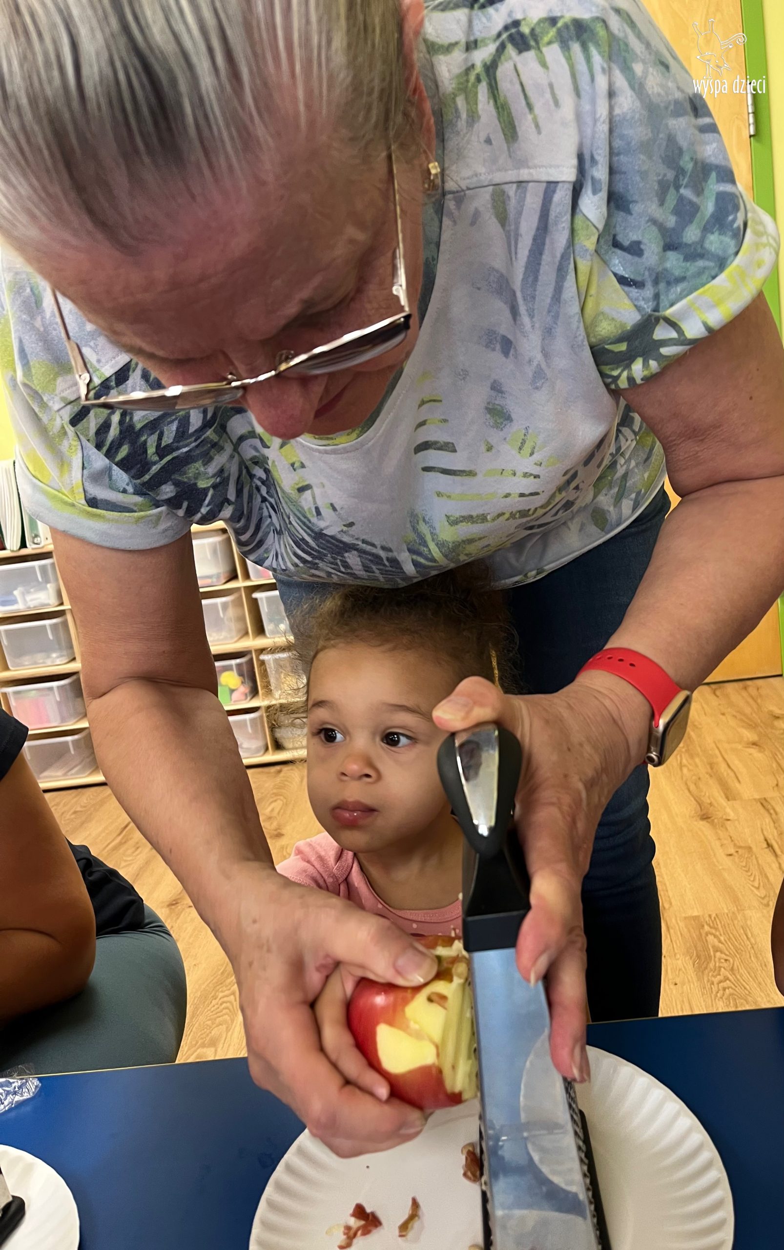 “Dynio,dynio pękata”,””Czerwone jabłuszko”. Malowanie farbami było świetna okazja do ćwiczeń z zakresu koordynacji wzrokowo-ruchowej: praca oko – ręka.Podczas zajęć dzieci miały również okazję zajadać się pysznymi jabłkami.
