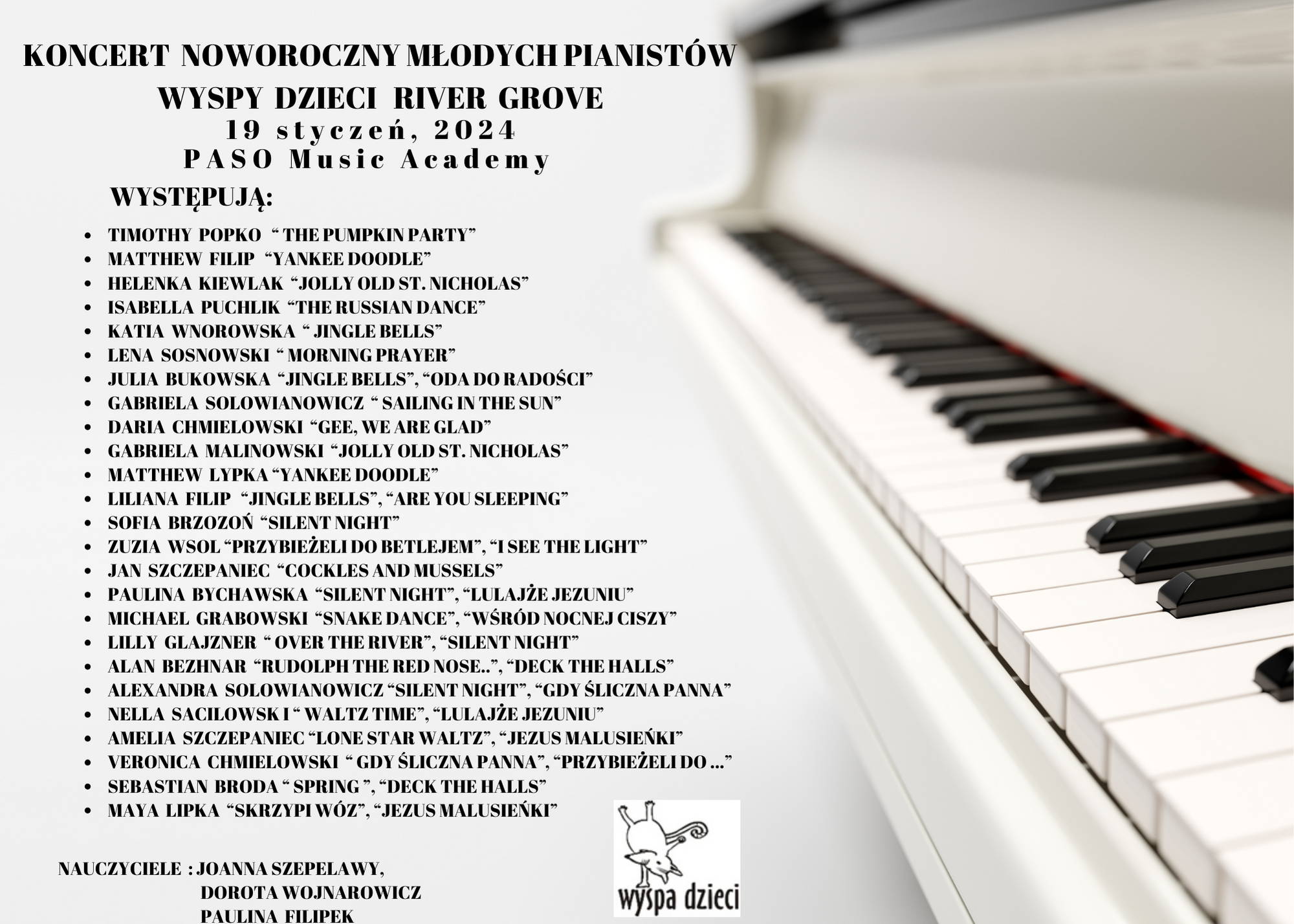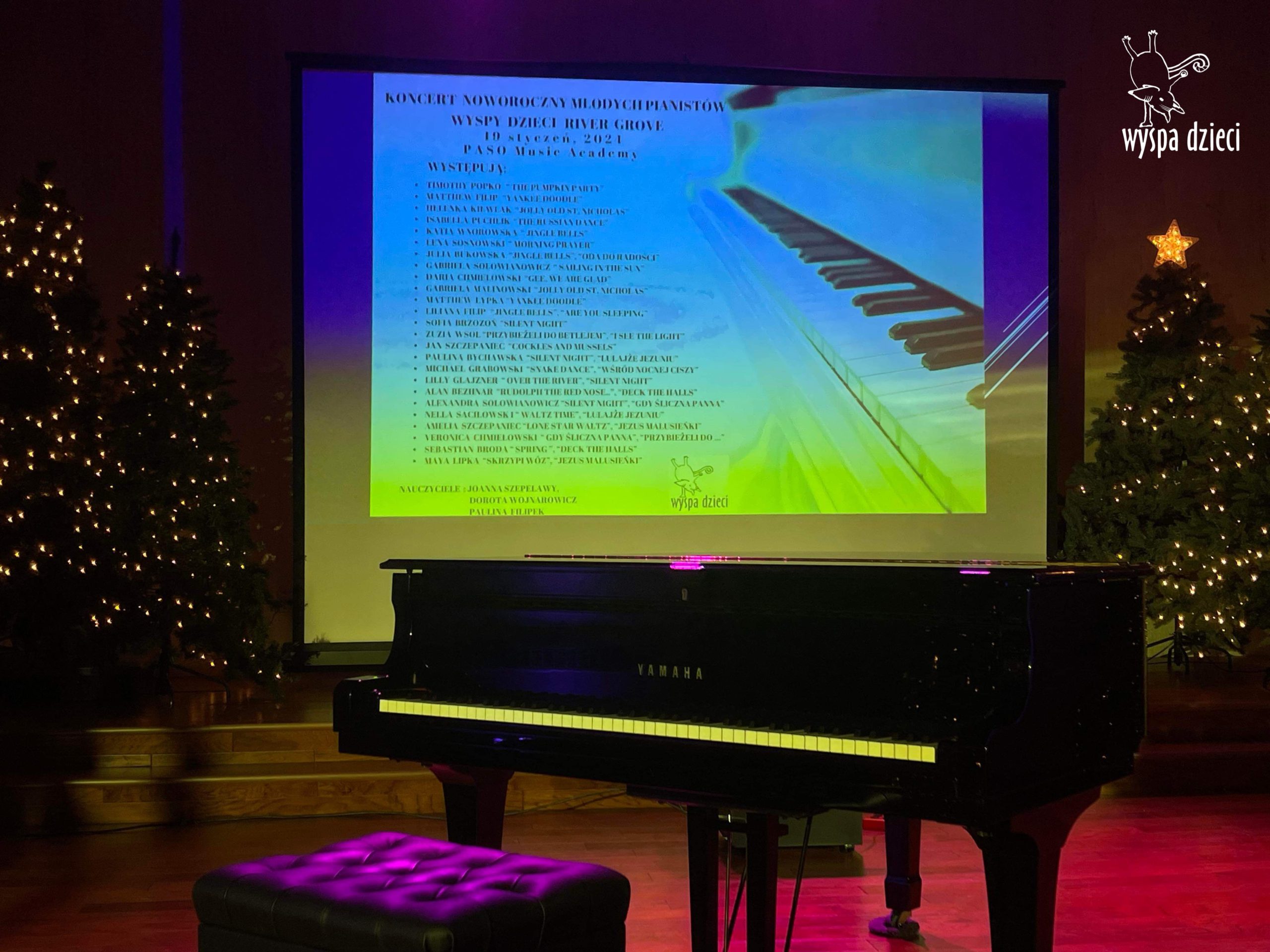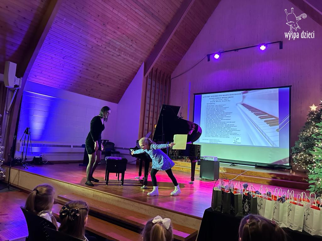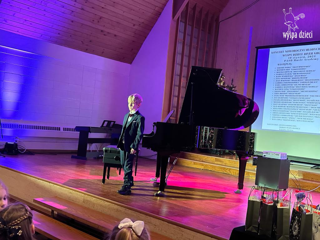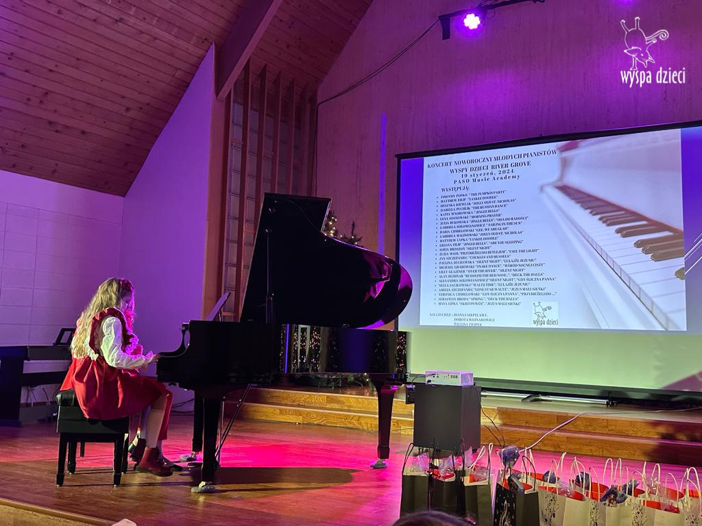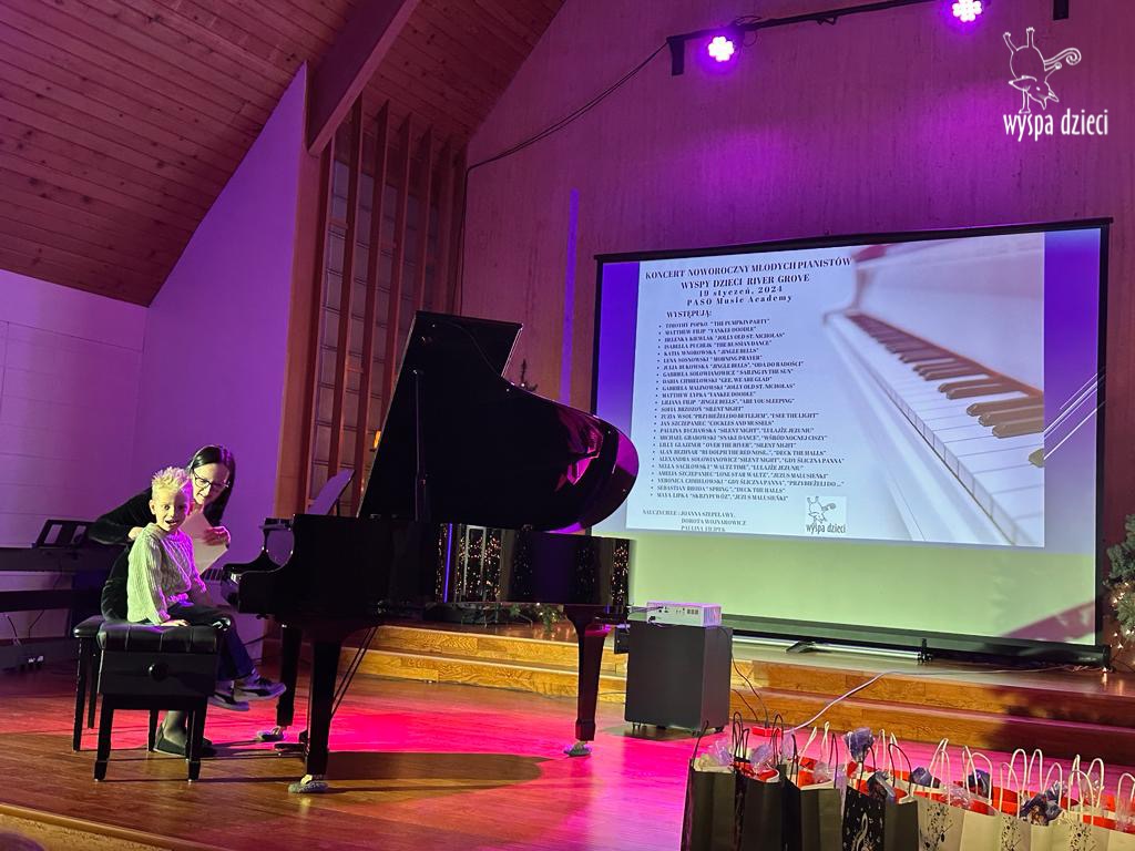 19 stycznia 2024 roku odbyl się koncert noworoczny naszych młodych pianistów Wyspy Dzieci z River Grove. Są to pianiści w wieku od 4 do 10 lat Koncert odbył się w Sali Koncertowej Szkoły Muzycznej PASO. Dzieci miały możliwość zagrania na wspaniałym instrumencie a widownia była wypełniona po brzegi. Popis naszych pianistow oglądali i słuchali również właściciele Wyspy Dzieci – Pani Monika Nawrot oraz Pan Krzysztof Szczepaniec. Dziękuje pięknie Pani Dorocie Wojnarowicz oraz Pani Paulinie Filipek za przygotowanie swoich pianistow. Dziekujemy za goscine Barbara Bilszta Niewrzol , Wojciech Niewrzol oraz za pomoc w organizacji koncertu Annie Ejsmont.