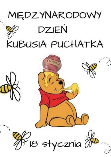 18 stycznia przypada Międzynarodowy Dzień Kubusia Puchatka, czyli misia o „małym rozumku” ale „wielkim sercu”. Bohater powieści Milne’a, amator miodku mieszkający w Stumilowym Lesie, jest kultową postacią dla przedstawicieli kilku pokoleń. Kubuś w prosty sposób uczy wielu życiowych mądrości, pokazuje, że warto cieszyć się z najmniejszych nawet rzeczy, jest życzliwy dla innych, a przyjaźń i pomaganie przyjaciołom są dla niego bardzo ważne.