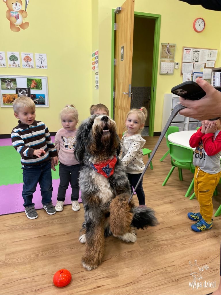 Taka przysłowiowa „wisienka na torcie” była wizyta czworonoga w naszej Wyspie Dzieci. Nasza Pani Monika Nawrot przyprowadziła swojego kudłatego przyjaciela o imieniu MILO. Dzieci były szczęśliwe widząc tak pięknego i mądrego czworonoga. Milo jest dopiero 9 miesięcznym szczeniakiem ale jest już większy od niejednego naszego przedszkolaka z grupy Misie. Miło nawet odwiedził nasze biuro!!!!