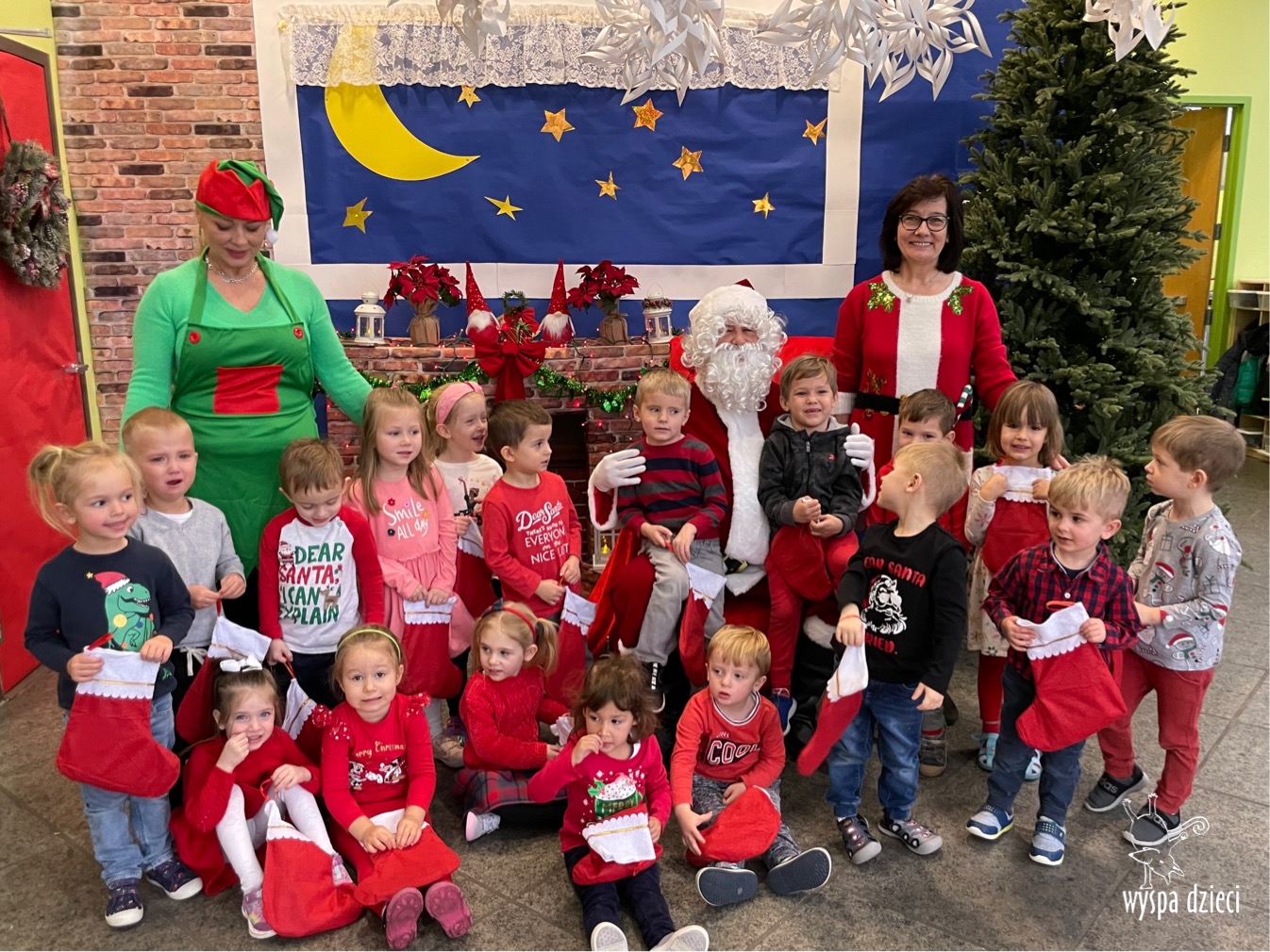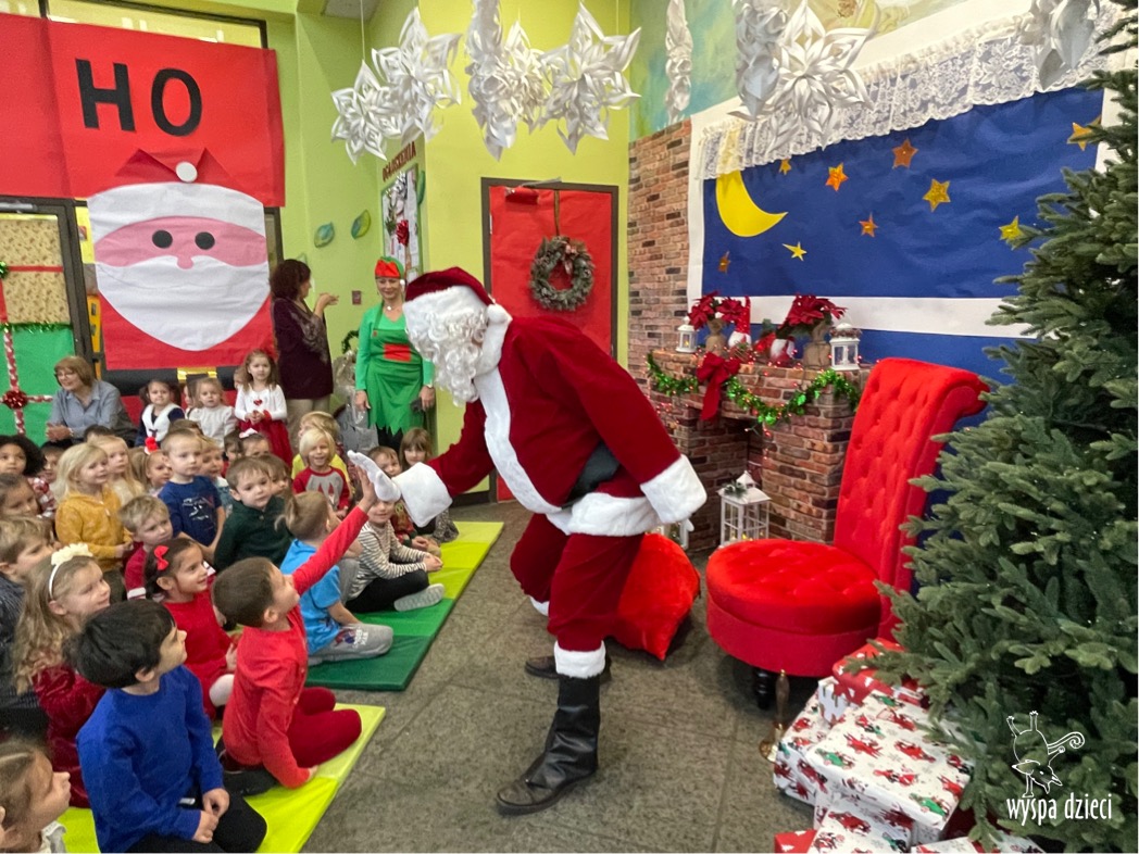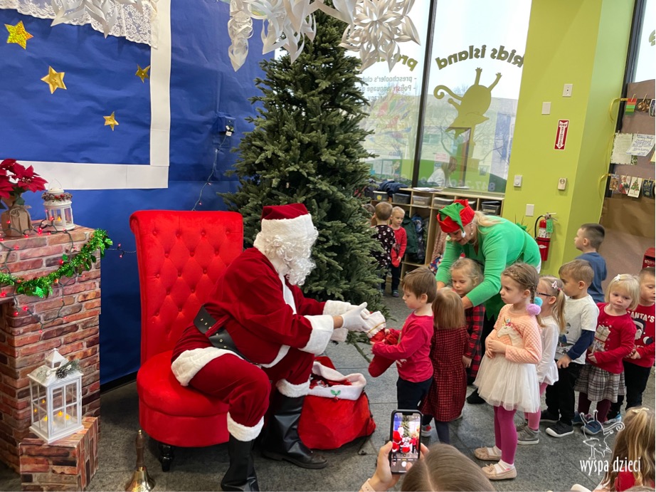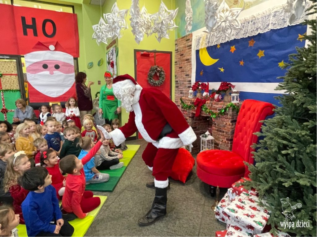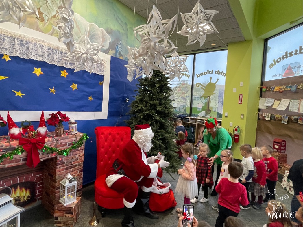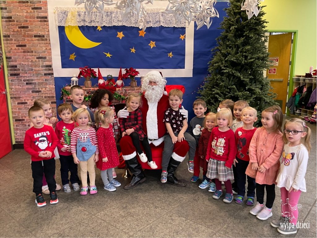 W naszej Wyspie dla Mikołaja od rana były przygotowane ciasteczka i mleczko. Już od rana dzieci wypatrywały Go przez okna przedszkola. I proszę sobie wyobrazić ze Mikołaj skusił się na te smakołyki i pojawił się w naszej Wyspie. Ho, ho, ho, czy tutaj jest Wyspa Dzieci ? Tak przywitał przedszkolaki nasz gość – Święty Mikołaj. Przybył z workami pełnymi prezentów. A pod choinka zostawił mnóstwo prezentów – zabawek do naszych klas. Podziękowaliśmy Mikołajowi za wizytę piosenką – ” Mikołaj jedzie samochodem”. Na koniec wszystkie dzieci zrobiły sobie pamiątkowe grupowe zdjęcia z Mikołajem.