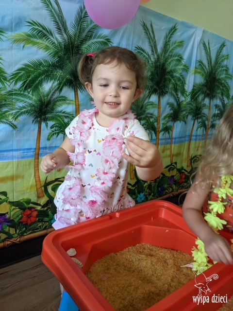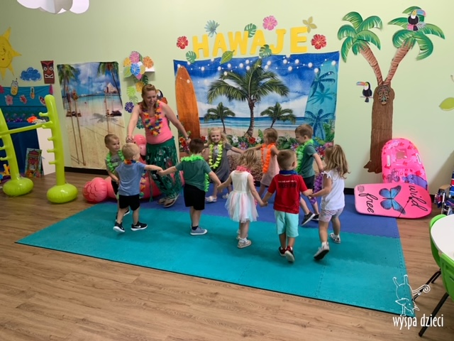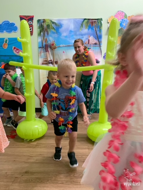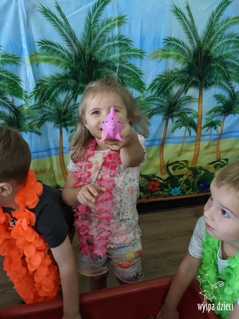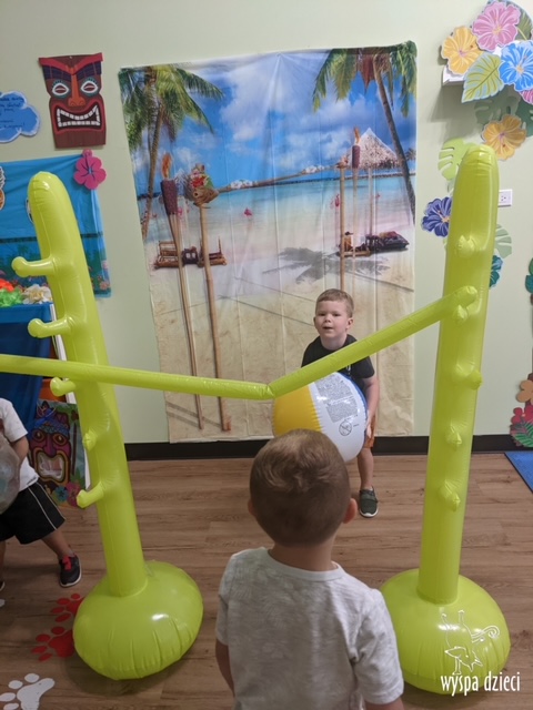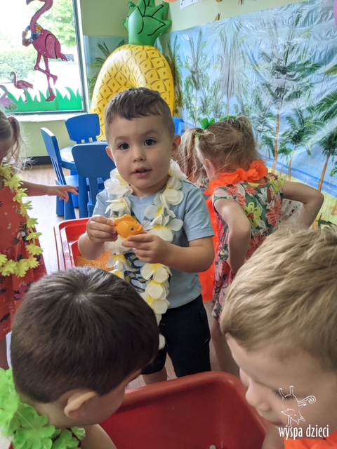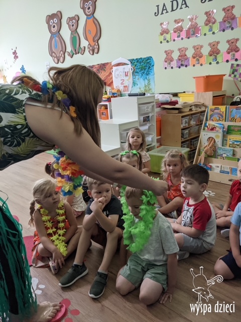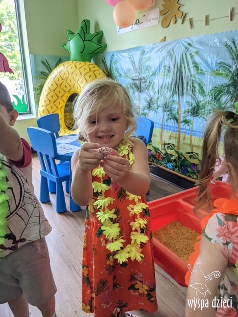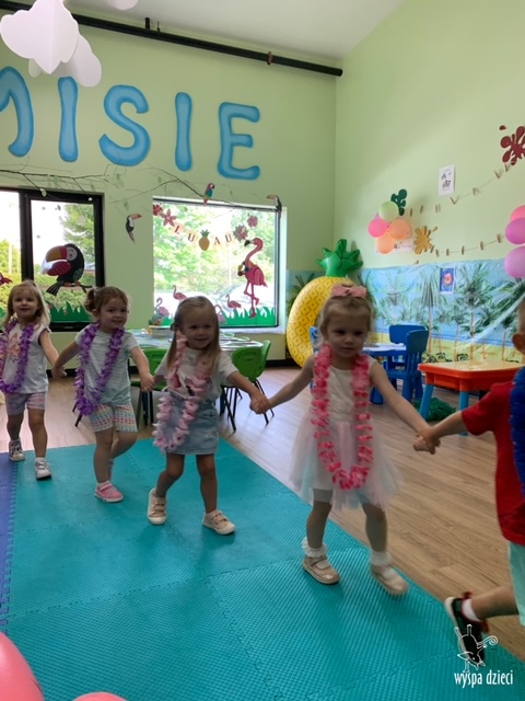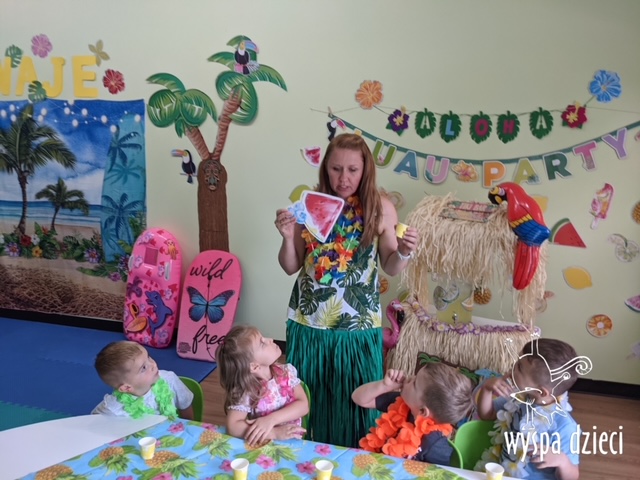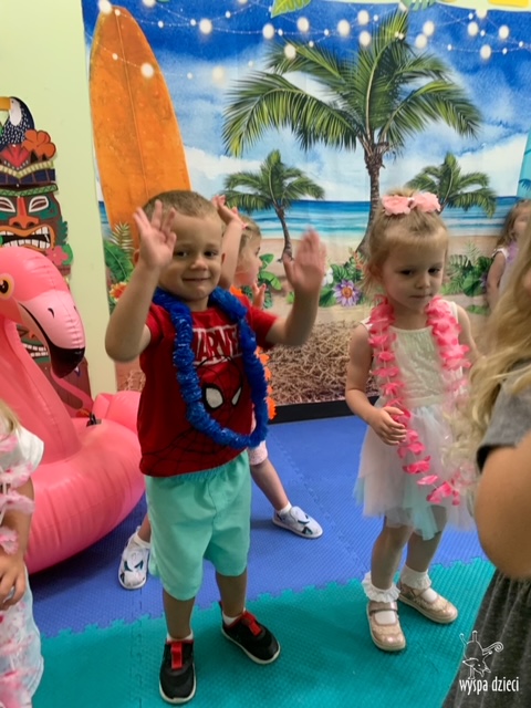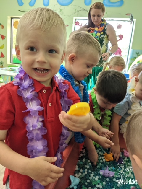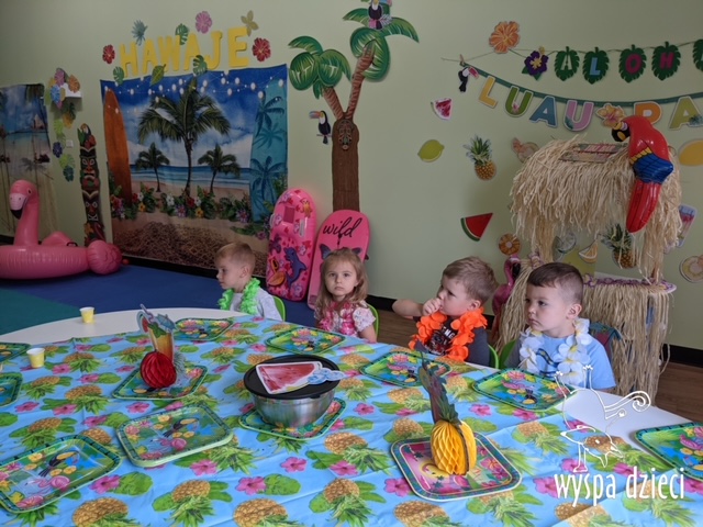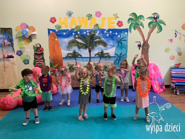 Misie wybrały się na wakacyjną przygodę na Hawaje. Podczas całego tygodnia mogły nauczyć sie różnych ciekawych rzeczy o Hawajach, uczyły się tańca hawajskiego jak również w jaki sposób Hawajczycy się witają. Ponadto czas ten upłynął na świetnie zabawie. Misiaczki pograły w siatkówkę plażowa, próbowały trafiać do celu kółeczkami, poszukiwały muszelek ukrytych w ryżu oraz rybek w małym oceanie 🙂 a po wspaniałej przygodzie znalazły czas na odpoczynek podczas którego zajadały się pysznym arbuzem i popijały lemoniadę 🙂