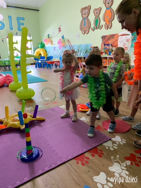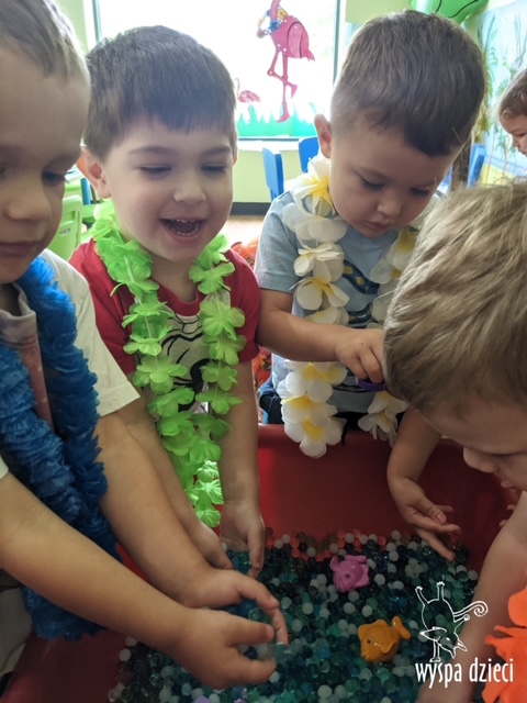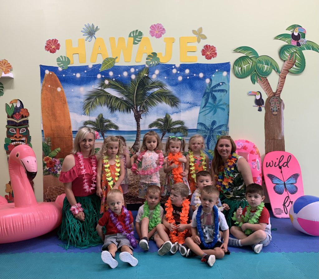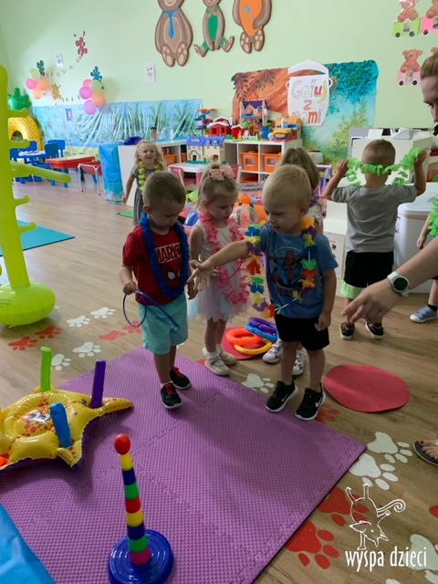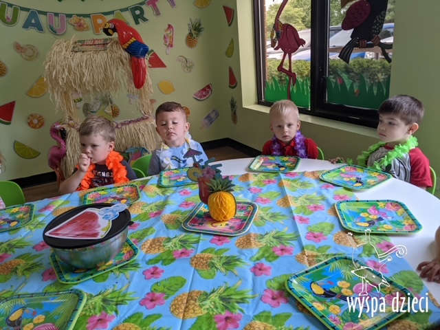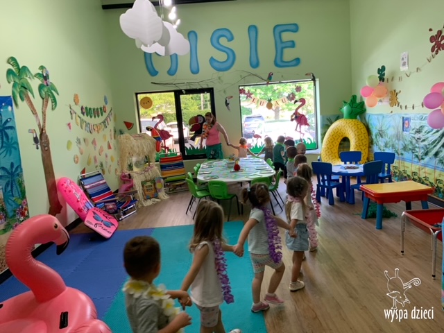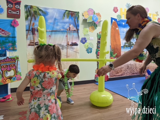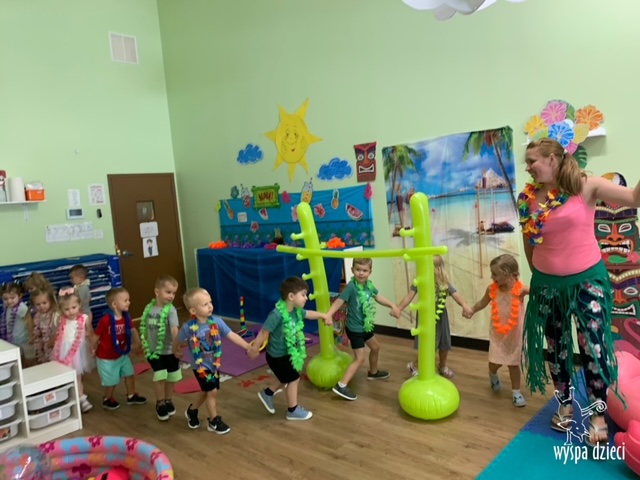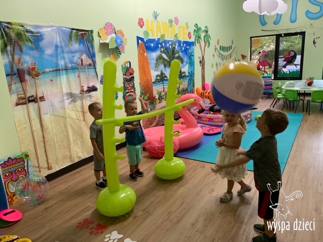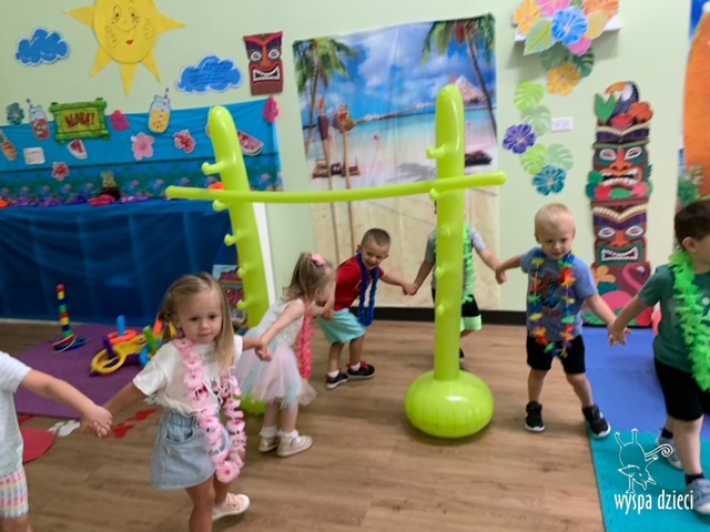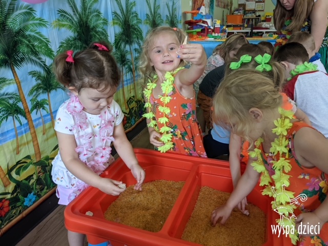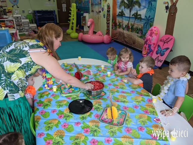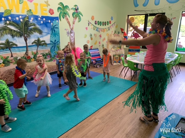Misie wybrały się na wakacyjną przygodę na Hawaje. Podczas całego tygodnia mogły nauczyć sie różnych ciekawych rzeczy o Hawajach, uczyły się tańca hawajskiego jak również w jaki sposób Hawajczycy się witają. Ponadto czas ten upłynął na świetnie zabawie. Misiaczki pograły w siatkówkę plażowa, próbowały trafiać do celu kółeczkami, poszukiwały muszelek ukrytych w ryżu oraz rybek w małym oceanie 🙂 a po wspaniałej przygodzie znalazły czas na odpoczynek podczas którego zajadały się pysznym arbuzem i popijały lemoniadę 🙂