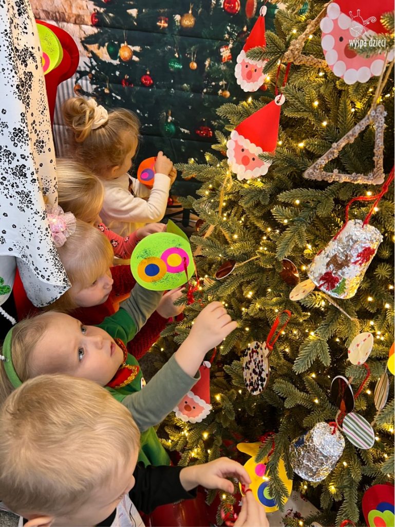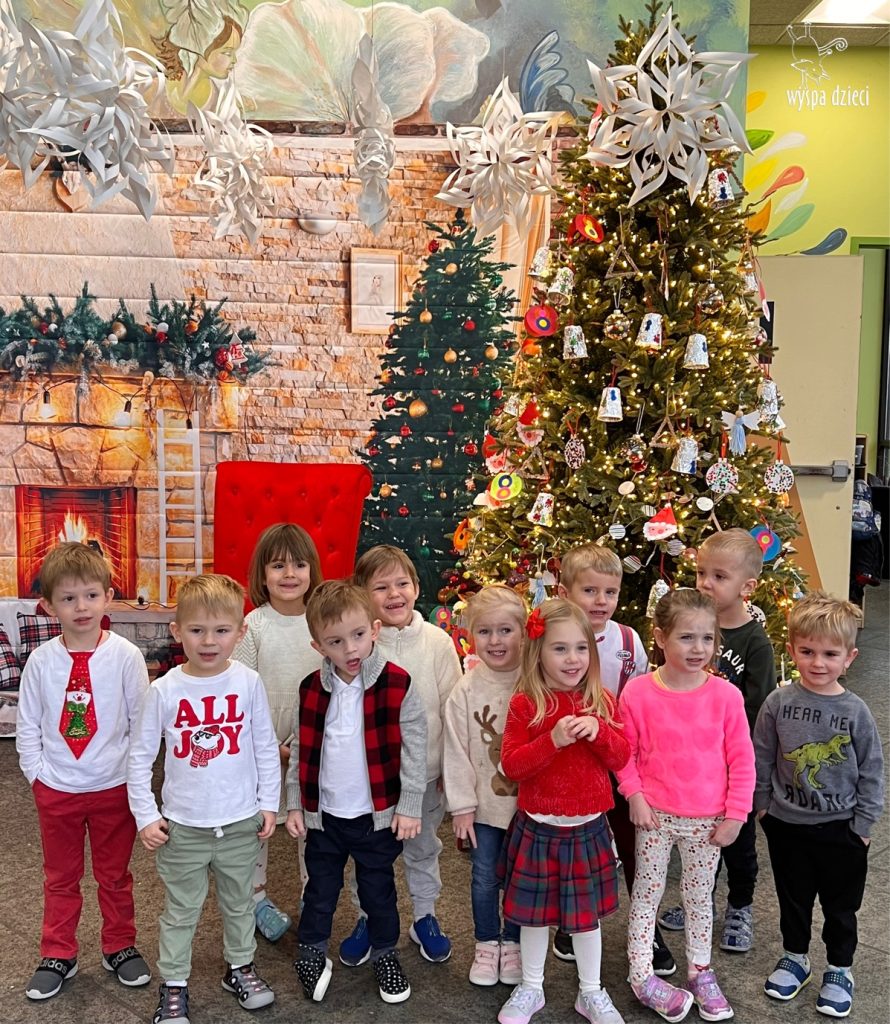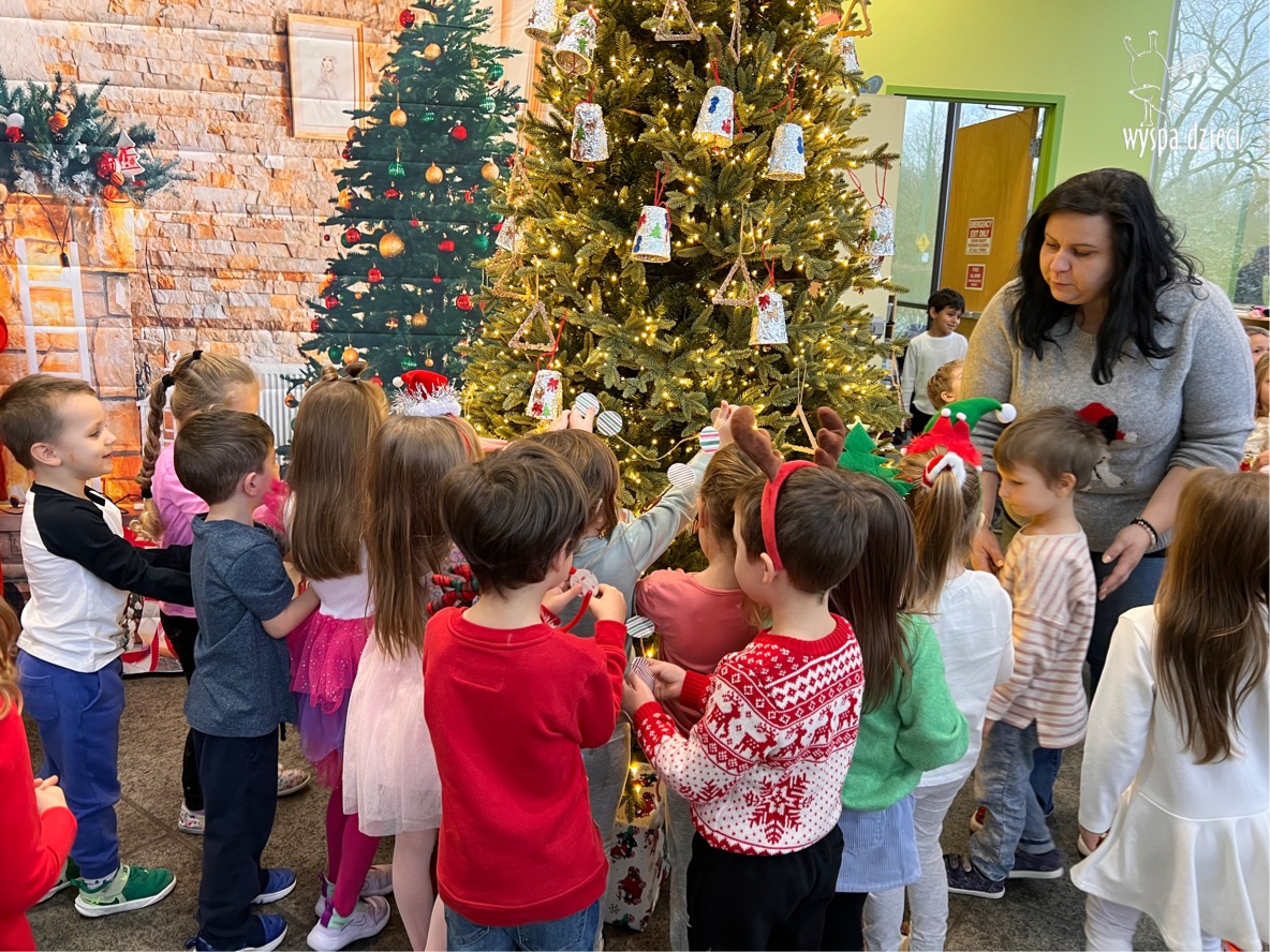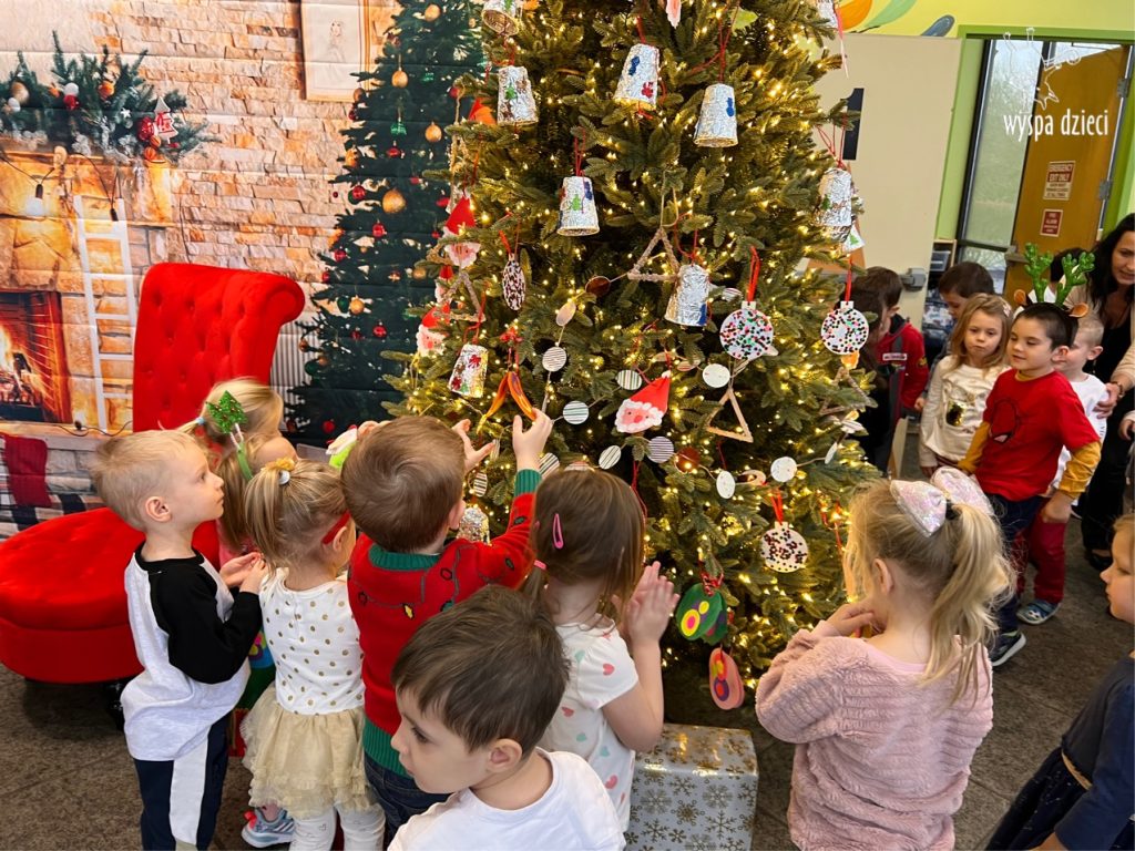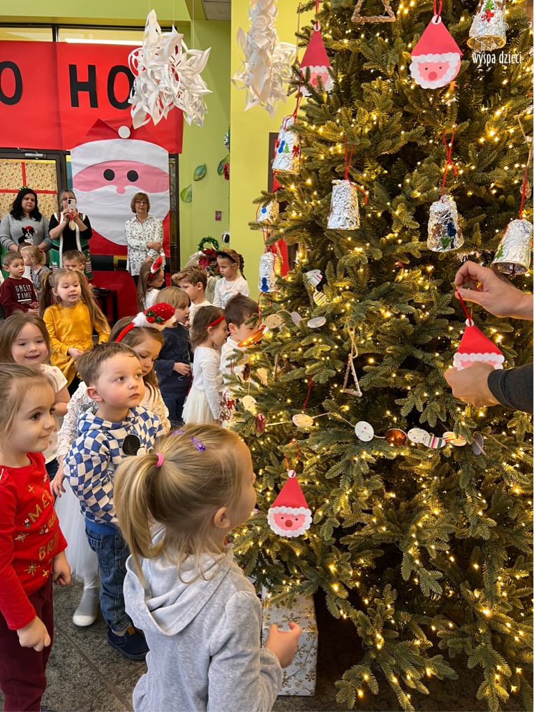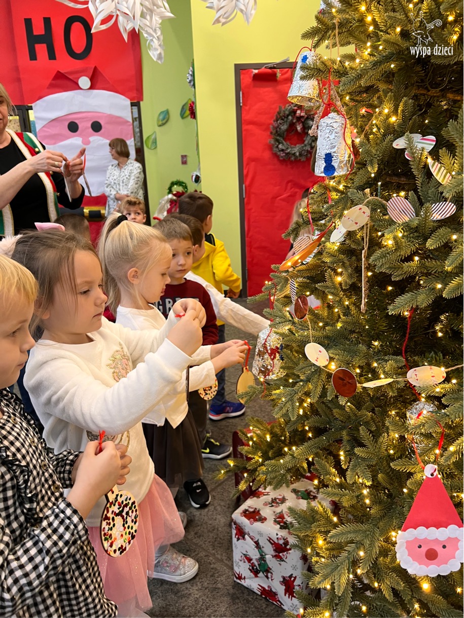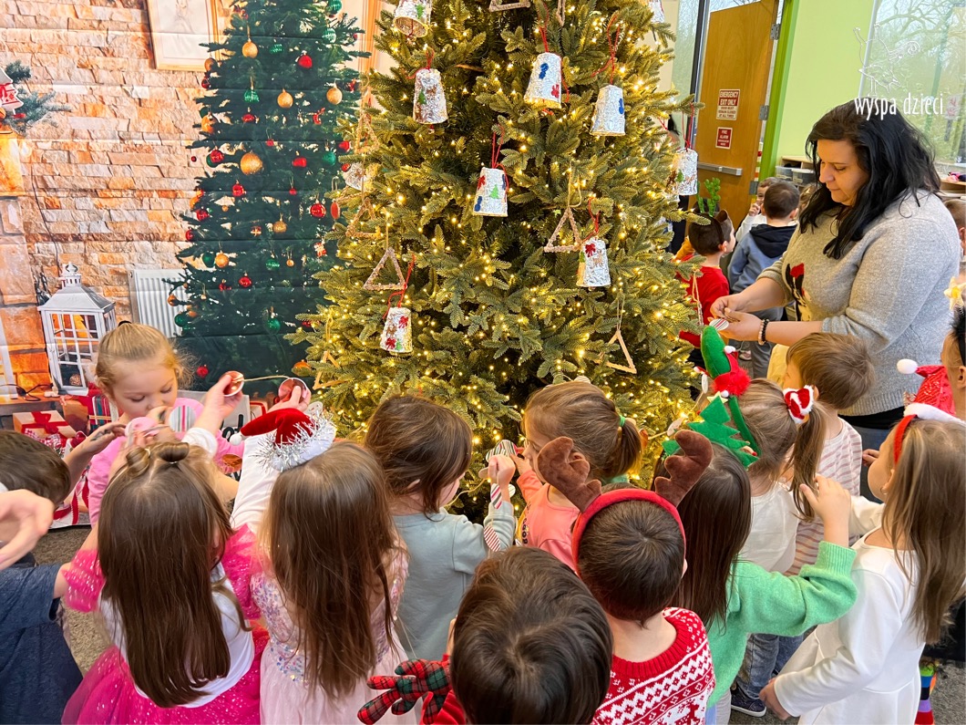 Osiem naszych grup Wyspy Dzieci spotkało się o godzinie 10:30 rano w głównym korytarzu. Pani Ewa z grupy Wynalazców bardzo ciekawie opowiedziała o choince, jakie wartości są najważniejsze w święta ( miłość, pomaganie itp). Nagle nasza choinka rozświetliła się tysiącem jasnych światełek, a Pani Paulinka przepięknie przygrywała świątecznie na pianinie. . Każda grupa, osobno podchodząc do naszej choinki wieszała ozdoby które wcześniej przygotowali wspólnie ze swoimi nauczycielami na zajęciach . Nasza choinka z każdej sekundy wyglądała coraz piękniej. Jak już powiesiliśmy wszystkie ozdoby, wtedy nastąpił czas na wspólne kolędowanie. Wszyscy razem zaśpiewaliśmy kolede „Przybieżeli do Betlejem”.