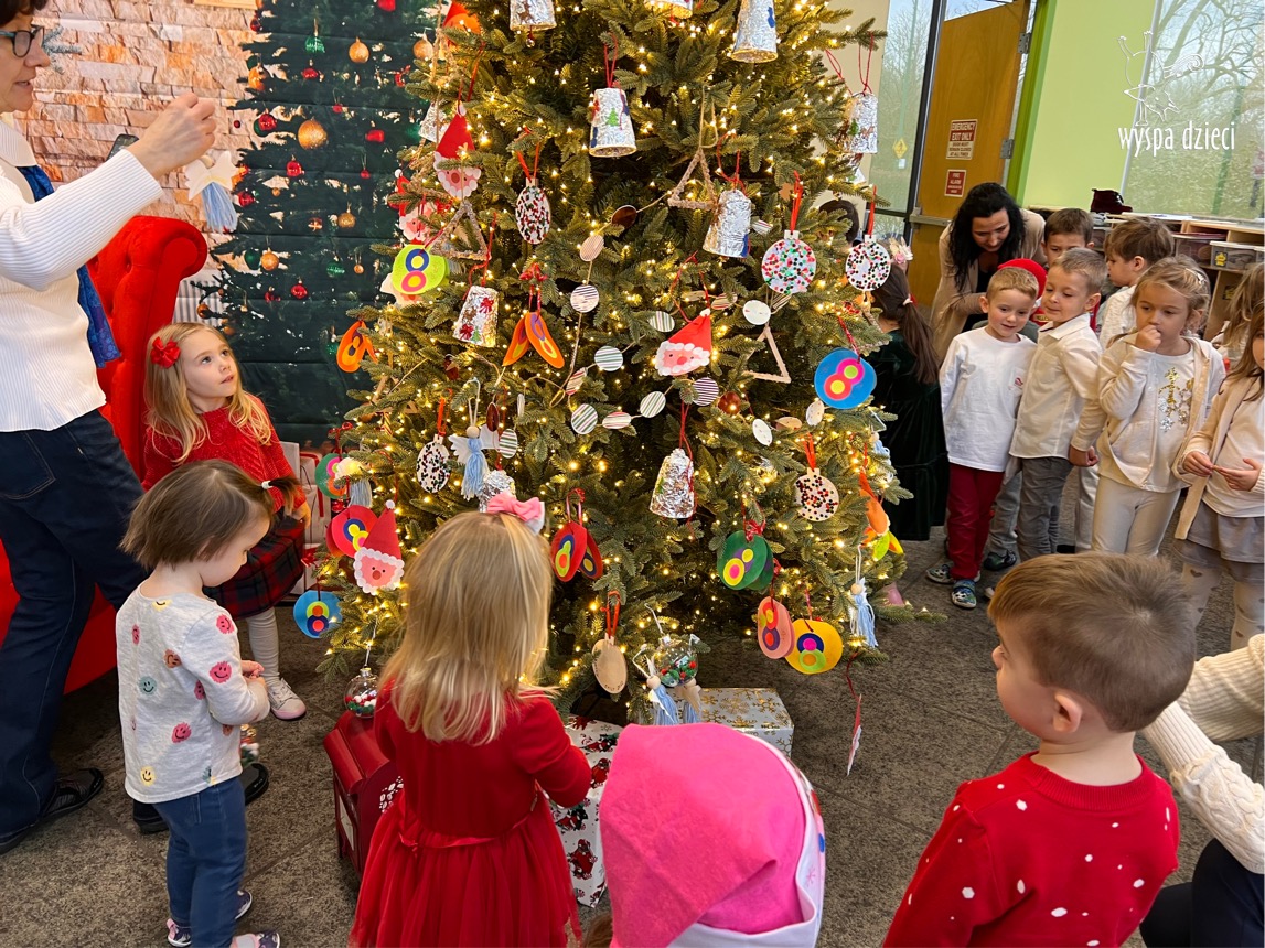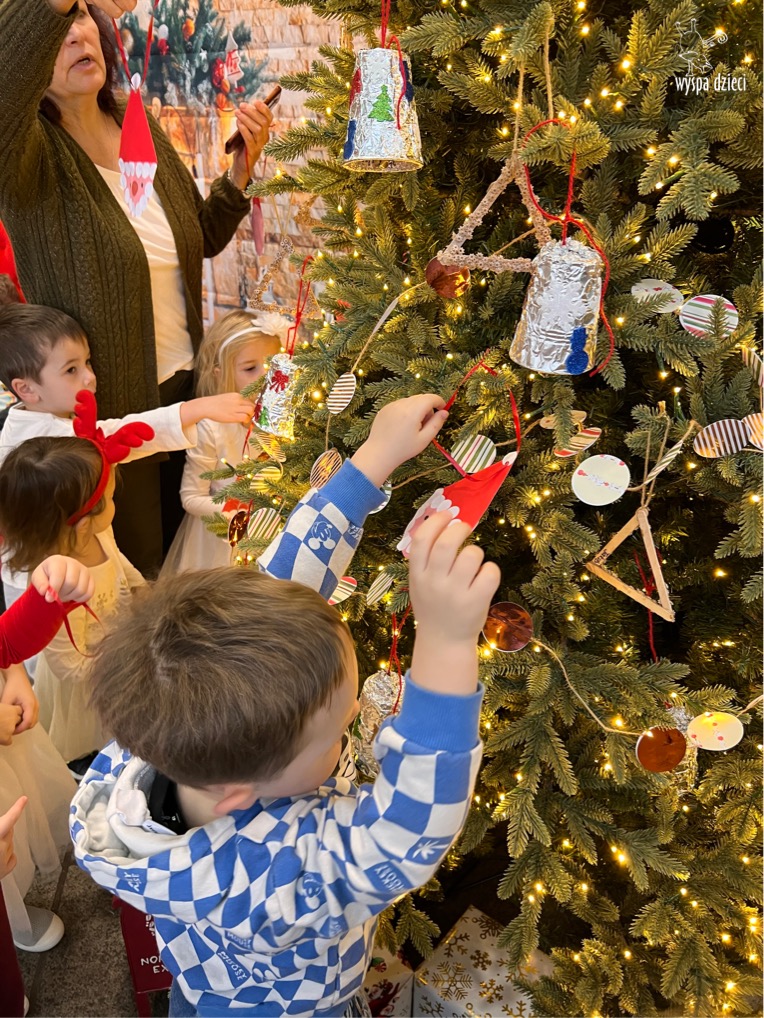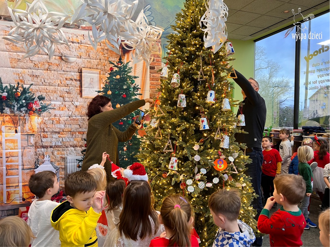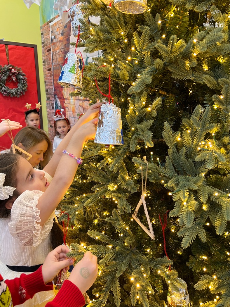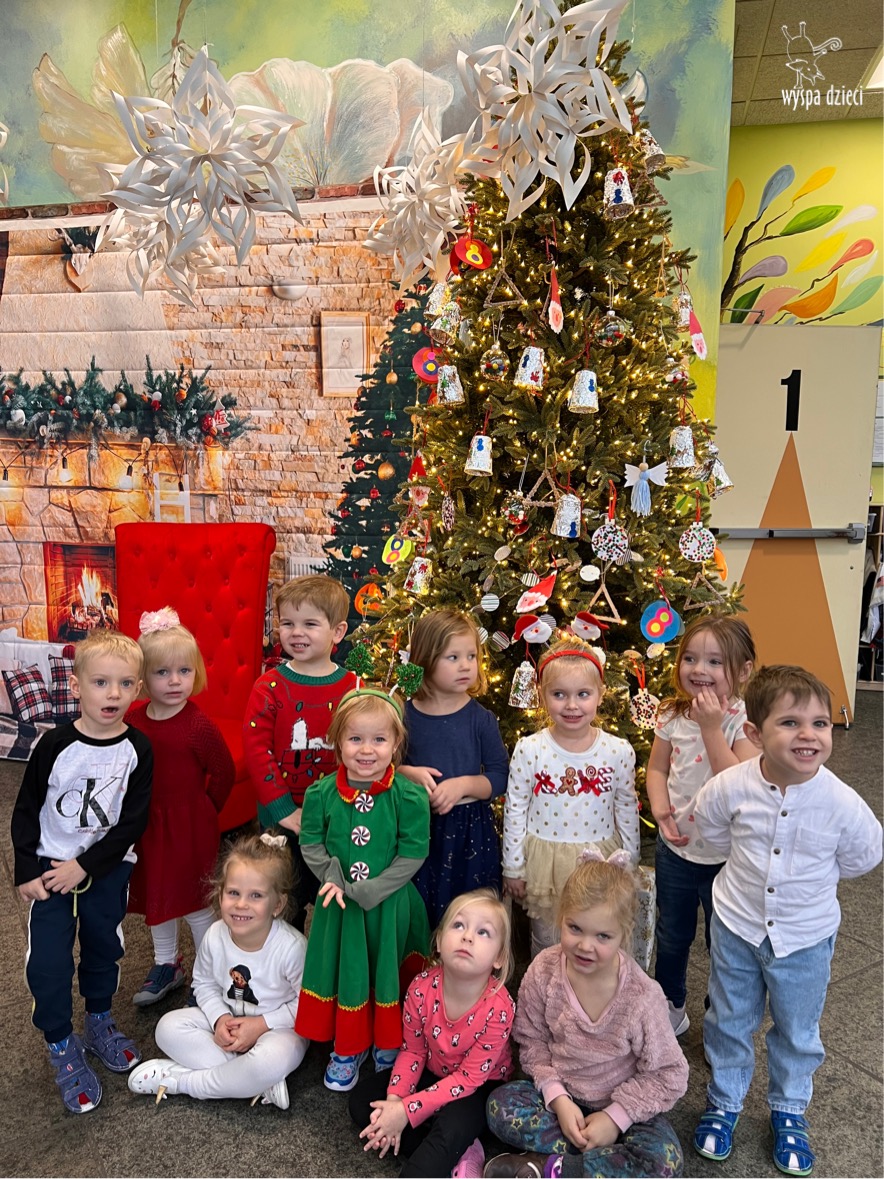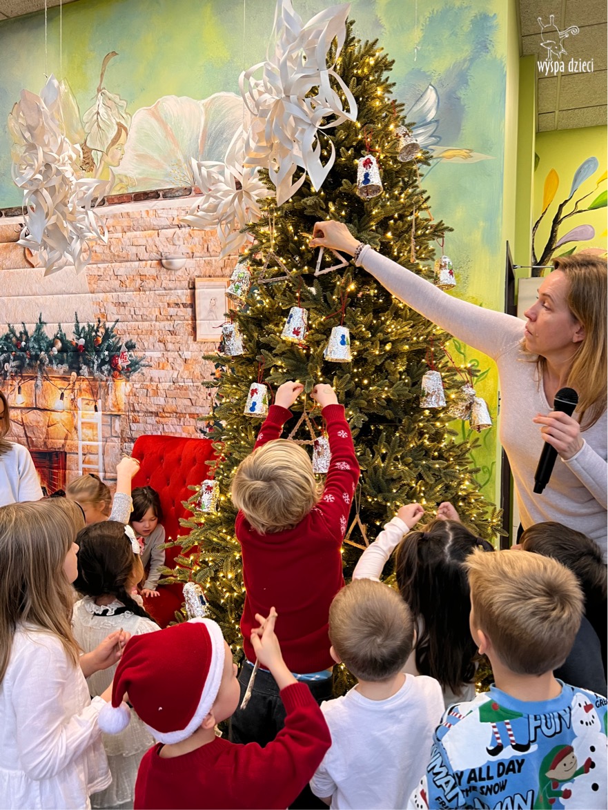 Osiem naszych grup Wyspy Dzieci spotkało się o godzinie 10:30 rano w głównym korytarzu. Pani Ewa z grupy Wynalazców bardzo ciekawie opowiedziała o choince, jakie wartości są najważniejsze w święta ( miłość, pomaganie itp). Nagle nasza choinka rozświetliła się tysiącem jasnych światełek, a Pani Paulinka przepięknie przygrywała świątecznie na pianinie. . Każda grupa, osobno podchodząc do naszej choinki wieszała ozdoby które wcześniej przygotowali wspólnie ze swoimi nauczycielami na zajęciach . Nasza choinka z każdej sekundy wyglądała coraz piękniej. Jak już powiesiliśmy wszystkie ozdoby, wtedy nastąpił czas na wspólne kolędowanie. Wszyscy razem zaśpiewaliśmy kolede „Przybieżeli do Betlejem”.