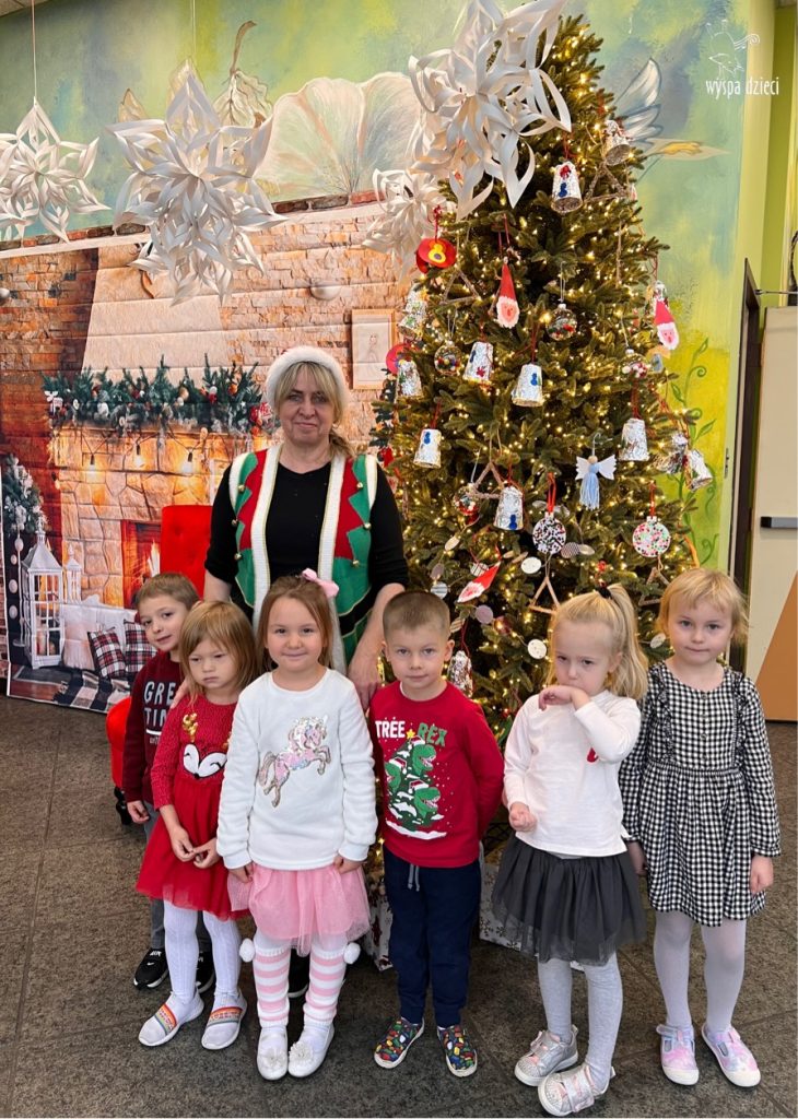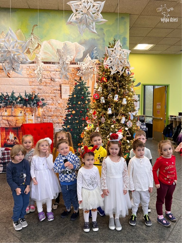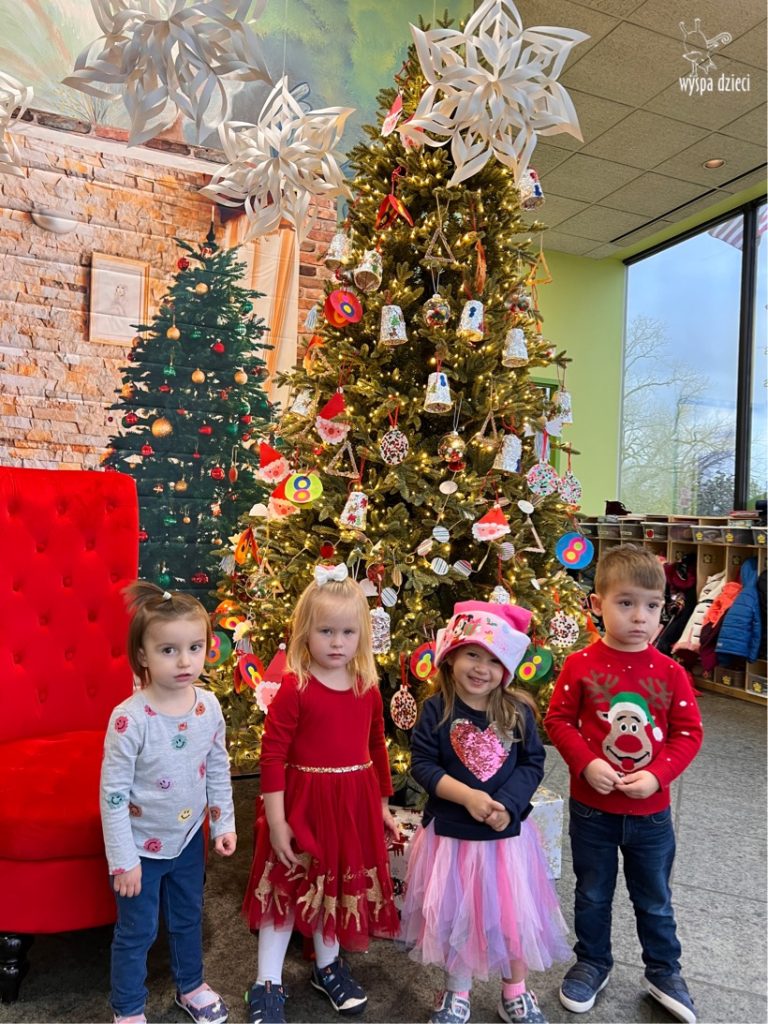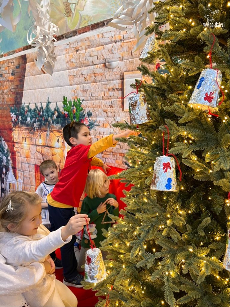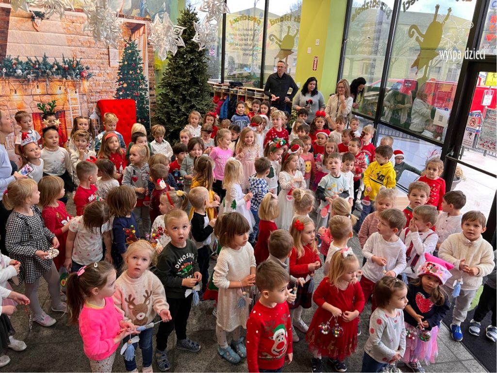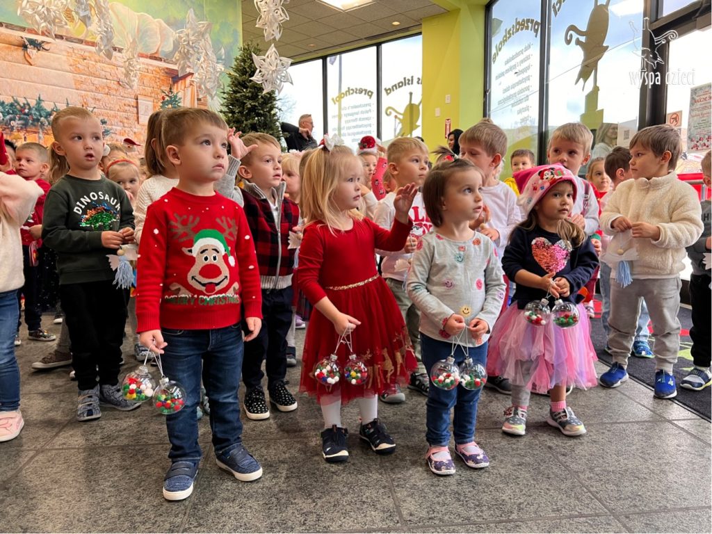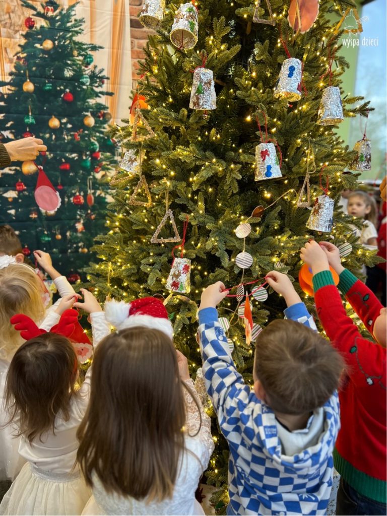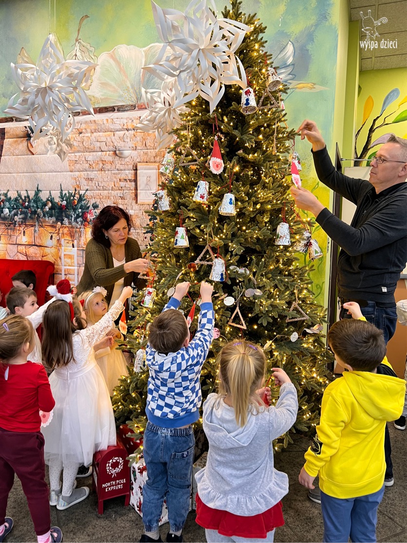 Osiem naszych grup Wyspy Dzieci spotkało się o godzinie 10:30 rano w głównym korytarzu. Pani Ewa z grupy Wynalazców bardzo ciekawie opowiedziała o choince, jakie wartości są najważniejsze w święta ( miłość, pomaganie itp). Nagle nasza choinka rozświetliła się tysiącem jasnych światełek, a Pani Paulinka przepięknie przygrywała świątecznie na pianinie. . Każda grupa, osobno podchodząc do naszej choinki wieszała ozdoby które wcześniej przygotowali wspólnie ze swoimi nauczycielami na zajęciach . Nasza choinka z każdej sekundy wyglądała coraz piękniej. Jak już powiesiliśmy wszystkie ozdoby, wtedy nastąpił czas na wspólne kolędowanie. Wszyscy razem zaśpiewaliśmy kolede „Przybieżeli do Betlejem”.