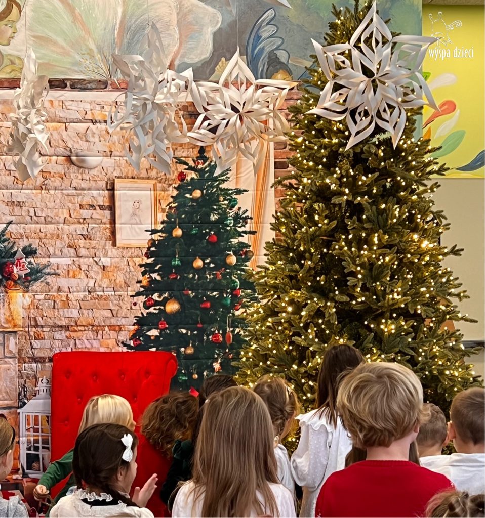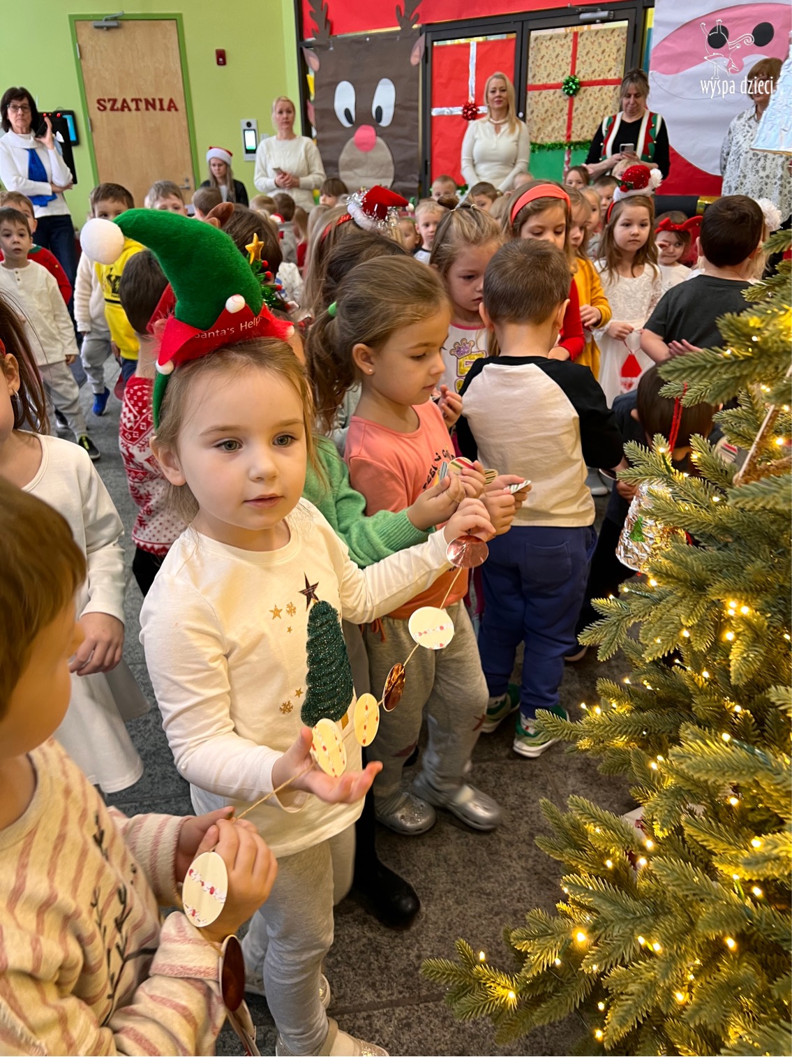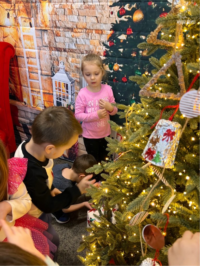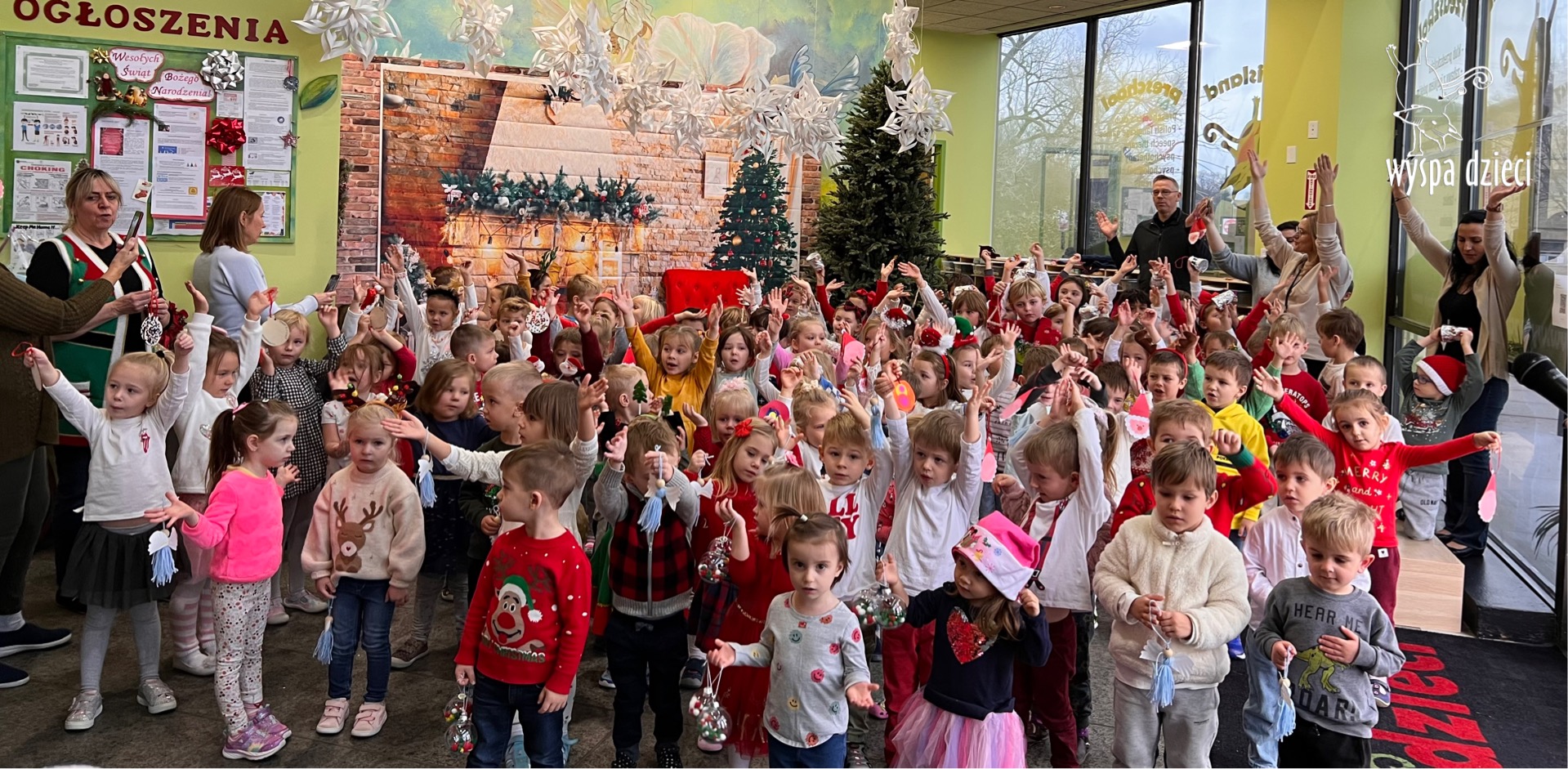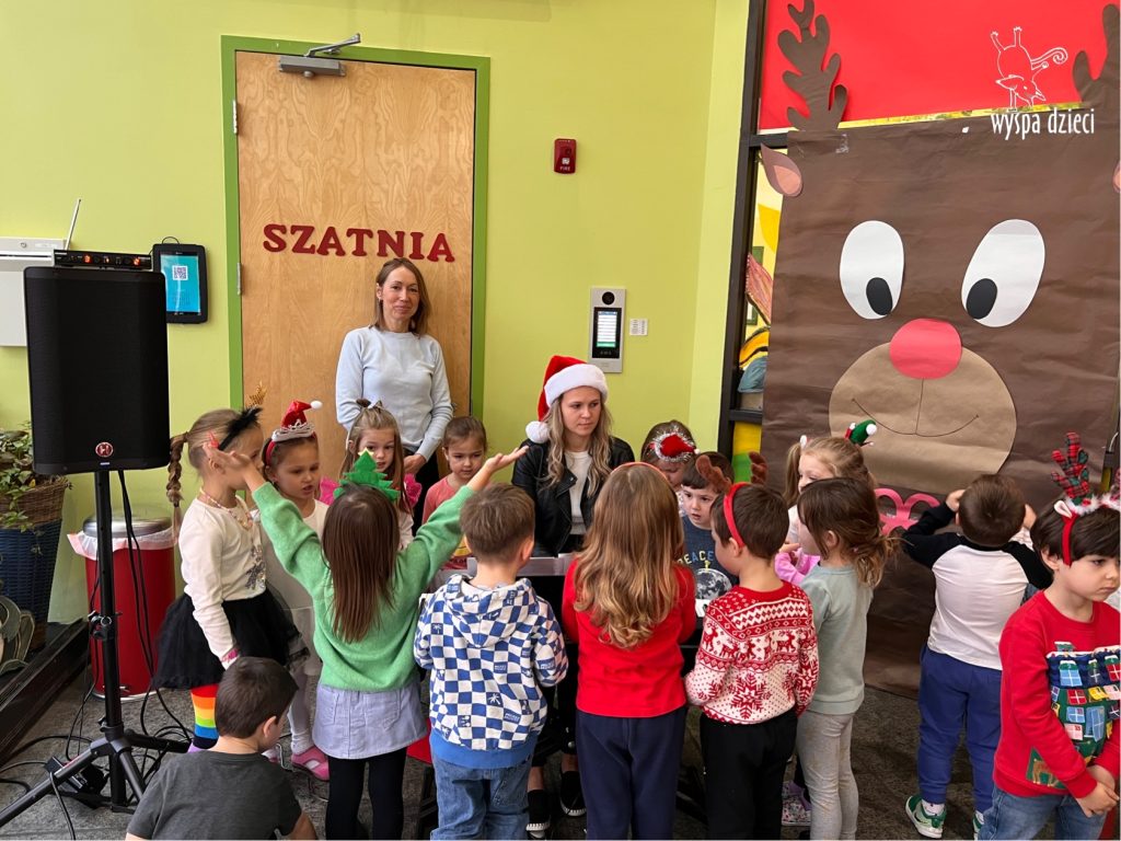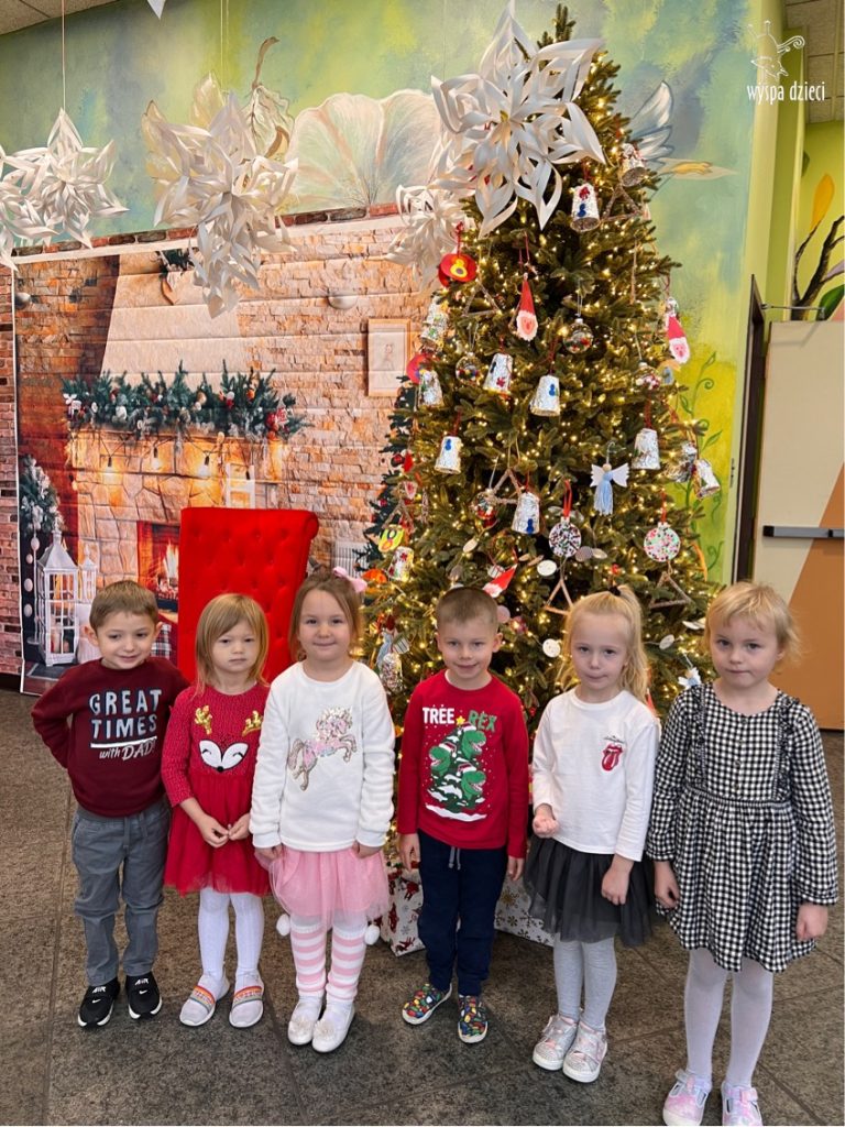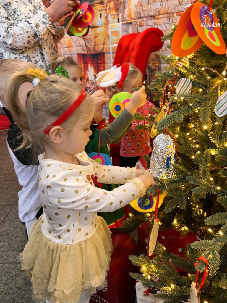 Osiem naszych grup Wyspy Dzieci spotkało się o godzinie 10:30 rano w głównym korytarzu. Pani Ewa z grupy Wynalazców bardzo ciekawie opowiedziała o choince, jakie wartości są najważniejsze w święta ( miłość, pomaganie itp). Nagle nasza choinka rozświetliła się tysiącem jasnych światełek, a Pani Paulinka przepięknie przygrywała świątecznie na pianinie. . Każda grupa, osobno podchodząc do naszej choinki wieszała ozdoby które wcześniej przygotowali wspólnie ze swoimi nauczycielami na zajęciach . Nasza choinka z każdej sekundy wyglądała coraz piękniej. Jak już powiesiliśmy wszystkie ozdoby, wtedy nastąpił czas na wspólne kolędowanie. Wszyscy razem zaśpiewaliśmy kolede „Przybieżeli do Betlejem”.