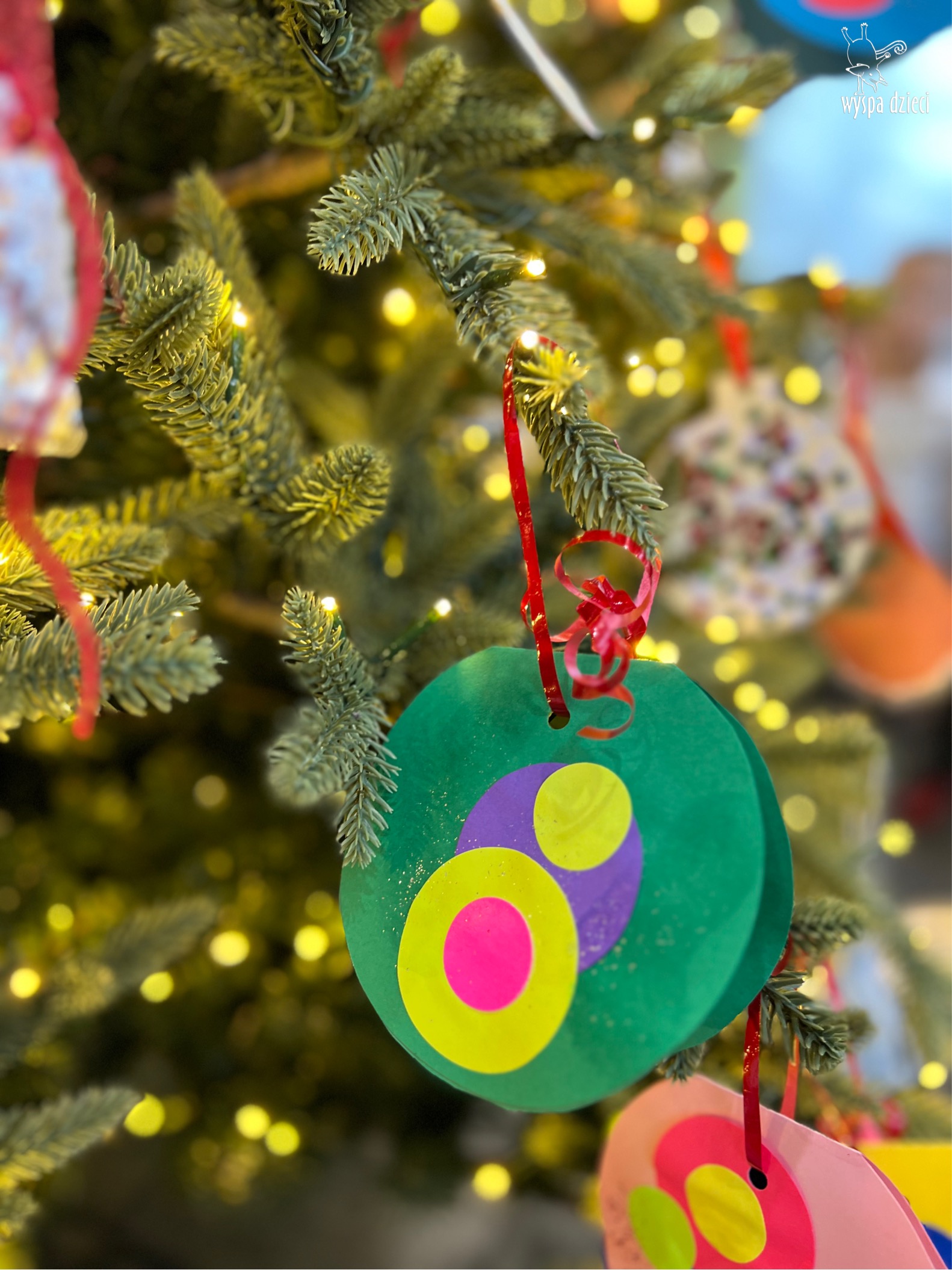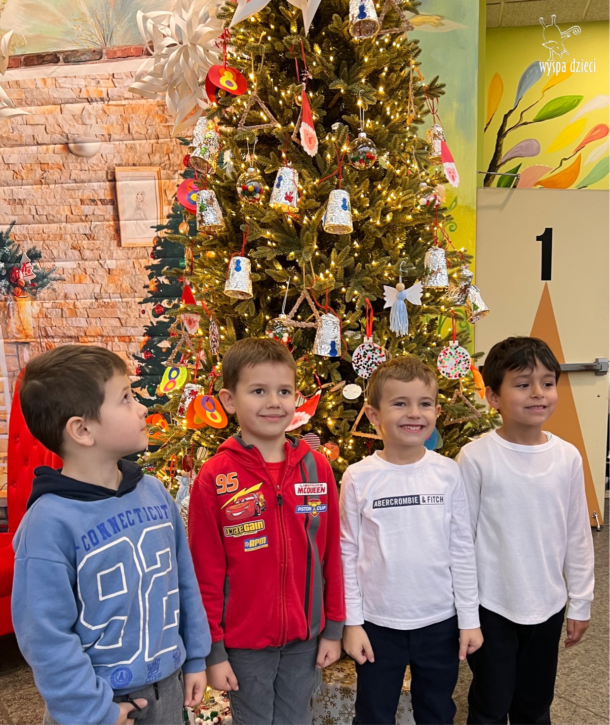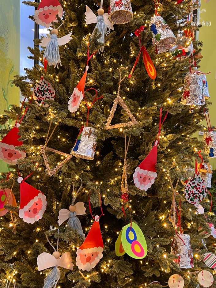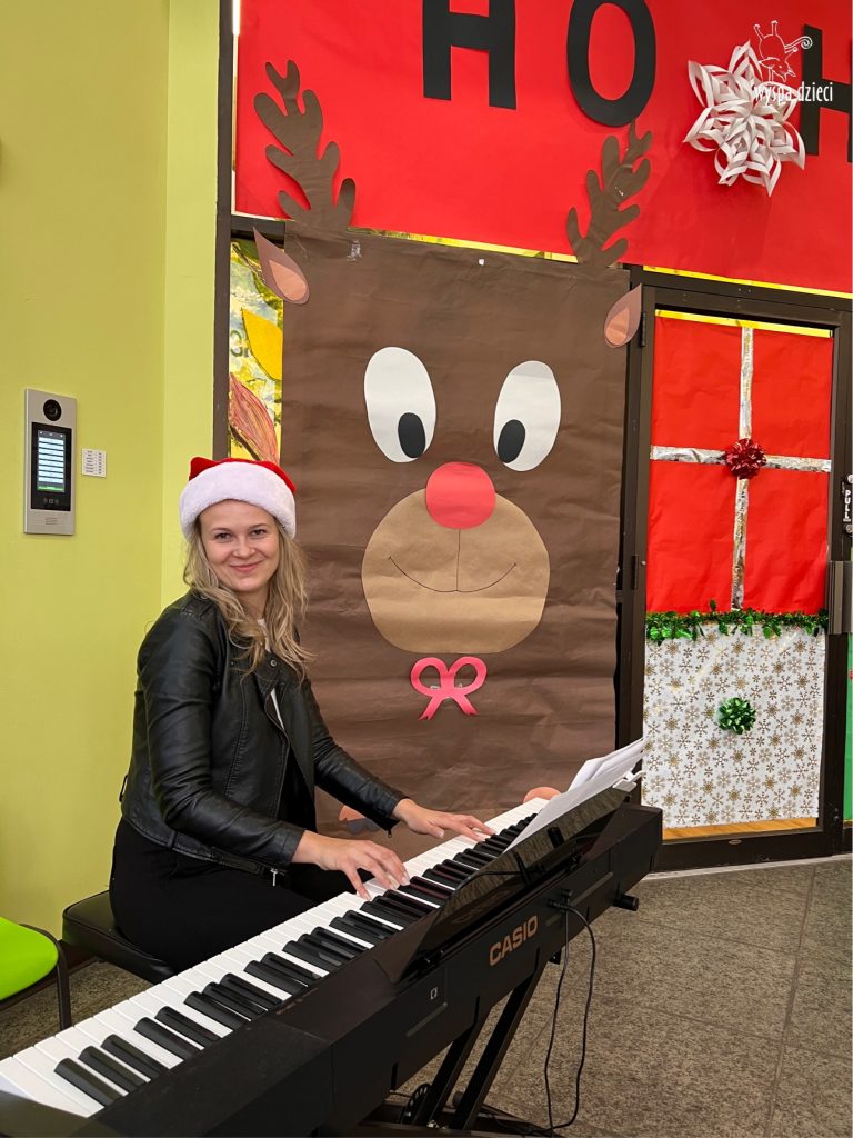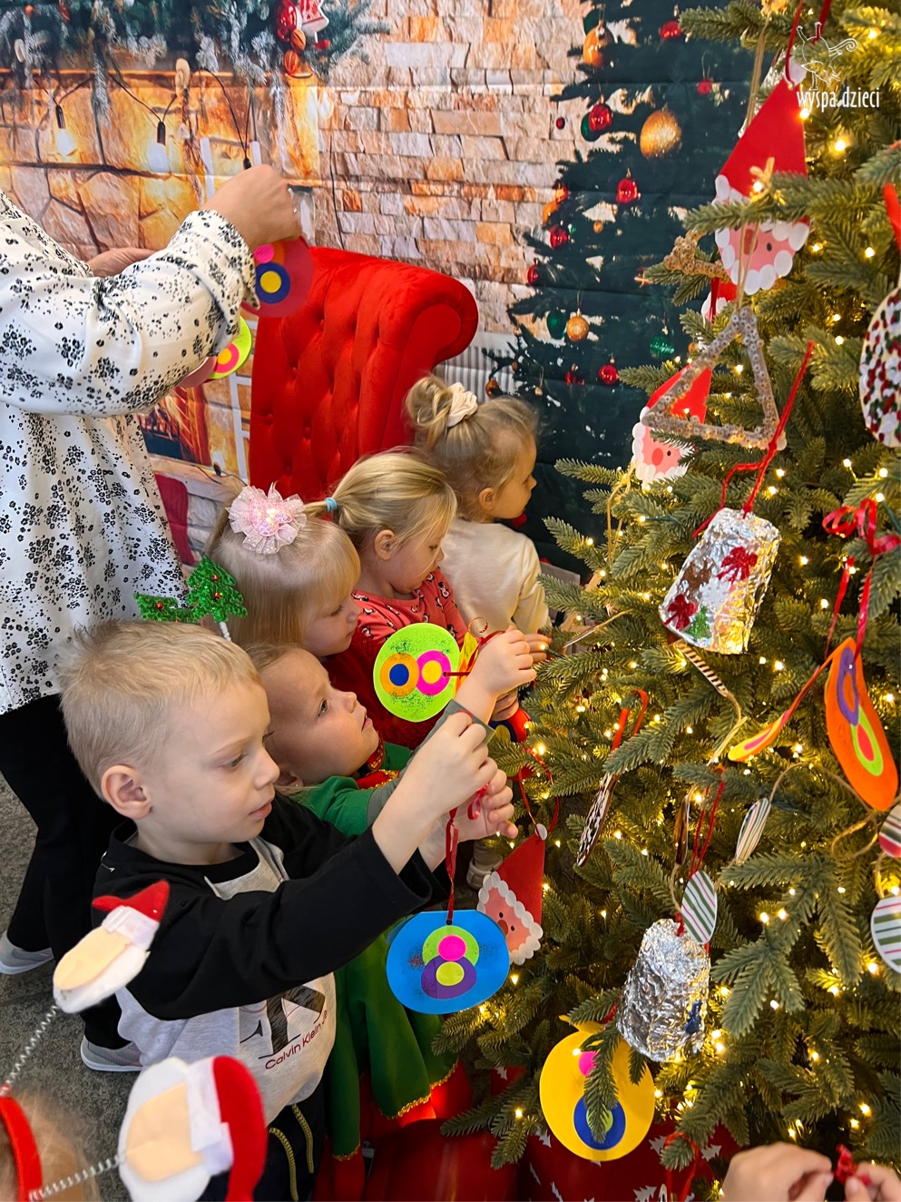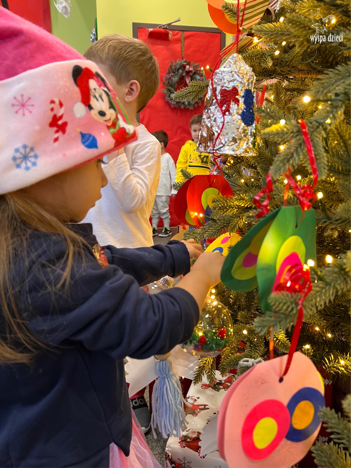 Osiem naszych grup Wyspy Dzieci spotkało się o godzinie 10:30 rano w głównym korytarzu. Pani Ewa z grupy Wynalazców bardzo ciekawie opowiedziała o choince, jakie wartości są najważniejsze w święta ( miłość, pomaganie itp). Nagle nasza choinka rozświetliła się tysiącem jasnych światełek, a Pani Paulinka przepięknie przygrywała świątecznie na pianinie. . Każda grupa, osobno podchodząc do naszej choinki wieszała ozdoby które wcześniej przygotowali wspólnie ze swoimi nauczycielami na zajęciach . Nasza choinka z każdej sekundy wyglądała coraz piękniej. Jak już powiesiliśmy wszystkie ozdoby, wtedy nastąpił czas na wspólne kolędowanie. Wszyscy razem zaśpiewaliśmy kolede „Przybieżeli do Betlejem”.