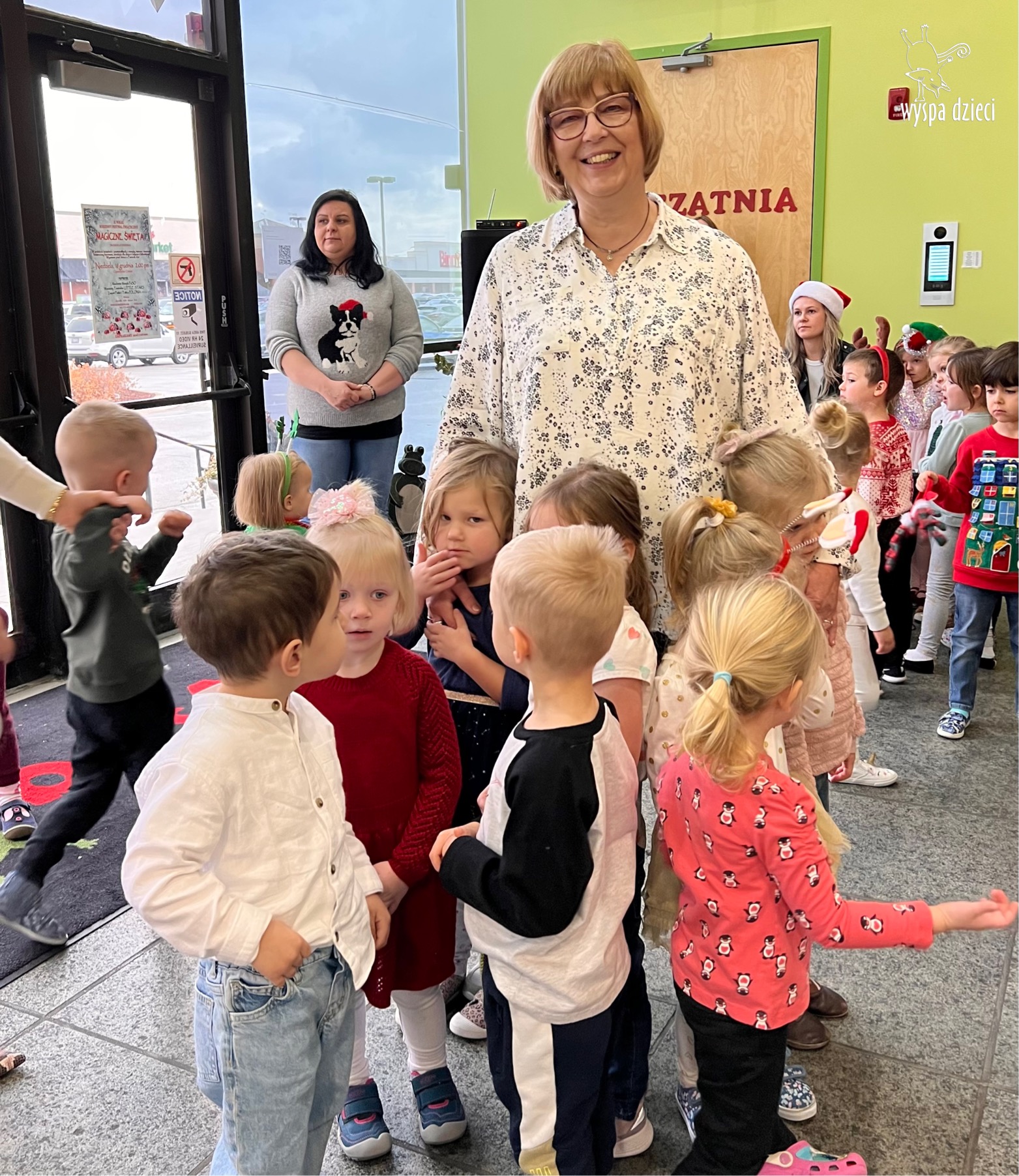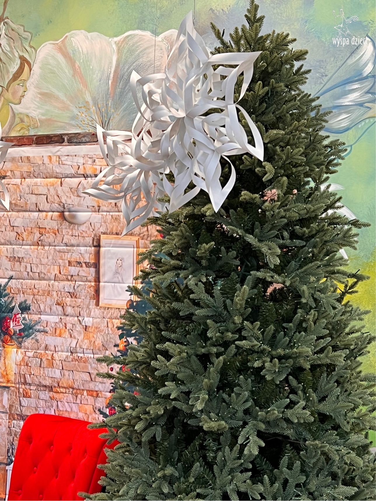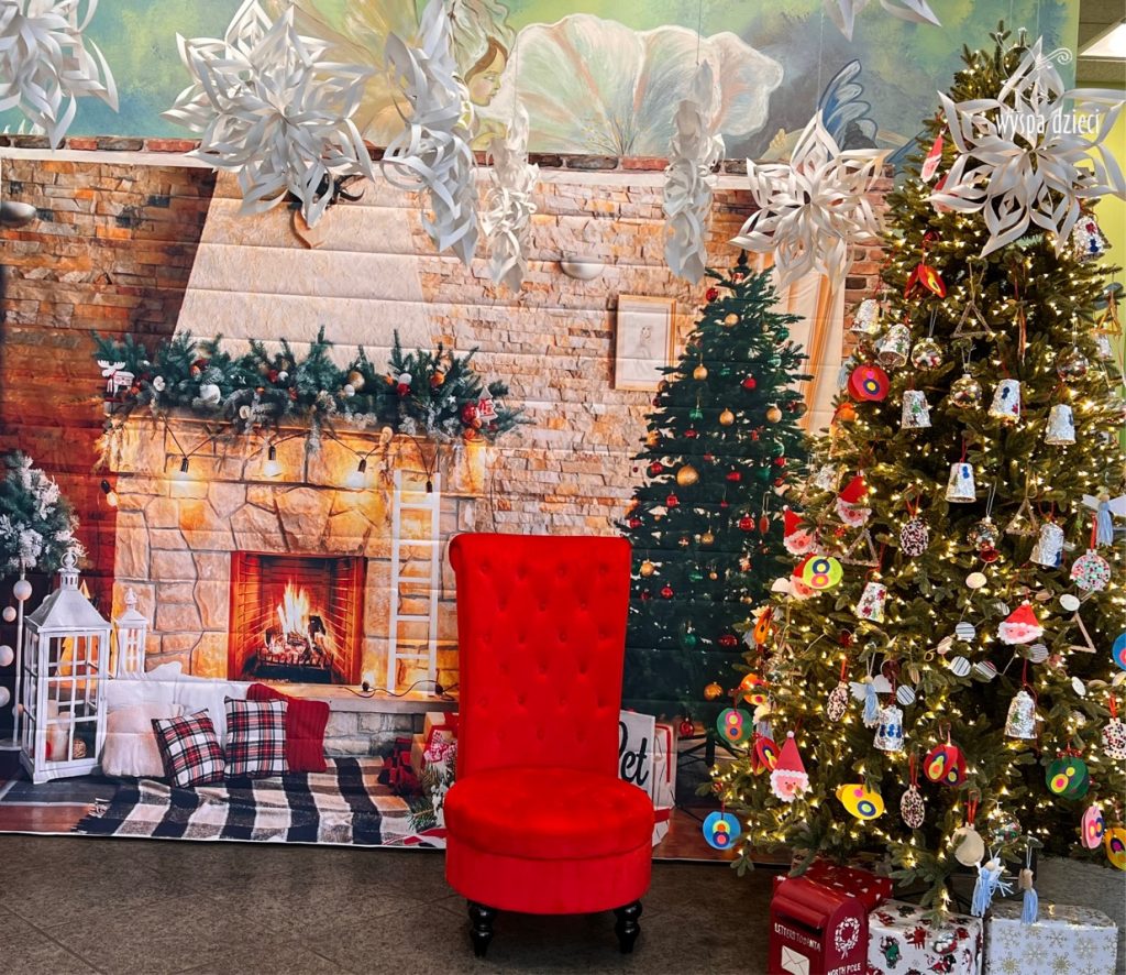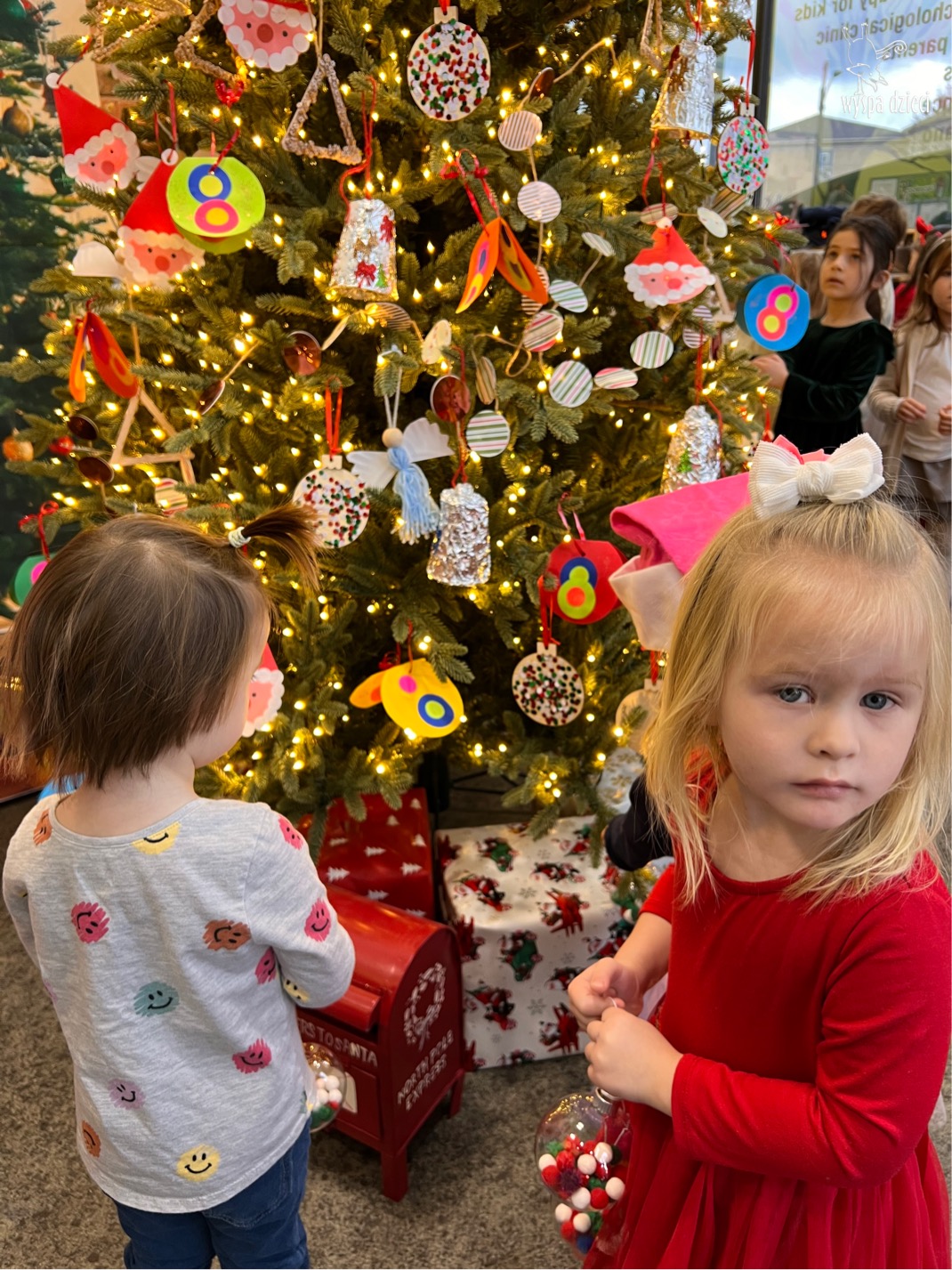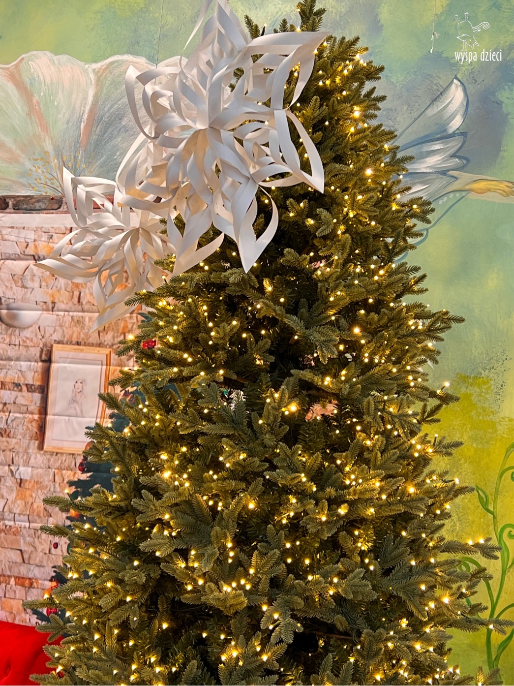 Osiem naszych grup Wyspy Dzieci spotkało się o godzinie 10:30 rano w głównym korytarzu. Pani Ewa z grupy Wynalazców bardzo ciekawie opowiedziała o choince, jakie wartości są najważniejsze w święta ( miłość, pomaganie itp). Nagle nasza choinka rozświetliła się tysiącem jasnych światełek, a Pani Paulinka przepięknie przygrywała świątecznie na pianinie. . Każda grupa, osobno podchodząc do naszej choinki wieszała ozdoby które wcześniej przygotowali wspólnie ze swoimi nauczycielami na zajęciach . Nasza choinka z każdej sekundy wyglądała coraz piękniej. Jak już powiesiliśmy wszystkie ozdoby, wtedy nastąpił czas na wspólne kolędowanie. Wszyscy razem zaśpiewaliśmy kolede „Przybieżeli do Betlejem”.