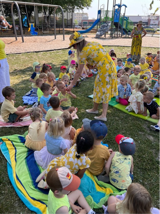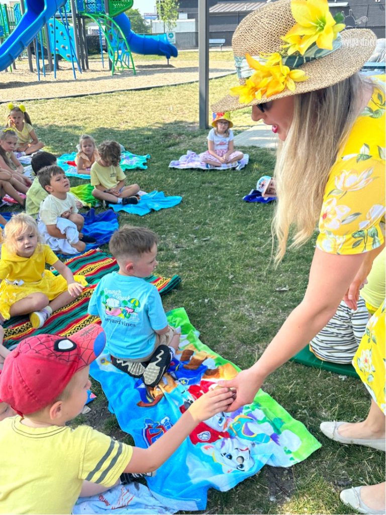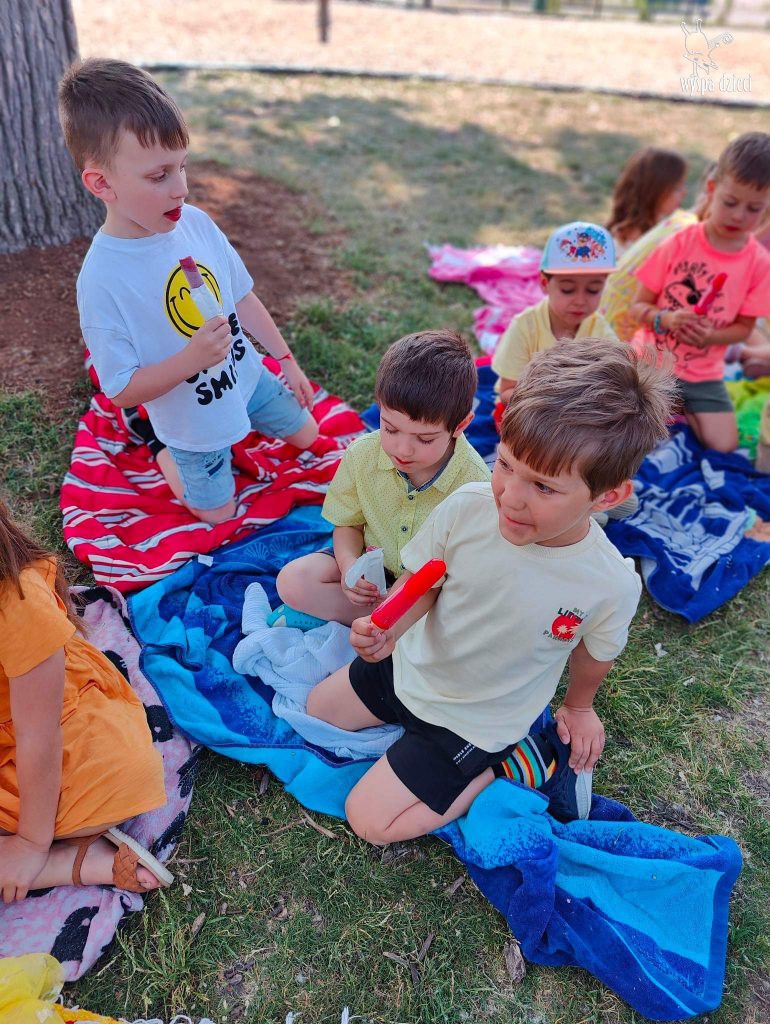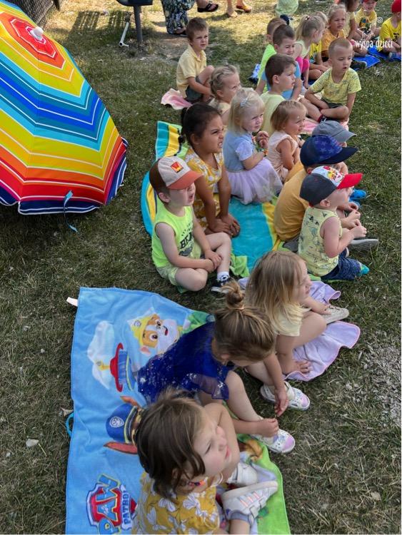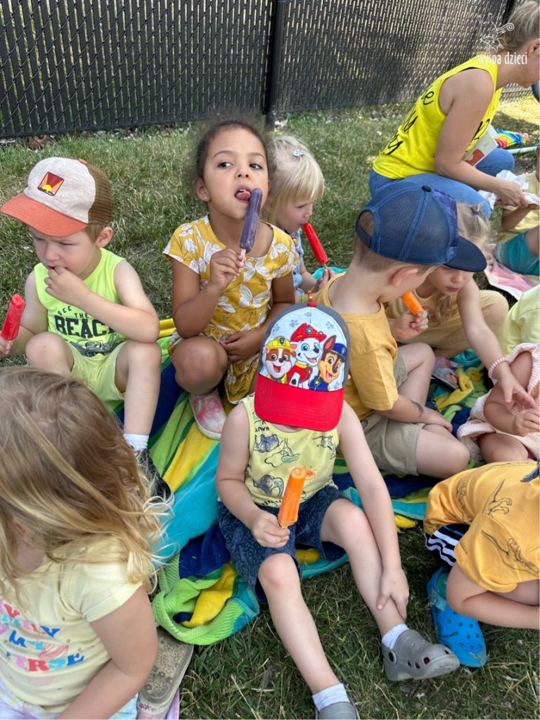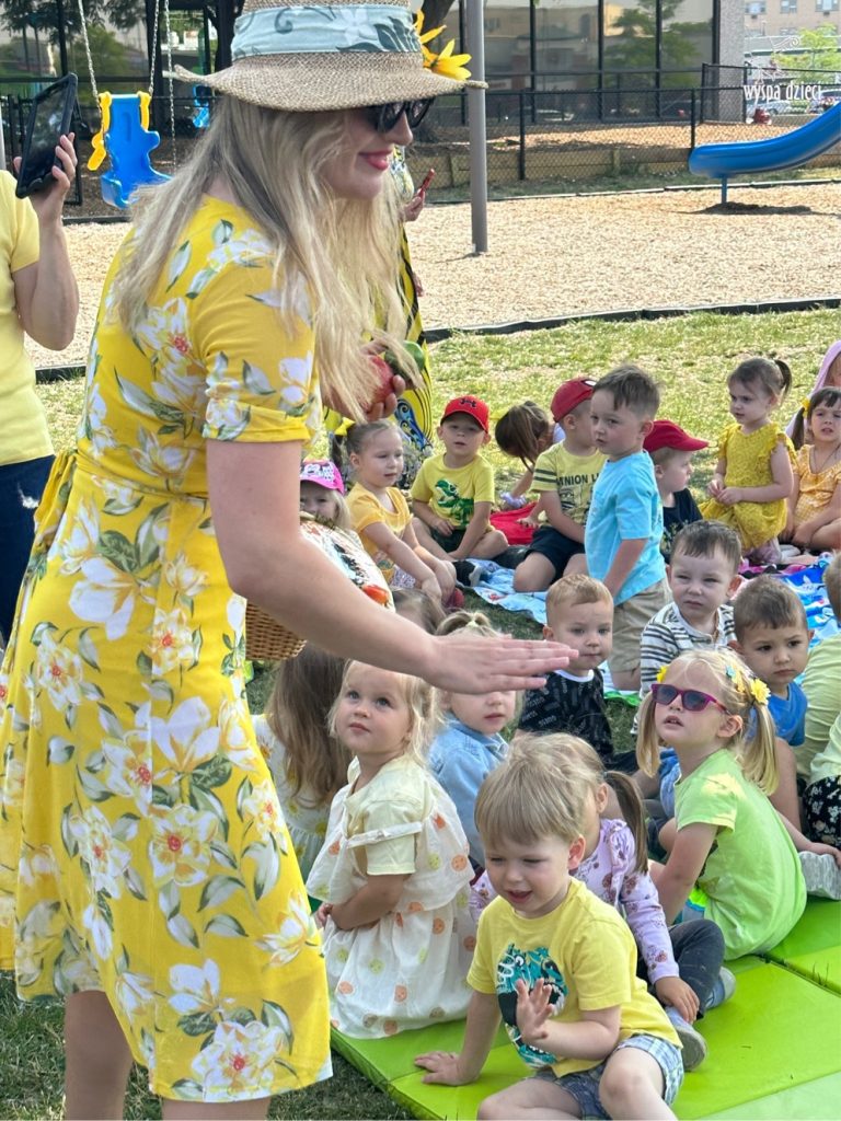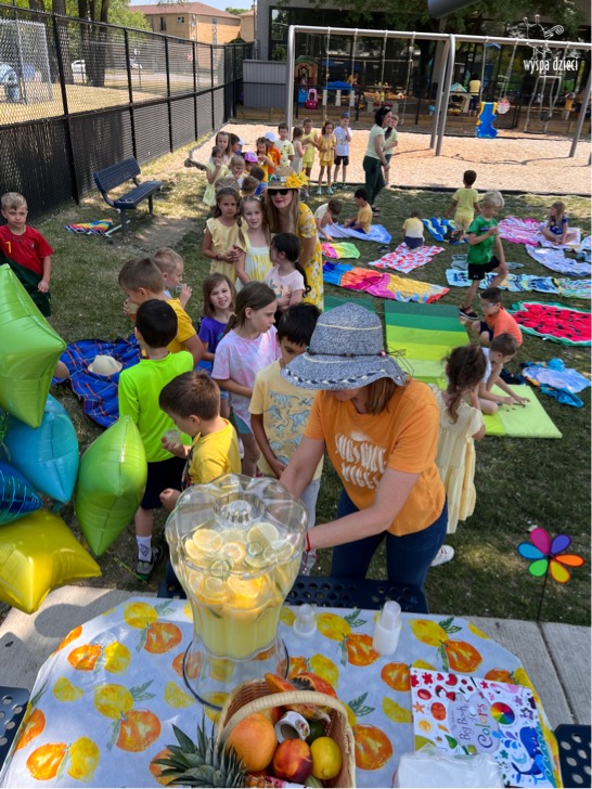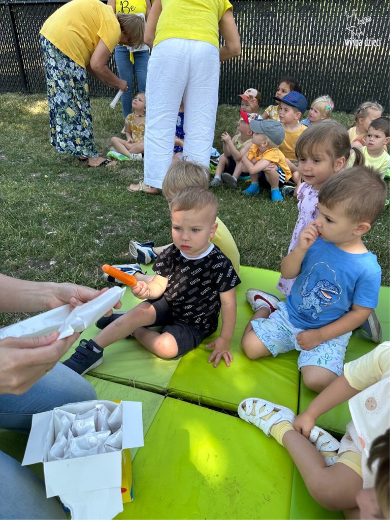 Od rana 21 czerwca wszystkie dzieci wraz z nauczycielami oczekiwały na Panią Lato. Pani lato przyniosła nam piękny uśmiech, dużo słońca i kosz pełen letnich darów. Wspólnie rozmawialiśmy o letnich, wakacyjnych przygodach. Wszyscy razem spędziliśmy miło czas odgadując ciekawe zagadki które przygotowała dla nas Pani Lato. Na koniec piliśmy orzeźwiająca lemoniadę i zajadaliśmy się  pysznymi lodami.