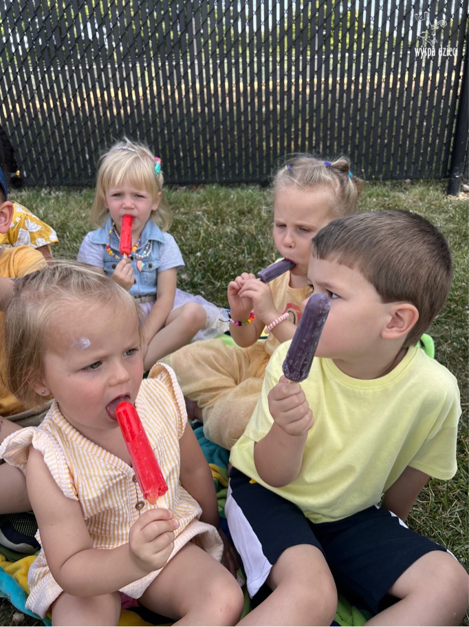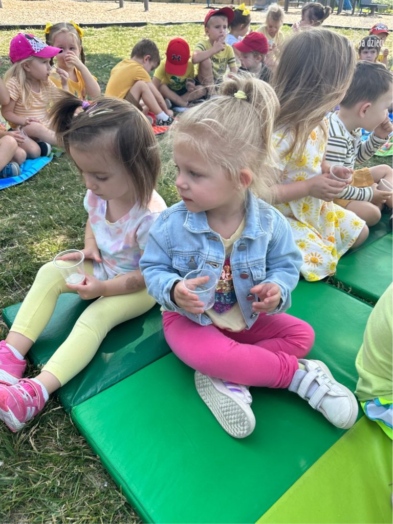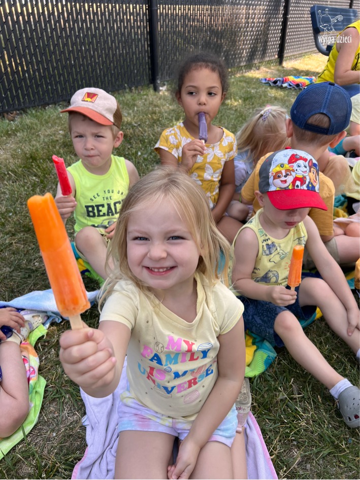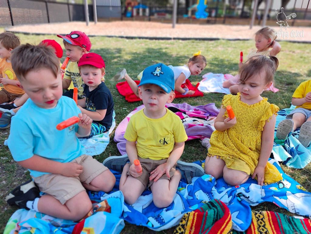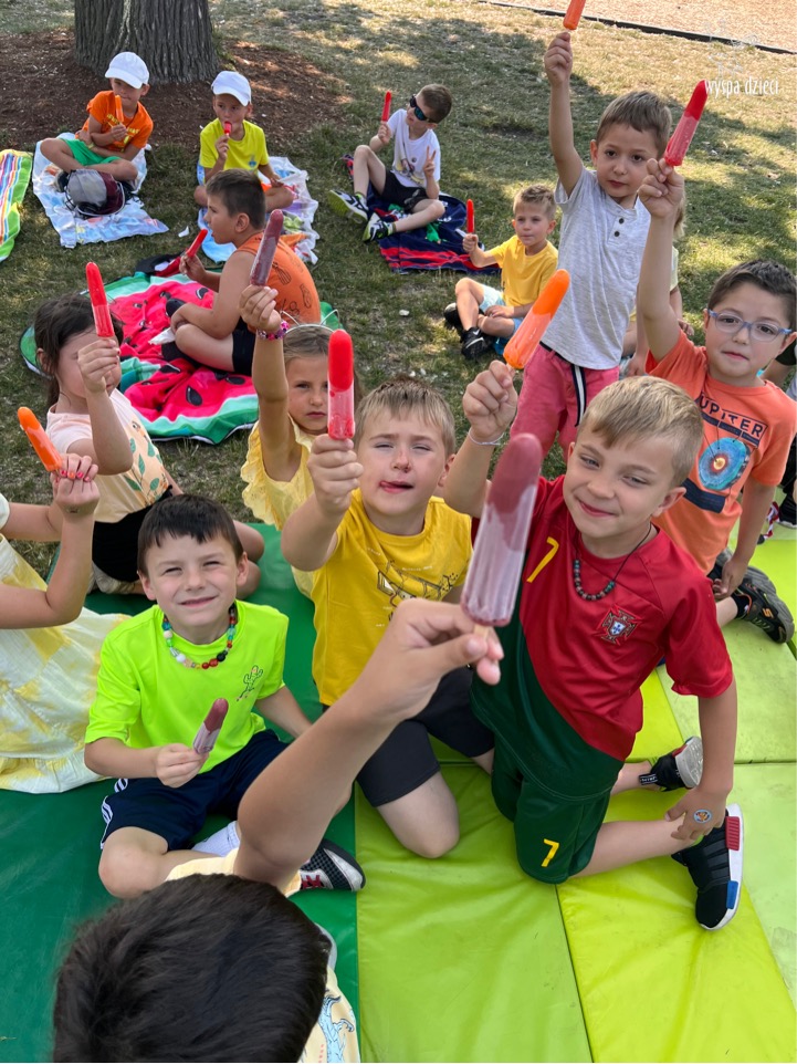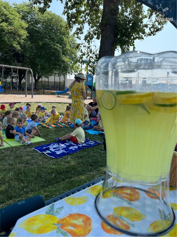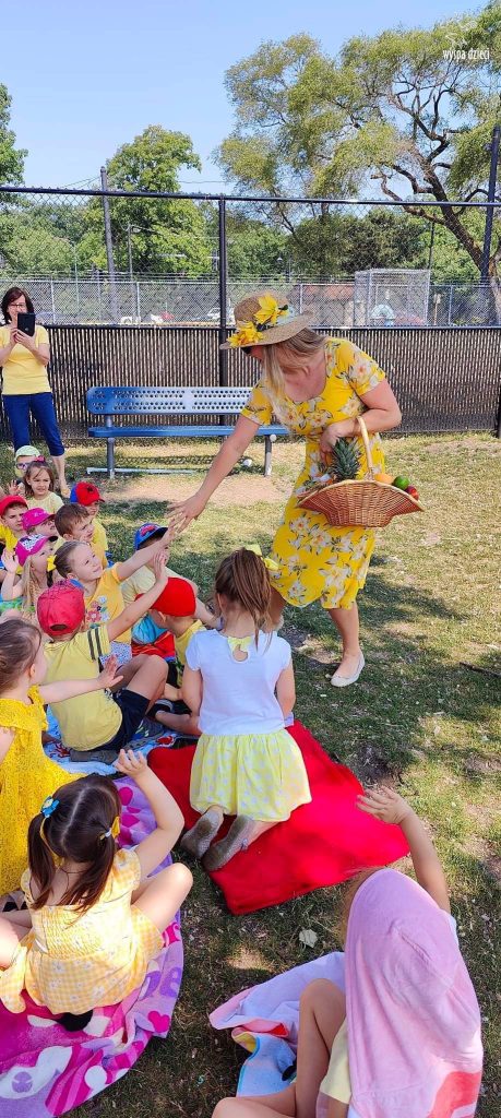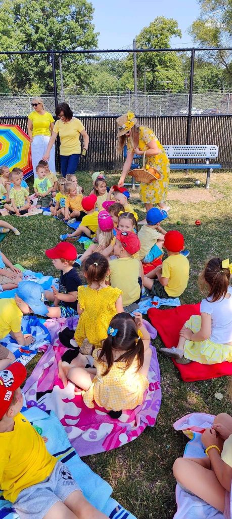 Od rana 21 czerwca wszystkie dzieci wraz z nauczycielami oczekiwały na Panią Lato. Pani lato przyniosła nam piękny uśmiech, dużo słońca i kosz pełen letnich darów. Wspólnie rozmawialiśmy o letnich, wakacyjnych przygodach. Wszyscy razem spędziliśmy miło czas odgadując ciekawe zagadki które przygotowała dla nas Pani Lato. Na koniec piliśmy orzeźwiająca lemoniadę i zajadaliśmy się  pysznymi lodami.