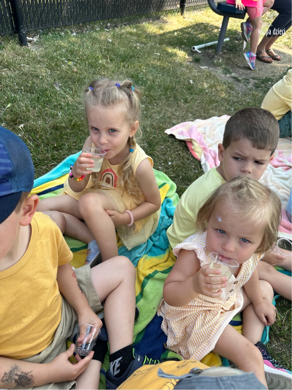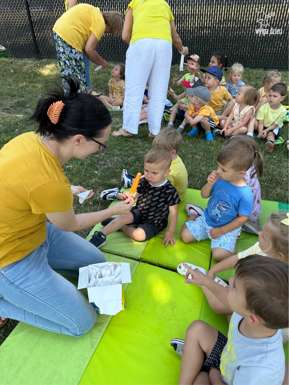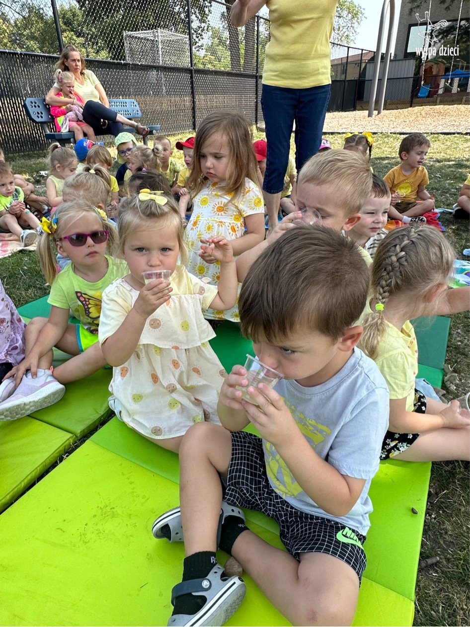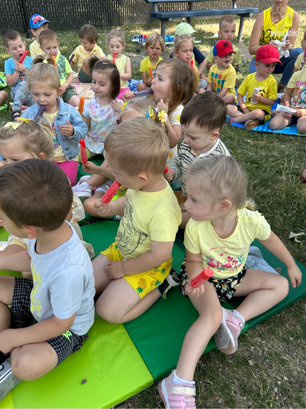 Od rana 21 czerwca wszystkie dzieci wraz z nauczycielami oczekiwały na Panią Lato. Pani lato przyniosła nam piękny uśmiech, dużo słońca i kosz pełen letnich darów. Wspólnie rozmawialiśmy o letnich, wakacyjnych przygodach. Wszyscy razem spędziliśmy miło czas odgadując ciekawe zagadki które przygotowała dla nas Pani Lato. Na koniec piliśmy orzeźwiająca lemoniadę i zajadaliśmy się  pysznymi lodami.
