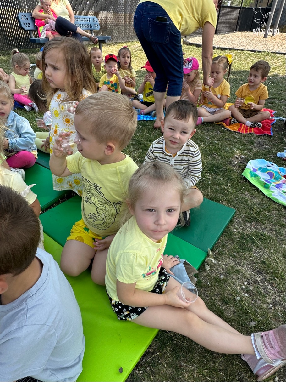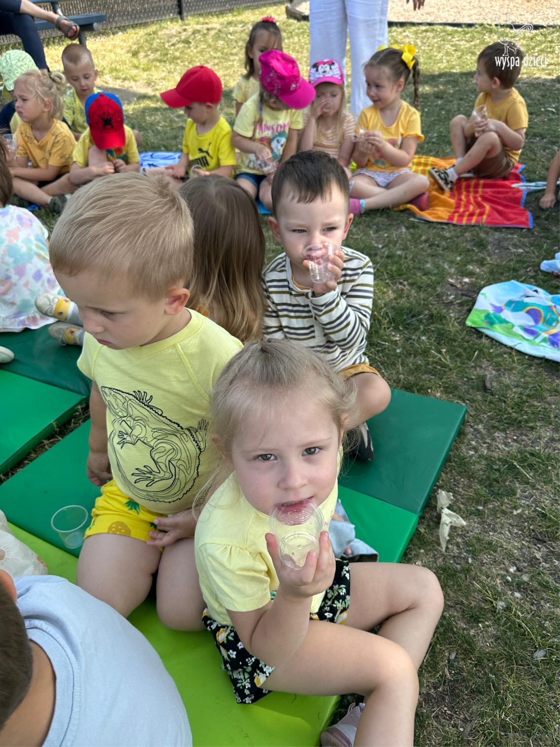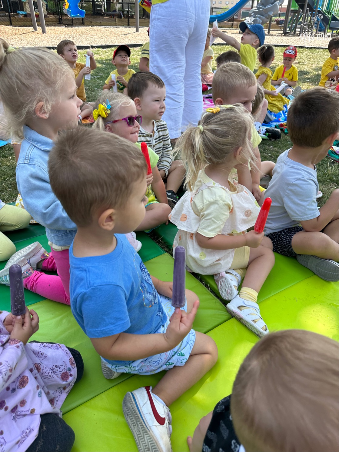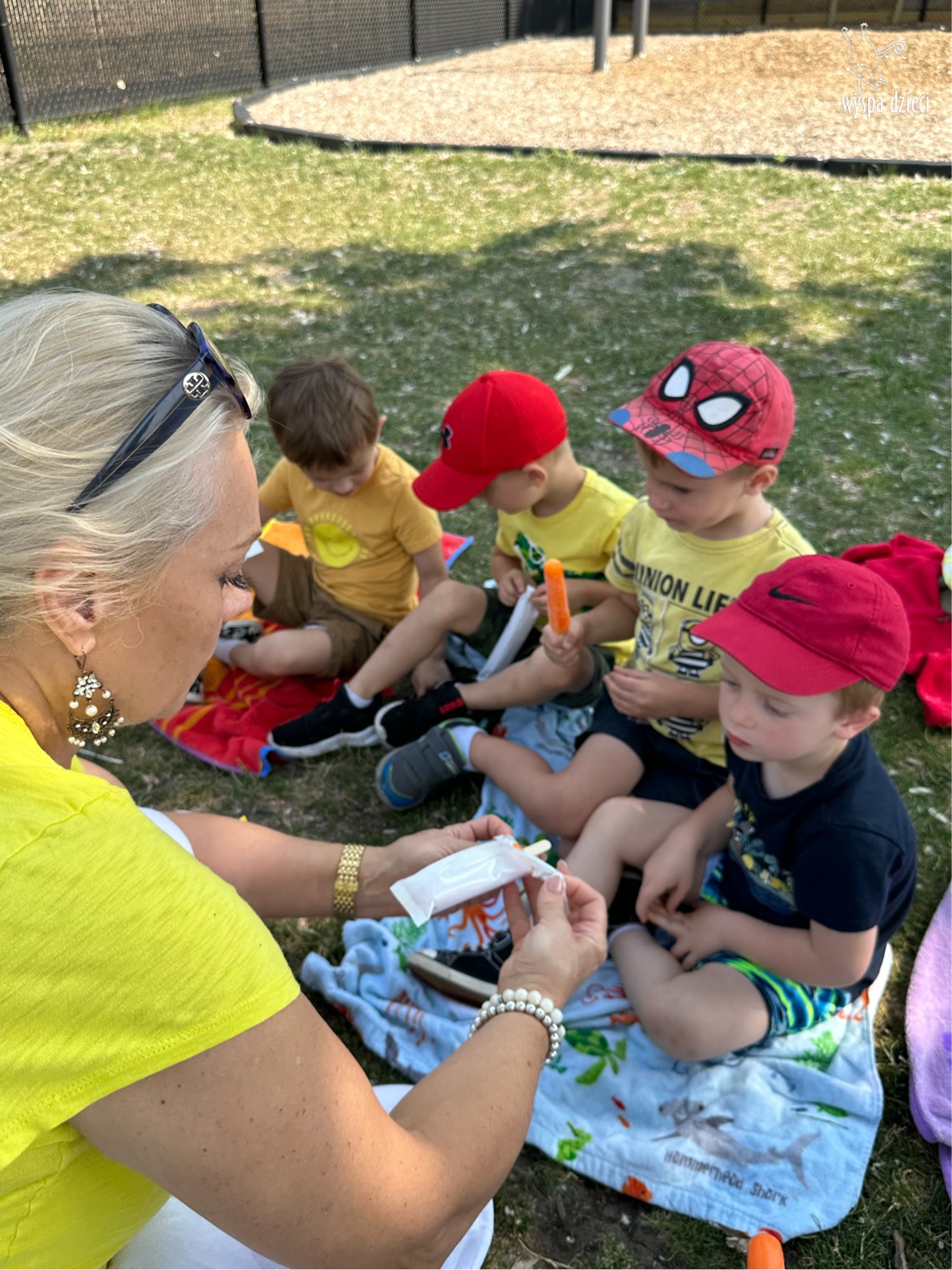 Od rana 21 czerwca wszystkie dzieci wraz z nauczycielami oczekiwały na Panią Lato. Pani lato przyniosła nam piękny uśmiech, dużo słońca i kosz pełen letnich darów. Wspólnie rozmawialiśmy o letnich, wakacyjnych przygodach. Wszyscy razem spędziliśmy miło czas odgadując ciekawe zagadki które przygotowała dla nas Pani Lato. Na koniec piliśmy orzeźwiająca lemoniadę i zajadaliśmy się  pysznymi lodami.