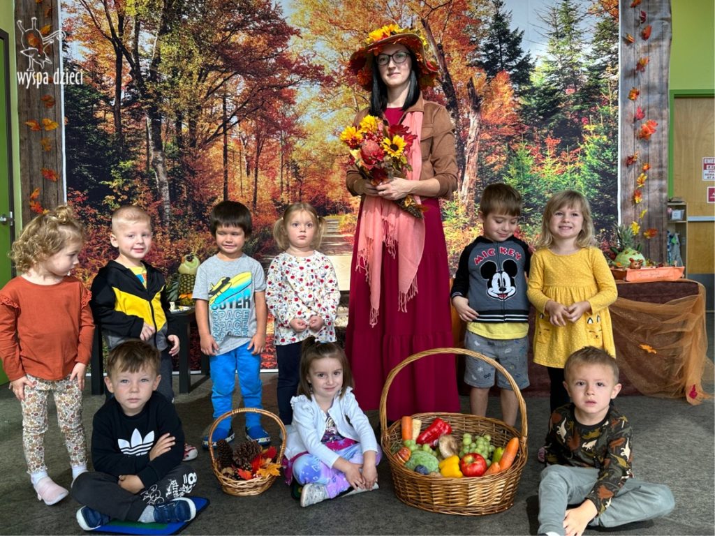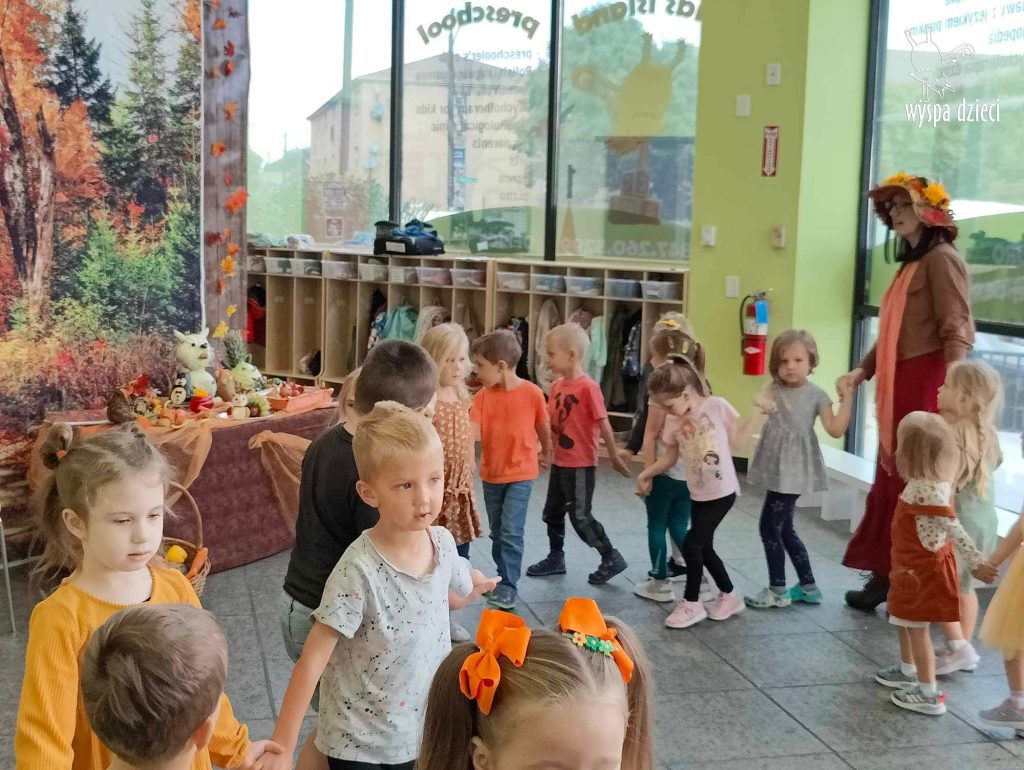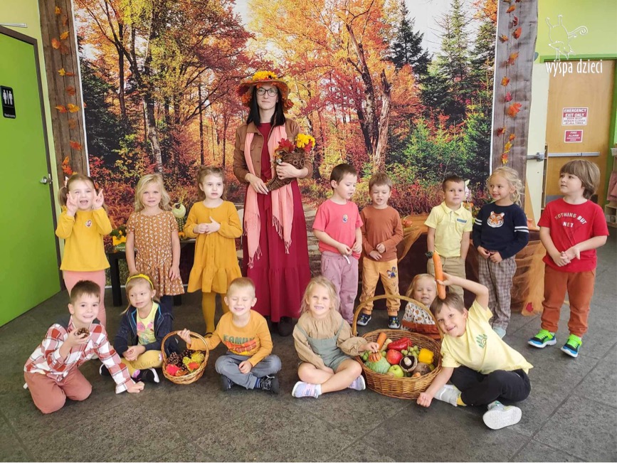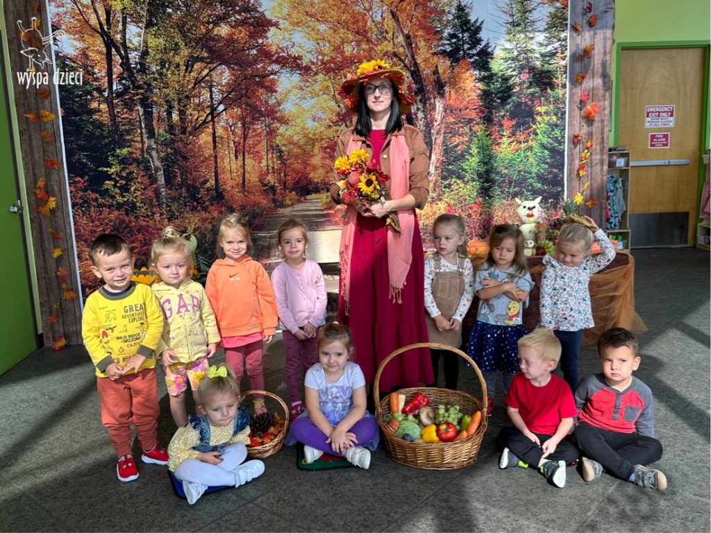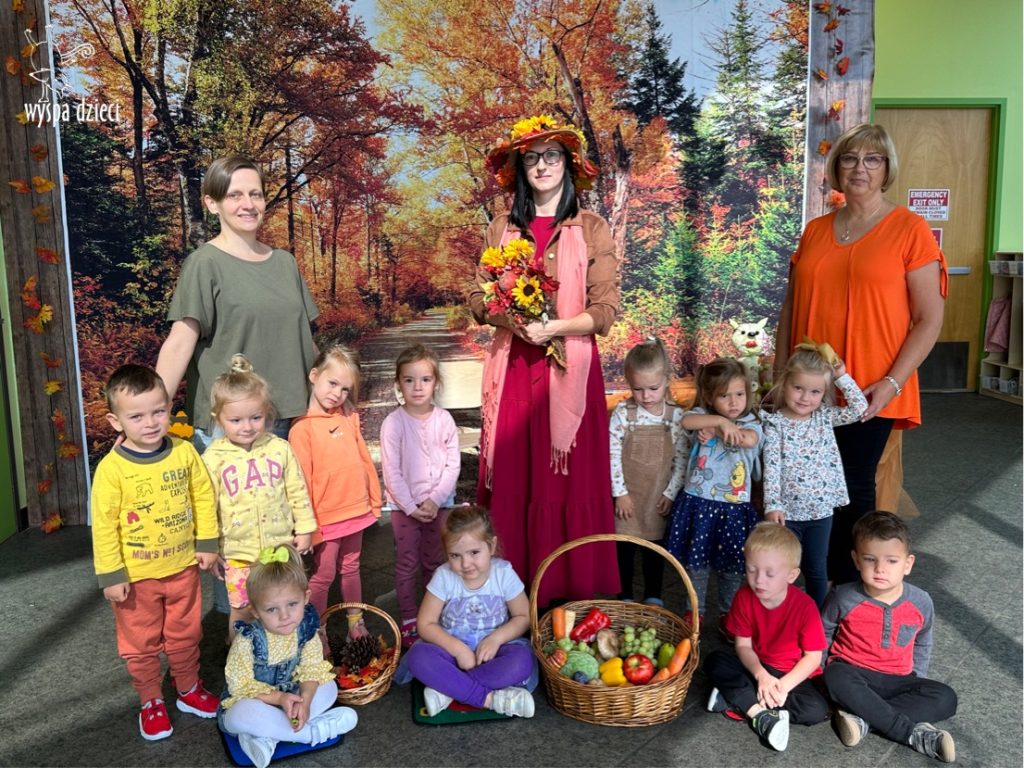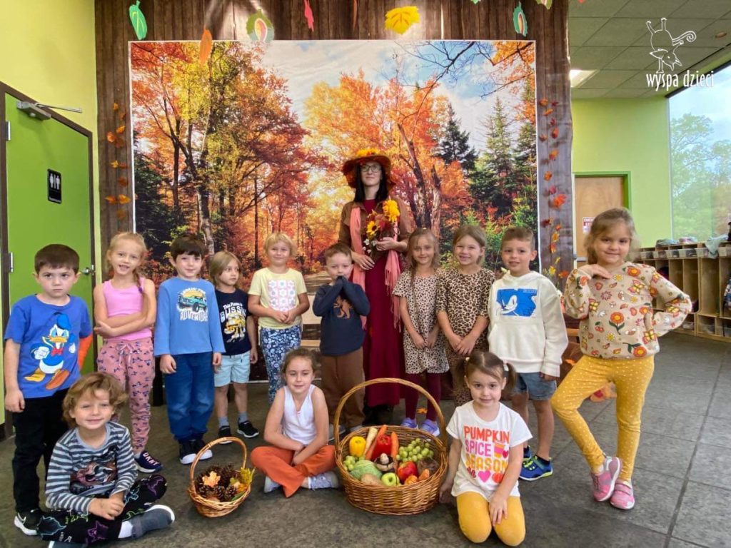 O tym, że mamy już jesień przekonały się nasze przedszkolaki wraz z nauczycielami z Wyspy Dzieci w River Grove . W dniu 25 września zapukała do naszych drzwi piękna, barwna Pani Jesień. Na głowie miała wspaniały kapelusz z liści, a w dłoni bardzo ciężki kosz z darami. Pani Jesień sprawdziła, czy nasze przedszkolaki rozpoznają warzywa, owoce, a także leśne dary. Razem z Panią Jesienią zaśpiewaliśmy „Jesienną Piosenkę” oraz wspólnie zatańczylismy.  Celem naszych zajęć w tym dniu było utrwalenie wiadomości o porze roku- Jesieni, jak również rozpoznawanie jej charakterystycznych cech . Podczas wizyty Pani Jesieni  przedszkolaki przypomniały i utrwaliły wiadomości o aspekcie przyrodniczym, m.in. dlaczego jesienią  liście zmieniają kolor, czy dary jesieni są potrzebne tylko ludziom.  Na te i wiele innych pytań dzieci odpowiadały bez wahania. W tym dniu podczas zajęc plastycznych dzieci wykonywały pomysłowe prace o tematyce jesiennej.