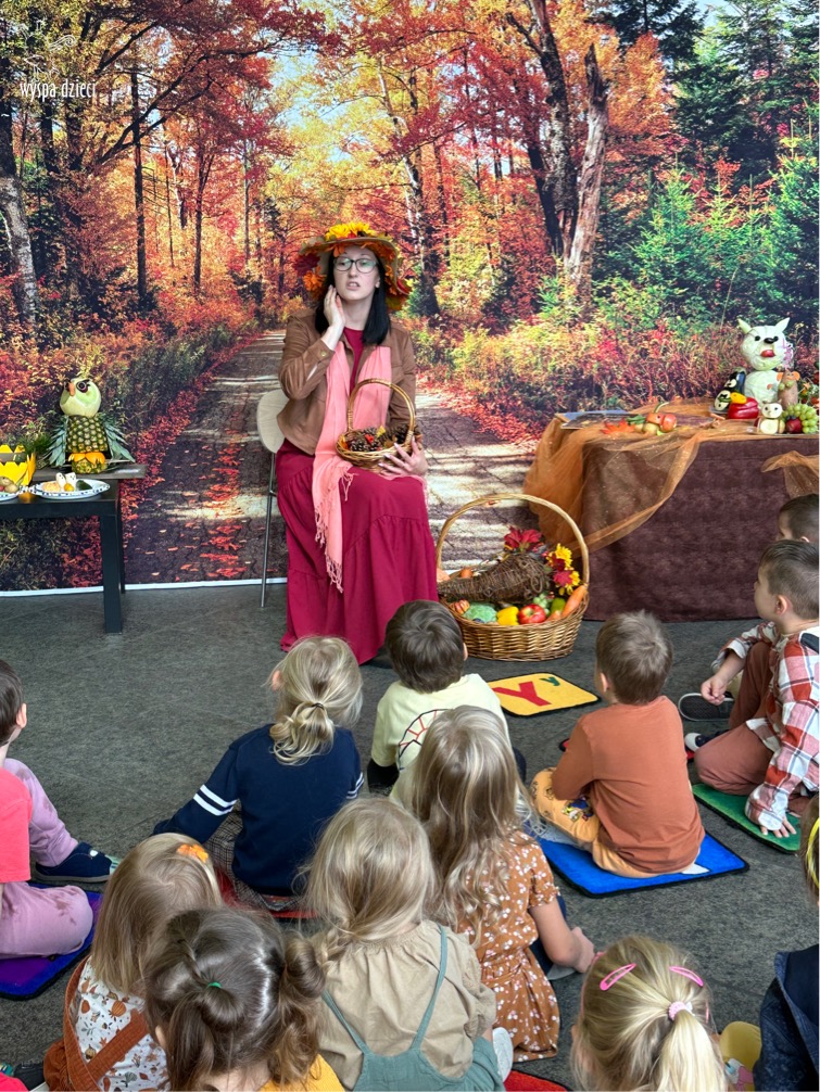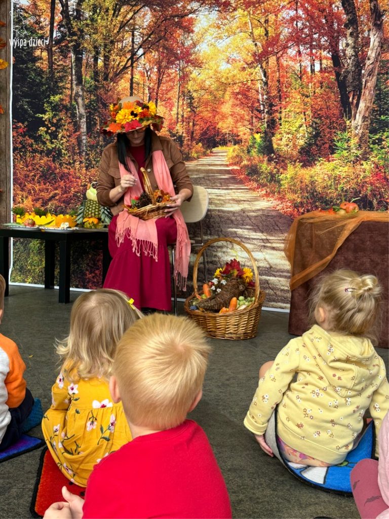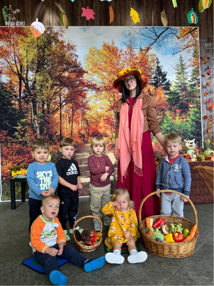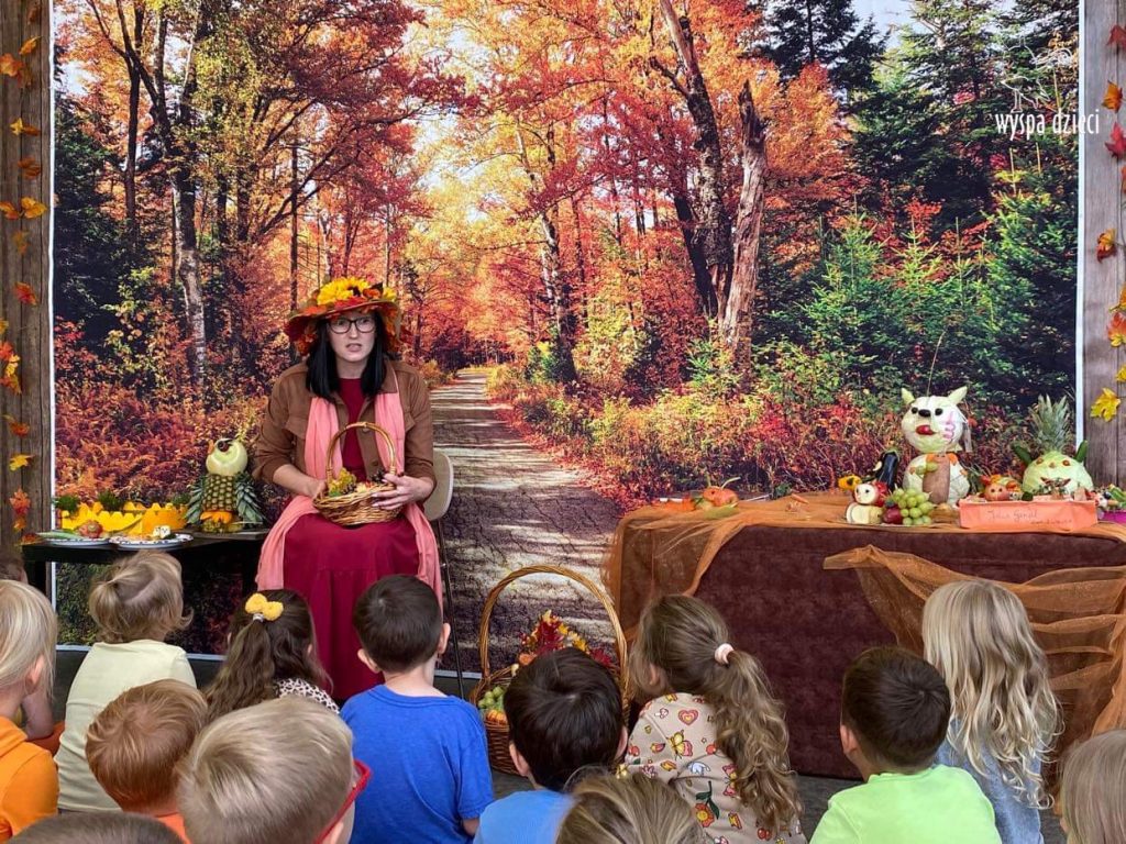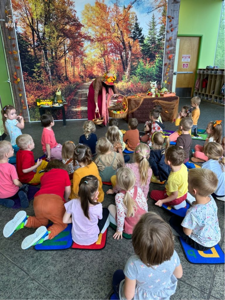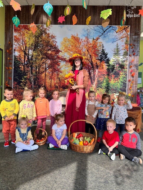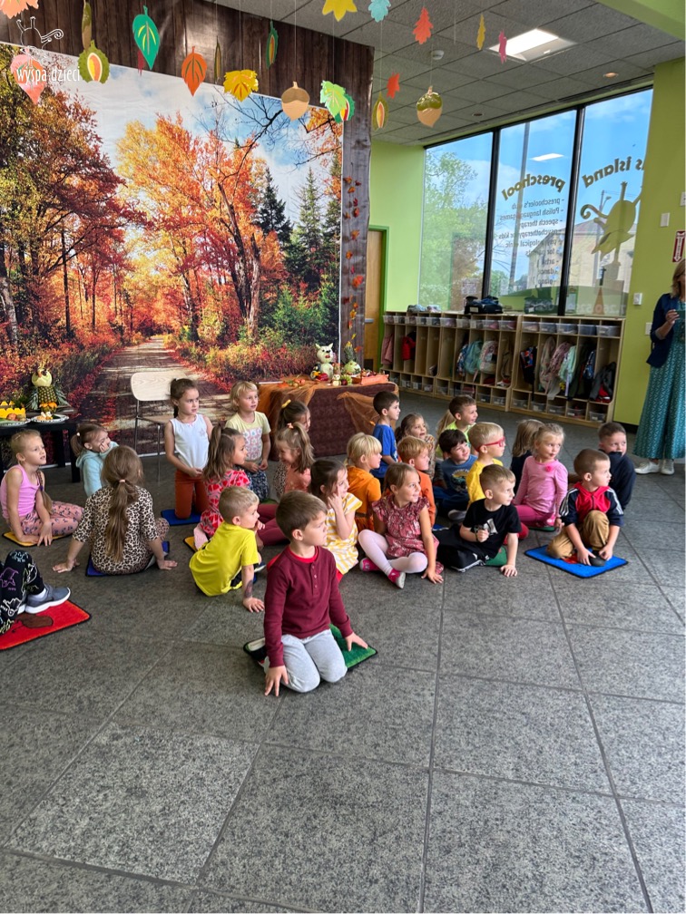 O tym, że mamy już jesień przekonały się nasze przedszkolaki wraz z nauczycielami z Wyspy Dzieci w River Grove . W dniu 25 września zapukała do naszych drzwi piękna, barwna Pani Jesień. Na głowie miała wspaniały kapelusz z liści, a w dłoni bardzo ciężki kosz z darami. Pani Jesień sprawdziła, czy nasze przedszkolaki rozpoznają warzywa, owoce, a także leśne dary. Razem z Panią Jesienią zaśpiewaliśmy „Jesienną Piosenkę” oraz wspólnie zatańczylismy.  Celem naszych zajęć w tym dniu było utrwalenie wiadomości o porze roku- Jesieni, jak również rozpoznawanie jej charakterystycznych cech . Podczas wizyty Pani Jesieni  przedszkolaki przypomniały i utrwaliły wiadomości o aspekcie przyrodniczym, m.in. dlaczego jesienią  liście zmieniają kolor, czy dary jesieni są potrzebne tylko ludziom.  Na te i wiele innych pytań dzieci odpowiadały bez wahania. W tym dniu podczas zajęc plastycznych dzieci wykonywały pomysłowe prace o tematyce jesiennej.