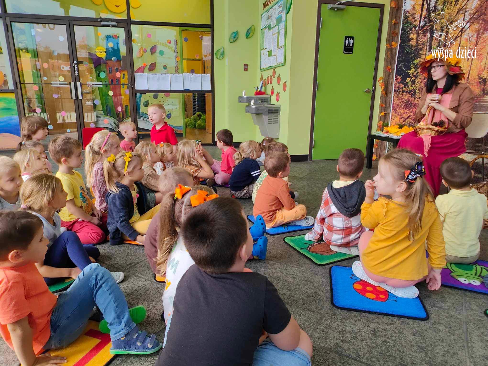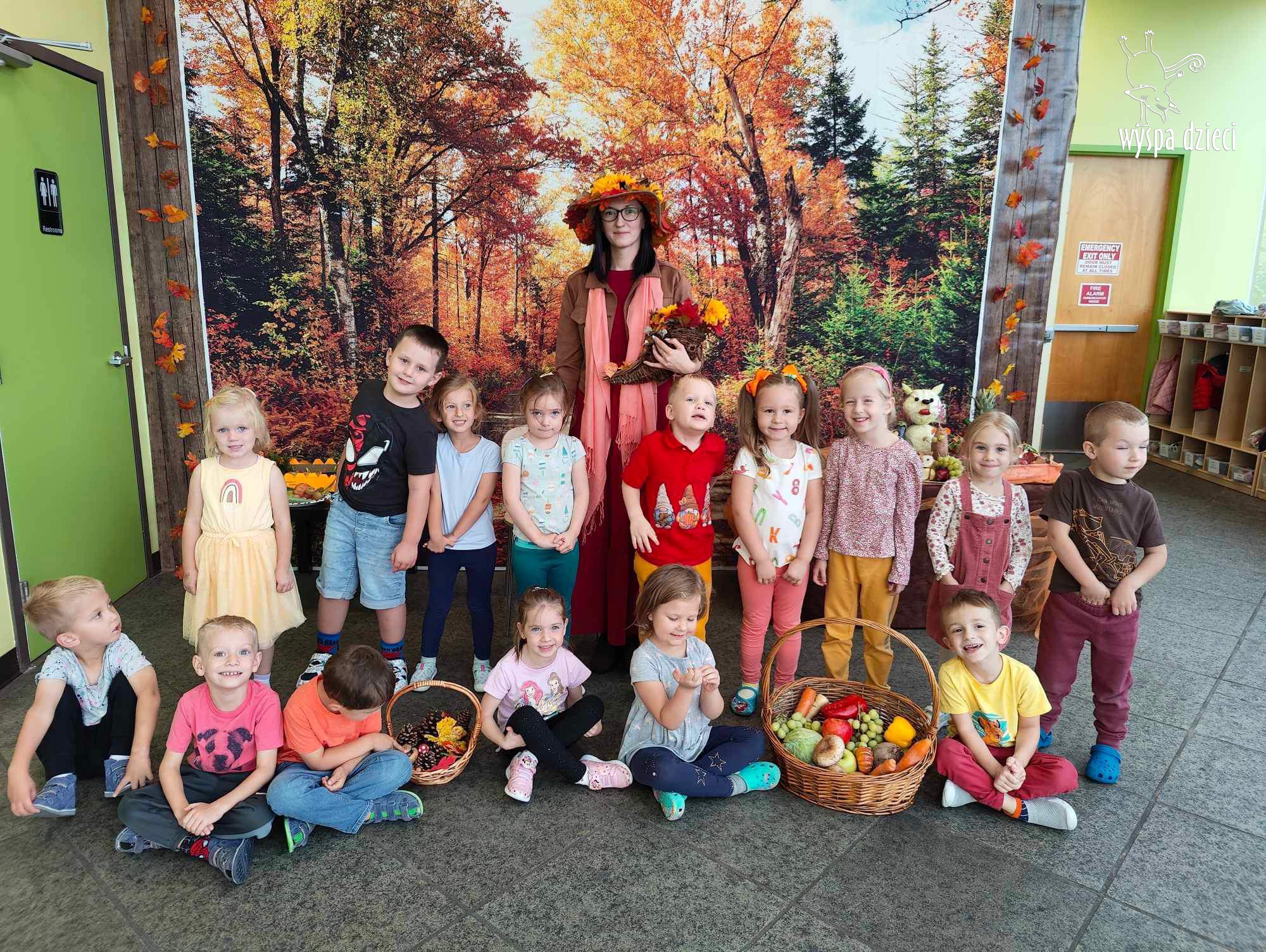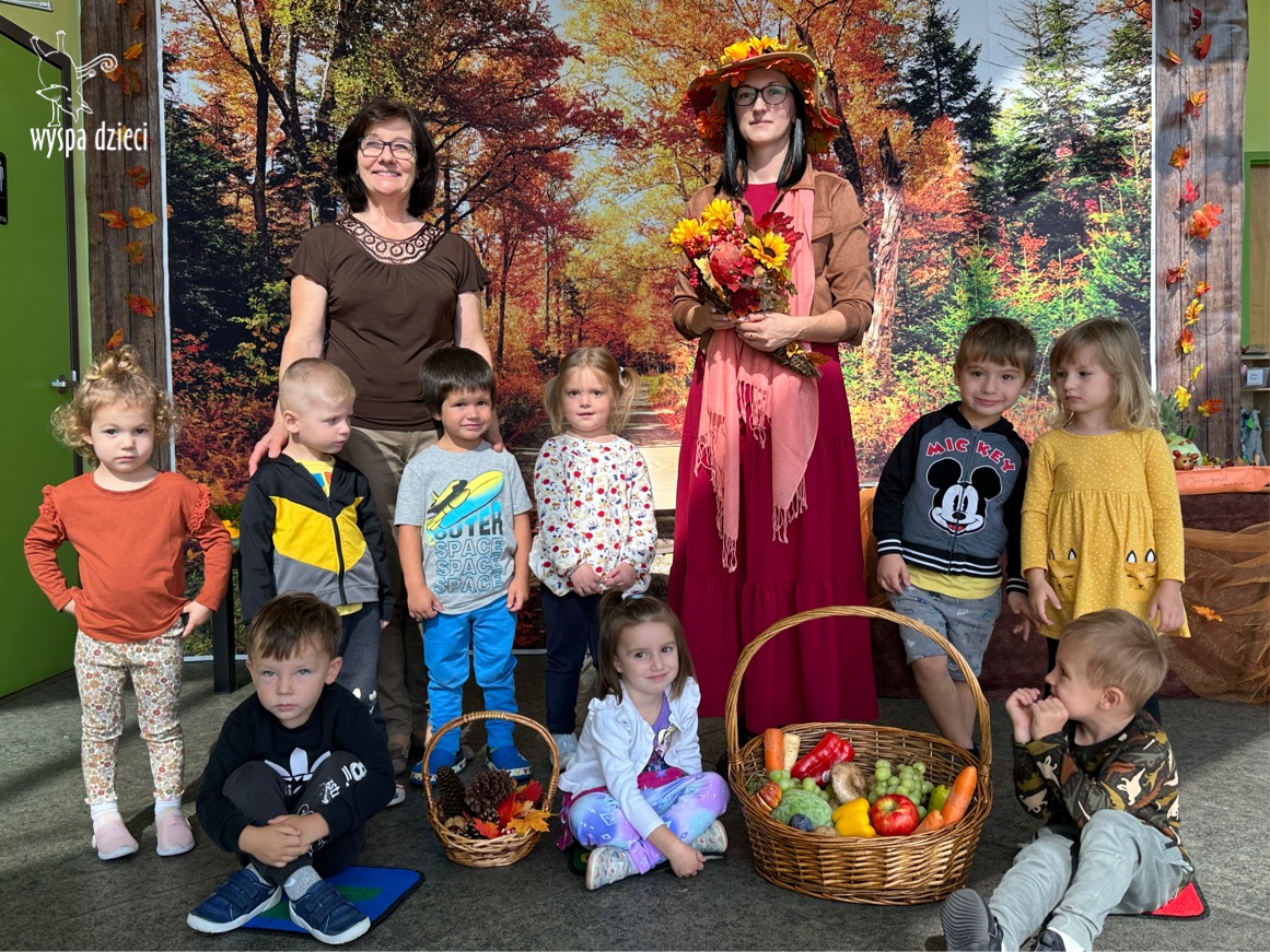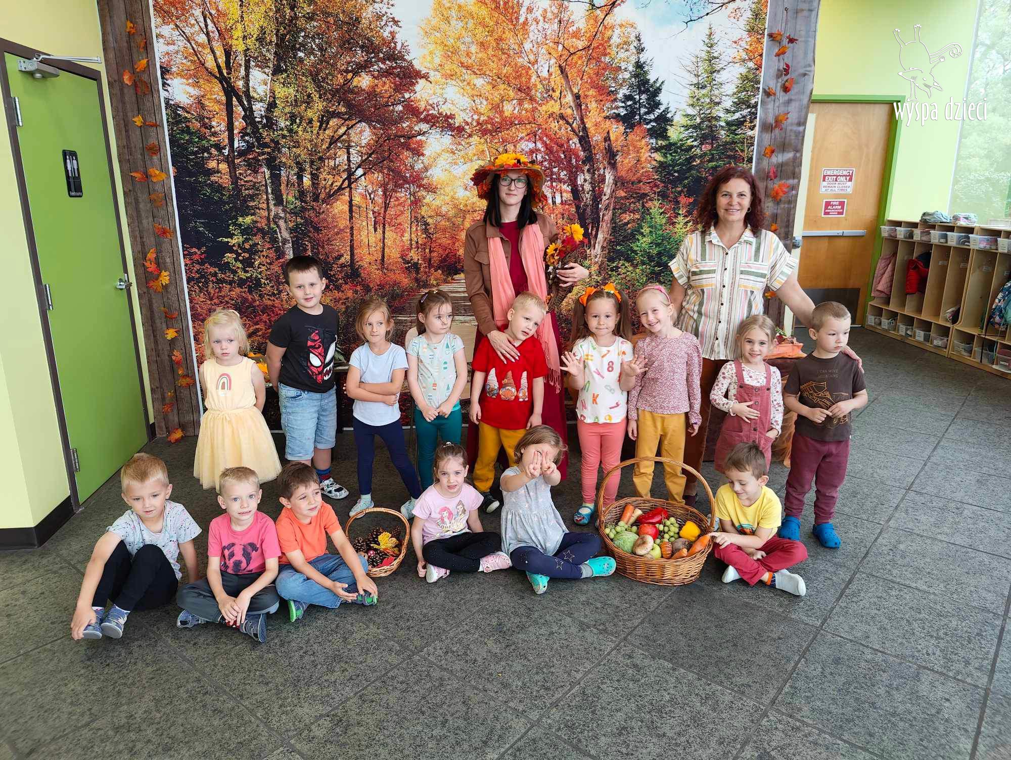 O tym, że mamy już jesień przekonały się nasze przedszkolaki wraz z nauczycielami z Wyspy Dzieci w River Grove . W dniu 25 września zapukała do naszych drzwi piękna, barwna Pani Jesień. Na głowie miała wspaniały kapelusz z liści, a w dłoni bardzo ciężki kosz z darami. Pani Jesień sprawdziła, czy nasze przedszkolaki rozpoznają warzywa, owoce, a także leśne dary. Razem z Panią Jesienią zaśpiewaliśmy „Jesienną Piosenkę” oraz wspólnie zatańczylismy.  Celem naszych zajęć w tym dniu było utrwalenie wiadomości o porze roku- Jesieni, jak również rozpoznawanie jej charakterystycznych cech . Podczas wizyty Pani Jesieni  przedszkolaki przypomniały i utrwaliły wiadomości o aspekcie przyrodniczym, m.in. dlaczego jesienią  liście zmieniają kolor, czy dary jesieni są potrzebne tylko ludziom.  Na te i wiele innych pytań dzieci odpowiadały bez wahania. W tym dniu podczas zajęc plastycznych dzieci wykonywały pomysłowe prace o tematyce jesiennej.