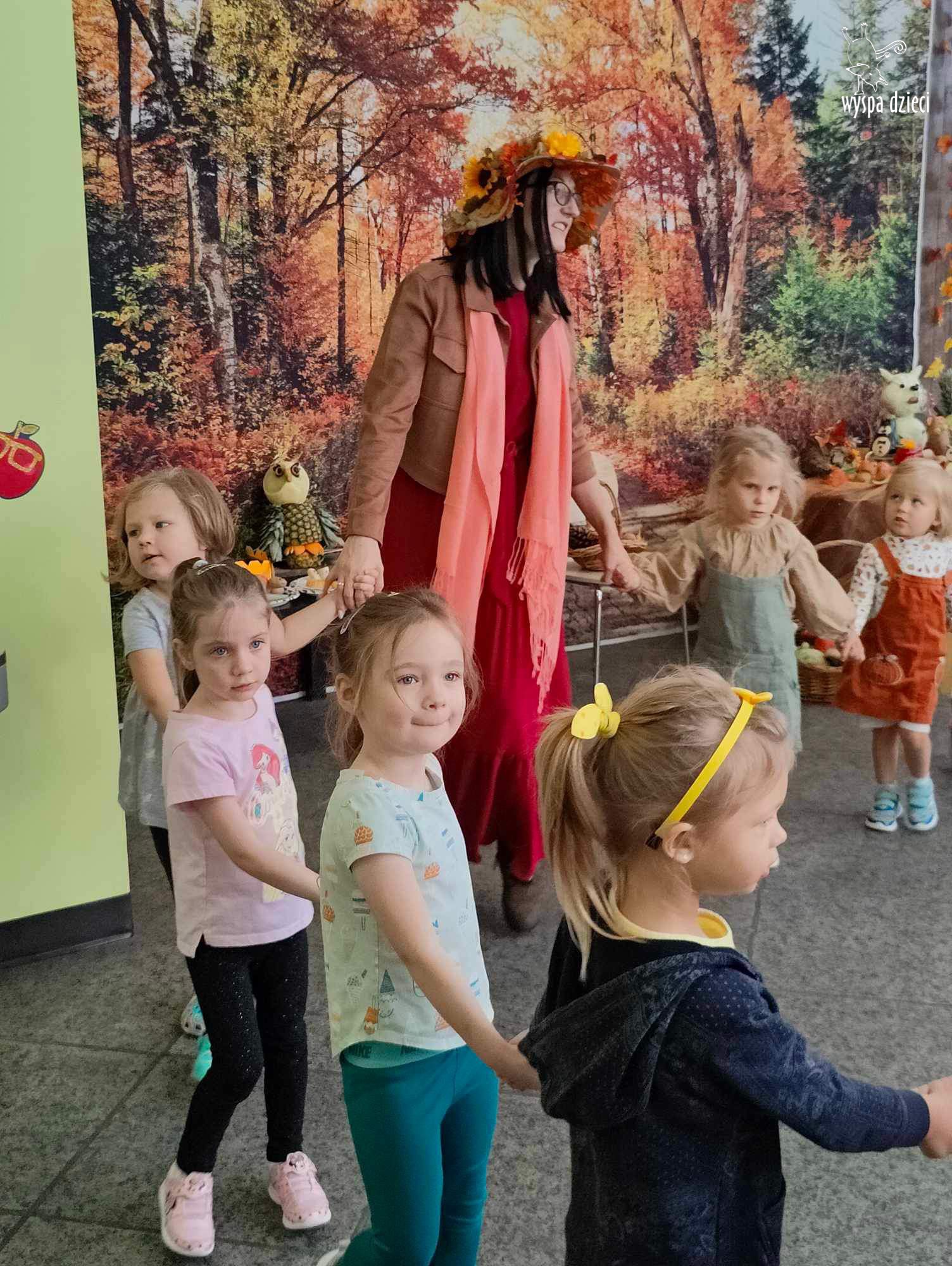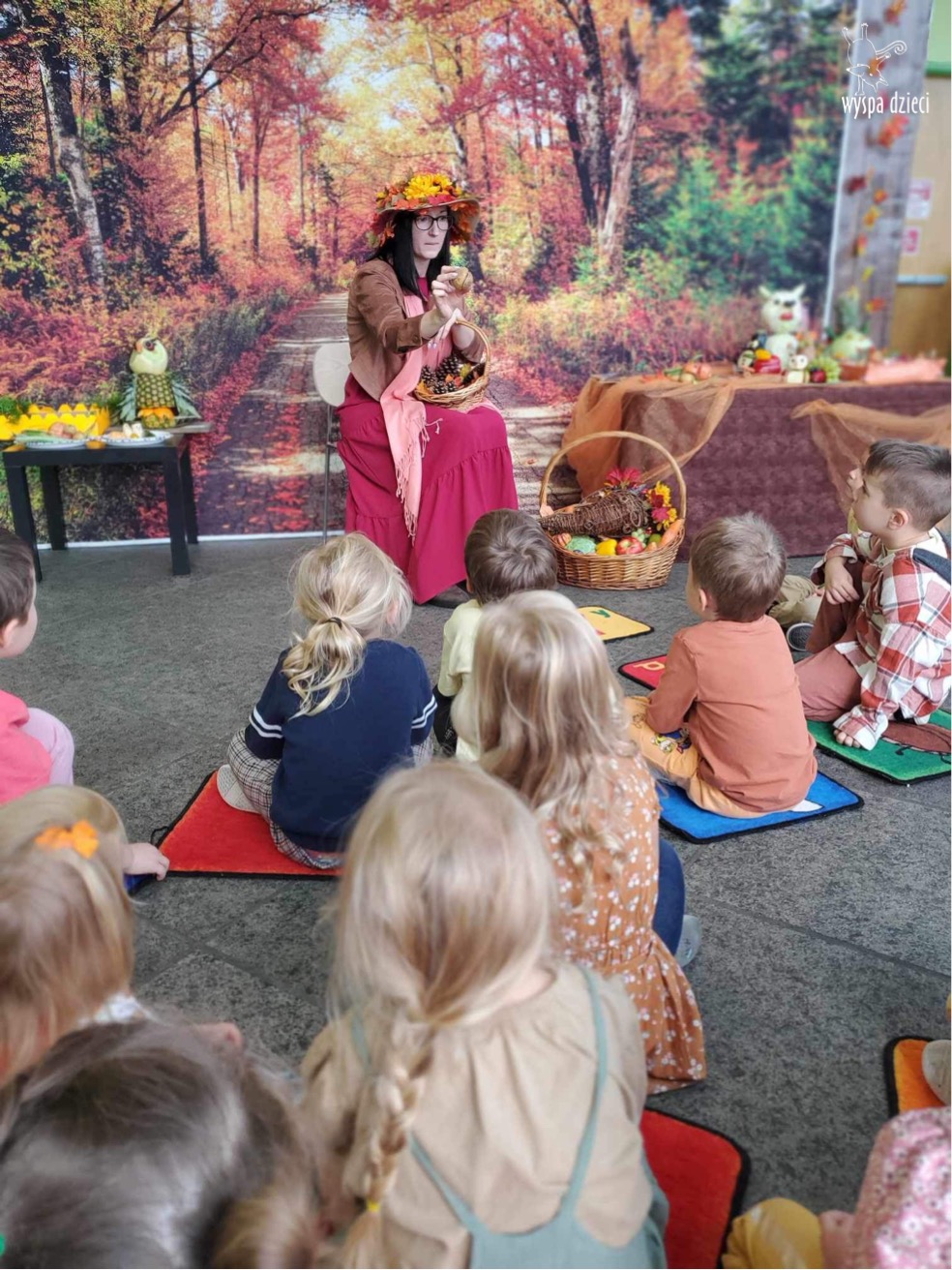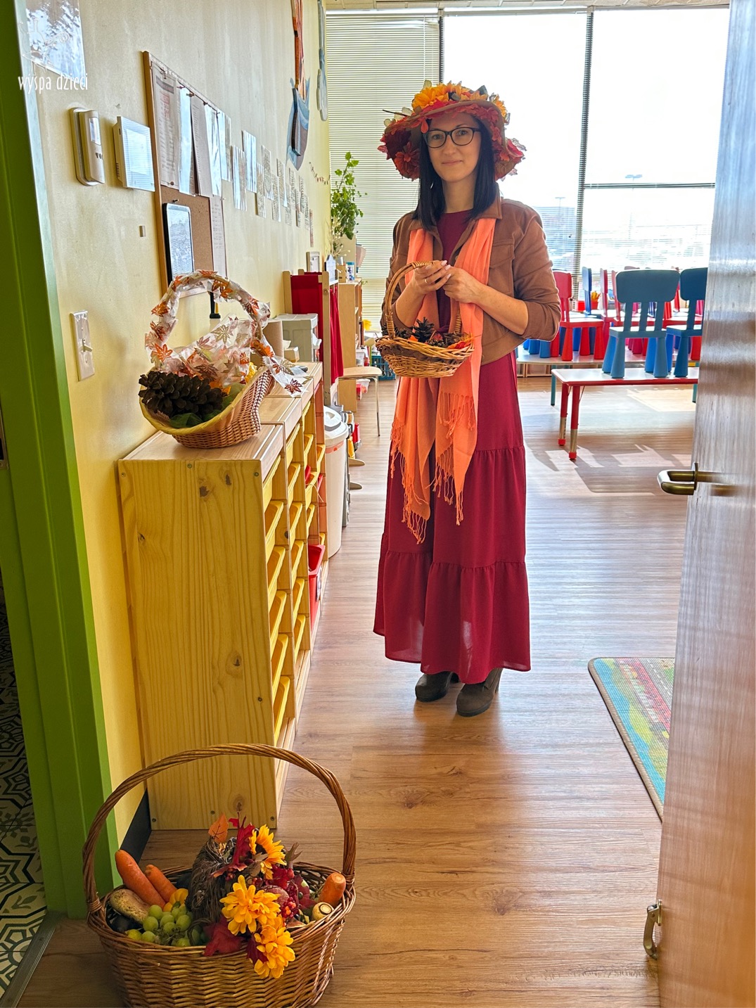 O tym, że mamy już jesień przekonały się nasze przedszkolaki wraz z nauczycielami z Wyspy Dzieci w River Grove . W dniu 25 września zapukała do naszych drzwi piękna, barwna Pani Jesień. Na głowie miała wspaniały kapelusz z liści, a w dłoni bardzo ciężki kosz z darami. Pani Jesień sprawdziła, czy nasze przedszkolaki rozpoznają warzywa, owoce, a także leśne dary. Razem z Panią Jesienią zaśpiewaliśmy „Jesienną Piosenkę” oraz wspólnie zatańczylismy.  Celem naszych zajęć w tym dniu było utrwalenie wiadomości o porze roku- Jesieni, jak również rozpoznawanie jej charakterystycznych cech . Podczas wizyty Pani Jesieni  przedszkolaki przypomniały i utrwaliły wiadomości o aspekcie przyrodniczym, m.in. dlaczego jesienią  liście zmieniają kolor, czy dary jesieni są potrzebne tylko ludziom.  Na te i wiele innych pytań dzieci odpowiadały bez wahania. W tym dniu podczas zajęc plastycznych dzieci wykonywały pomysłowe prace o tematyce jesiennej.