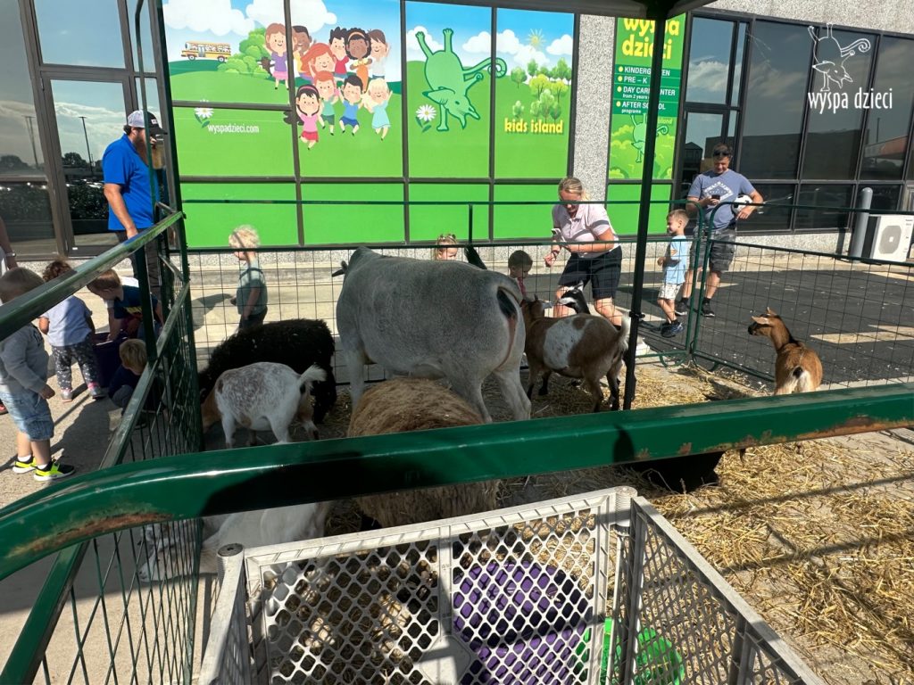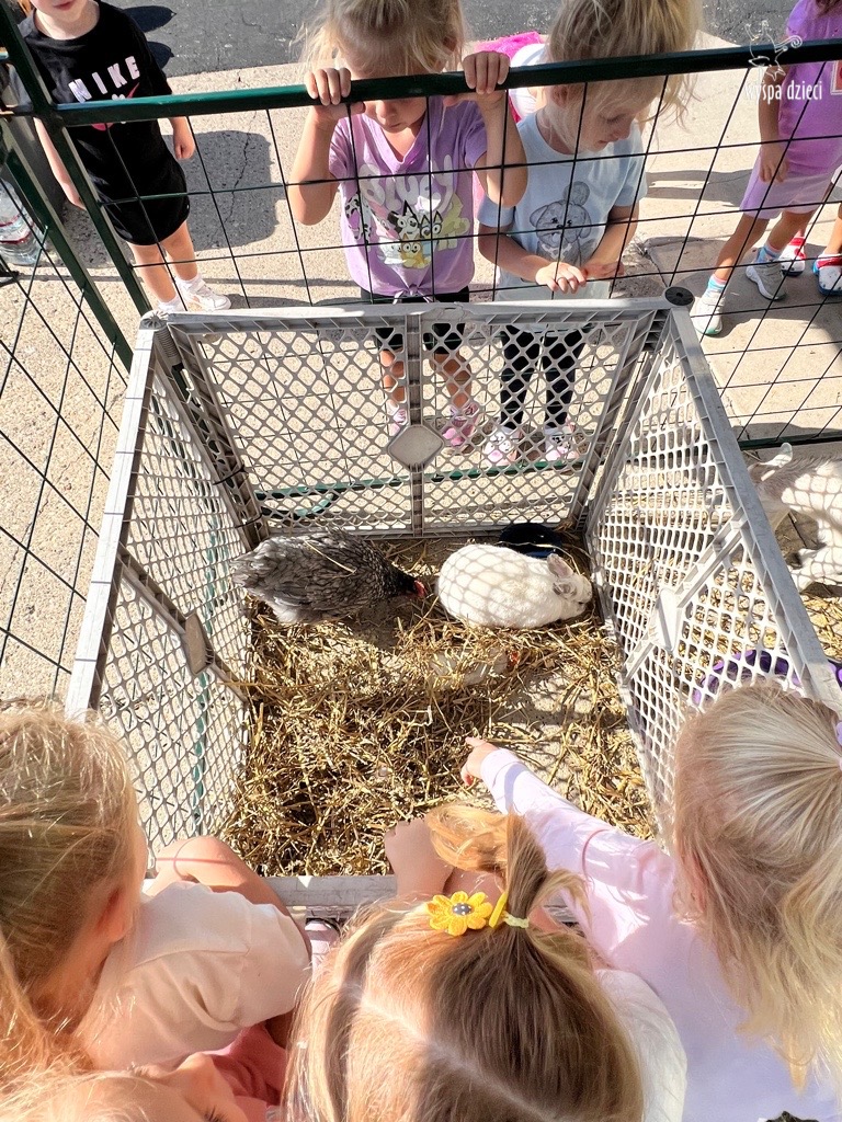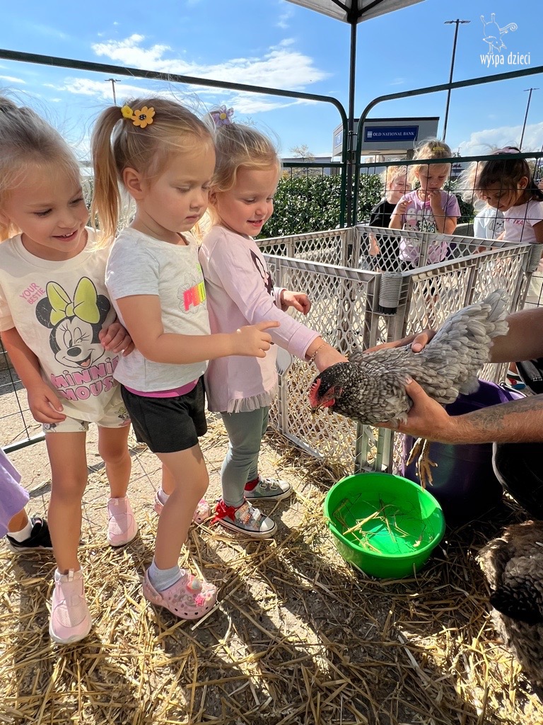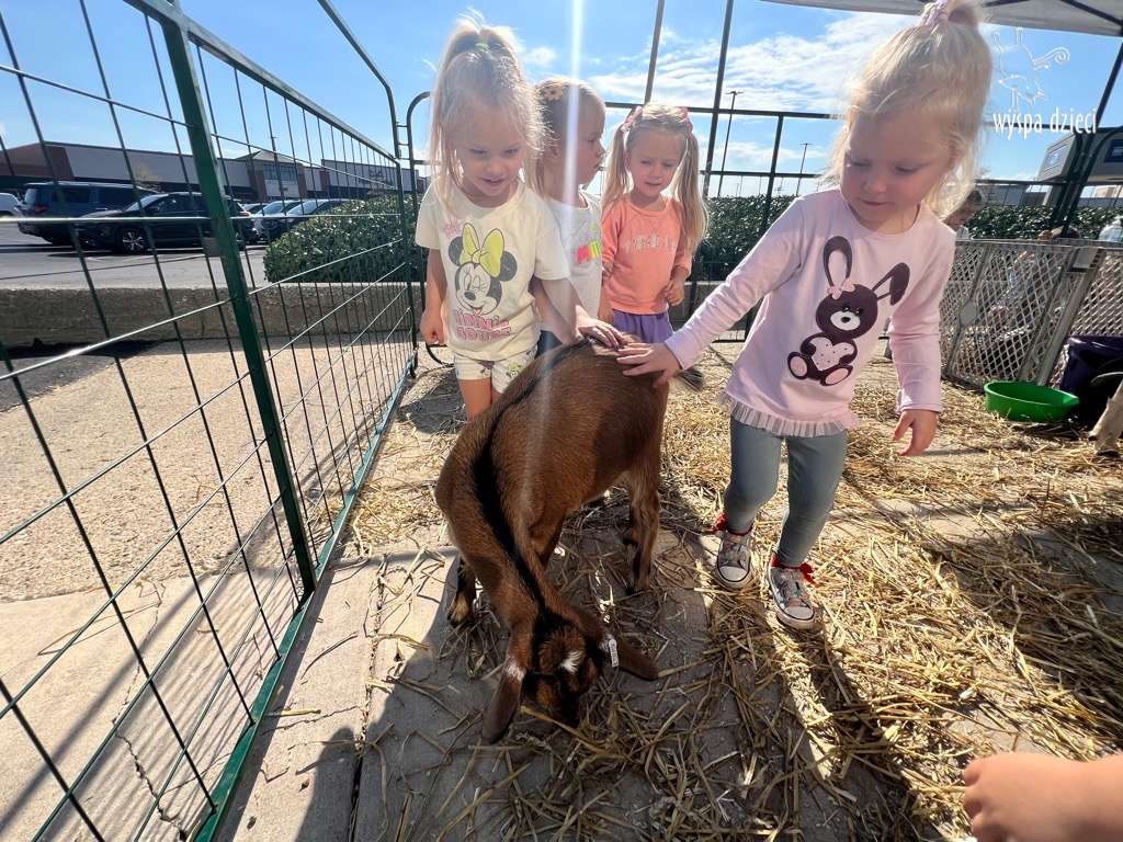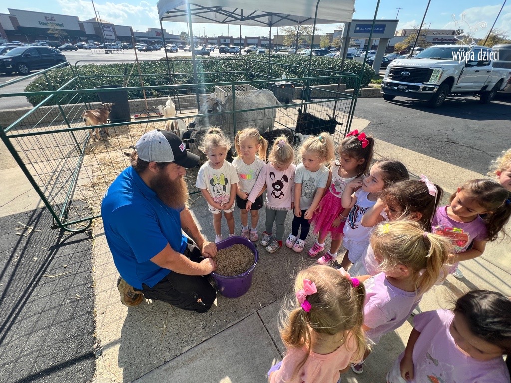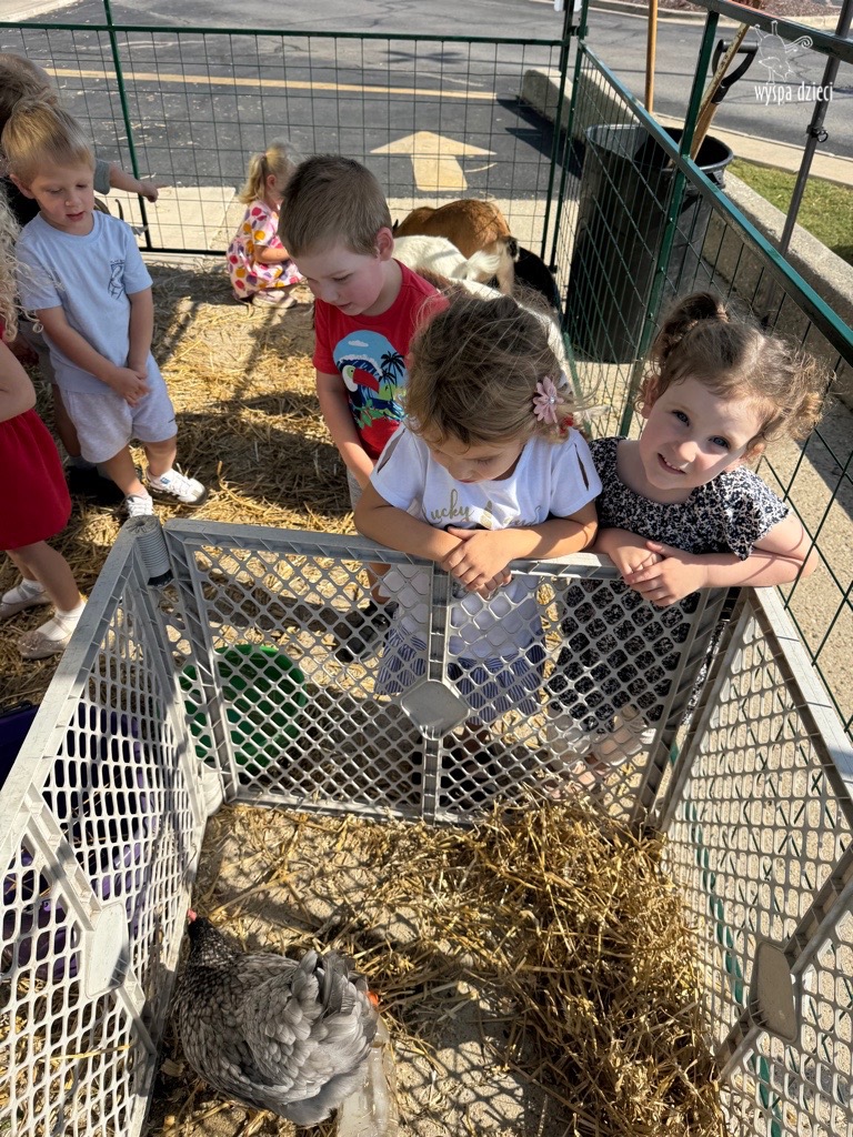 W tamtym tygodniu nasze przedszkolaki z Wyspy Dzieci River Grove przez cały tydzień poznawały życie na wsi. Ponieważ najmłodsza nasza grupa Misi ( 2-3 latki)  nie mogła z nami jechać na farmę , dlatego postanowiliśmy zrobić im niespodziankę i zaprosiliśmy do naszego przedszkola Petting Zoo. Była tam mała krówka, owieczki, kózki, osiołek oraz kurka i króliczek. Było to dla wszystkich dzieci ogromne przeżycie i wiele radości.