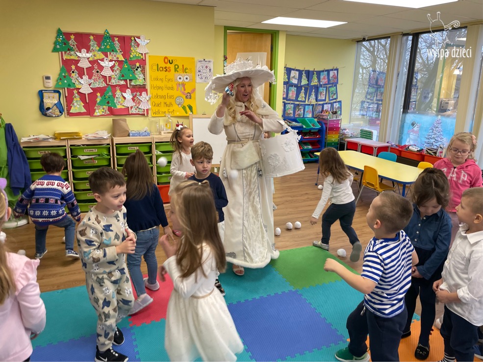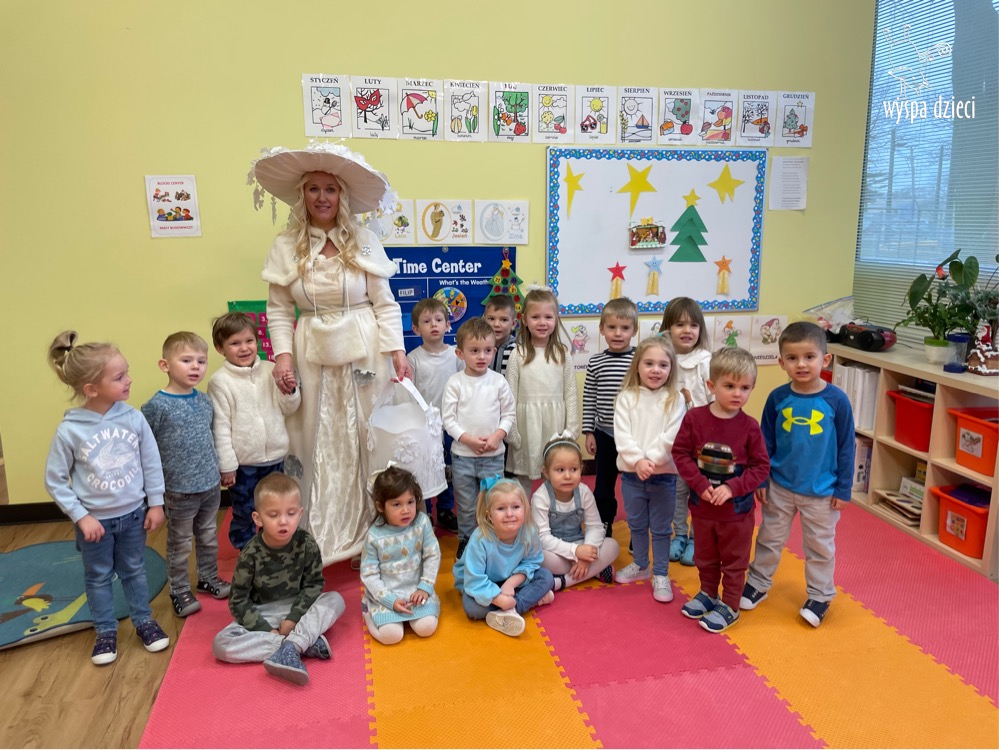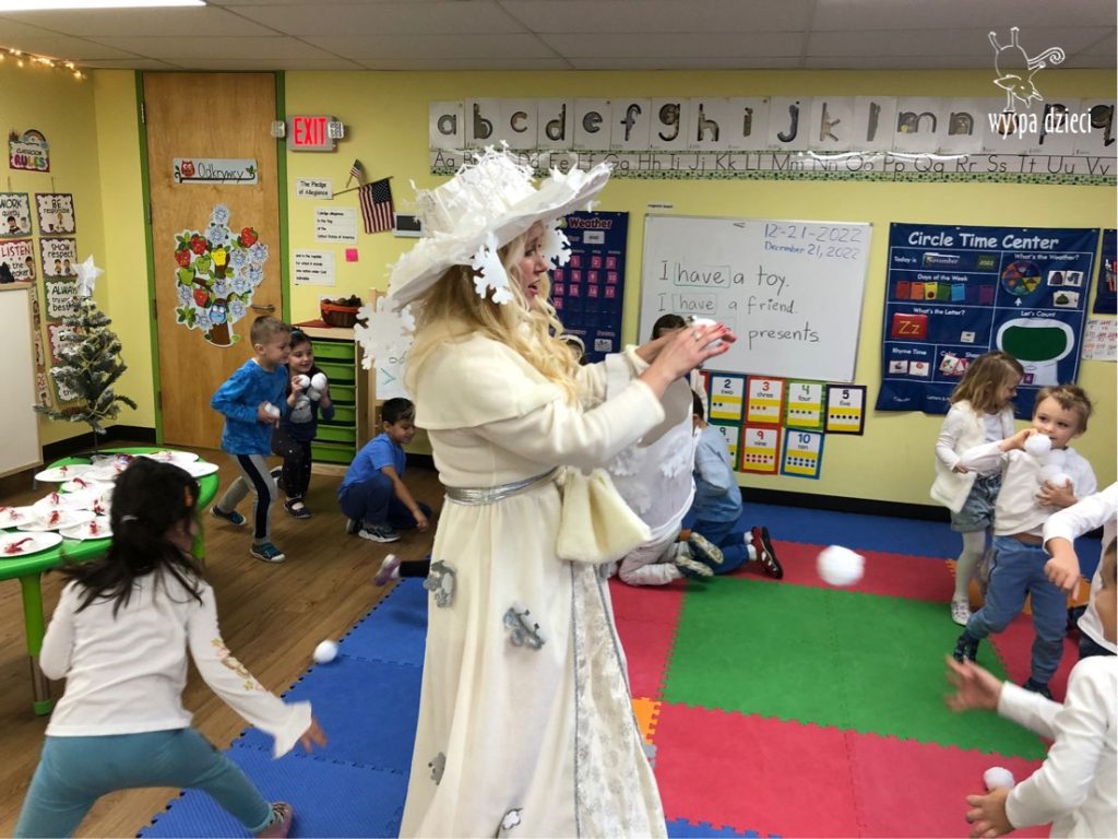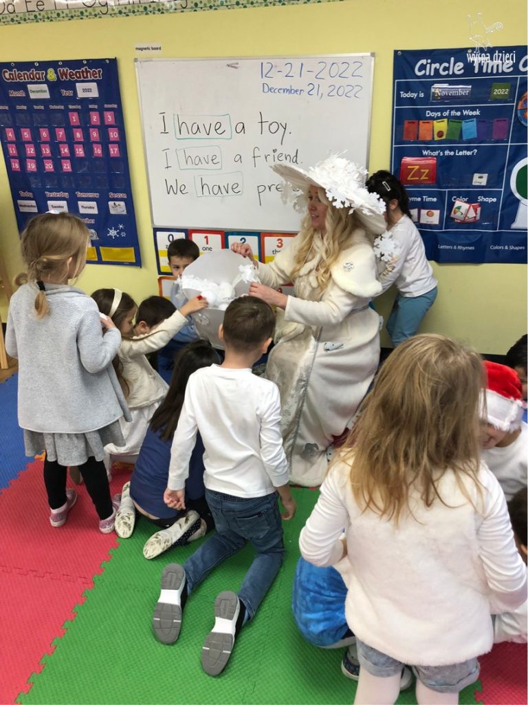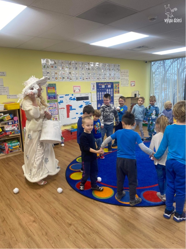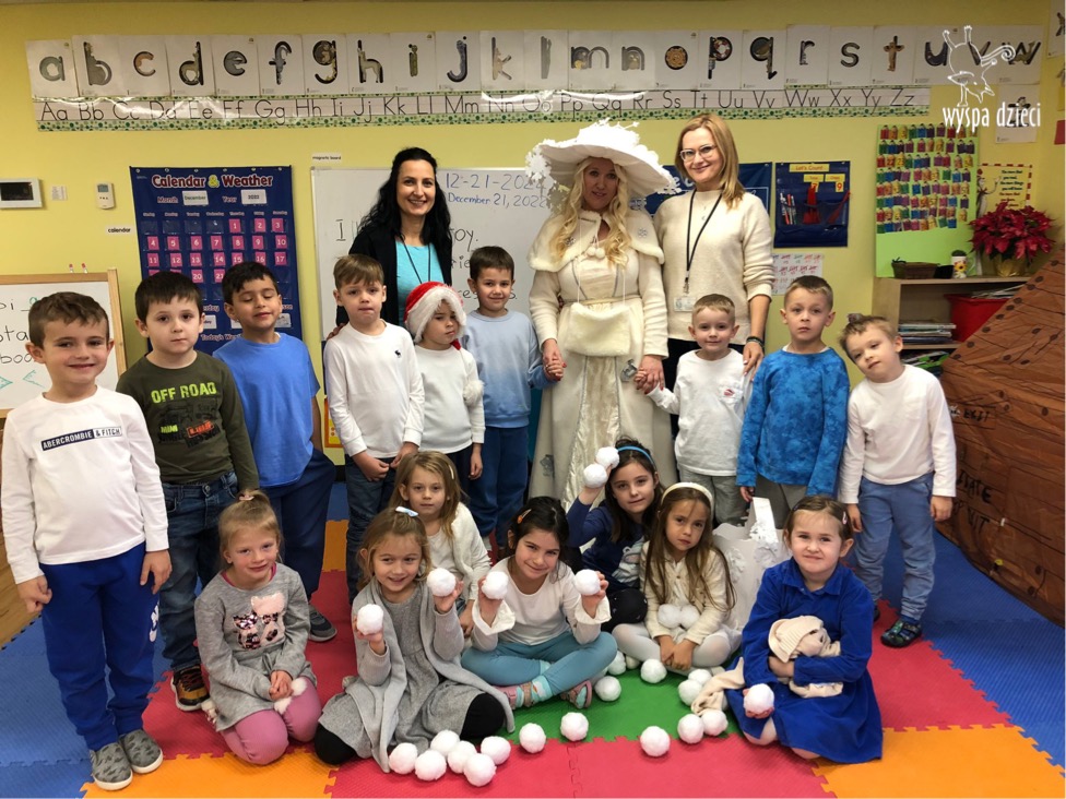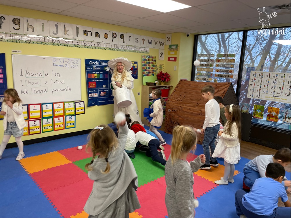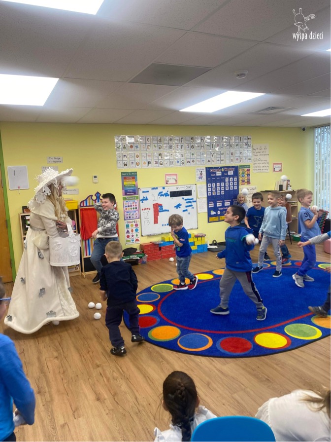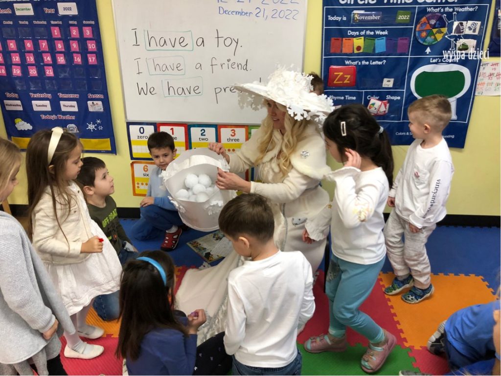 Dnia 21 grudnia 2022 roku, naszą Wyspę Dzieci w River Grove odwiedziła Pani Zima. Wizyta odbyła się pod hasłem: „My się zimy nie boimy i wesoło się bawimy”. Pani Zima odwiedziła każdą grupę. Wchodząc do naszych klas śpiewała piosenkę „Zima , zima, zima pada, pada śnieg”. Od najmłodszej grupy – Misie po najstarsze grupy kindergarten, wszyscy od razu przyłączyli się do wspólnego śpiewania tej piosenki. Pani Zima urządziła nam również zawody w rzucaniu śnieżkami. Ale było wesoło !!!!! Następnie omówiła z dziećmi zasady bezpiecznych zabaw, sposoby ubierania się i dbania o zdrowie, gdy na dworze jest zimno, a także jak ważne jest dokarmianie zwierząt. Przeczytała nam bardzo mądry tekst o dokarmianiu ptaszków i zachęciła nas do przygotowania dla nich karmników. Przygotowała dla naszych przedszkolaków zimowe rymowanki oraz zagadki. Wszyscy bardzo wesoło spędzili czas i obiecali, że wkrótce na naszym placu zabaw staną duże, piękne bałwany. Dziękujemy Pani Zimo za wspaniałą zabawę. Teraz czekamy tylko na Święta i śnieg 🙂 A podobno już jutro ma być go bardzo dużo !!!!
