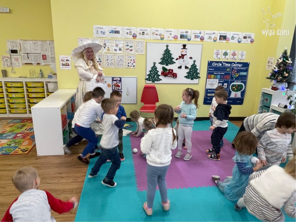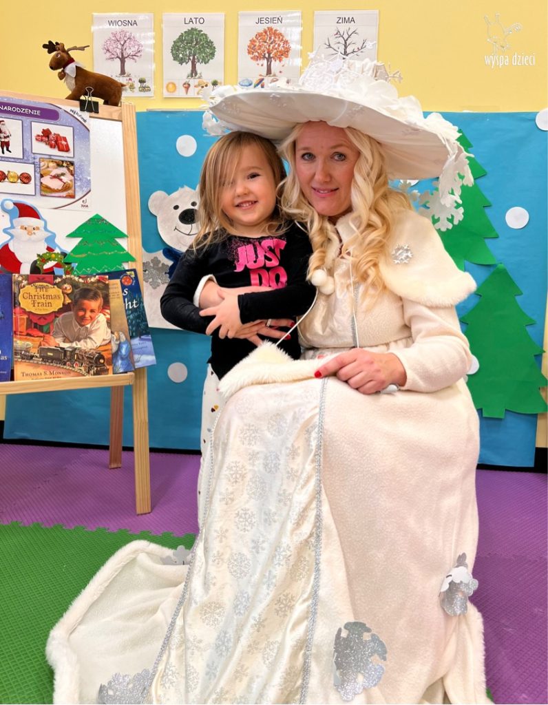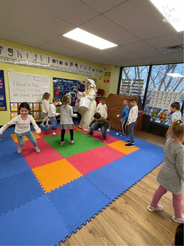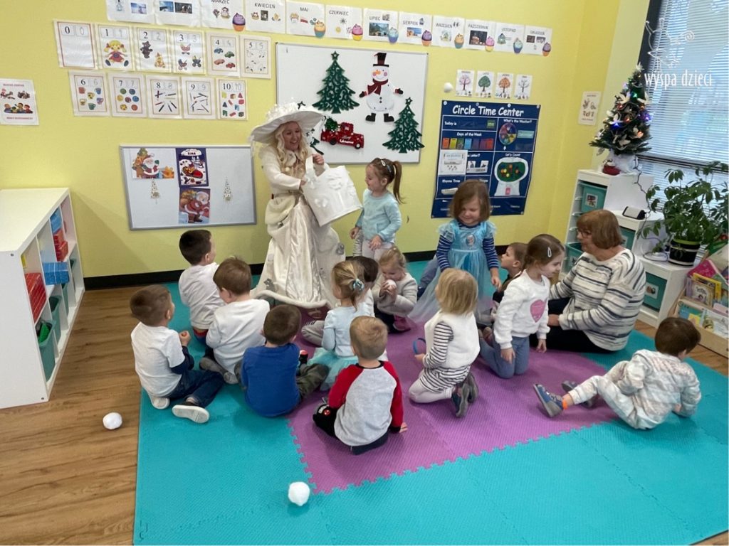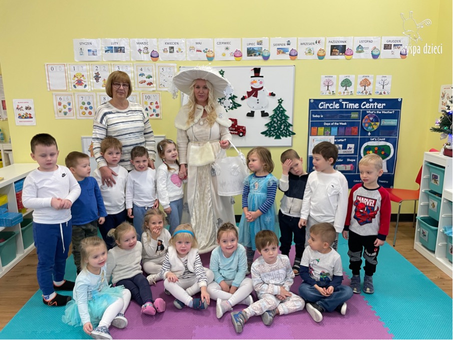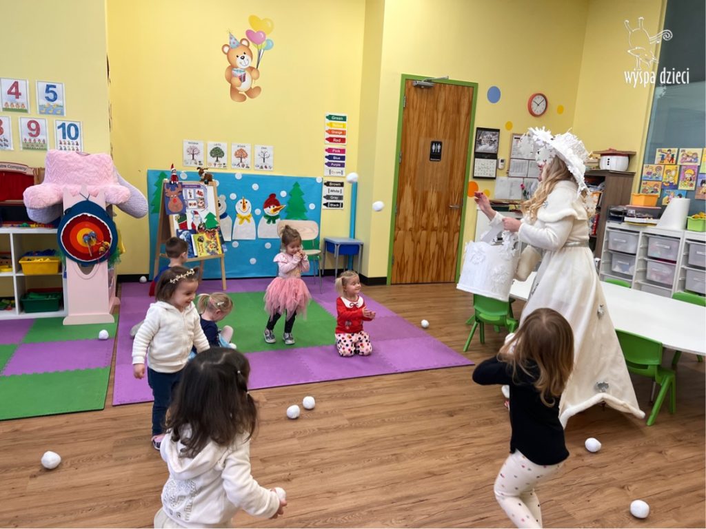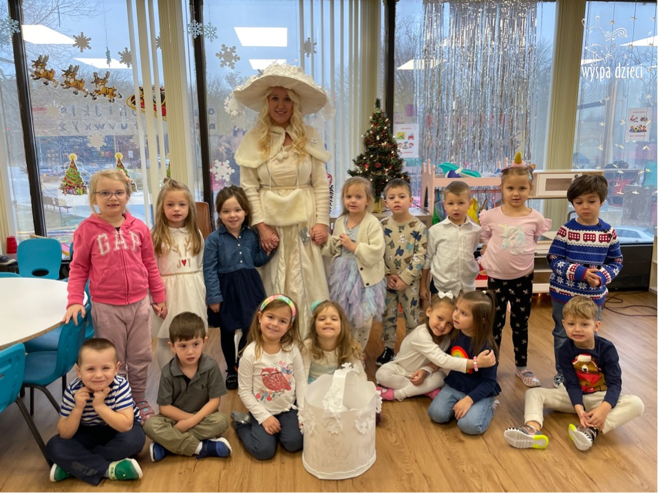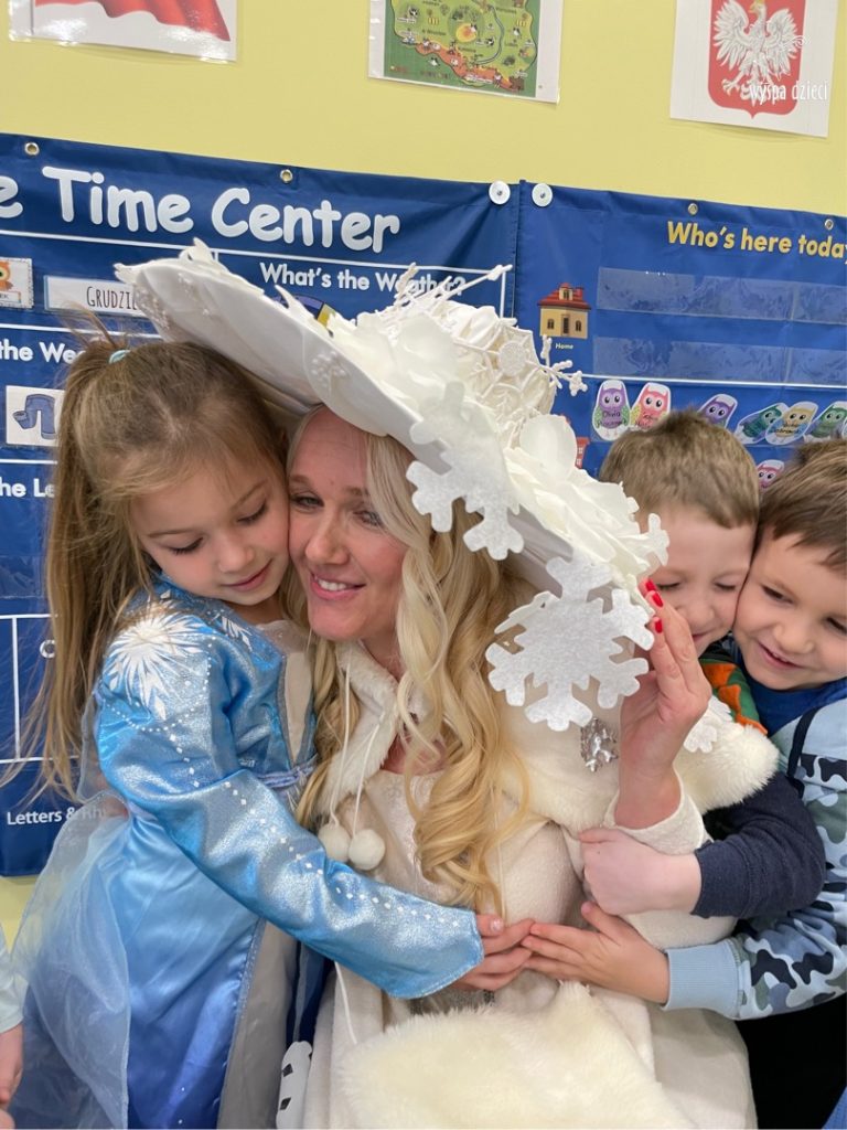 Dnia 21 grudnia 2022 roku, naszą Wyspę Dzieci w River Grove odwiedziła Pani Zima. Wizyta odbyła się pod hasłem: „My się zimy nie boimy i wesoło się bawimy”. Pani Zima odwiedziła każdą grupę. Wchodząc do naszych klas śpiewała piosenkę „Zima , zima, zima pada, pada śnieg”. Od najmłodszej grupy – Misie po najstarsze grupy kindergarten, wszyscy od razu przyłączyli się do wspólnego śpiewania tej piosenki. Pani Zima urządziła nam również zawody w rzucaniu śnieżkami. Ale było wesoło !!!!! Następnie omówiła z dziećmi zasady bezpiecznych zabaw, sposoby ubierania się i dbania o zdrowie, gdy na dworze jest zimno, a także jak ważne jest dokarmianie zwierząt. Przeczytała nam bardzo mądry tekst o dokarmianiu ptaszków i zachęciła nas do przygotowania dla nich karmników. Przygotowała dla naszych przedszkolaków zimowe rymowanki oraz zagadki. Wszyscy bardzo wesoło spędzili czas i obiecali, że wkrótce na naszym placu zabaw staną duże, piękne bałwany. Dziękujemy Pani Zimo za wspaniałą zabawę. Teraz czekamy tylko na Święta i śnieg 🙂 A podobno już jutro ma być go bardzo dużo !!!!
