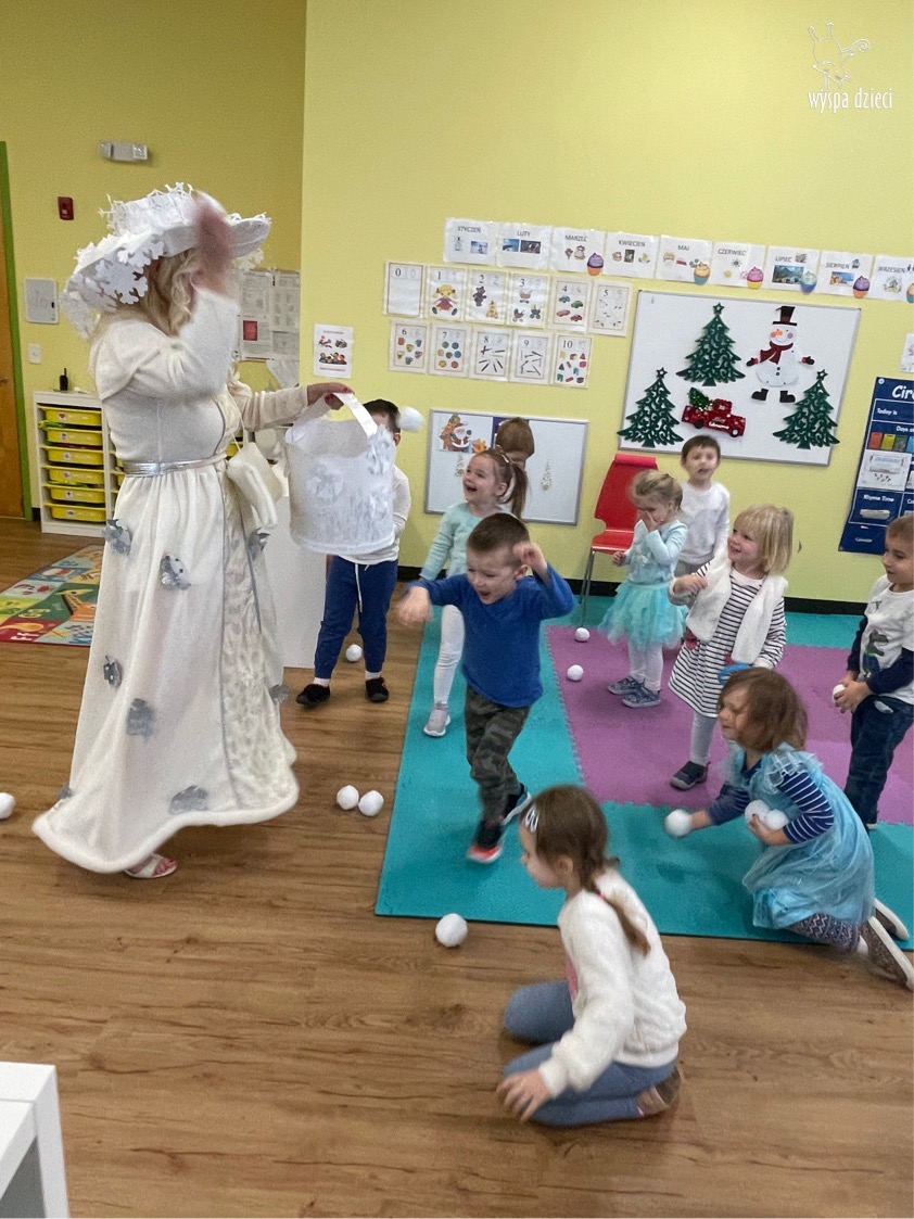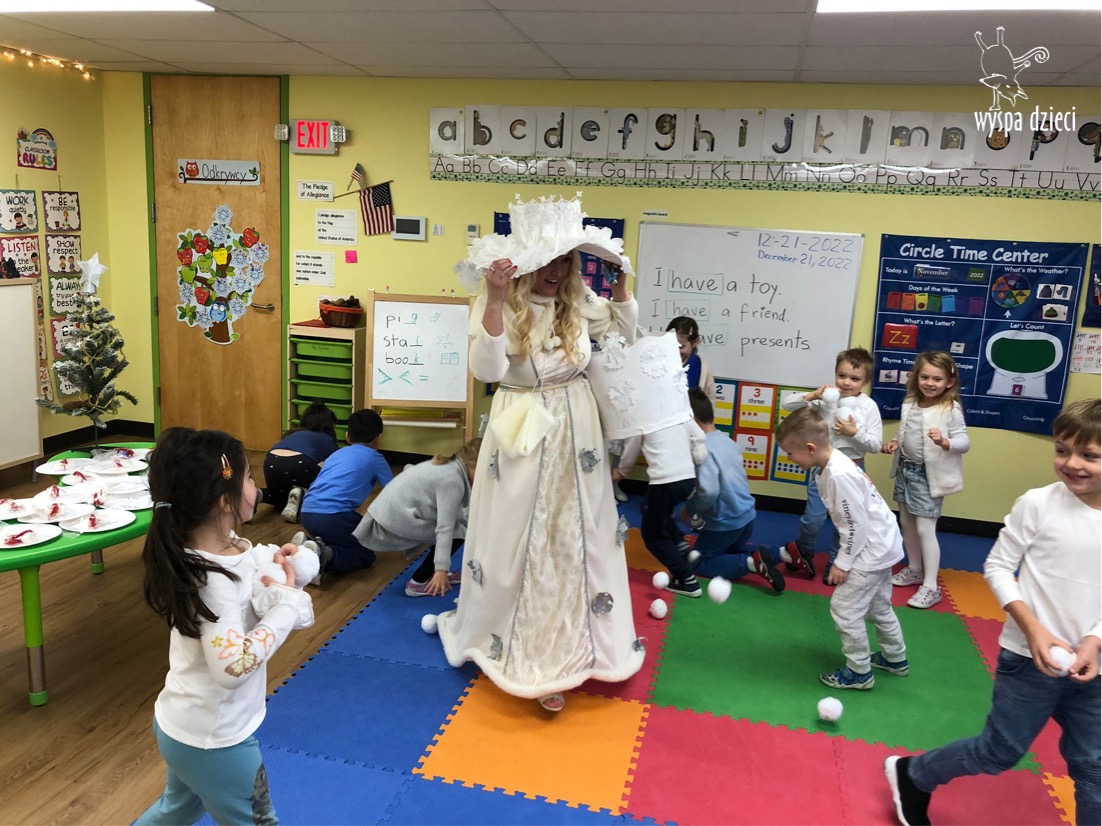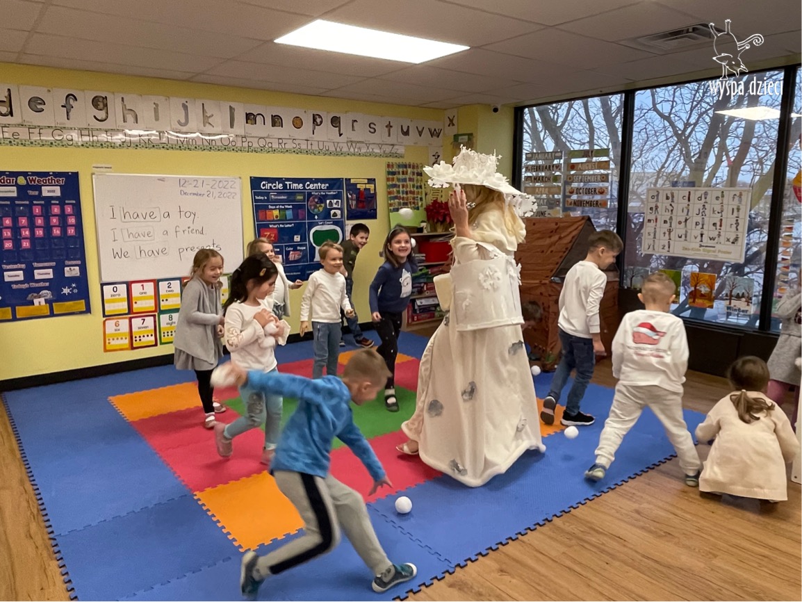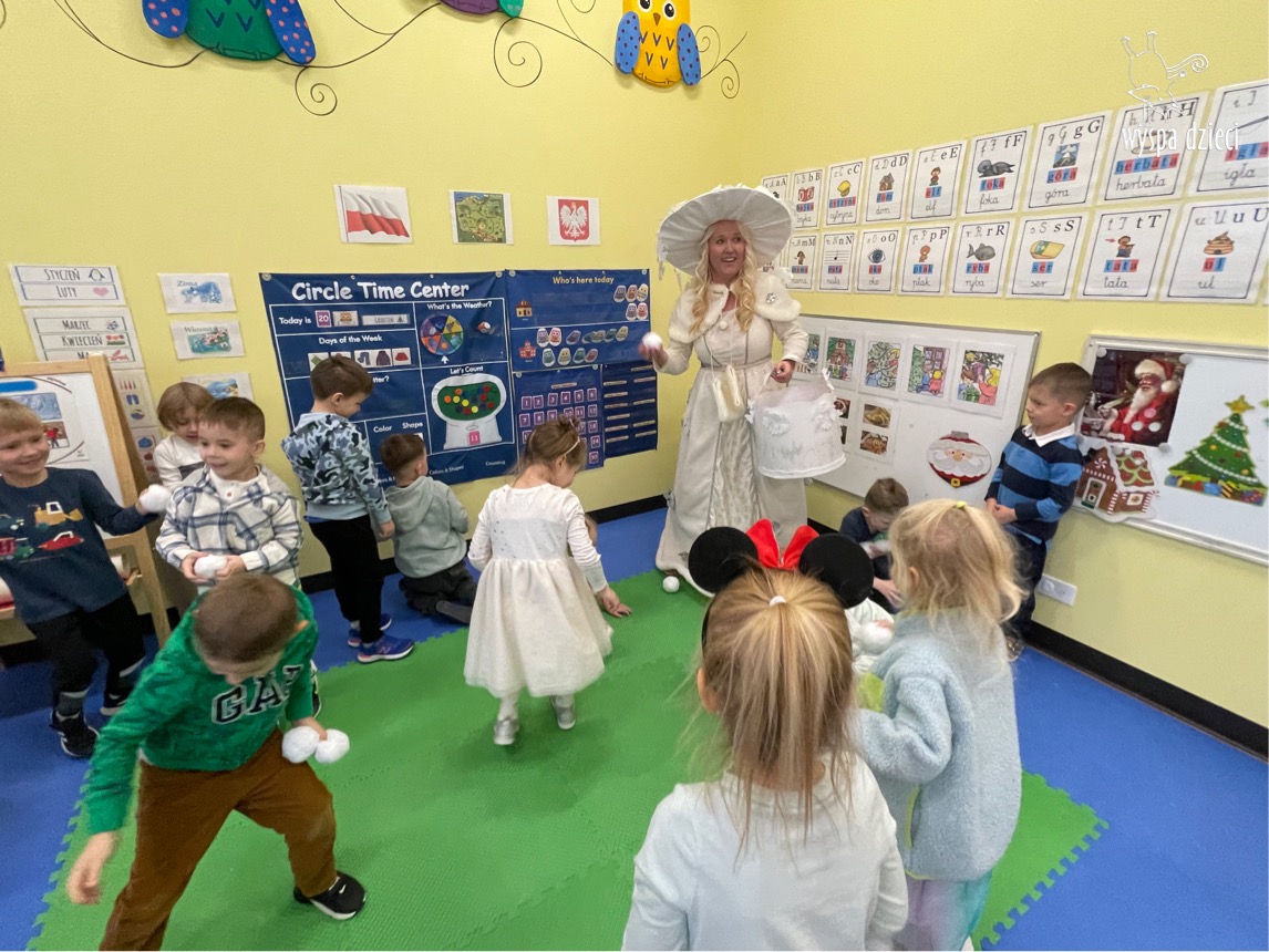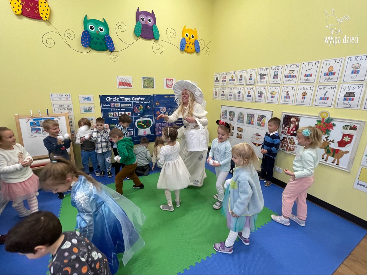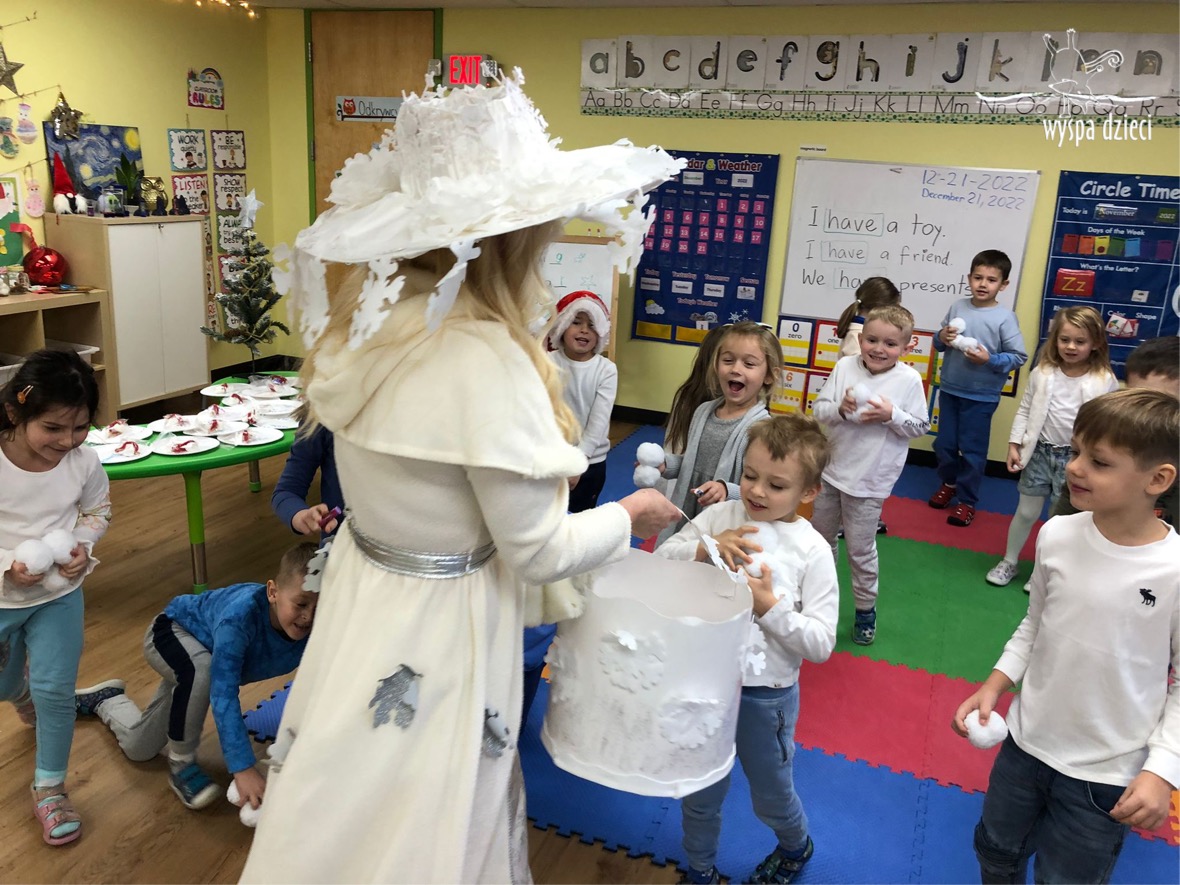 Dnia 21 grudnia 2022 roku, naszą Wyspę Dzieci w River Grove odwiedziła Pani Zima. Wizyta odbyła się pod hasłem: „My się zimy nie boimy i wesoło się bawimy”. Pani Zima odwiedziła każdą grupę. Wchodząc do naszych klas śpiewała piosenkę „Zima , zima, zima pada, pada śnieg”. Od najmłodszej grupy – Misie po najstarsze grupy kindergarten, wszyscy od razu przyłączyli się do wspólnego śpiewania tej piosenki. Pani Zima urządziła nam również zawody w rzucaniu śnieżkami. Ale było wesoło !!!!! Następnie omówiła z dziećmi zasady bezpiecznych zabaw, sposoby ubierania się i dbania o zdrowie, gdy na dworze jest zimno, a także jak ważne jest dokarmianie zwierząt. Przeczytała nam bardzo mądry tekst o dokarmianiu ptaszków i zachęciła nas do przygotowania dla nich karmników. Przygotowała dla naszych przedszkolaków zimowe rymowanki oraz zagadki. Wszyscy bardzo wesoło spędzili czas i obiecali, że wkrótce na naszym placu zabaw staną duże, piękne bałwany. Dziękujemy Pani Zimo za wspaniałą zabawę. Teraz czekamy tylko na Święta i śnieg 🙂 A podobno już jutro ma być go bardzo dużo !!!!